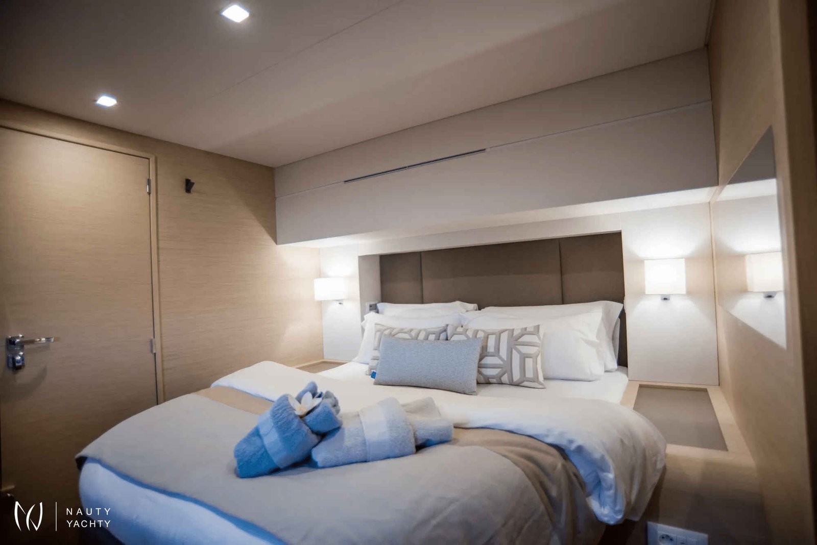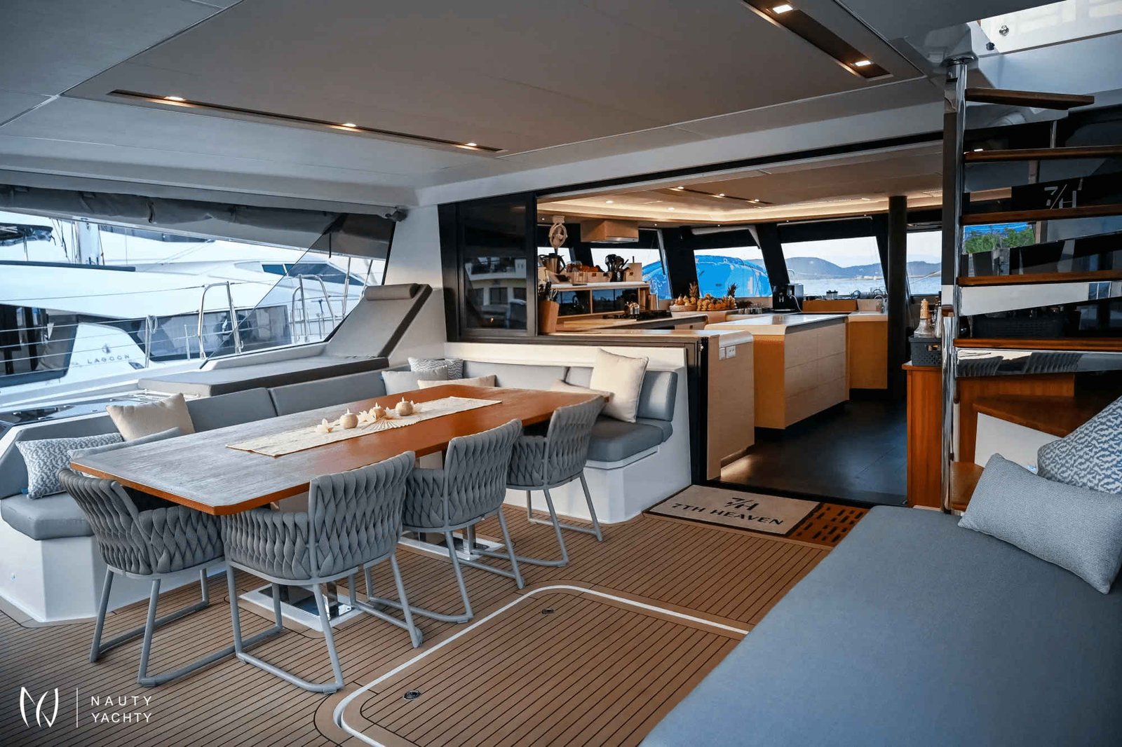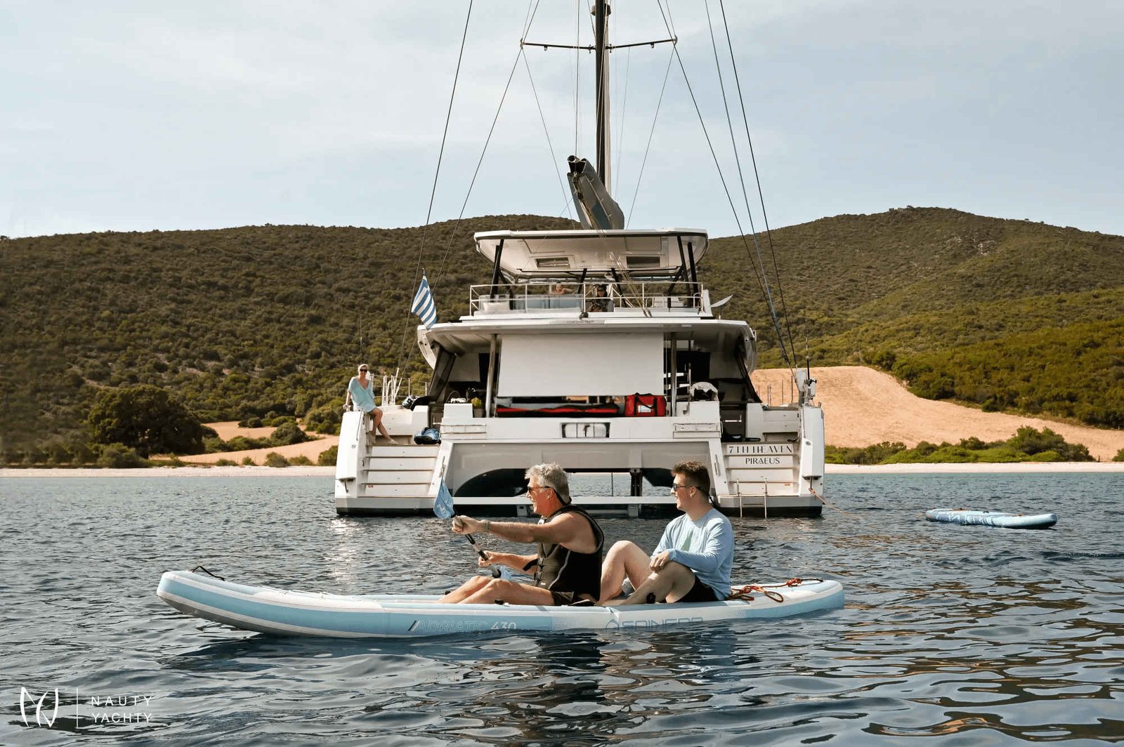 7th Heaven is a stunning Samana 59 catamaran ideal for exploring the waters and hidden gems of Greece. With four luxurious cabins, it can comfortably accommodate up to eight guests in style and comfort.The yacht's beautifully designed interior is characterized by light and airy spaces, an elegant lounge, and a well-appointed kitchen area that is perfect for preparing gourmet meals. The large windows and sunroof offer panoramic views of the Greece's turquoise waters, creating an unforgettable sailing experience.On the exterior, the spacious deck offers ample room for guests to lounge and relax, soak in the sun and take in the beautiful surroundings. The yacht's impressive flybridge is a popular feature, providing unbeatable views and comfortable seating perfect for enjoying the warm sunsets.7th Heaven is fully crewed by two professional and experienced crew members who are devoted to delivering exceptional customer service, ensuring that guests have an unforgettable sailing experience. The crew is committed to providing a personalized service that caters to each guest's specific preferences, making sure that everyone's needs and desires are taken into account.Overall, 7th Heaven is a magnificent choice for families, couples, or groups of friends who want to experience the ultimate adventure. The yacht guarantees a comfortable, safe, and memorable trip, making it an excellent choice for any sailing vacation.