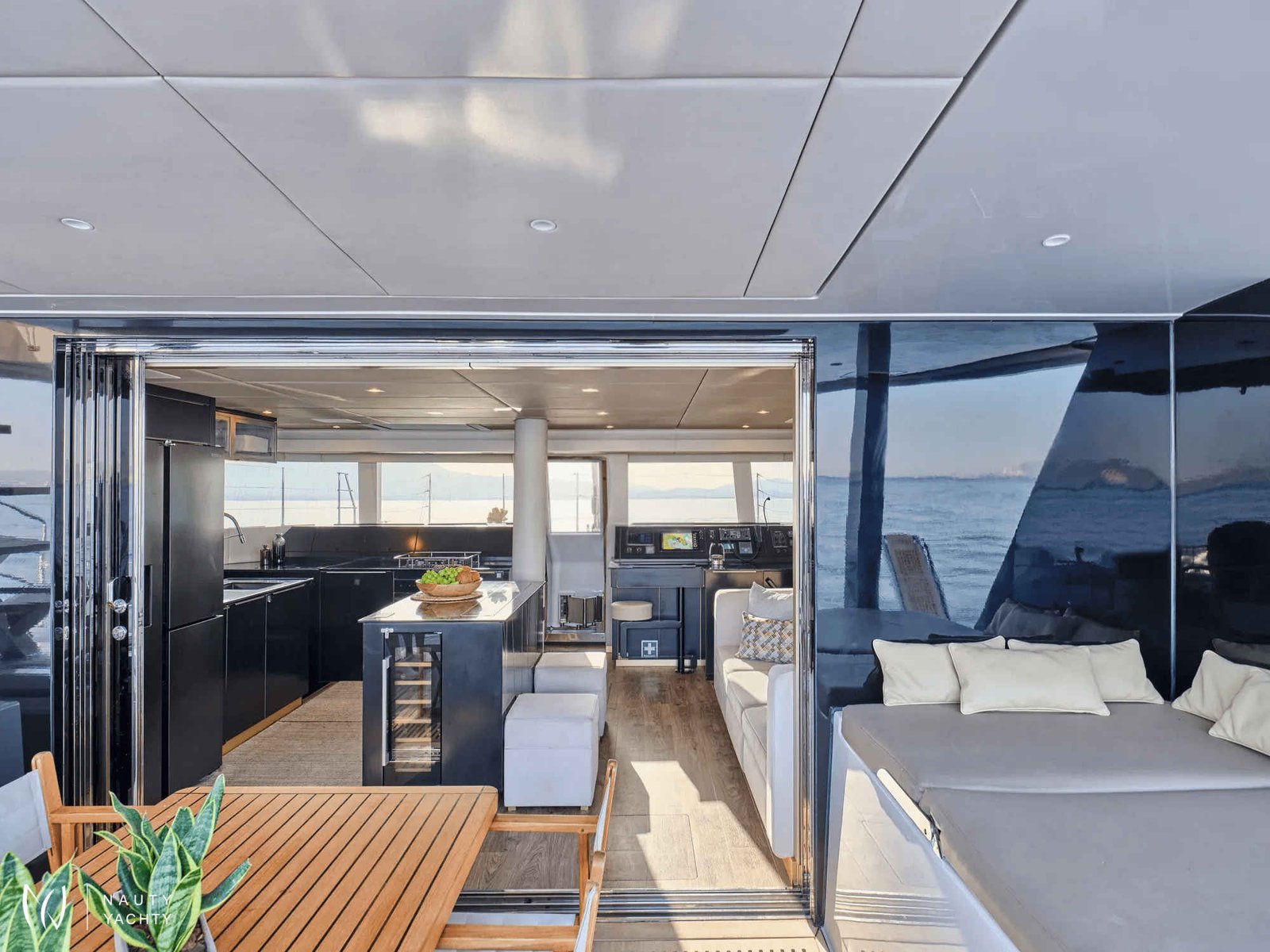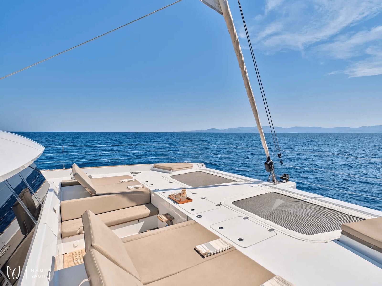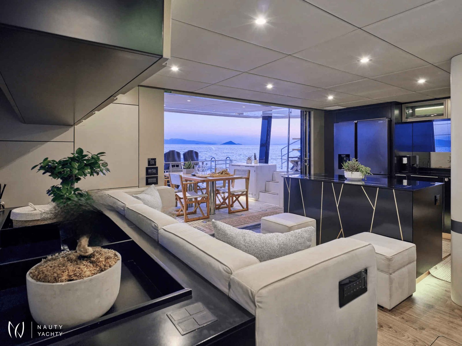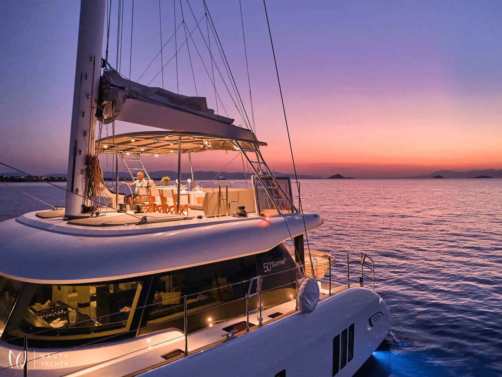 with a length of 50ft and a beam of over 27ft, the Sunreef 50 catamaran provides plenty of living space for passengers to relax and enjoy the journey
