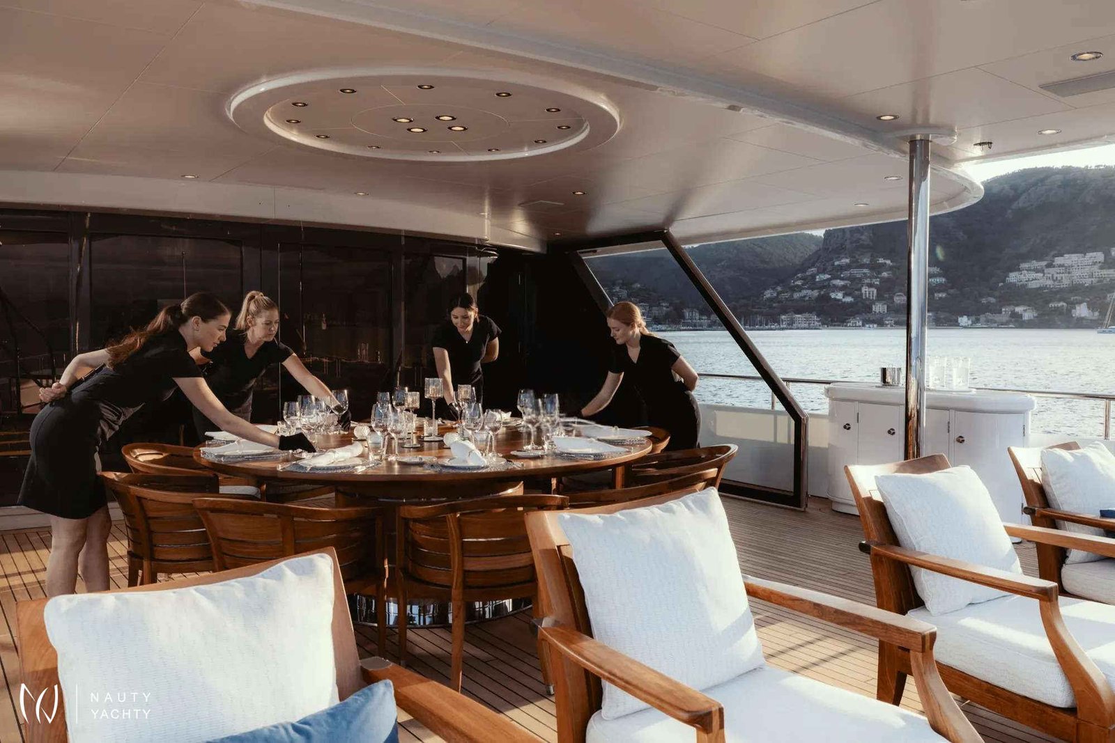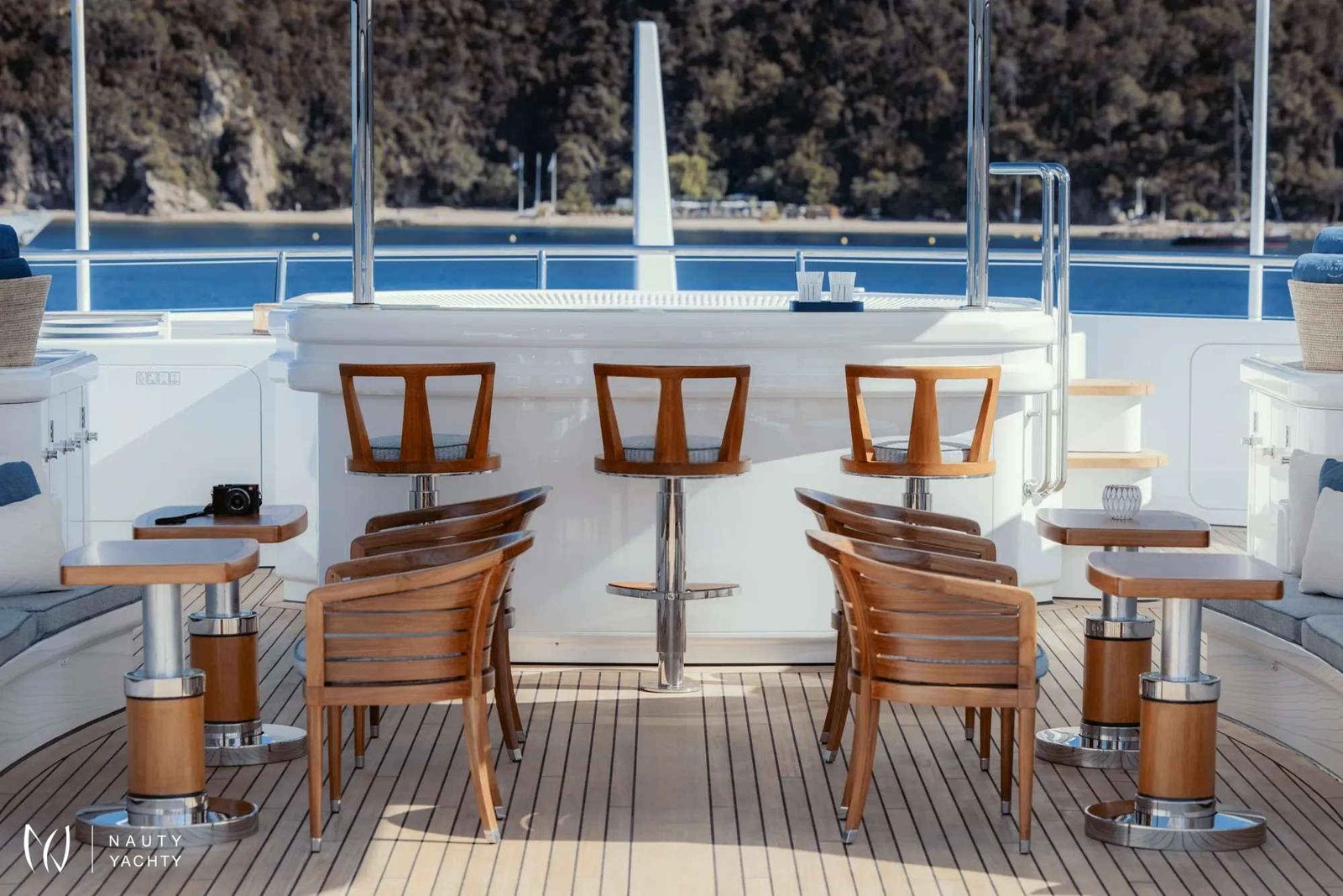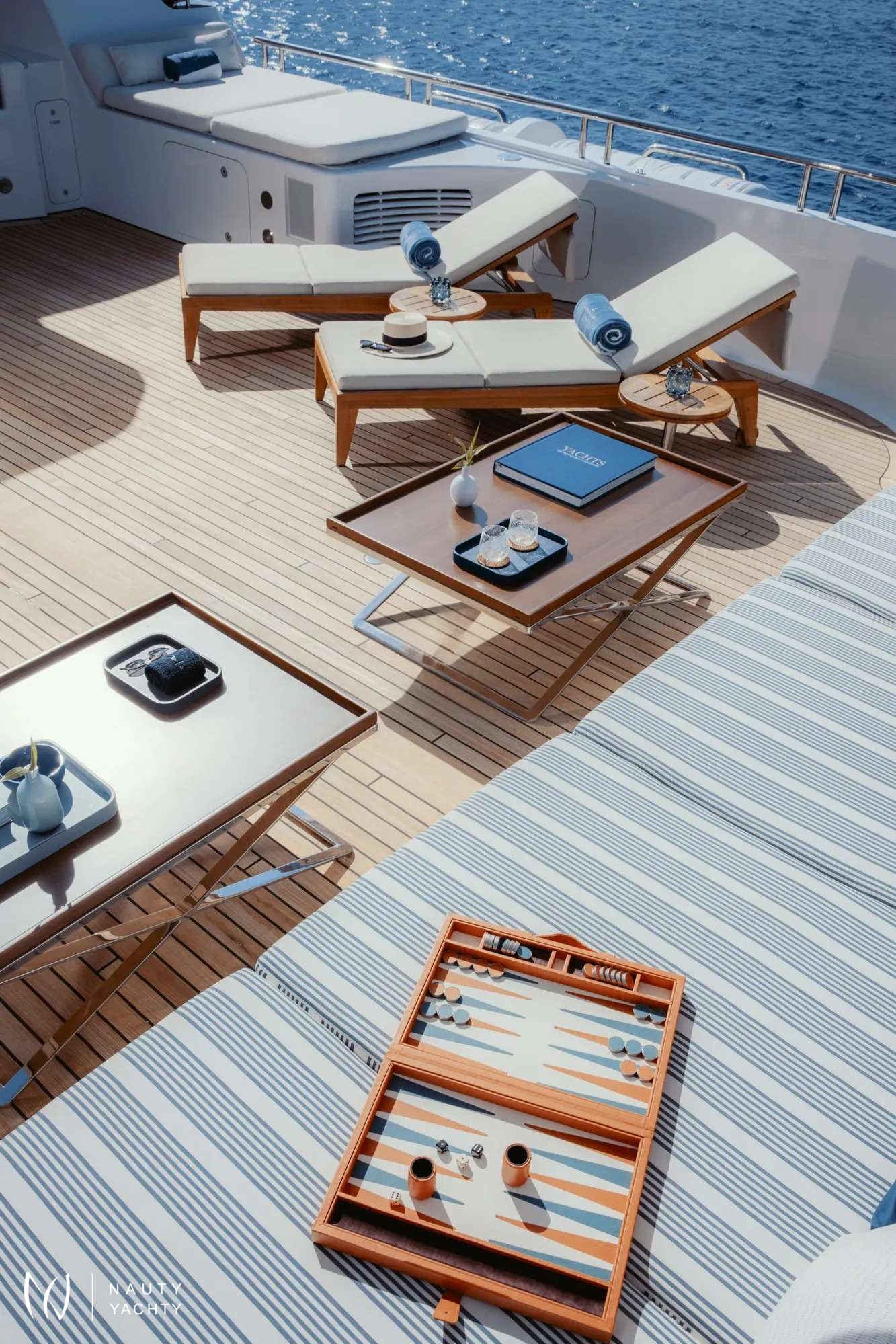 Sun deck with bar, large Jacuzzi, various sunbathing areas and dining for up to 20 guests.