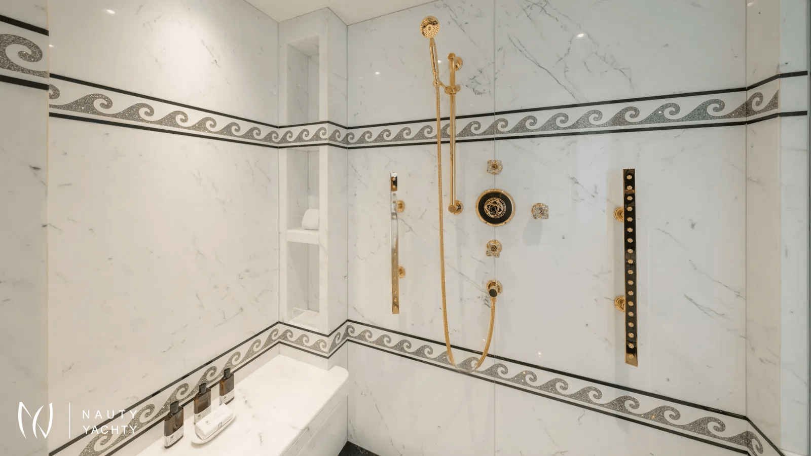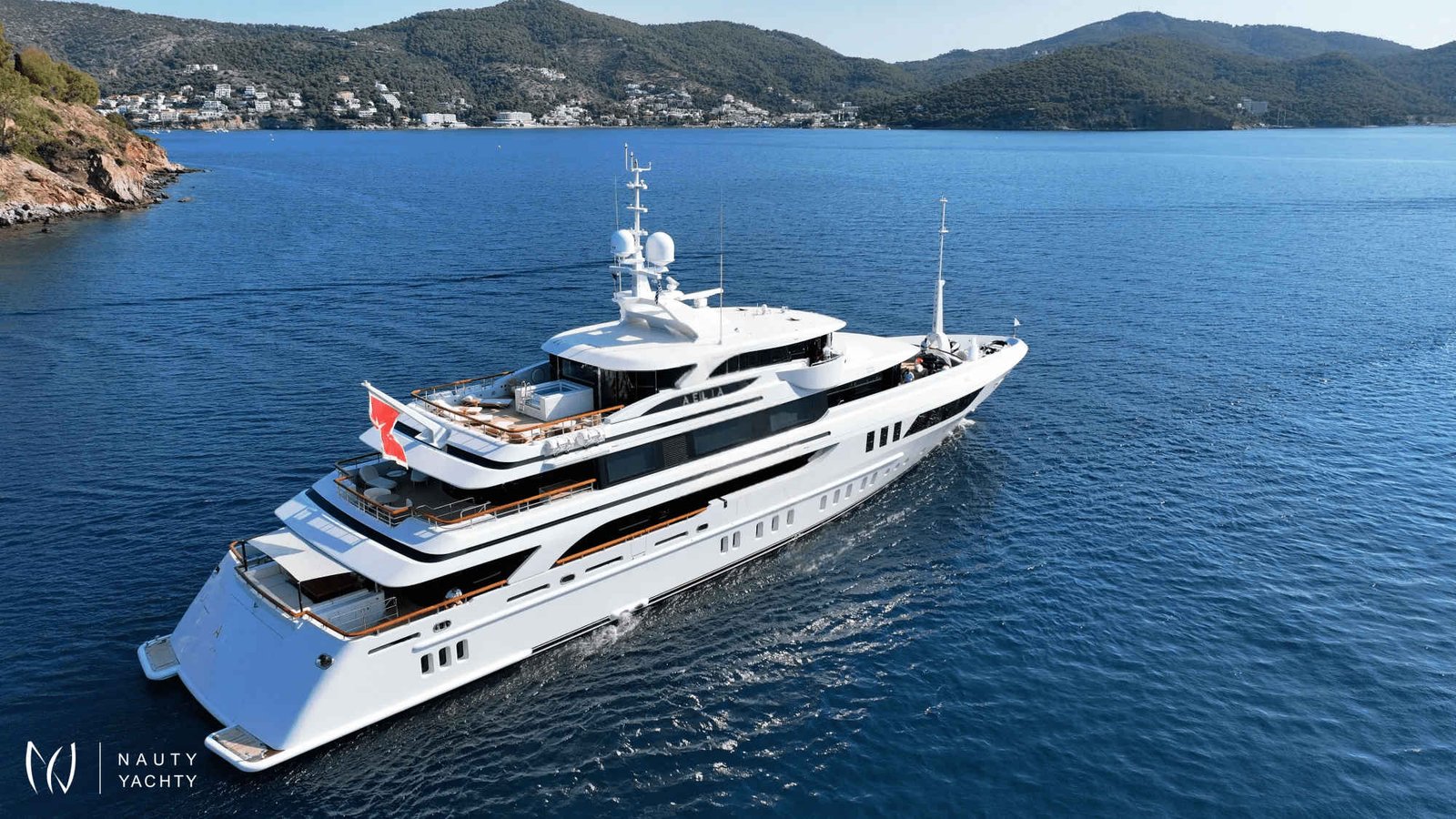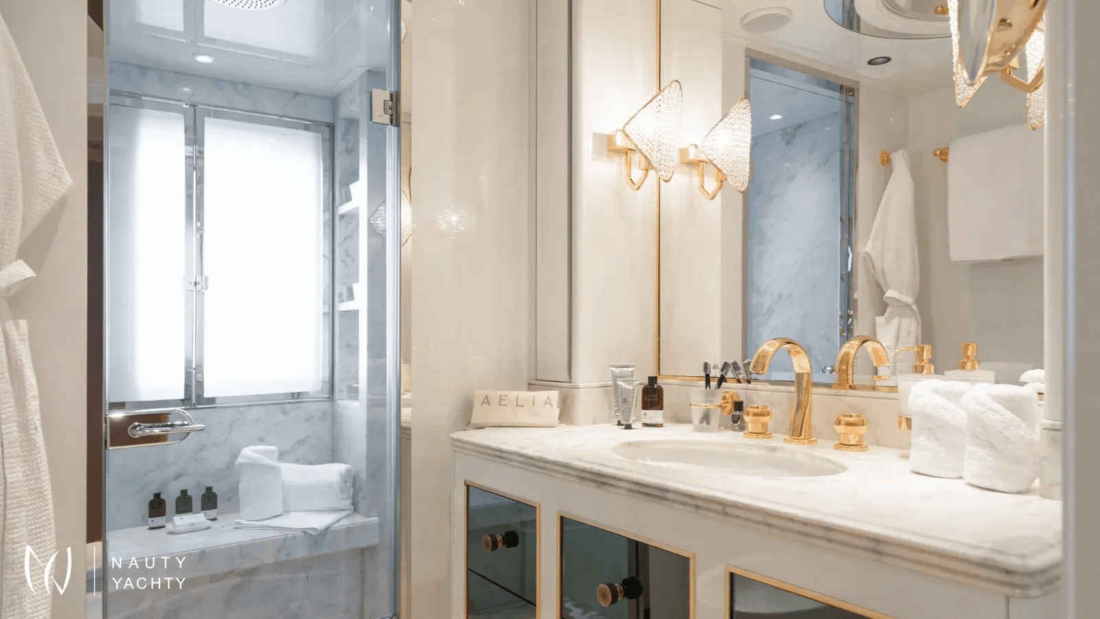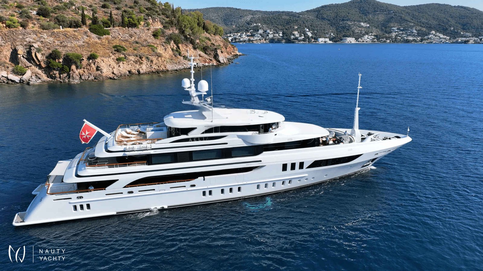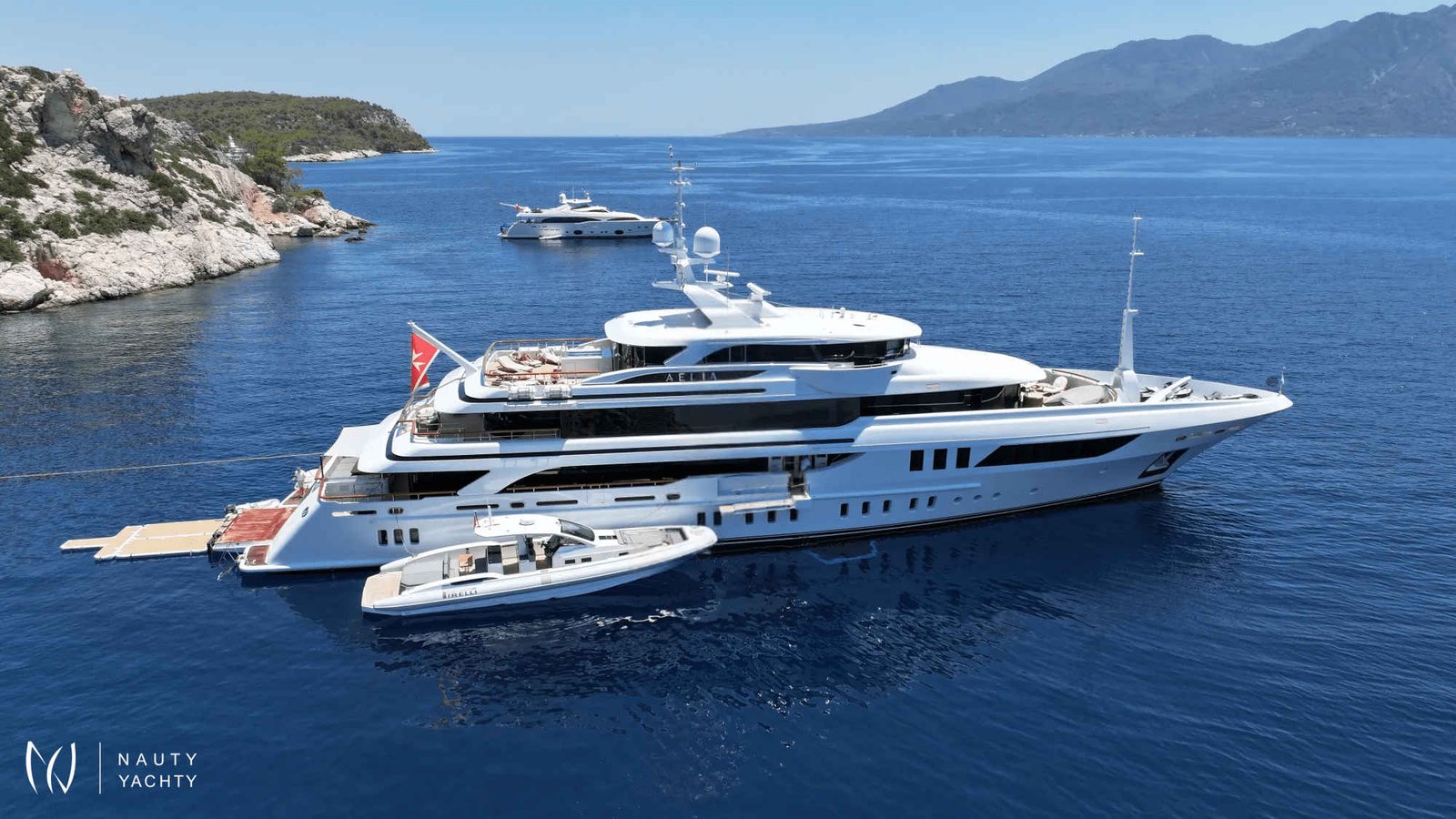 AELIA’s opulent interiors are marked by rich textures, plush furnishings, and grandeur without excess. She accommodates 12 guests across eight spacious cabins, including an exceptional layout with two full-beam master suites on the upper deck; a rare offering for this size category. Six double cabins and two twin offer flexible arrangements, and all benefit from elegant ensuites. The main salon is warm and inviting with oversized sofas, while the formal dining room, complete with a bar and chandelier lighting, sets the stage for celebratory meals.A tri-deck layout gives way to expansive outdoor living. The sun deck features a Jacuzzi, shaded lounging, and panoramic views, perfect for both daytime basking and sunset cocktails. Wheelchair-accessible spaces and an elevator connecting all decks ensure comfort and mobility for all. Whether hosting an al fresco dinner, enjoying drinks on the upper deck, or reading in a quiet corner of the beach club, AELIA offers space and ambiance in equal measure.Wellness is integral to AELIA’s charter experience. Her fully equipped gym, featuring a steam room and ensuite bathroom, allows guests to maintain their fitness routine in privacy. The massage room, flooded with natural light and views, creates a serene space for bodywork and relaxation. Evenings can be spent in the cinema room, where a large screen and cozy seating set the scene for movie marathons or sports viewings.From water-based adventure to top-tier service, AELIA delivers on every front. She carries the most extensive collection of water toys in the Eastern Mediterranean, including the high-performance Pirelli P50 chase tender, ready to whisk guests to remote coves and islands. Whether wakeboarding, diving, or relaxing aboard the tender, the fun is limitless. Her charter-savvy crew of 15, many of whom have worked together for years, are attuned to anticipating needs before they’re even voiced, offering a level of service that is polished, friendly, and truly white glove.