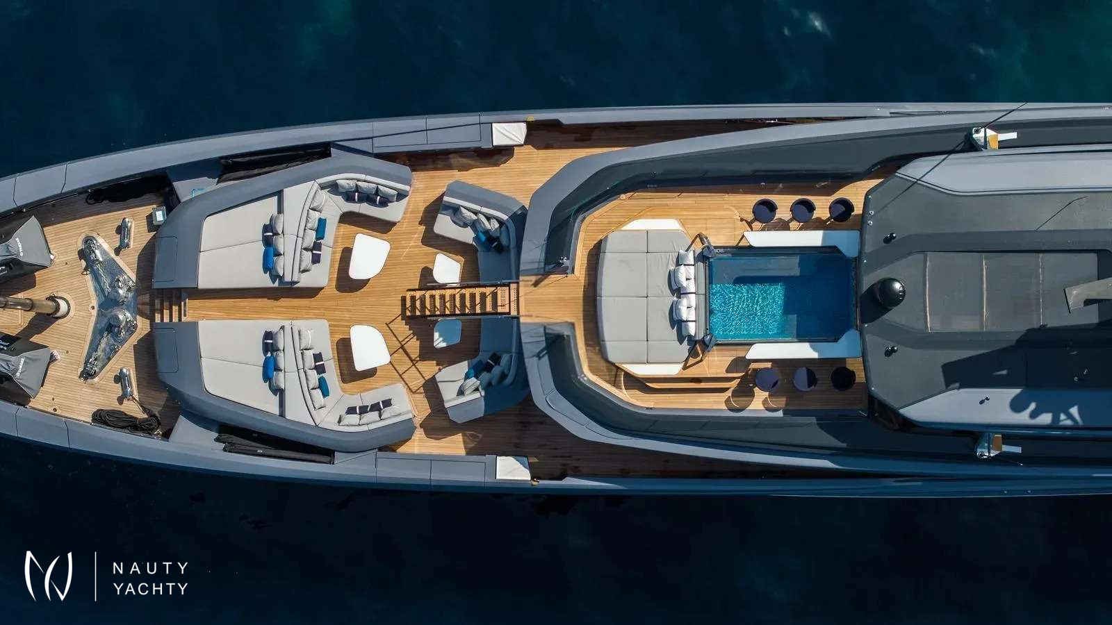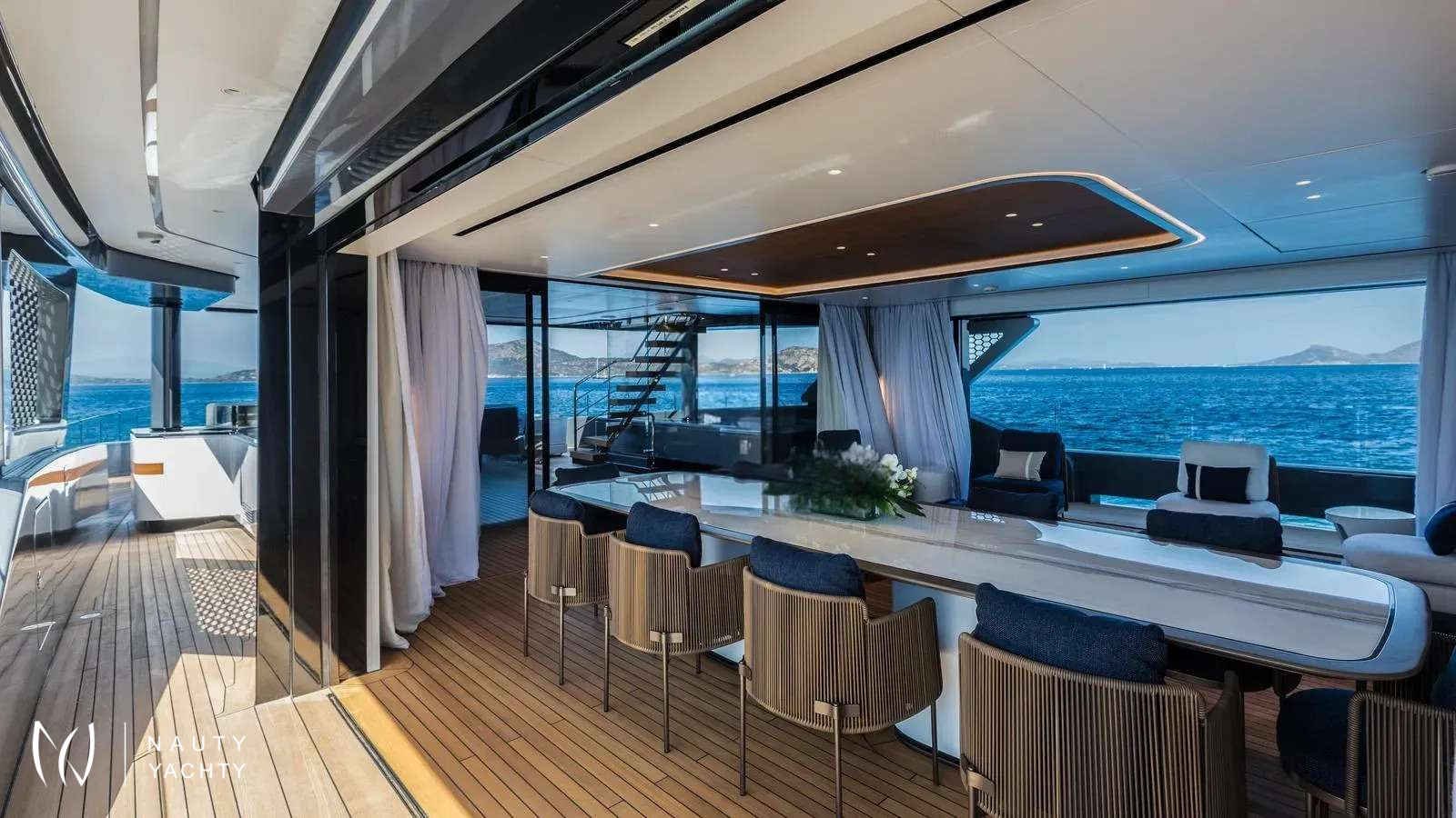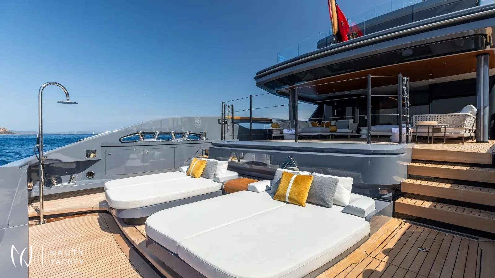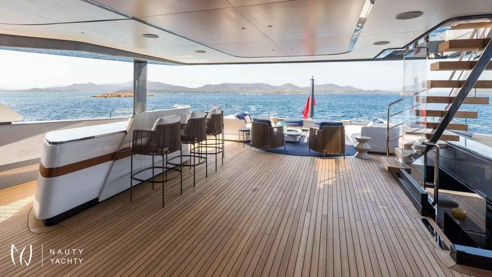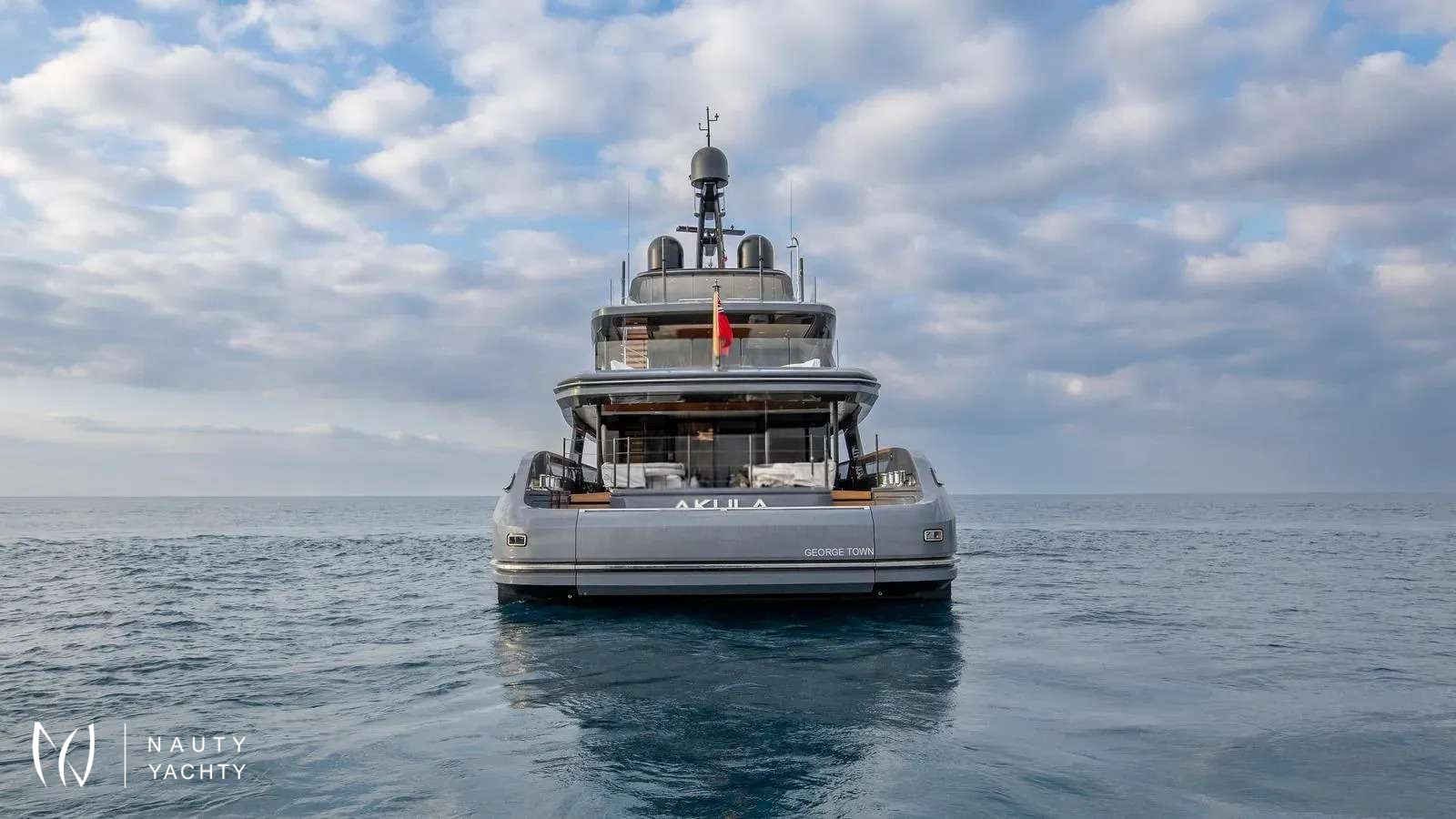 Winner of the 2024 Superyacht Award in her class, AKULA combines sleek Baglietto lines, a commanding dark-grey hull, and refined interiors by Enrico Gobbi’s Team for Design. She offers the perfect balance of style and comfort for up to 12 guests, with a crew of ten ensuring world-class service. The truly expansive sun deck, the largest in her class, is a showpiece. With a glass-edged Jacuzzi, shaded lounges, and alfresco dining for twelve, it is designed for days in the sun and nights under the stars. The aft opens into a multi-level beach club with a retractable pool and cascading terraces that flow straight to the sea, creating the feel of a private resort on the water.Inside, guests will find a private bridge-deck office with video conferencing, a fully equipped gym, and a panoramic sky lounge that transforms into an open-air entertainment space. A full-beam master suite and four additional cabins provide generous accommodations, blending luxury with thoughtful design. AKULA is fully equipped for adventure with a Fjord Open tender, waverunners, Seabobs, kayaks, paddleboards, snorkeling gear, and more. Whether island-hopping the Caribbean or exploring hidden coves in the Mediterranean, she is designed for unforgettable cruising.