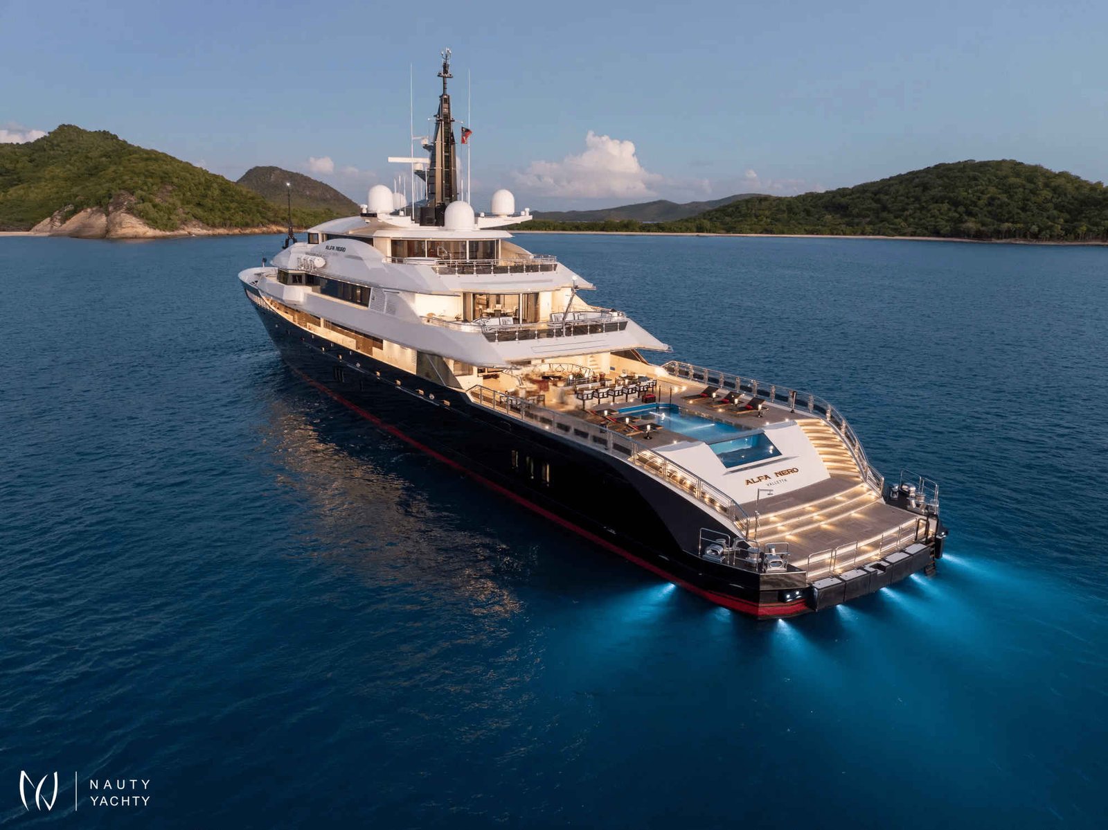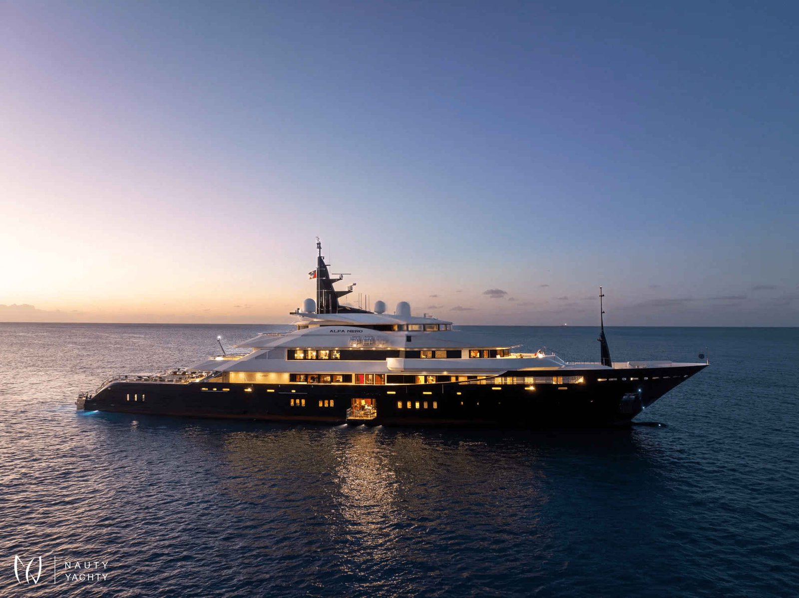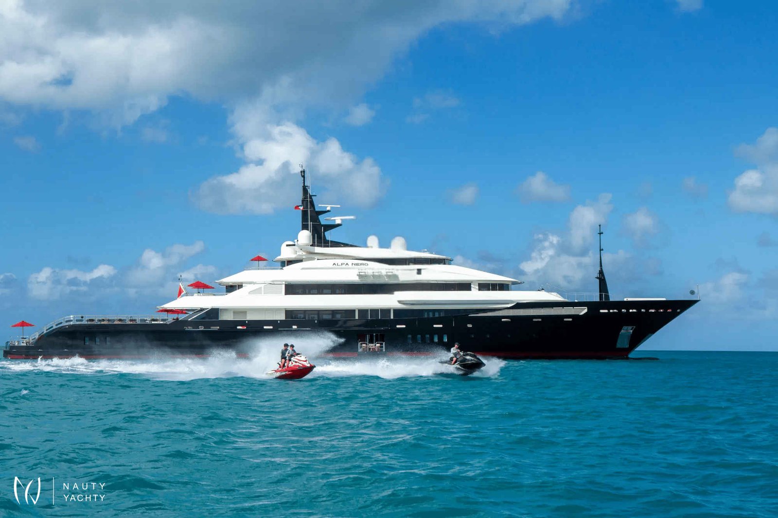 Inside and out, ALFA NERO doesn't resemble other yachts. The interior was created by the imagination of Alberto Pinto taking Pop Art inspiration and combining it with subtle-sea themes. The result is an 82m gallery of interior design; it is quite possible to just sit back and be entertained by looking at the furniture and works of art.Major modern masters decorate the walls, fabrics have Matisse's highly stylised graphic leaf design, and Pop Art swirls, zig zigs, dots and bubbles decorate the entire yacht. Zebrano and sycamore are alternatively planked to create striped floorboards. Macassar ebony is gloss-varnished to provide fabulously rich paneling; maple, birch, and anigre are woven into wall tapestries. Carpets, rugs, floors, armchairs, walls, seat backs, pillars - ALFA NERO is a gallery that has to be seen to be believed.Instead of something as simple as paintings hung on a wall, here is an entire art installation from bow to stern.ACCOMMODATIONTwelve guests sleep in six superbly comfortable cabins across the upper, main, and lower decks. A glass-enclosed elevator glides from the lower to upper decks, past tall, glowing, crystal sculptures and a leather mosaic, lining the circular stairwell.Master Suite:The master suite occupies the entire forward aspect of the upper deck. Inside the suite colours are pale, textures are subtle, and space is splendidly indulgent. The king-size bed faces a 30" TV with surround-sound and guests can gaze across the seascape through a wall of windows. A beautifully crafted breakfast table, sofa, and an elegant chaise lounge are the only other pieces of furniture in this inner sanctum.A starboard pantograph door effortlessly opens from the bedroom to the outside terrace set out with a Jacuzzi pool, twin wing-shaped sunbeds, a dining table and curved sofas. A self-contained private world, not one single centimeter of the substantial master suite terrace is visible or accessible from any other part of the yacht.Back inside the suite continues through a silver-embossed, lacewood architrave to an huge office (could be converted into an additional double cabin with sofa bed). Two grey-flannel marble and cherrywood bathrooms include a steam shower and Jacuzzi bath. A dressing room and several meters of immaculately arranged floor-to-ceiling wardrobes and a dressing table complete the suite.VIP Suites and Cabins:Guest VIP suites and cabins are defined by coral patterns that run across everything from bedheads and counterpanes to cushions and lights. The vibrant colours contrast with paneling made up of a latticework of maple, birch, and anigre.On the main deck, the full-beam VIP suite has a walk-in wardrobe and lounge area (possibility for this to convert into a sofa bed). His-and-hers ensuite bathrooms are thoughtfully planned to combine privacy with practicality.A further double cabin and and two twin cabins that can convert into double bed arrangements as needed are found on this deck and feature intricately patterned, slate and marble bathrooms.The lower deck VIP suite has direct access to a teak lobby that is home to the onboard spa and its wide, square balcony that unfolds over the sea. This cabin features a relaxing sofa and generous ensuite with a bathtub.DININGALFA NERO's dining areas are as much about lifestyle as cuisine. Guests can dine inside or on deck, formally or informally, as a group, a couple, en familles, or even host a huge banquette. The options are as wide as the requirements, "Whatever you want, wherever you want it!" ALFA NERO's master chefs and impeccable service crew will ensure every desire is taken care of.THE POOL DECKALFA NERO's aft deck is like no other superyacht. Above nearly 300 square meters of deck space is the sky. ALFA NERO has one of the largest open aft decks available for charter.Arriving by tender at the stern of the yacht, guests step aboard a full-width teak platform and are greeted by a waterfall from the infinity edge swimming pool. Wide steps lead up to the 7m water-jet pool filled with over 8,300 gallons of either fresh or seawater. Chic black sunbeds and lacquered side tables flank the pool.Via revolutionary Oceanco engineering the pool can be risen to shallower depths suitable for children or complete flush with the aft deck, transforming into a massive entertainment space. 200 guests could easily party the night away on this deck, perfect for hosting luxury events and celebrating very special occasions.AWARDS:Winner 2010 - Asia Boating Awards: Best Custom-Built Yacht over 150ftWinner 2008 - Boat International: Best Motor Yacht InteriorWinner 2008 - Boat International: Best Motor Yacht Exterior StylingWinner 2008 - ShowBoats International: Best Full Displacement Motor Yacht over 75mWinner 2008 - Asia Pacific Boating: Most Innovative Exterior Yacht Design of the YearWinner 2008 - International Superyacht Society: Best Power Yacht over 65mWinner 2007 - Yachts International: Most Innovative Custom Motor Yacht over 40m