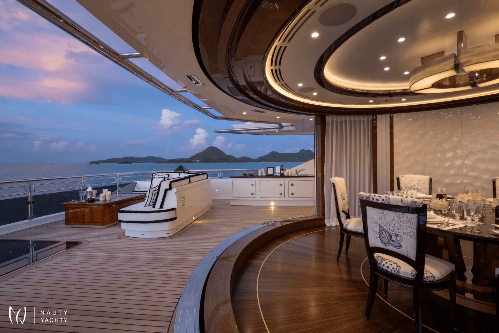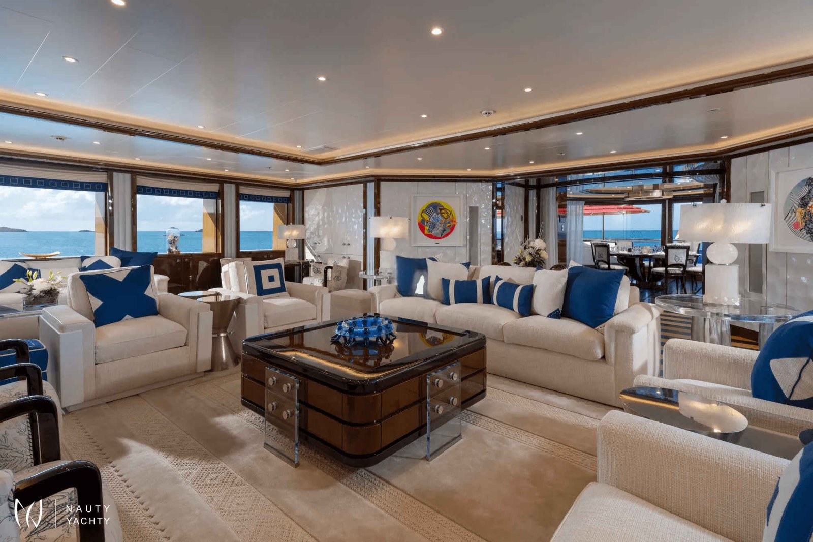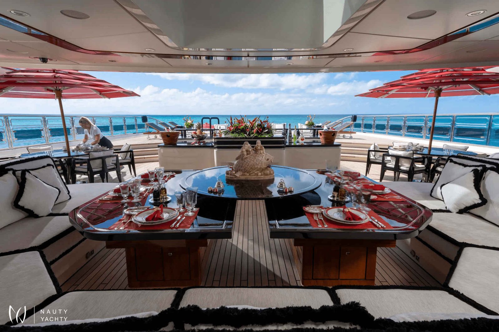 Inside and out, ALFA NERO doesn't resemble other yachts. The interior was created by the imagination of Alberto Pinto taking Pop Art inspiration and combining it with subtle-sea themes. The result is an 82m gallery of interior design; it is quite possible to just sit back and be entertained by looking at the furniture and works of art.Major modern masters decorate the walls, fabrics have Matisse's highly stylised graphic leaf design, and Pop Art swirls, zig zigs, dots and bubbles decorate the entire yacht. Zebrano and sycamore are alternatively planked to create striped floorboards. Macassar ebony is gloss-varnished to provide fabulously rich paneling; maple, birch, and anigre are woven into wall tapestries. Carpets, rugs, floors, armchairs, walls, seat backs, pillars - ALFA NERO is a gallery that has to be seen to be believed.Instead of something as simple as paintings hung on a wall, here is an entire art installation from bow to stern.ACCOMMODATIONTwelve guests sleep in six superbly comfortable cabins across the upper, main, and lower decks. A glass-enclosed elevator glides from the lower to upper decks, past tall, glowing, crystal sculptures and a leather mosaic, lining the circular stairwell.Master Suite:The master suite occupies the entire forward aspect of the upper deck. Inside the suite colours are pale, textures are subtle, and space is splendidly indulgent. The king-size bed faces a 30" TV with surround-sound and guests can gaze across the seascape through a wall of windows. A beautifully crafted breakfast table, sofa, and an elegant chaise lounge are the only other pieces of furniture in this inner sanctum.A starboard pantograph door effortlessly opens from the bedroom to the outside terrace set out with a Jacuzzi pool, twin wing-shaped sunbeds, a dining table and curved sofas. A self-contained private world, not one single centimeter of the substantial master suite terrace is visible or accessible from any other part of the yacht.Back inside the suite continues through a silver-embossed, lacewood architrave to an huge office (could be converted into an additional double cabin with sofa bed). Two grey-flannel marble and cherrywood bathrooms include a steam shower and Jacuzzi bath. A dressing room and several meters of immaculately arranged floor-to-ceiling wardrobes and a dressing table complete the suite.VIP Suites and Cabins:Guest VIP suites and cabins are defined by coral patterns that run across everything from bedheads and counterpanes to cushions and lights. The vibrant colours contrast with paneling made up of a latticework of maple, birch, and anigre.On the main deck, the full-beam VIP suite has a walk-in wardrobe and lounge area (possibility for this to convert into a sofa bed). His-and-hers ensuite bathrooms are thoughtfully planned to combine privacy with practicality.A further double cabin and and two twin cabins that can convert into double bed arrangements as needed are found on this deck and feature intricately patterned, slate and marble bathrooms.The lower deck VIP suite has direct access to a teak lobby that is home to the onboard spa and its wide, square balcony that unfolds over the sea. This cabin features a relaxing sofa and generous ensuite with a bathtub.DININGALFA NERO's dining areas are as much about lifestyle as cuisine. Guests can dine inside or on deck, formally or informally, as a group, a couple, en familles, or even host a huge banquette. The options are as wide as the requirements, "Whatever you want, wherever you want it!" ALFA NERO's master chefs and impeccable service crew will ensure every desire is taken care of.THE POOL DECKALFA NERO's aft deck is like no other superyacht. Above nearly 300 square meters of deck space is the sky. ALFA NERO has one of the largest open aft decks available for charter.Arriving by tender at the stern of the yacht, guests step aboard a full-width teak platform and are greeted by a waterfall from the infinity edge swimming pool. Wide steps lead up to the 7m water-jet pool filled with over 8,300 gallons of either fresh or seawater. Chic black sunbeds and lacquered side tables flank the pool.Via revolutionary Oceanco engineering the pool can be risen to shallower depths suitable for children or complete flush with the aft deck, transforming into a massive entertainment space. 200 guests could easily party the night away on this deck, perfect for hosting luxury events and celebrating very special occasions.AWARDS:Winner 2010 - Asia Boating Awards: Best Custom-Built Yacht over 150ftWinner 2008 - Boat International: Best Motor Yacht InteriorWinner 2008 - Boat International: Best Motor Yacht Exterior StylingWinner 2008 - ShowBoats International: Best Full Displacement Motor Yacht over 75mWinner 2008 - Asia Pacific Boating: Most Innovative Exterior Yacht Design of the YearWinner 2008 - International Superyacht Society: Best Power Yacht over 65mWinner 2007 - Yachts International: Most Innovative Custom Motor Yacht over 40m