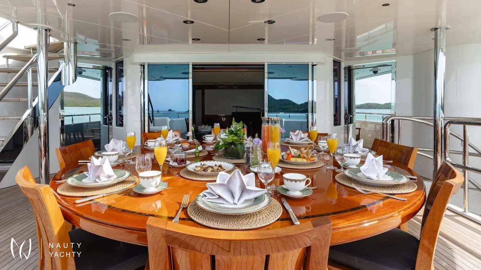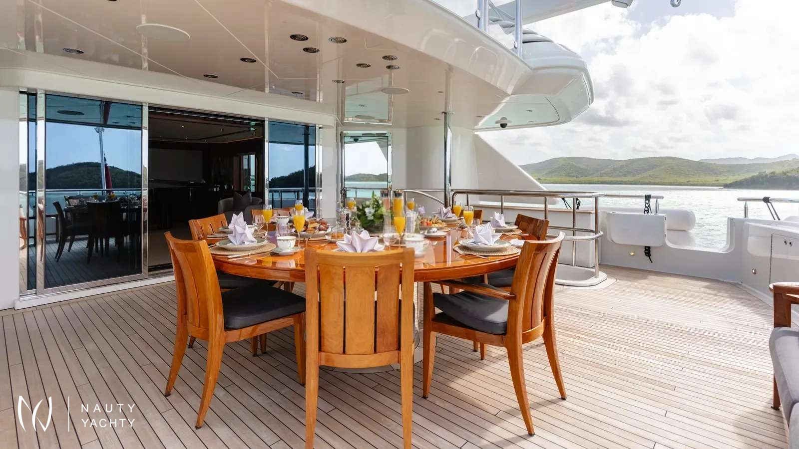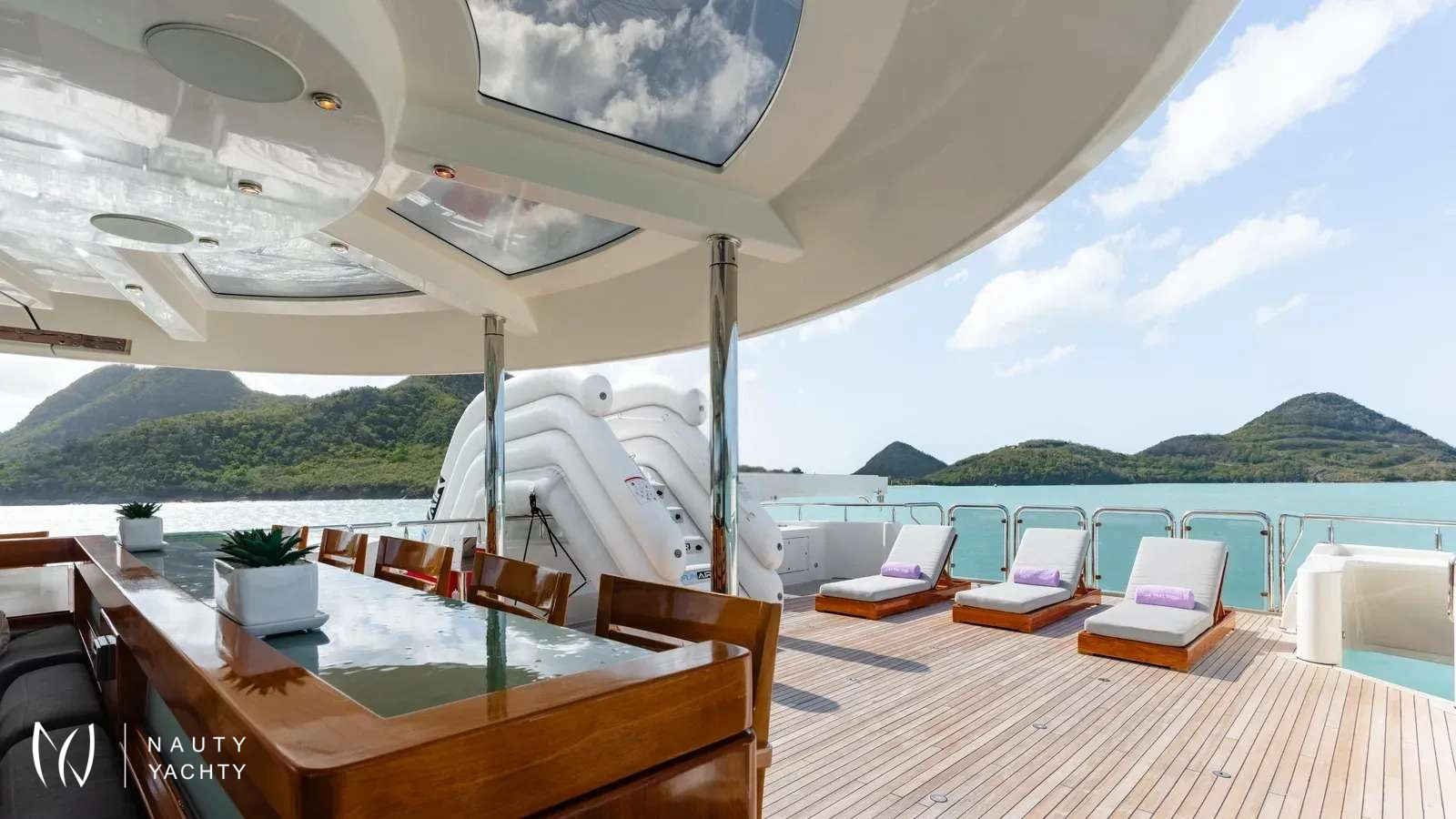AS YOU WISH, one of the finest Westports ever built in 2011, boasts a stylish and spacious interior by Donald Starkey. Elegant contemporary décor creates a warm and inviting environment throughout the yacht. The large main salon is a comfortable gathering space complete with lounge seating, a modern entertainment system and a full formal dining table for 12.AS YOU WISH can comfortably accommodate up to 12 guests in 7 staterooms. The private owner's deck is located starboard aft on the Bridge Deck and is complete with his and hers bathrooms with connecting shower and private balcony / outdoor seating area. There is a VIP Suite on the Main Deck with extra large ensuite along with a Twin VIP and a gym (convertible spa) both with full en suites. There are four guest staterooms below on the lower deck, all fitted with en-suite bathrooms. Other features include a massive selection of water toys and experienced crew of 11 who are passionate about creating a truly unique and special charter experience for every guest.ACCOMODATIONSBRIDGE DECK:Master Stateroom - 1 KingMAIN DECK:VIP - 1 KingTwin - 2 SinglesLOWER DECK:VIP Port side - 1 KingVIP Starboard side - 1 KingDouble - 1 Double, 1 Single, 1 PullmanTwin - 2 SinglesWALK THROUGH:MAIN DECK:The main aft deck has a large dining table aft that can accommodate up to 16 guests with free-standing chairs. On the forward port side is a full-service bar with three bar stools and television fitted on the aft bulk head.Entering through the double doors into the main salon, the windows on port and starboard side offer expansive views and natural light. A well-balanced asymmetrical seating arrangement provides a flexible and generous amount of seating, including personal seating options in the form of sofas and individual armchairs. Moving forward on the open floor plan you arrive at the dining area designed to accommodate up to 12 guests. To starboard is the main foyer entrance where there is a stairway that leads to both the Upper and Lower Decks.Further forward, just past the Main Deck foyer, you will find a day head. Continuing along down the hall to starboard, you will find a gym that converts to a spa/massage suite with ensuite, the main deck VIP suite with the largest of marble-clad en suites and ultimately a Twin VIP with en-suite.The galley also on the Main Deck is the source of meals to remember! It's spacious enough for a master chef and has a designated area for service preparation.BRIDGE DECK & MASTER SUITE:Going up the stairs from the Main Deck foyer you will arrive at the Bridge Deck foyer, which separates the pilot house, office, pantry and Captain's quarters forward from the Master Suite and Bridge Deck salon / sky lounge aft. Outside forward of the pilot house is a generous forward-facing sunpad.Upon entering the Master Suite through double doors on the starboard side, you will find the walk-in closet forward. The room is tastefully decorated with a King-sized bed, neutral colored fabrics and a glass door that leads to a private balcony / outdoor seating area on the starboard side aft. Around the bed on the starboard side forward is a his and hers ensuite with a connecting marble shower.Further aft of the master stateroom is the sky lounge, which if desired, principal guests can choose to use it as their own private lounge or keep it accessible for other guests to enjoy. The Bridge Deck salon houses a grand player piano and fireplace.Continuing aft through the main sky lounge double doors, you will arrive at the bridge deck aft where guests can enjoy al fresco dining at a round table that accommodates up to 12 persons. There is a settee area aft with cocktail tables great for relaxing after a satisfying meal.LOWER DECK:There are 4 staterooms, which include: 2 King VIP suites on the port and starboard sides, a twin stateroom with a pullman and en suite, and a VIP stateroom with 1 Double bed, 1 single bed and a pullman on the forward port side with en suite - great for children!SUN DECK:The spacious sun deck offers a variety of options for al fresco lounging in and out of the sun. The center section is comprised of a counter top with 6 stools, an L-shaped sofa, 2 cocktail tables and 2 arm chairs. All the way forward is a large Jacuzzi with a wrap-around sunpad. The aft deck space is equipped with chaise lounge chairs for the those looking to enjoy the sun. This deck is accessed via the stairs on the port side leading up from Bridge Deck. A BBQ grill is conveniently located on the sun deck.Optional sun shades for most exposed deck areasINTERIOR AMENITIES:Safes & Locations: 1 x Master Cabin & 1 x Vip CabinPillows & Comforters: Matouk Libero 100% cotton percale shell hypoallergenic filled beddingLinens: Matouk Essex Sierra 350 thread count long-staple cotton percaleTowels: Matouk Cairo 100% Long-staple cotton terry towelsBathrobes: Cypress Hotel & SpaHair Dryers: Revlon, with a concentrator nozzle and diffuser attachments (1 x per Cabin Head (Bathroom)Bathroom Toiletries: L’occitane shampoo, conditioner, body wash, body lotion, bar soap, hand soap, deodorant, shaving cream, and more. RiseWell toothbrush, toothpaste, floss, and mouthwash.Seasickness: Reliefband Premier Pulse Seasickness Bands, Seabands, and medications available.Sunscreen: Sun Bum SPF 15-70Bug Spray: Kinfield.Rain/Wind and Beach Apparel/Gear: Umbrellas, rain jackets