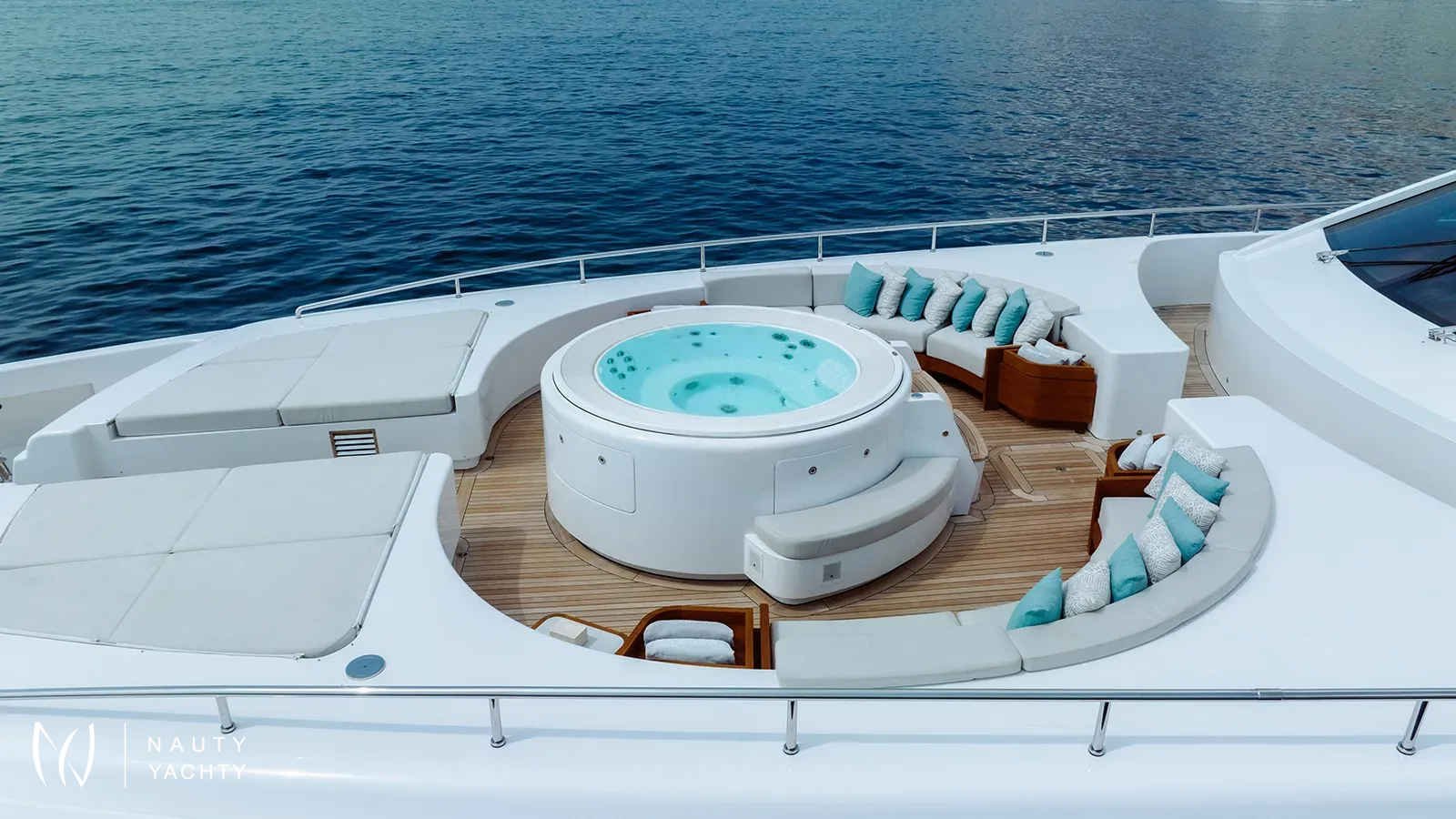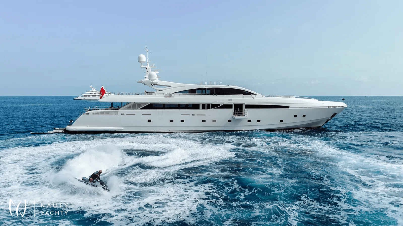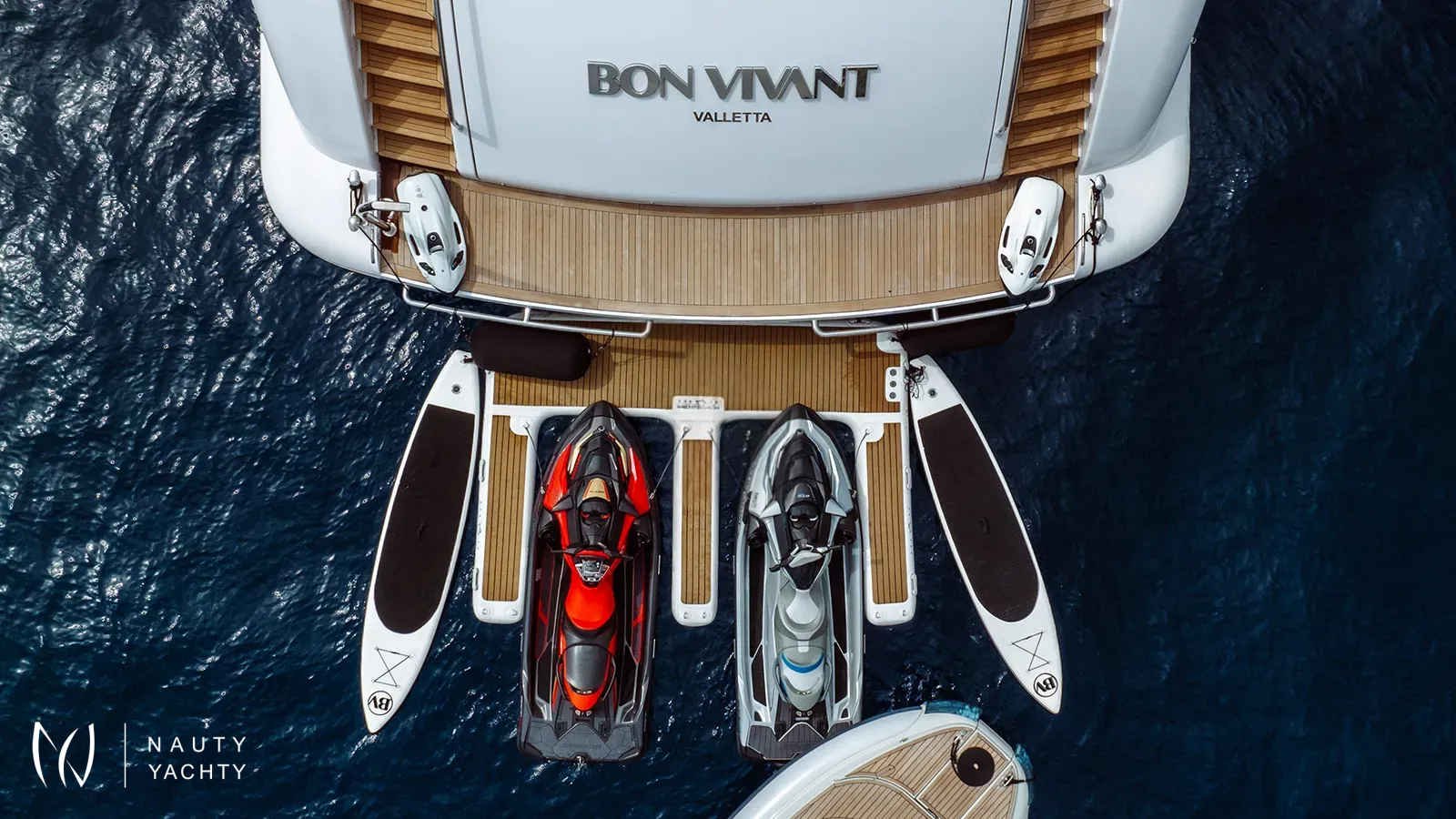 A finalist in both the World Superyacht Awards and ShowBoats Design Awards in 2014, Bon Vivant offers an outstanding charter experience for up to 12 guests. Jet propulsion and a draft of just 6.5’ make Bon Vivant ideal for cruising both the shallow waters of The Bahamas and the azure Mediterranean. With six large cabins, she is a popular choice for all charter group configurations. Presented in immaculate condition following a significant 2020 refit, huge investment has been made to update her many charter amenities, including the addition of an on deck Jacuzzi forward and a brand new, fully-equipped Technogym with a fold-down balcony.Built in 2013 by Codecasa, Bon Vivant is a shining example of the Italian shipyard’s custom-built, all-aluminium superyachts. A high-speed performance yacht, she is both seaworthy and comfortable with high quality, award-winning features to create an unmatched onboard experience.Reaching thrilling top speeds of 29 knots, a sporty exterior design with open-plan layout by Andrea Bacigalupo creates near-endless deck space for guests to enjoy. Relax on the upper deck sun loungers, enjoy al fresco meals shaded from the midday heat, or take an aperitif on the inbuilt U-shaped seating with dinette tables on the foredeck. Those wishing to spend time bronzing will also appreciate the large foredeck sunpads, while further forward a smart deck space allows guests to truly appreciate Bon Vivant’s incredible speeds.Additional lounge seating is found on the main deck aft, which is subtly sheltered from both sun and wind. When at anchor, long hours spent in the generous beach club are made all the more comfortable by Bon Vivant’s gyroscopic zero speed stabilisers. From here, guests can dive into snorkel exploration or up the tempo with a host of inflatable towables. A collection of the finest water toys, from jetskis and JetSurfs to SeaBobs offer a large dose of fun for all ages. Two GoCycles make shore-side exploration pleasurable and easy, and a 23’ Castoldi tender picks up the tempo for waterski and wakeboard fans alike.Up to 12 guests are accommodated in six large cabins. The owner’s full-beam stateroom offers an outstanding living space on the main deck, with two dressing rooms, two bathrooms, a private balcony and direct access to both the owner’s study and the onboard gym. An additional two VIP double cabins, one double cabin and three twin cabins can be found on the lower deck. All guest suites include entertainment centres with televisions and en suite facilities.Perfectly suited to all types of charter party, from couples to families and corporate groups, Bon Vivant has something for everyone, with themed romantic charters or corporate events even an option.**NOT OFFERED FOR CHARTER WHILE IN US WATERS**