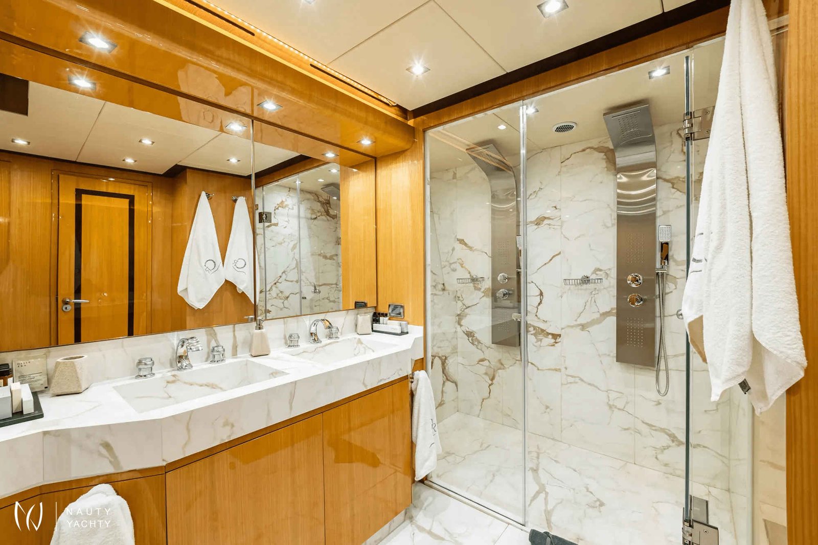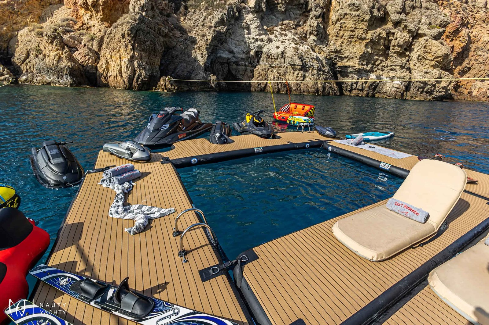 A one-of-a-kind Tecnomar 35 superyacht (116ft), CAN’T REMEMBER turns heads wherever she roams, thanks to her super sleek profile, deep navy hull and an exceptional presence on water. CAN'T REMEMBER has six staterooms all with en-suite facilities, a unique choice for families as she can accommodate with comfort up to 12 guests! Her main salon ,separated from dining room with a sleek black fixture, boasts selected furnishings and large windows for incredible views. Characterized as the ultimate pleasure point and designed with comfort and entertainment in mind, she has many options for entertaining both indoors and on her exterior decks. Exterior decks feature the aft deck with its shaded al fresco dining area, the fore deck’s large sun pads and the upper deck with an outstanding dining area for 22 guests. Being a certified Kosher environment and providing exceptional services on board , Can’t Remember stands out for a summer experience like no other! Her 7 star services inspires and elevates guest experience to the maximum ,starting from daily changing of apparel and upgraded housekeeping to delivering top tier services in all aspects with great attention to detail. The selection of water toys can ensure pleasing guests of all ages and are easily accessed from her extended swimming platform. Water skis, kayaks, jet skis, stand-up paddleboards, wakeboard, snorkel gear and an inflatable slide are just some of the fun that awaits you on board!