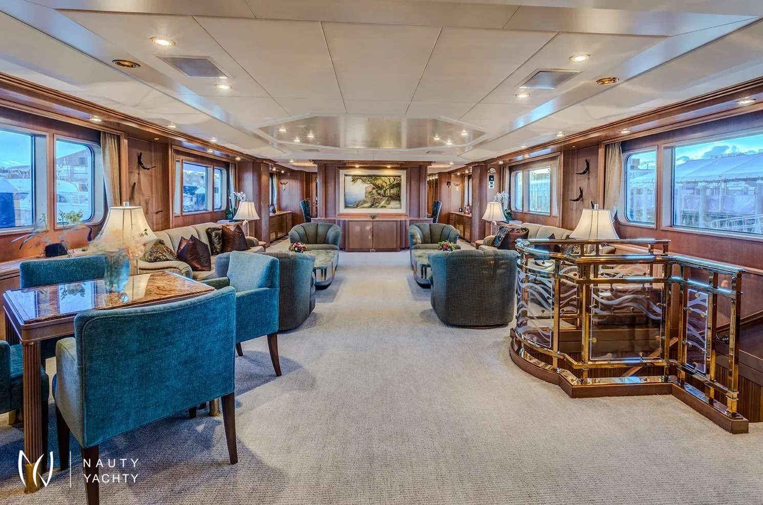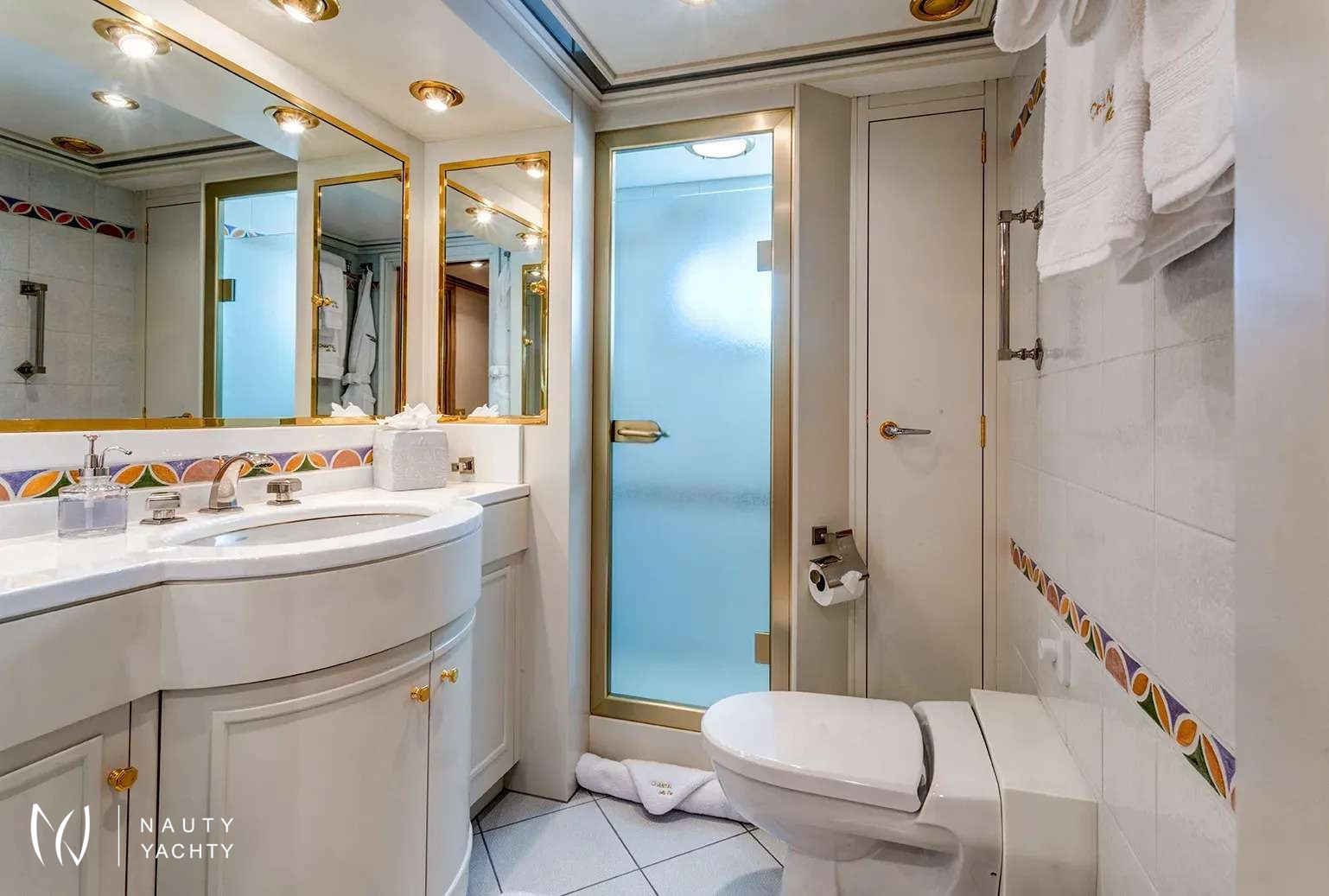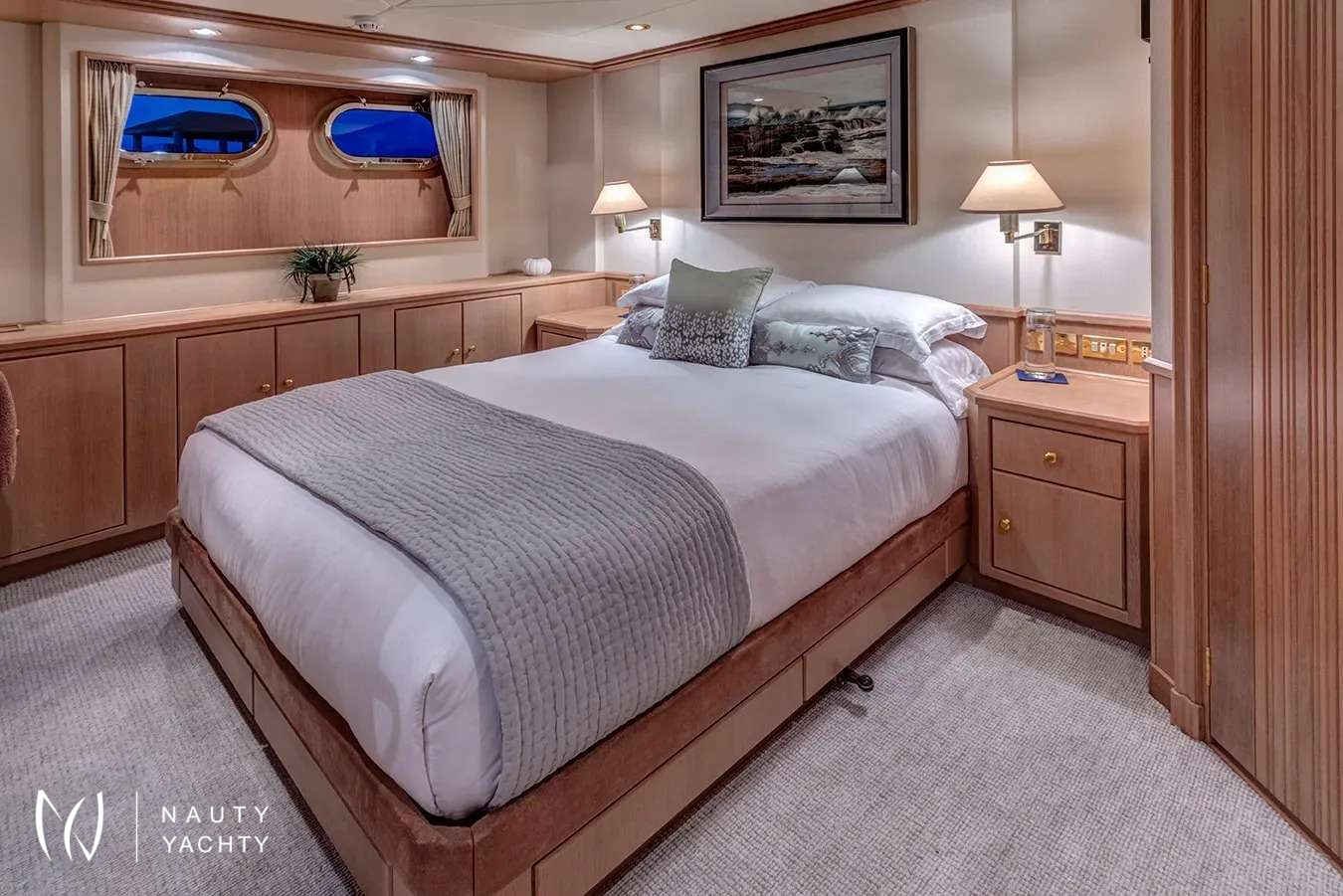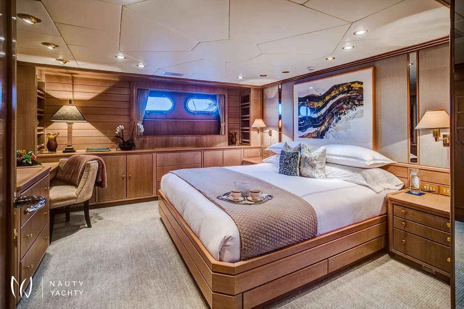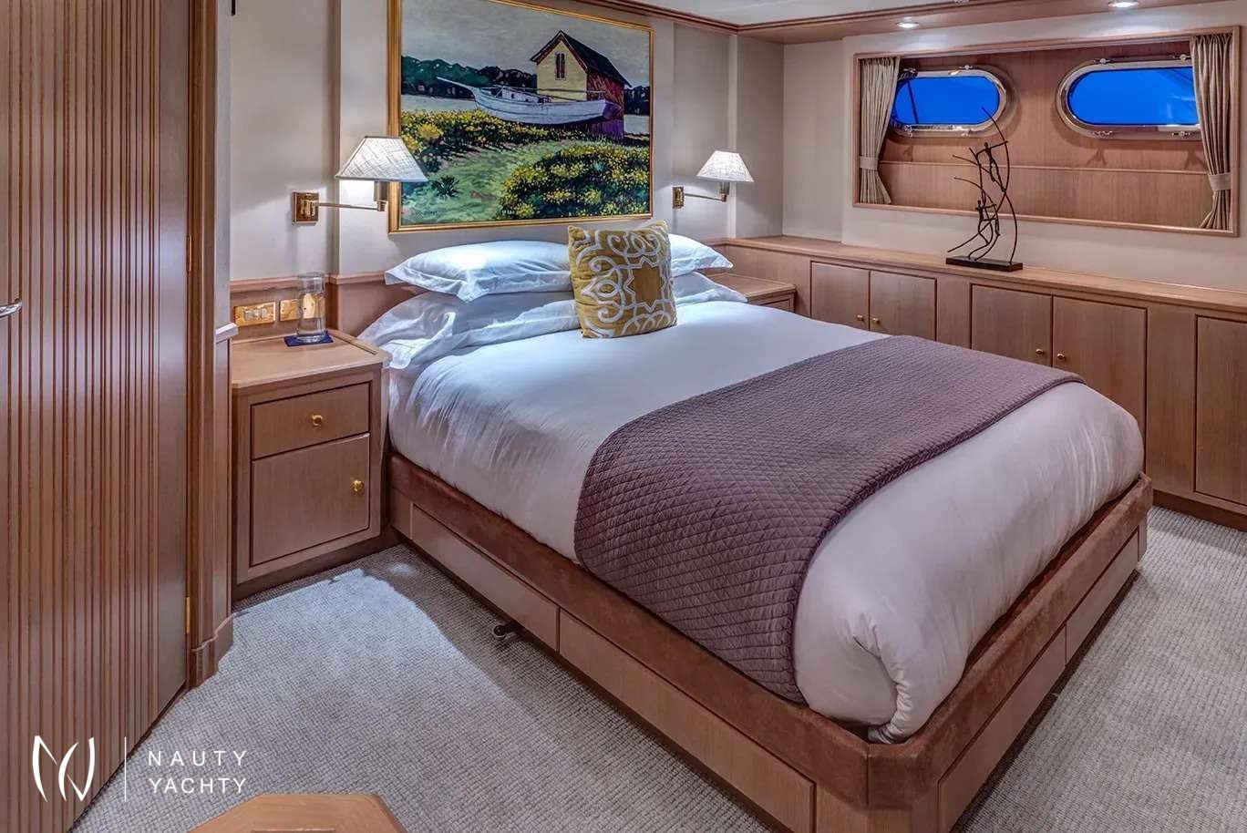 Guest Accommodation:All staterooms are light pickled ash and oak with silk wallcovering Light neutral woven carpeting throughout. Hairdryers, slippers and robes in all staterooms. 110 and 220 VoltageSTATEROOMSMaster Suite Main Deck: KING. Private office, Full width bathroom w/ Jacuzzi and walk in closetsVIP Stateroom Below Deck/Forward: KING, bathroom w/ JacuzziGuest Stateroom below Deck, amid ship: QUEEN, bathroom w/ showerGuest Stateroom, Below Deck, amid ship: QUEEN, bathroom w/ showerGuest Stateroom Below Deck, Aft: DOUBLE, SINGLE and PULLMAN, bathroom w/ showerGuest Stateroom Below Deck, Aft: DOUBLE, SINGLE and PULLMAN, bathroom w/ shower***Staff Stateroom Bridge Deck (Upper/lower or twins)SUN DECKLarge open area with lounge chairs, day head and a Jacuzzi forward with a view.BRIDGE DECKSky lounge with marble topped bar and six stools. Marble topped game table with 4 chairs. Sliding doors lead to the bridge deck that has covered dinging and bench seating with umbrellas. There is a mahogany lined table for 12 guests.MAIN DECKForward is the Master suite followed by the galley and formal dining room with seating for 12 guests. The saloon has 2 large sofas and occasional chairs and includes a concealed entertainment center.AFT DECKMarble topped wet bar, sofas and casual dining area. Steps down on both sides of the aft deck lead to the new extension and large deck area with a second Jacuzzi and swim platform.BELOW DECK4 StateroomsGym with access from the main deck aft