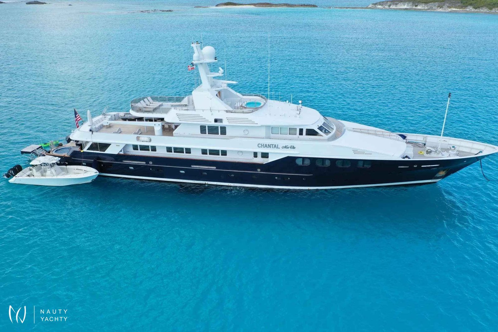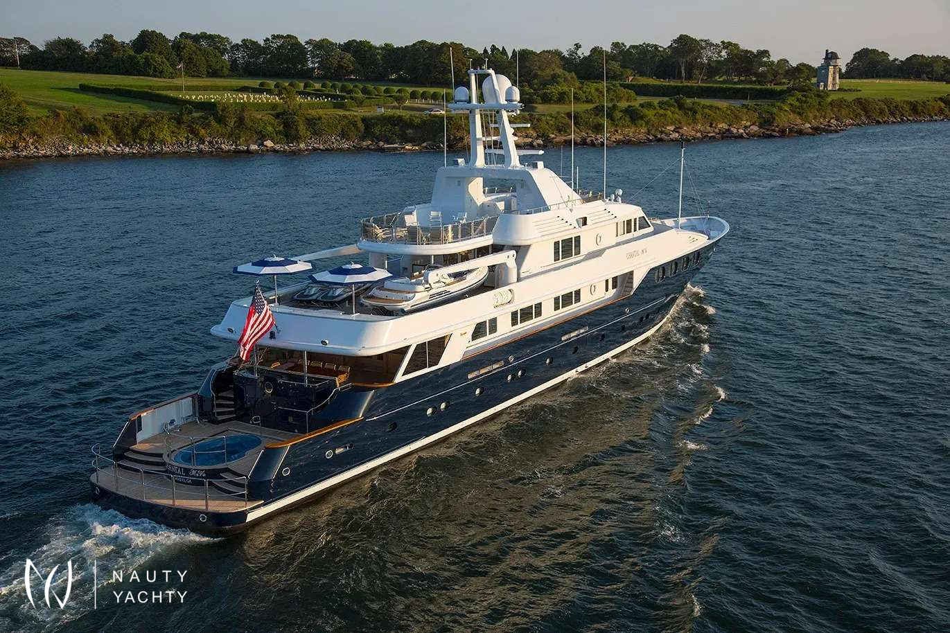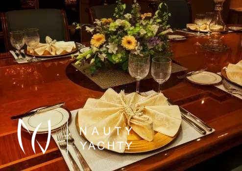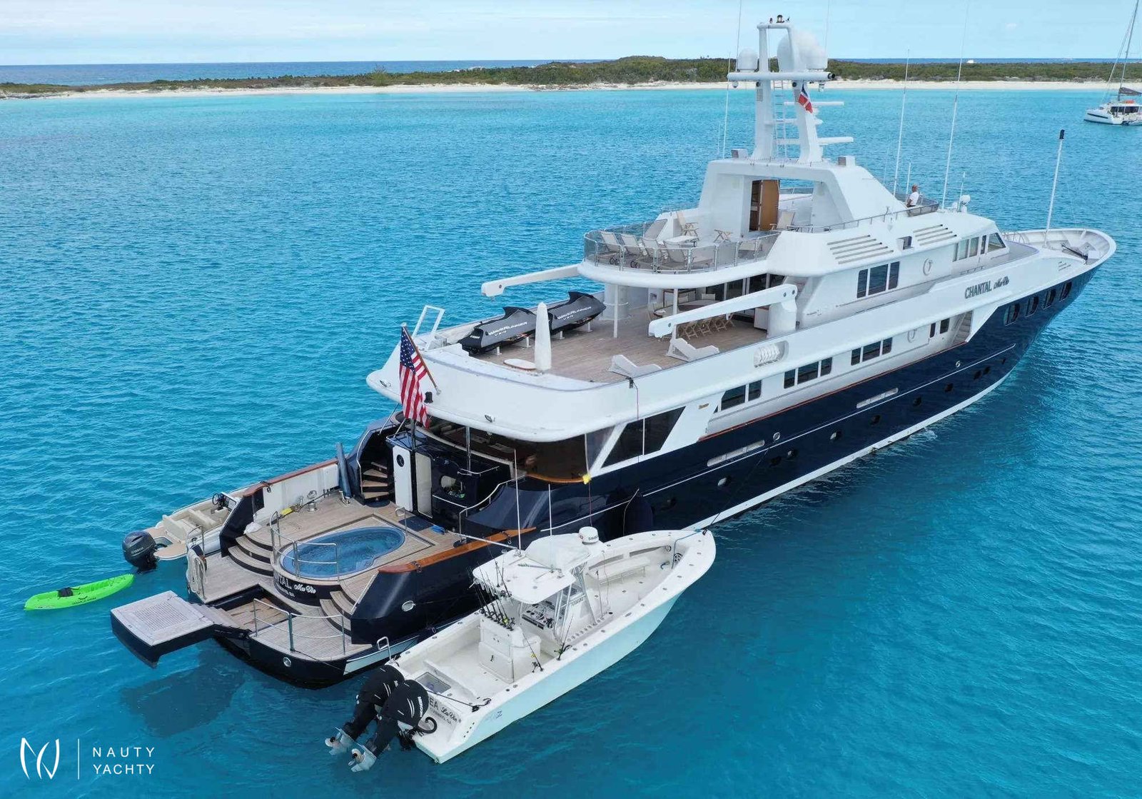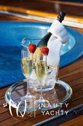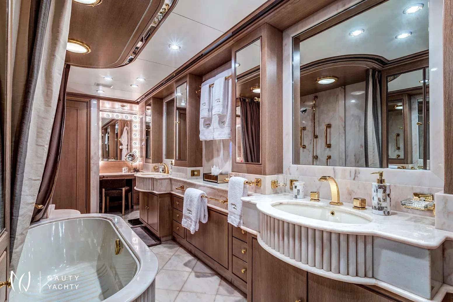 Guest Accommodation:All staterooms are light pickled ash and oak with silk wallcovering Light neutral woven carpeting throughout. Hairdryers, slippers and robes in all staterooms. 110 and 220 VoltageSTATEROOMSMaster Suite Main Deck: KING. Private office, Full width bathroom w/ Jacuzzi and walk in closetsVIP Stateroom Below Deck/Forward: KING, bathroom w/ JacuzziGuest Stateroom below Deck, amid ship: QUEEN, bathroom w/ showerGuest Stateroom, Below Deck, amid ship: QUEEN, bathroom w/ showerGuest Stateroom Below Deck, Aft: DOUBLE, SINGLE and PULLMAN, bathroom w/ showerGuest Stateroom Below Deck, Aft: DOUBLE, SINGLE and PULLMAN, bathroom w/ shower***Staff Stateroom Bridge Deck (Upper/lower or twins)SUN DECKLarge open area with lounge chairs, day head and a Jacuzzi forward with a view.BRIDGE DECKSky lounge with marble topped bar and six stools. Marble topped game table with 4 chairs. Sliding doors lead to the bridge deck that has covered dinging and bench seating with umbrellas. There is a mahogany lined table for 12 guests.MAIN DECKForward is the Master suite followed by the galley and formal dining room with seating for 12 guests. The saloon has 2 large sofas and occasional chairs and includes a concealed entertainment center.AFT DECKMarble topped wet bar, sofas and casual dining area. Steps down on both sides of the aft deck lead to the new extension and large deck area with a second Jacuzzi and swim platform.BELOW DECK4 StateroomsGym with access from the main deck aft