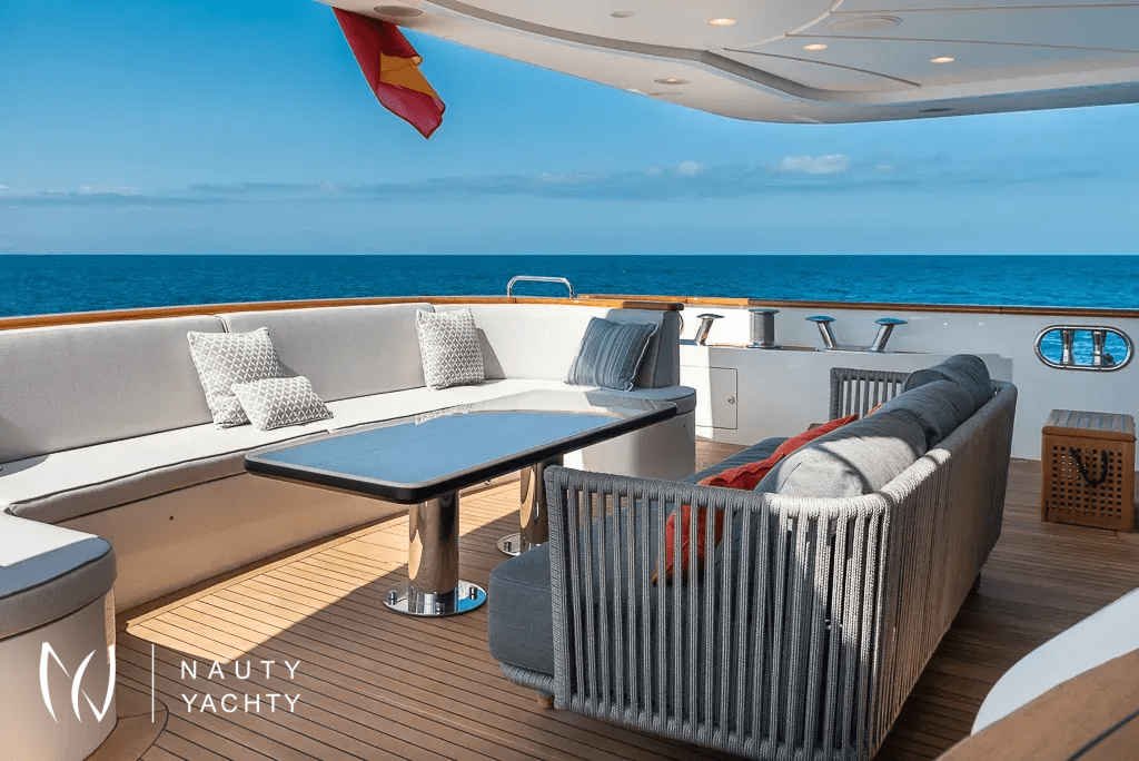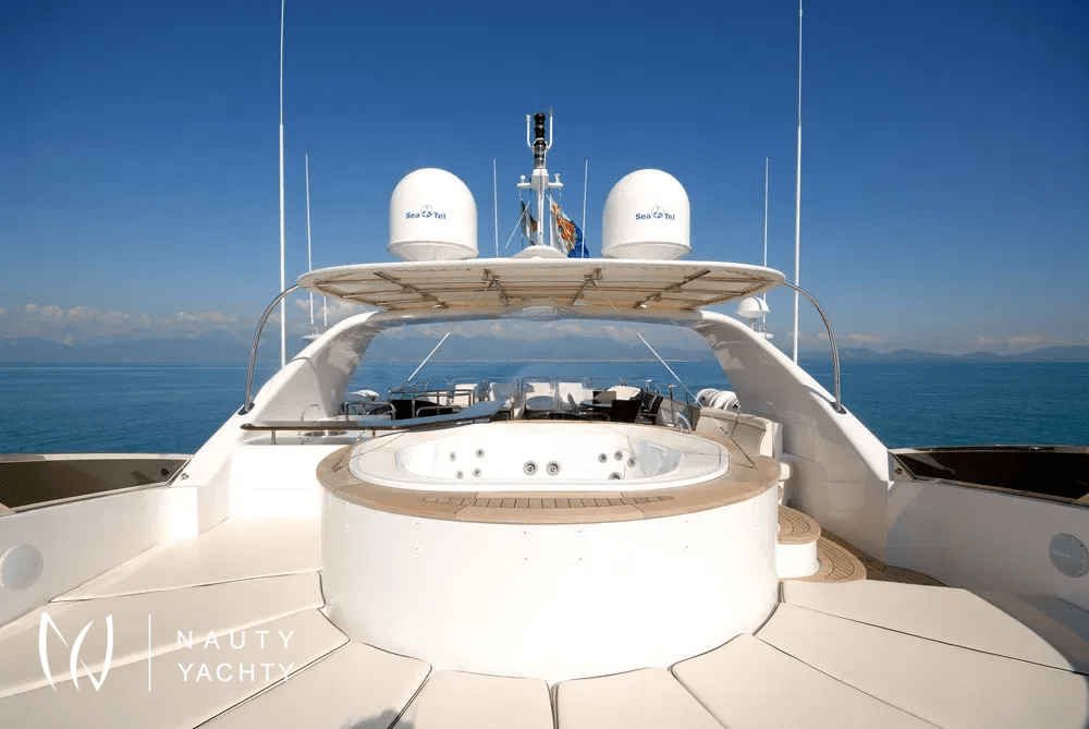 Expansive sun deck featuring a jacuzzi, bar, dining area, and sun loungers for ultimate relaxation