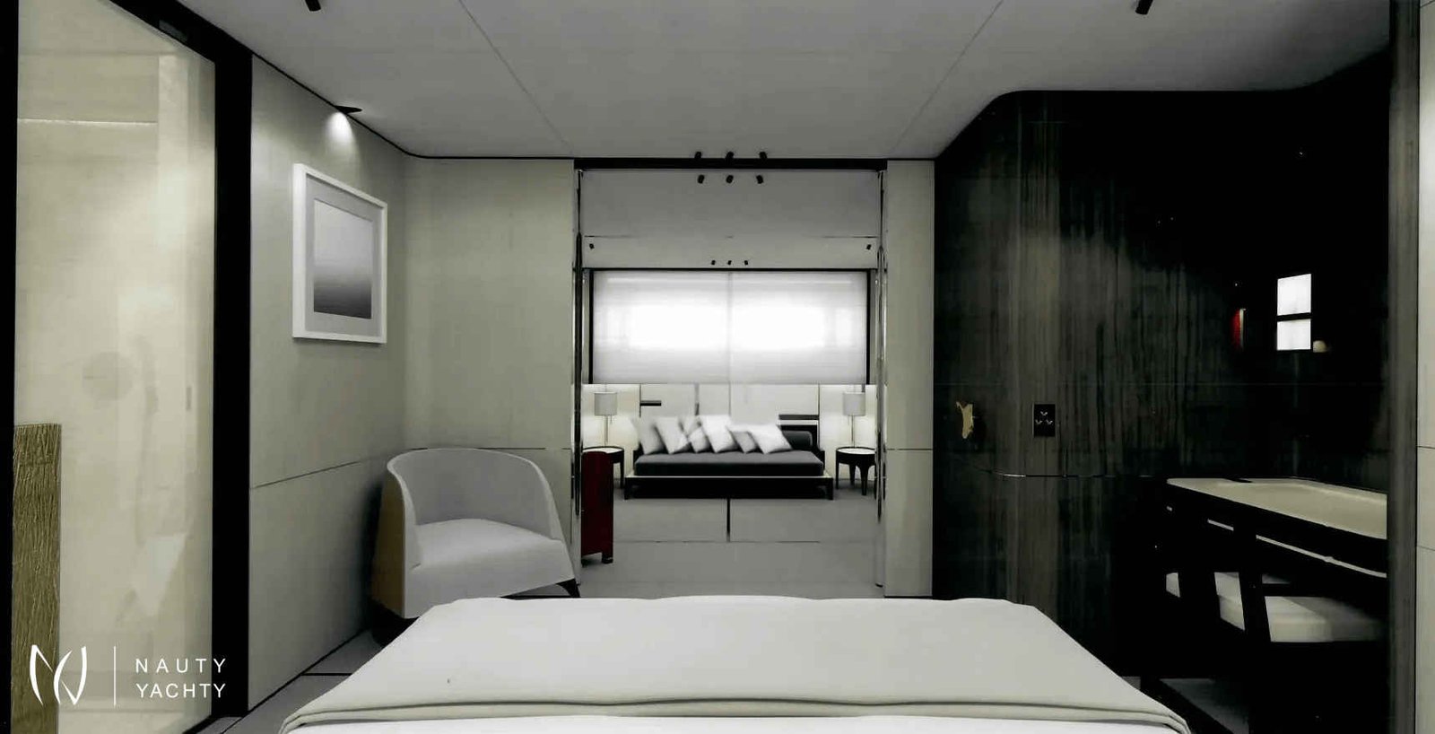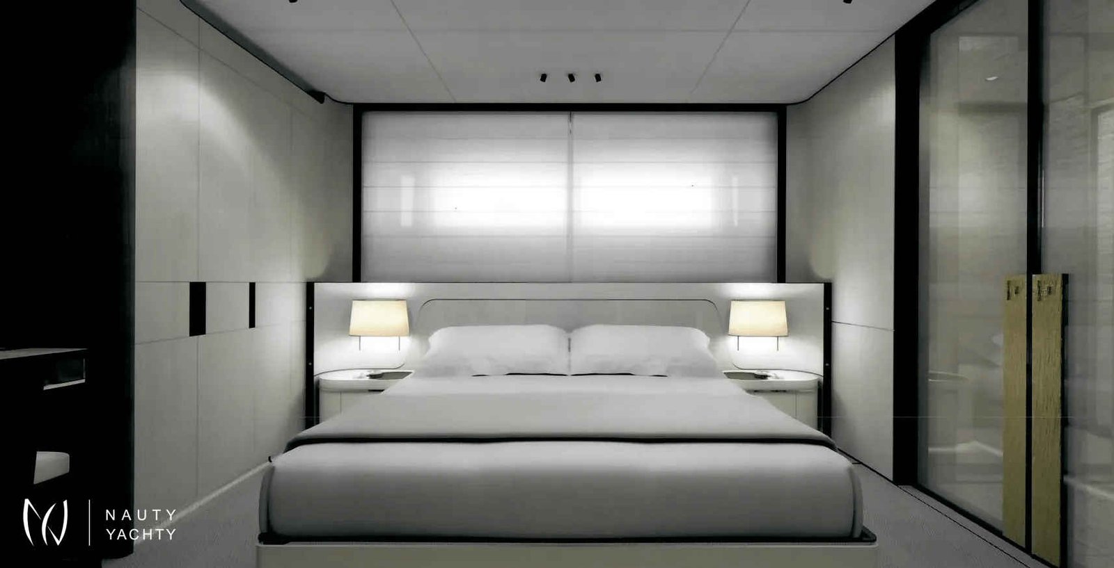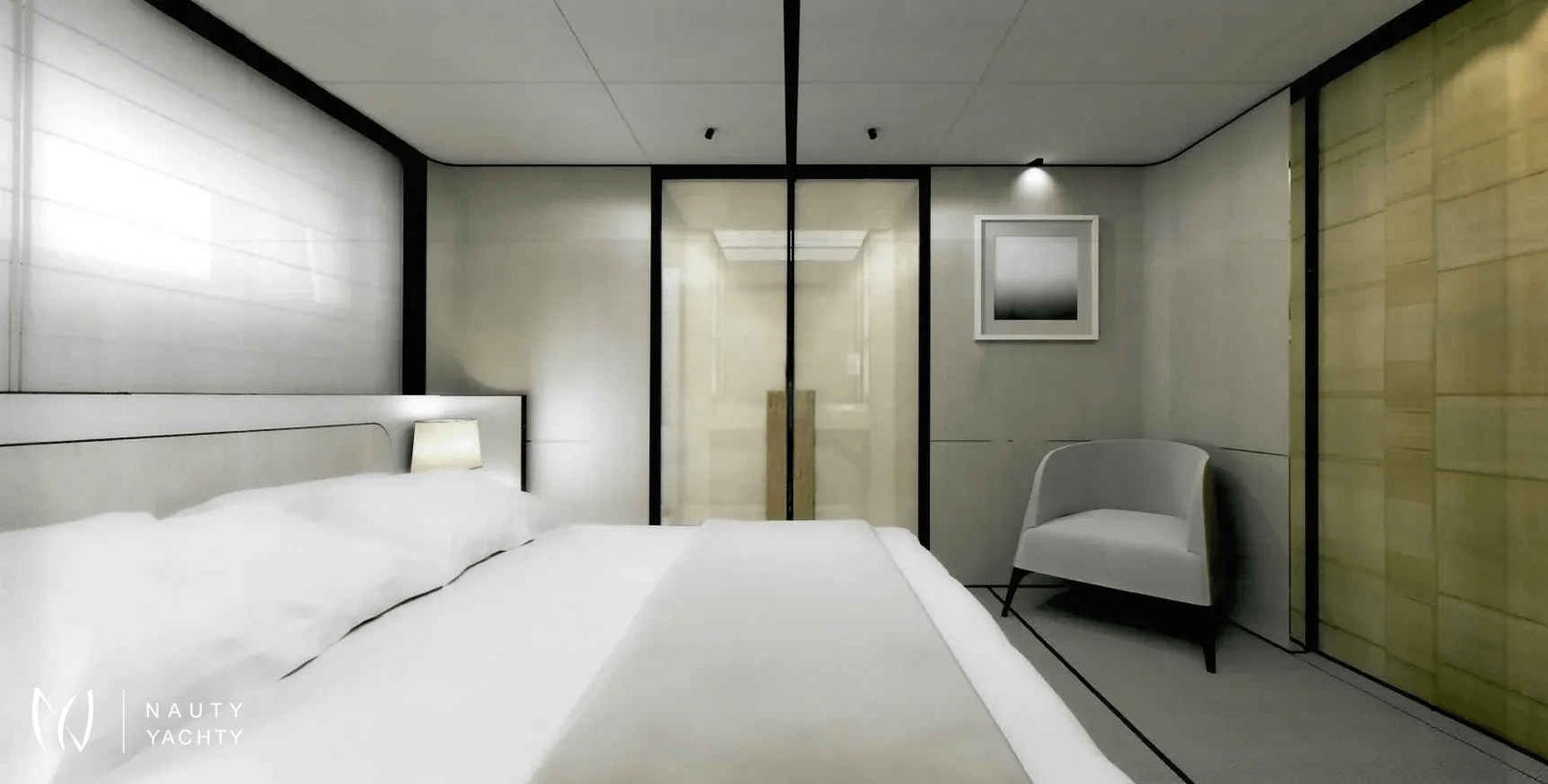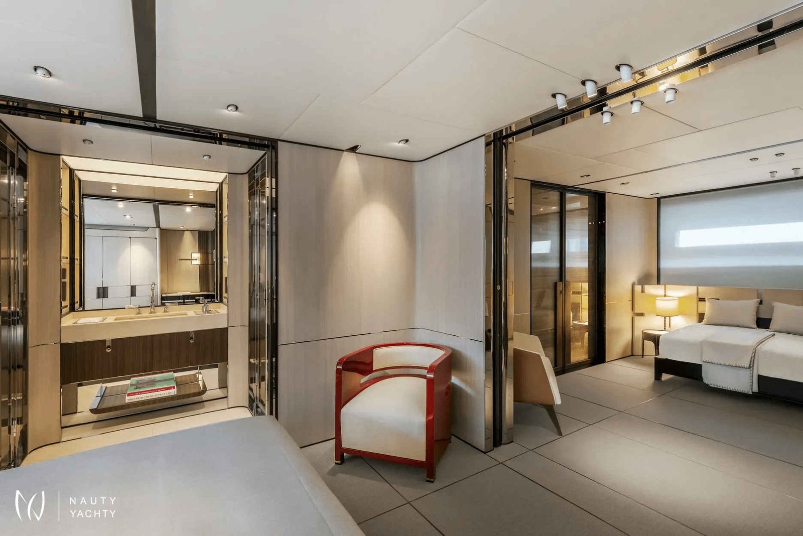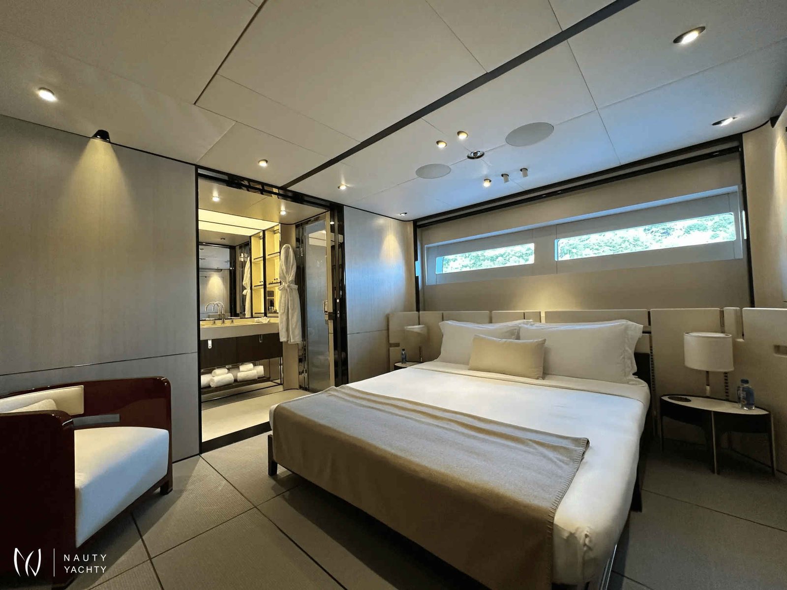 Generous full-beam Owner’s suite located on the main deck, featuring a private balcony and a huge walk-in shower.