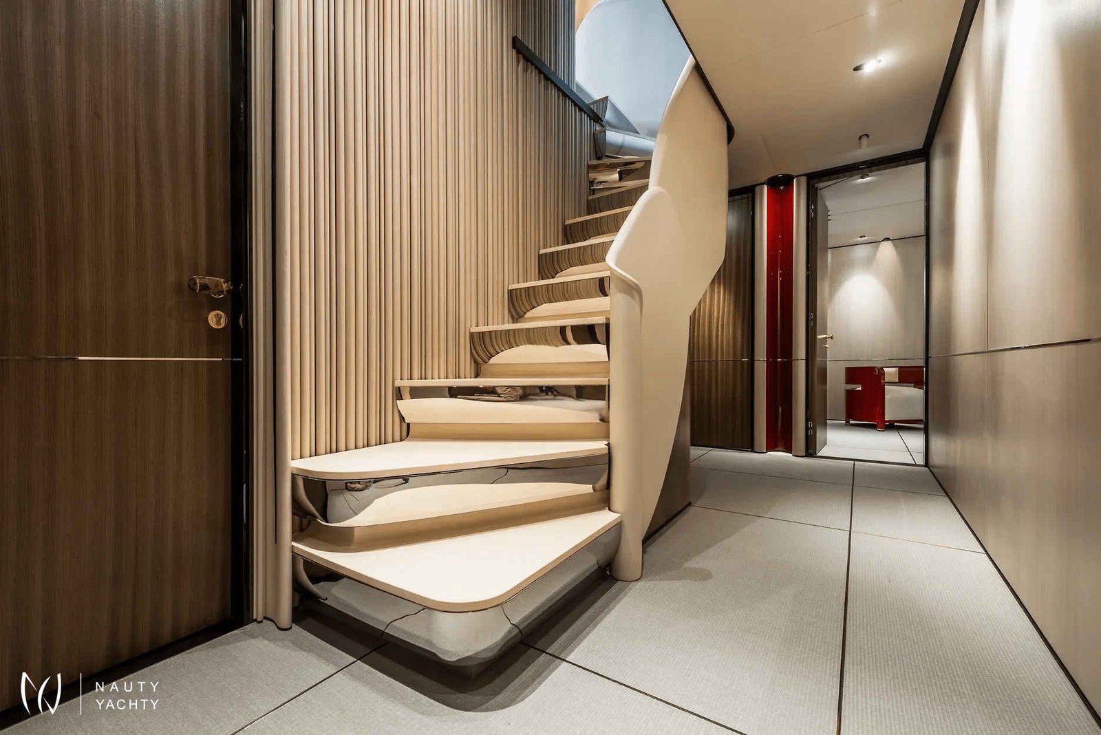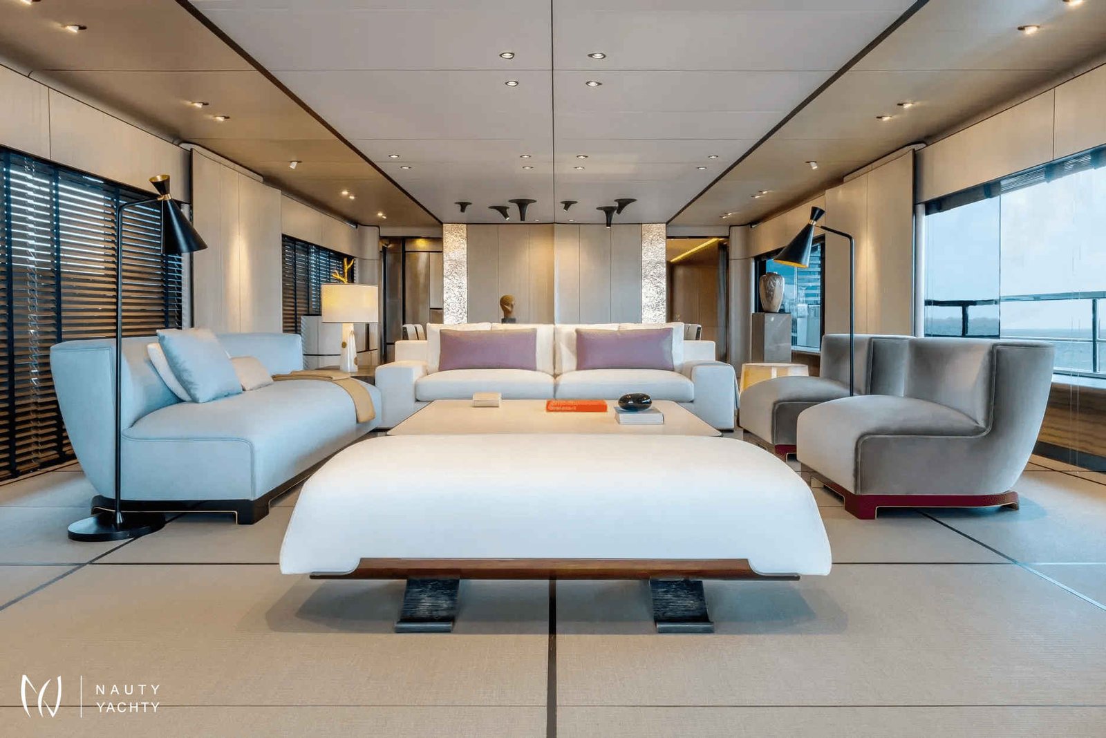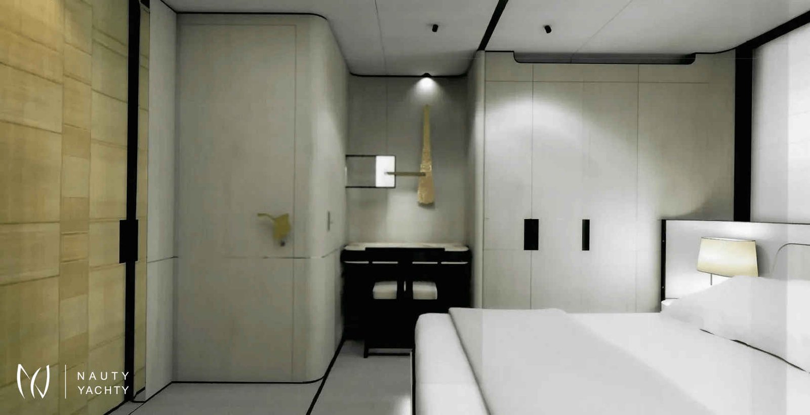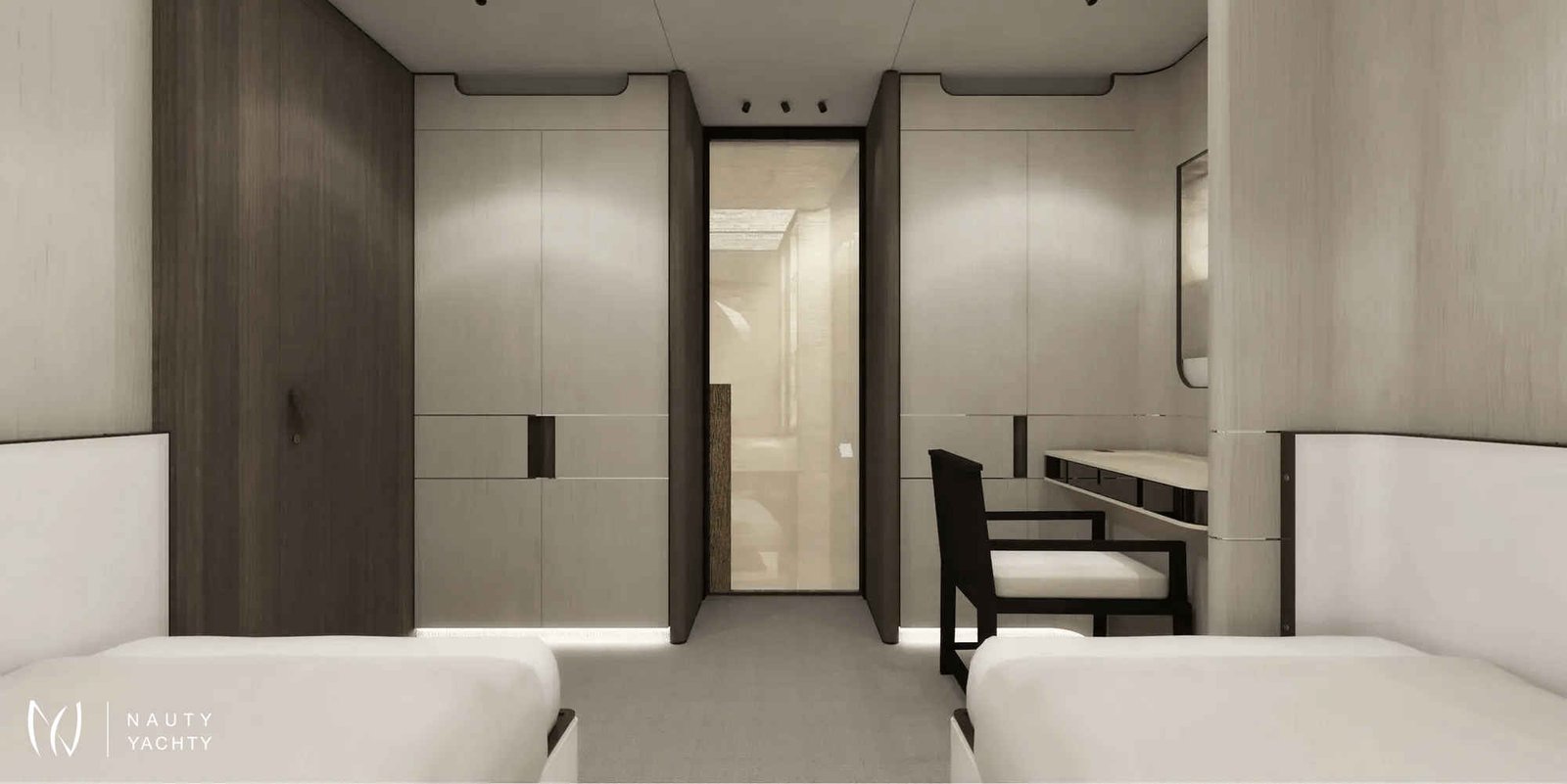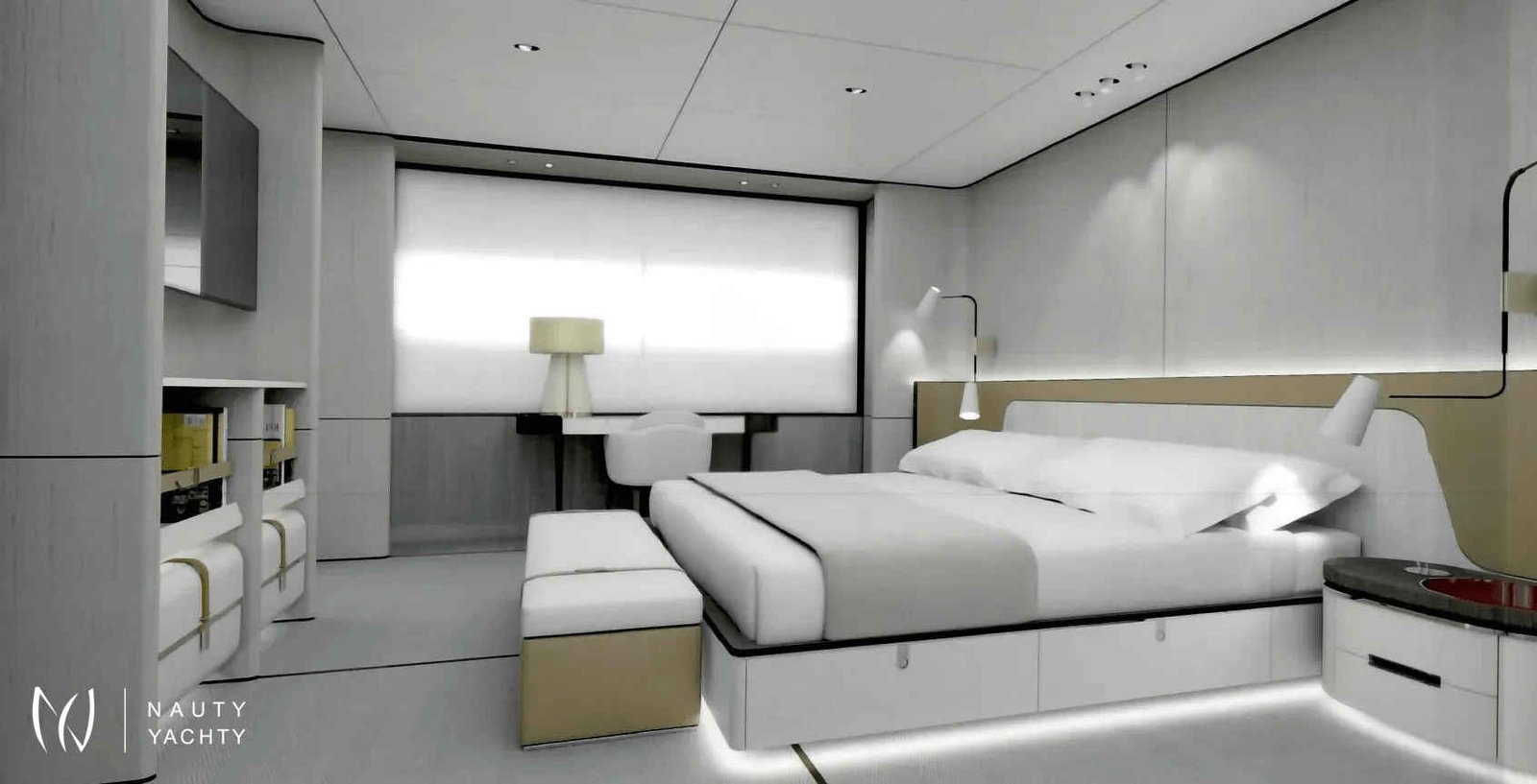 Generous full-beam Owner’s suite located on the main deck, featuring a private balcony and a huge walk-in shower.