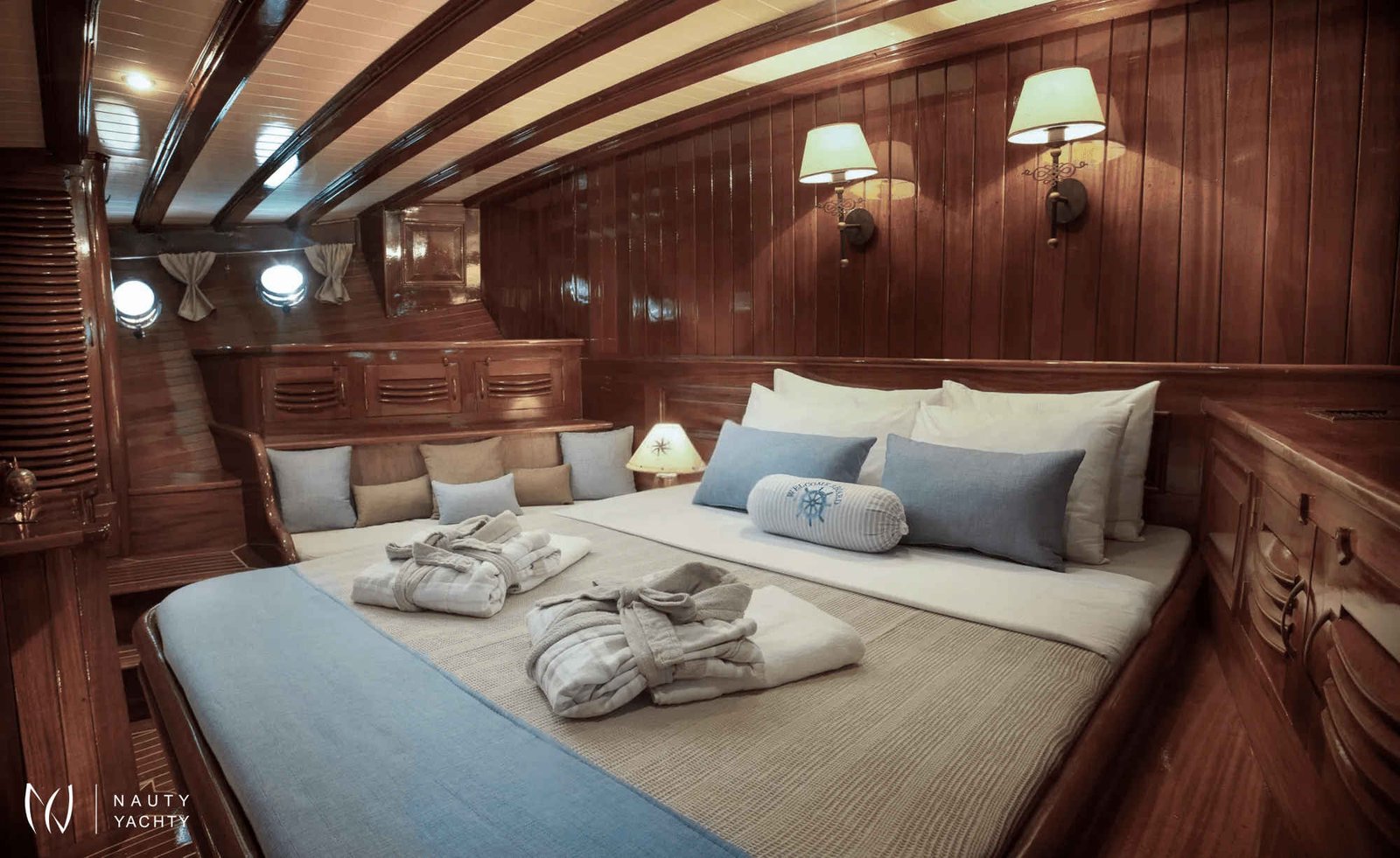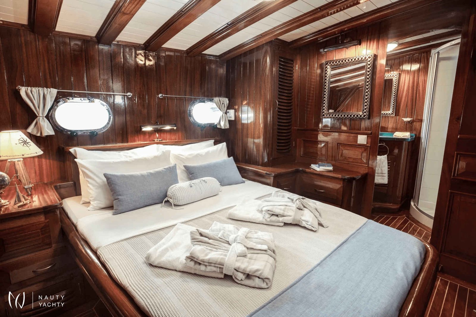 Cabin configuration: One master cabin, 1 VIP cabin, 2 queen bed cabins, and 1 twin bed cabin with one semi-double bed (for two children or one adult) and one single bed, all with private facilities.