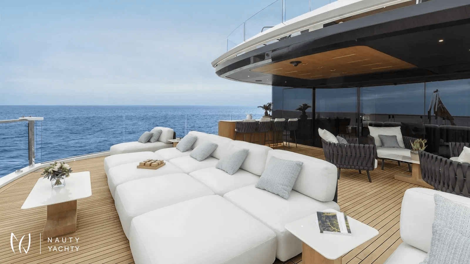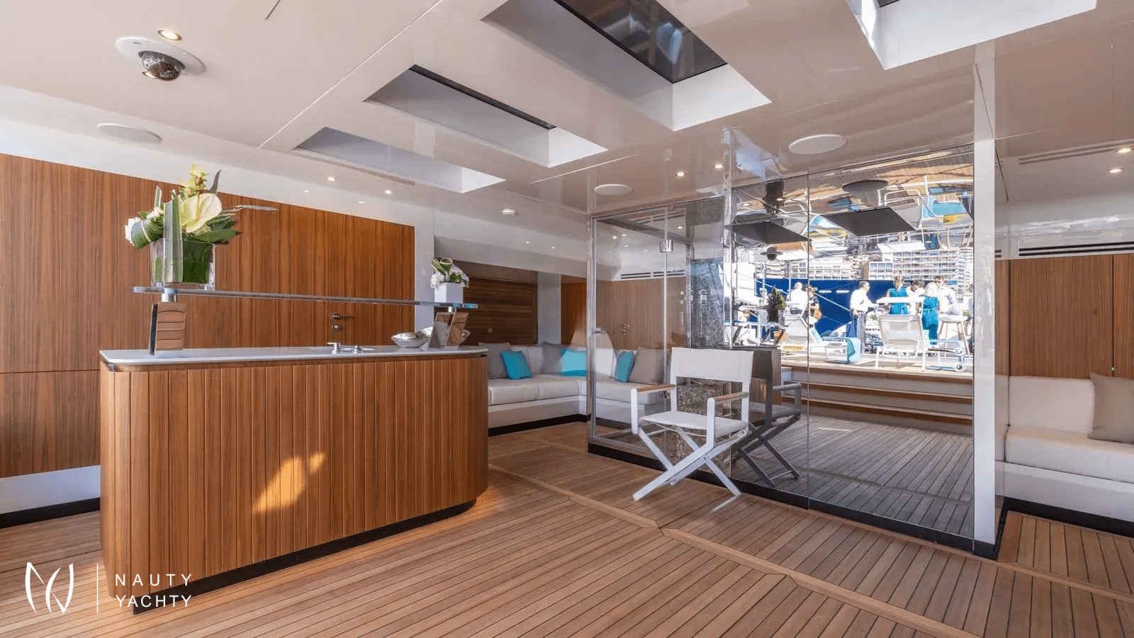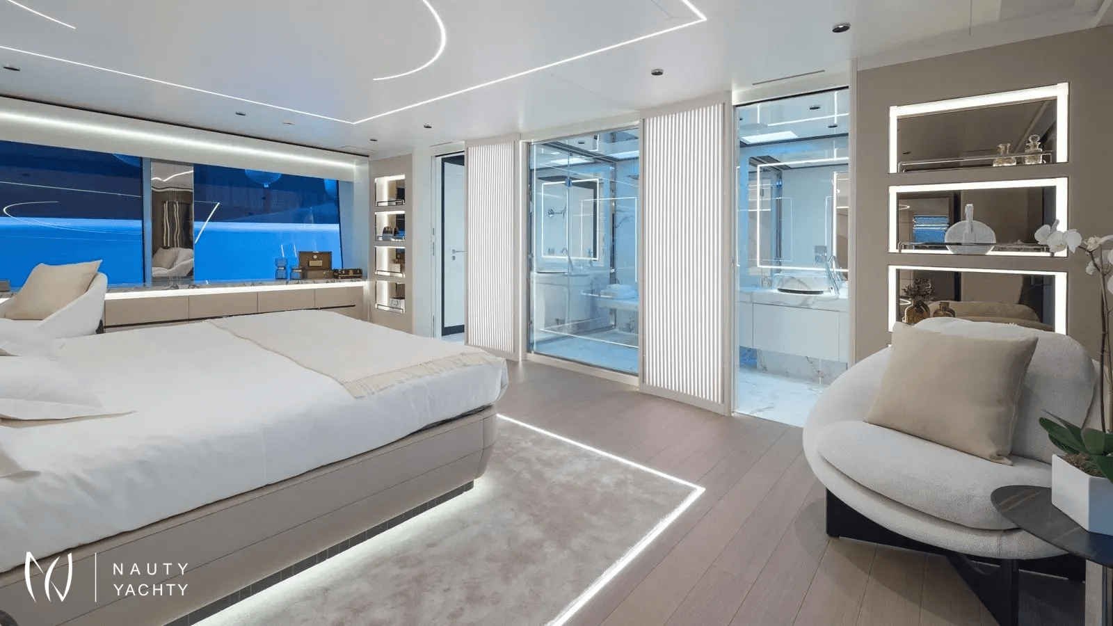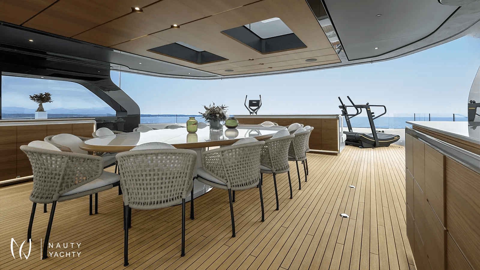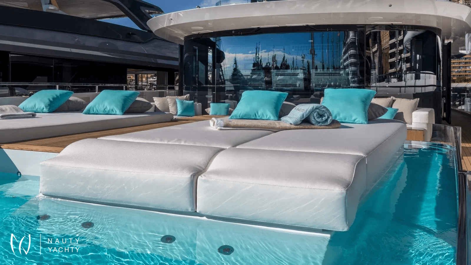 EVA4EVA offers a sophisticated blend of modern design and comfort, featuring a contemporary interior characterized by extensive use of glass surfaces that create expansive, light-filled spaces. The yacht's modern and elegant exterior harmonizes with the natural light that floods the interior, highlighting the yacht's large volumes and sleek lines.Accommodating up to 12 guests across six cabins, the yacht ensures a premium experience for every guest. The primary suite on the bridge deck boasts exclusive access to a private outside area, while another primary suite on the main deck features a fold-down balcony. With a dedicated crew of nine on hand to cater to every whim, time on board EVA4EVA promises luxurious comforts with exceptional service.Expansive exterior decks offer ample space for both relaxation and entertainment. At the bow, a large pool invites guests to unwind under the sun, while the sundeck's Jacuzzi provides a perfect spot for soaking in breathtaking views. The yacht’s beach club is a true sanctuary, complete with a hammam and direct access to the sea for refreshing dips. Finally, fitness enthusiasts will appreciate the extensive list of gym equipment, allowing for uninterrupted wellness routines.A shallow draft allows access to secluded bays and waters that other vessels might not reach. Equipped with zero-speed stabilizers, a smooth and stable experience is ensured, even when at anchor.