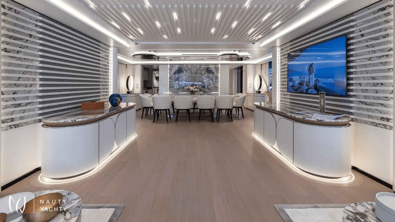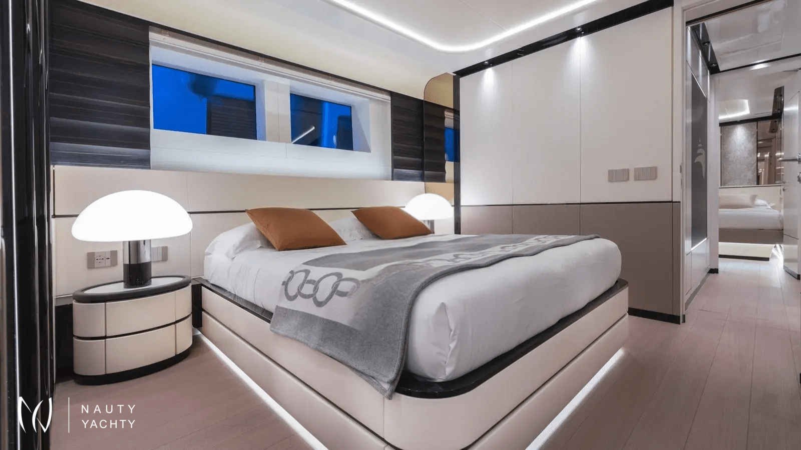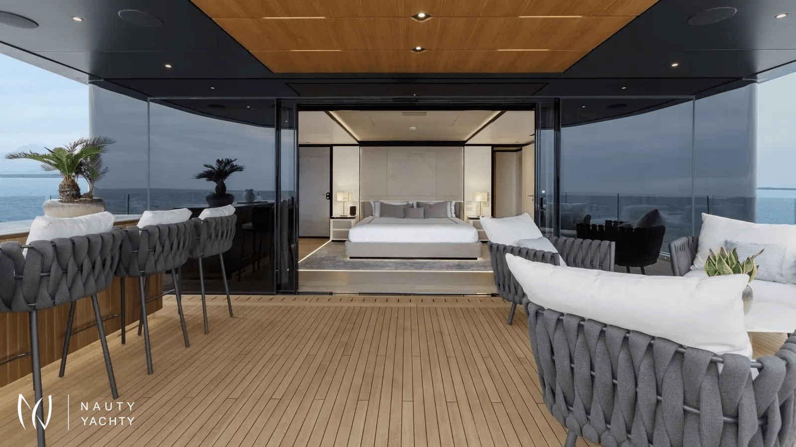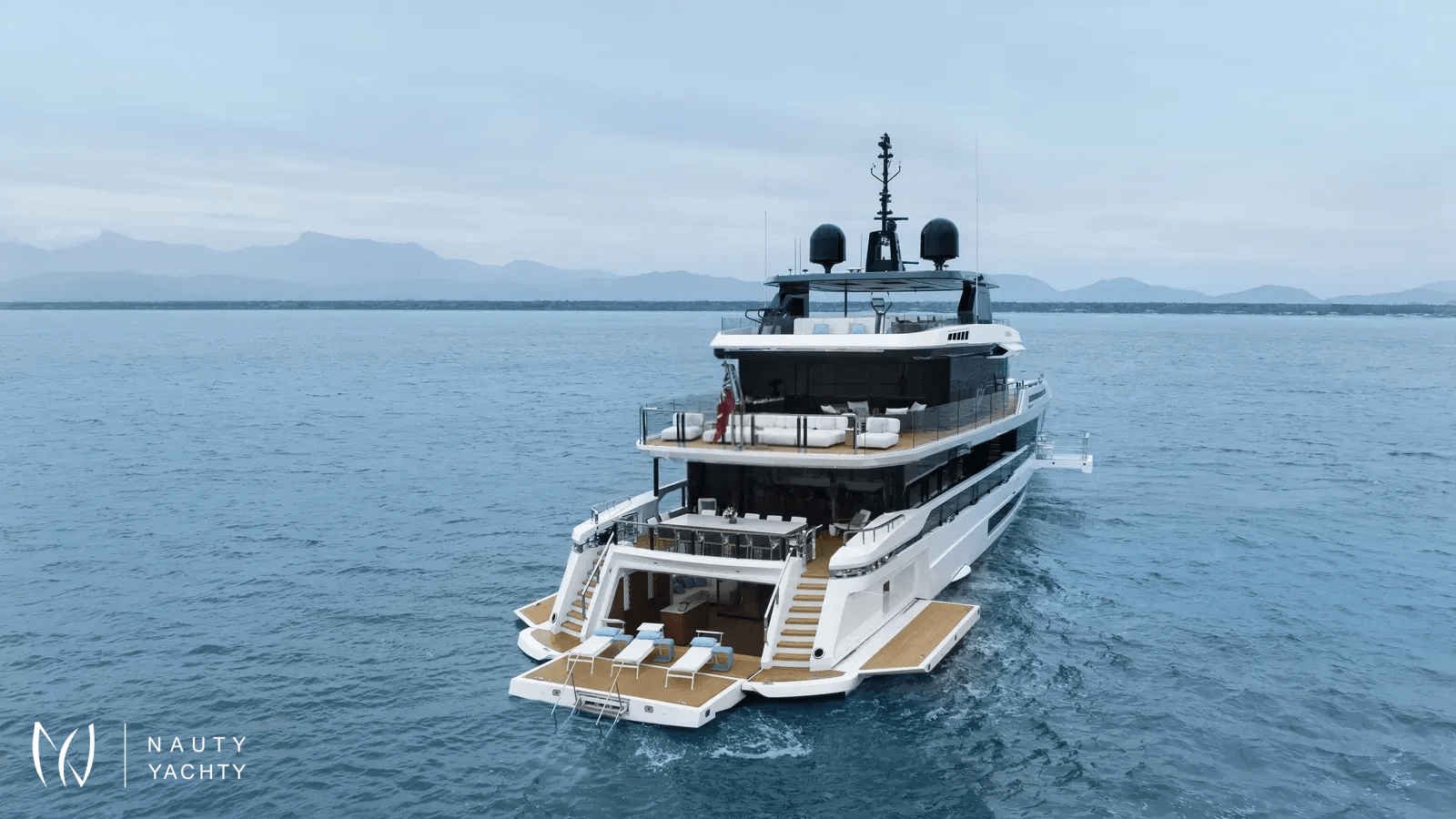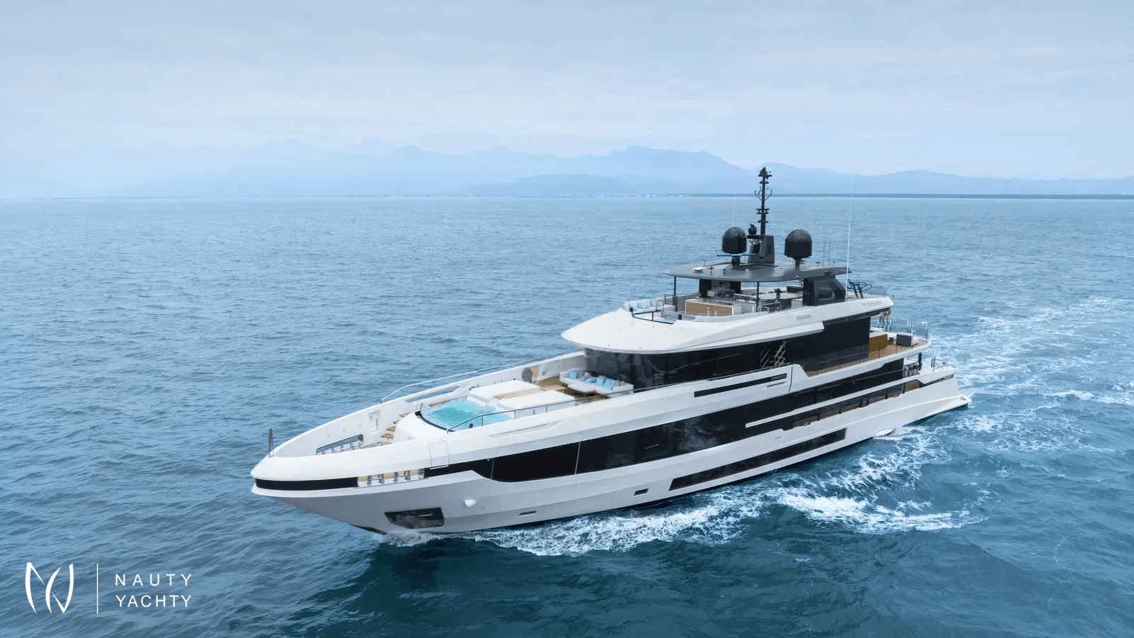 EVA4EVA offers a sophisticated blend of modern design and comfort, featuring a contemporary interior characterized by extensive use of glass surfaces that create expansive, light-filled spaces. The yacht's modern and elegant exterior harmonizes with the natural light that floods the interior, highlighting the yacht's large volumes and sleek lines.Accommodating up to 12 guests across six cabins, the yacht ensures a premium experience for every guest. The primary suite on the bridge deck boasts exclusive access to a private outside area, while another primary suite on the main deck features a fold-down balcony. With a dedicated crew of nine on hand to cater to every whim, time on board EVA4EVA promises luxurious comforts with exceptional service.Expansive exterior decks offer ample space for both relaxation and entertainment. At the bow, a large pool invites guests to unwind under the sun, while the sundeck's Jacuzzi provides a perfect spot for soaking in breathtaking views. The yacht’s beach club is a true sanctuary, complete with a hammam and direct access to the sea for refreshing dips. Finally, fitness enthusiasts will appreciate the extensive list of gym equipment, allowing for uninterrupted wellness routines.A shallow draft allows access to secluded bays and waters that other vessels might not reach. Equipped with zero-speed stabilizers, a smooth and stable experience is ensured, even when at anchor.