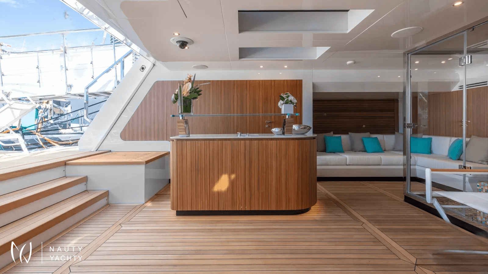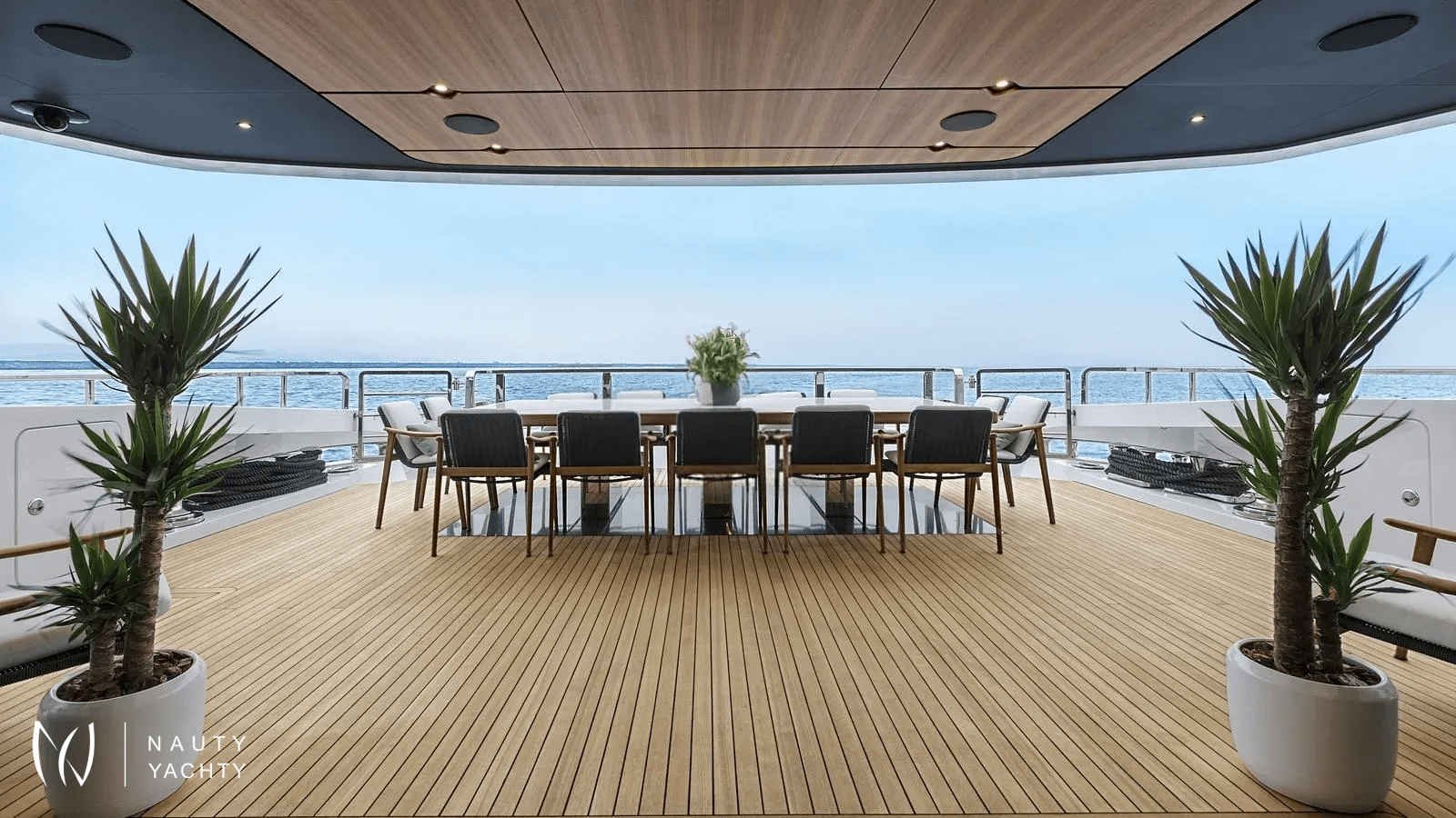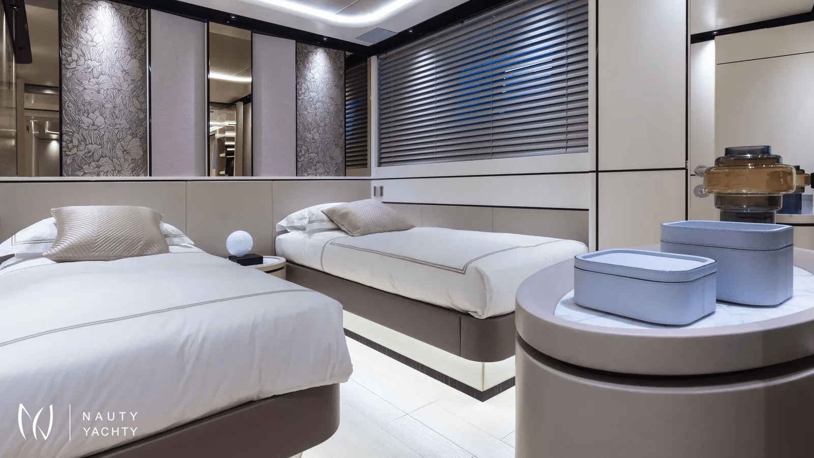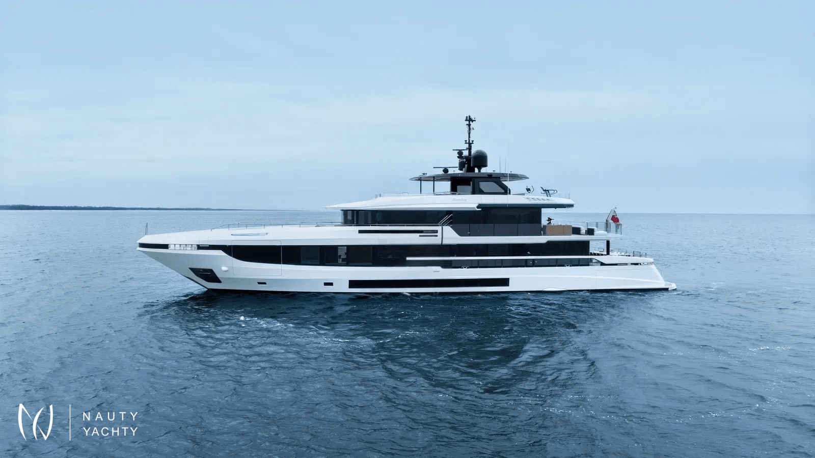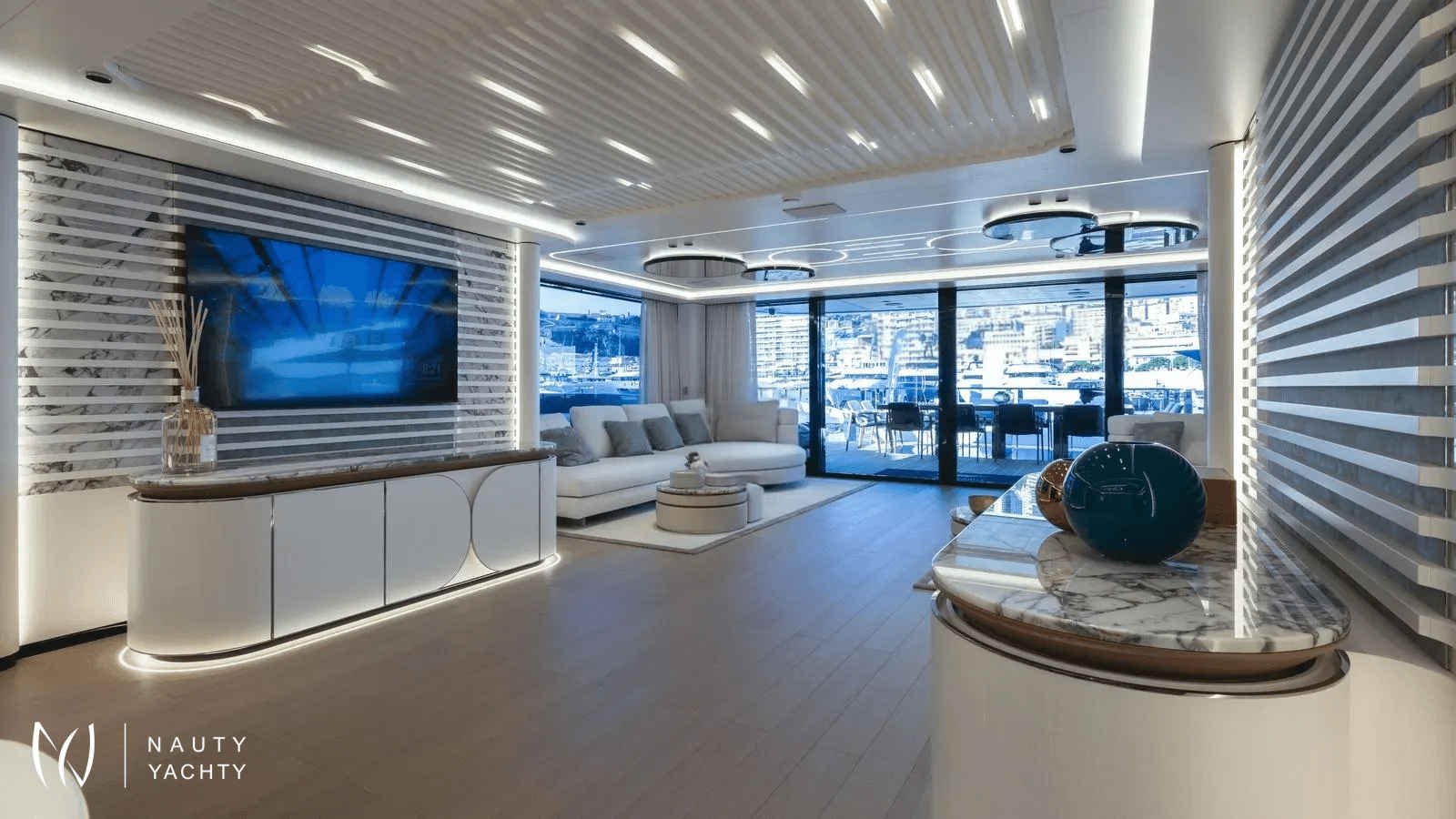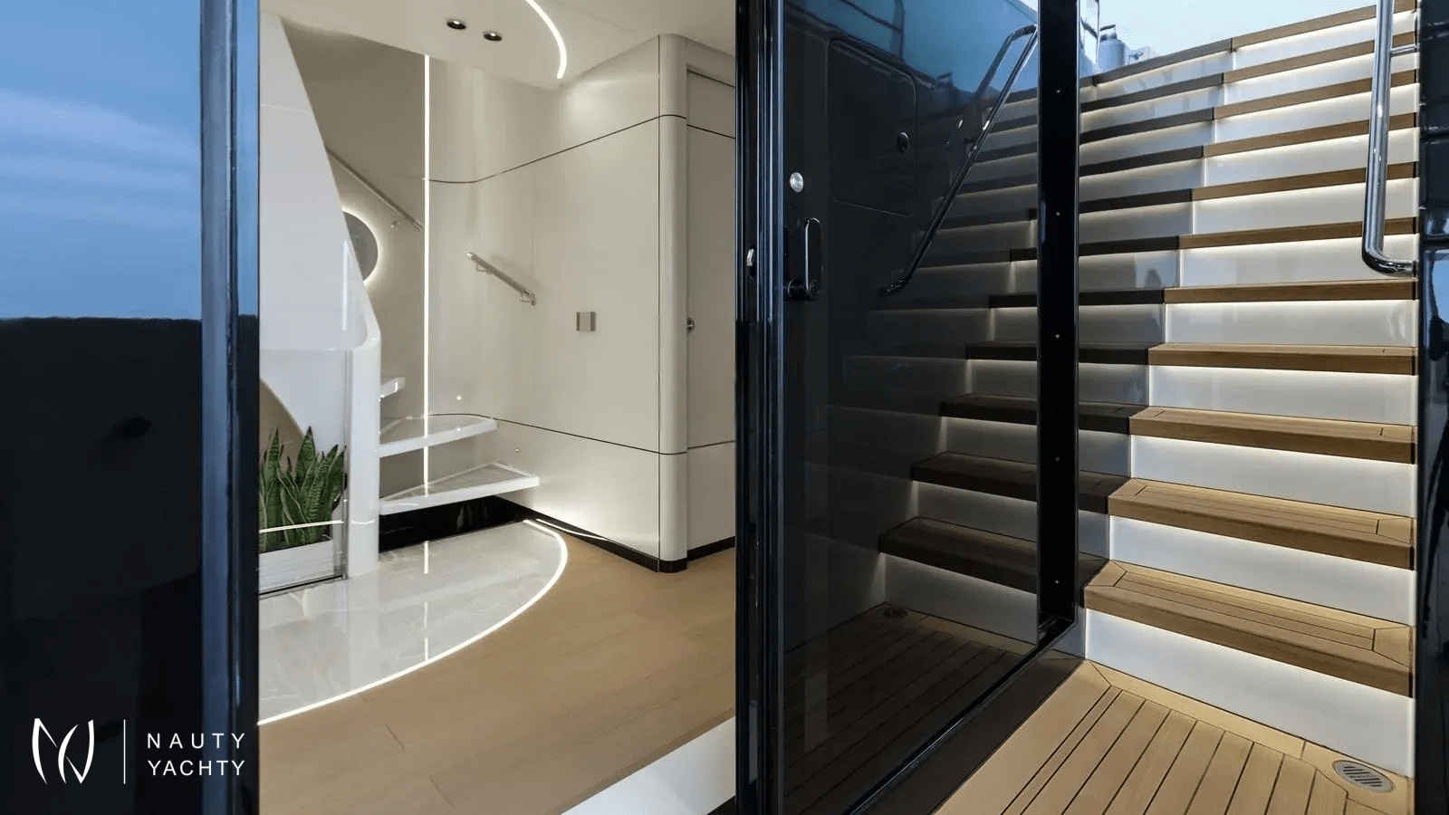 EVA4EVA offers a sophisticated blend of modern design and comfort, featuring a contemporary interior characterized by extensive use of glass surfaces that create expansive, light-filled spaces. The yacht's modern and elegant exterior harmonizes with the natural light that floods the interior, highlighting the yacht's large volumes and sleek lines.Accommodating up to 12 guests across six cabins, the yacht ensures a premium experience for every guest. The primary suite on the bridge deck boasts exclusive access to a private outside area, while another primary suite on the main deck features a fold-down balcony. With a dedicated crew of nine on hand to cater to every whim, time on board EVA4EVA promises luxurious comforts with exceptional service.Expansive exterior decks offer ample space for both relaxation and entertainment. At the bow, a large pool invites guests to unwind under the sun, while the sundeck's Jacuzzi provides a perfect spot for soaking in breathtaking views. The yacht’s beach club is a true sanctuary, complete with a hammam and direct access to the sea for refreshing dips. Finally, fitness enthusiasts will appreciate the extensive list of gym equipment, allowing for uninterrupted wellness routines.A shallow draft allows access to secluded bays and waters that other vessels might not reach. Equipped with zero-speed stabilizers, a smooth and stable experience is ensured, even when at anchor.