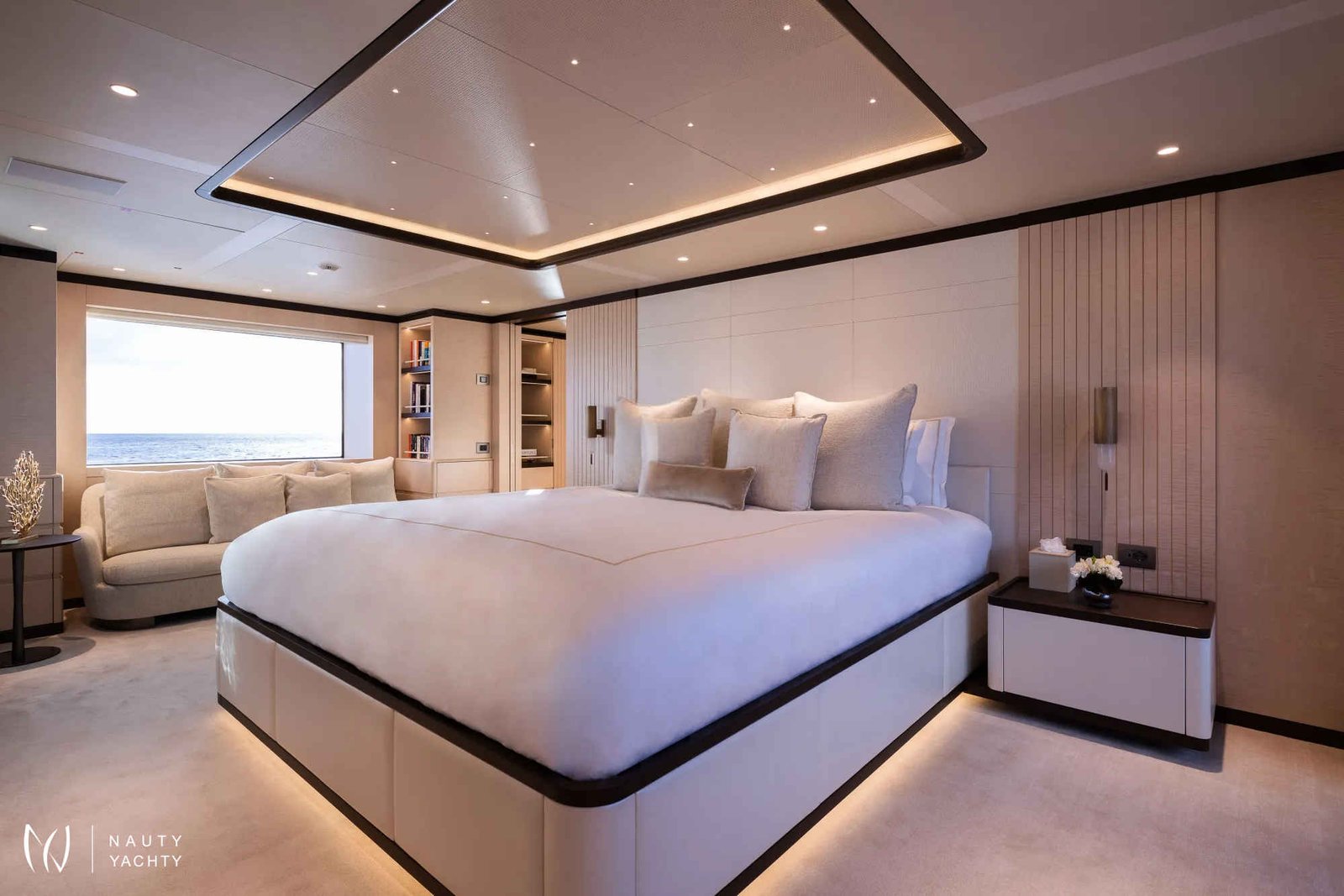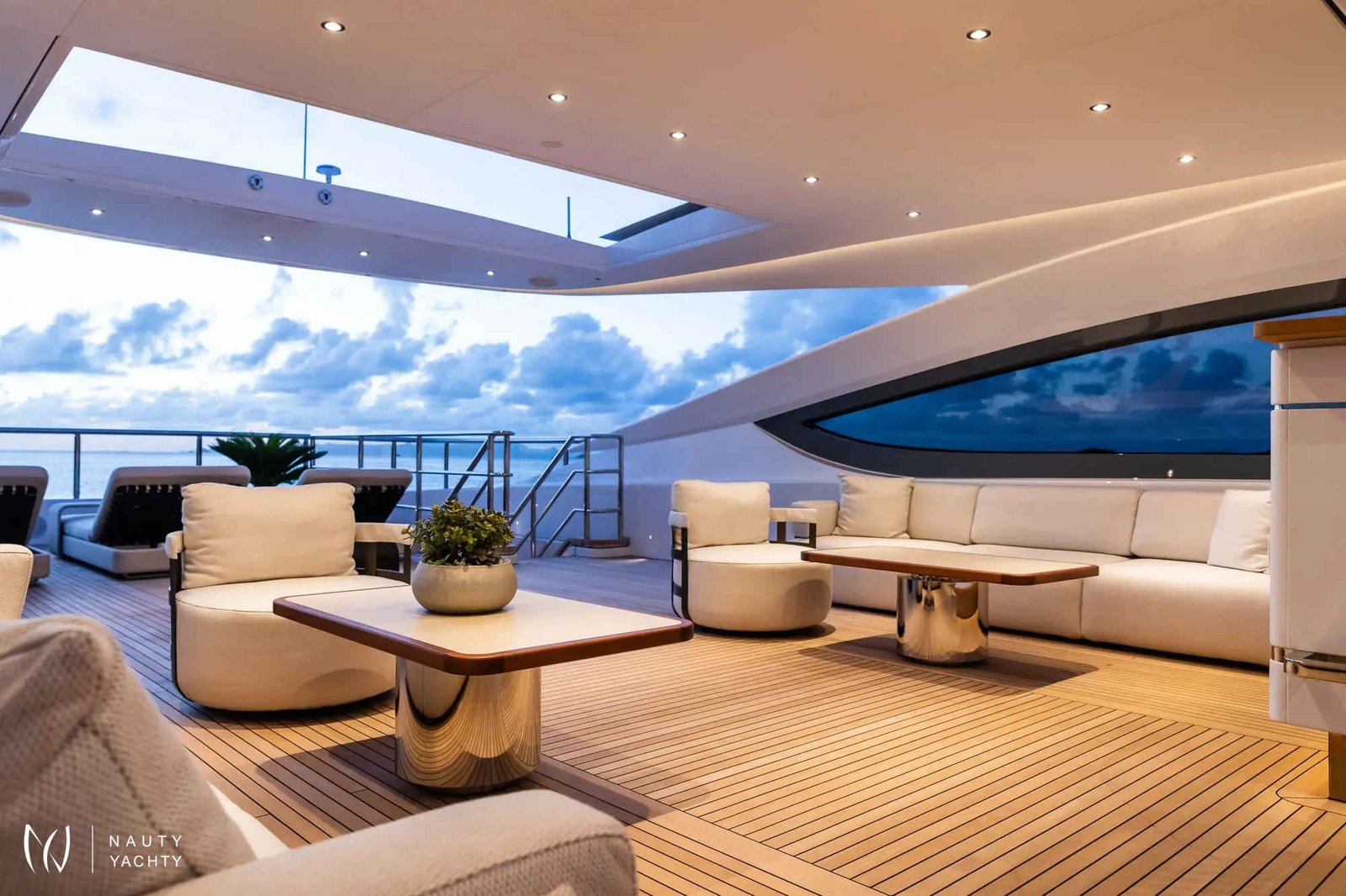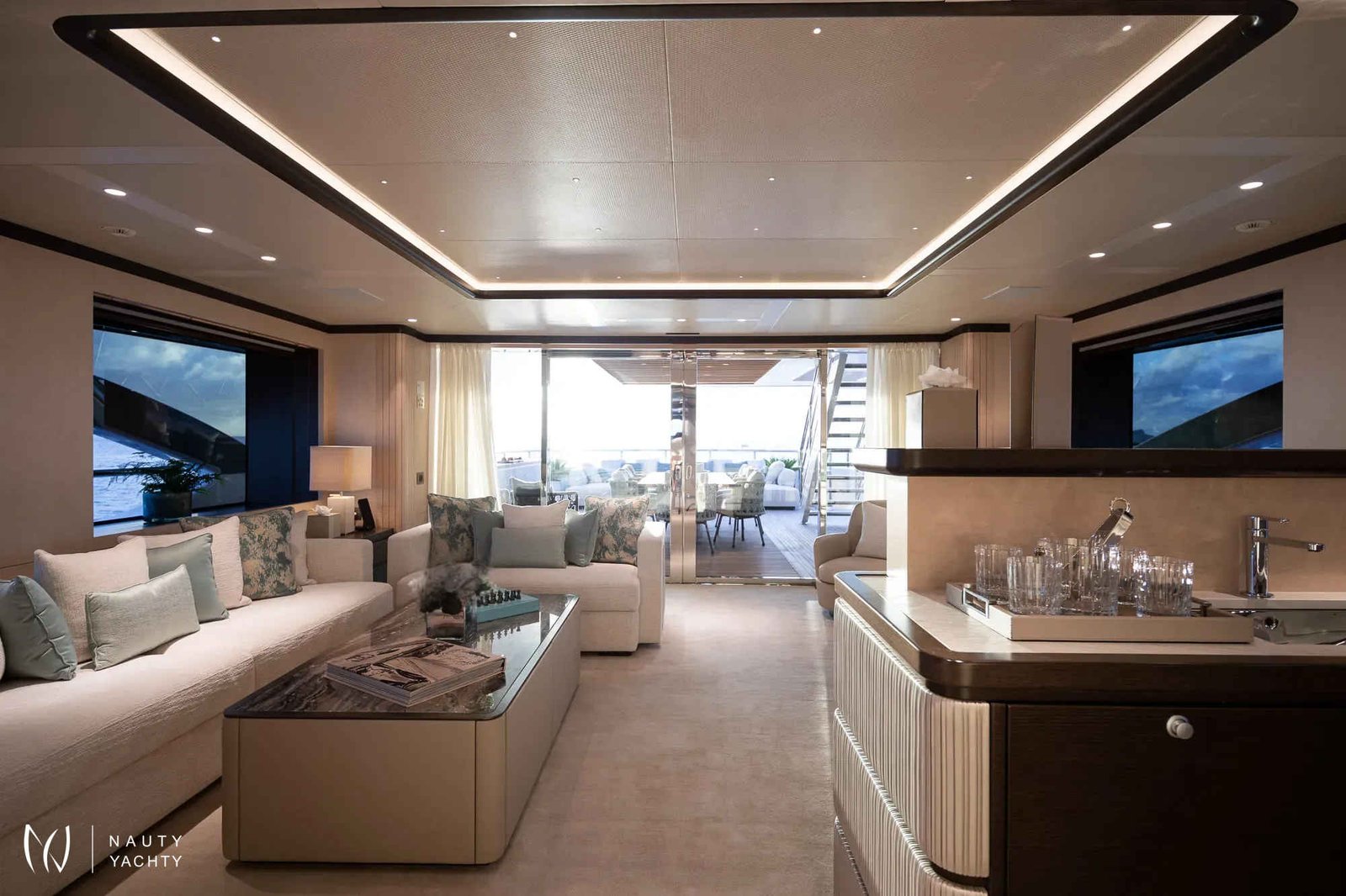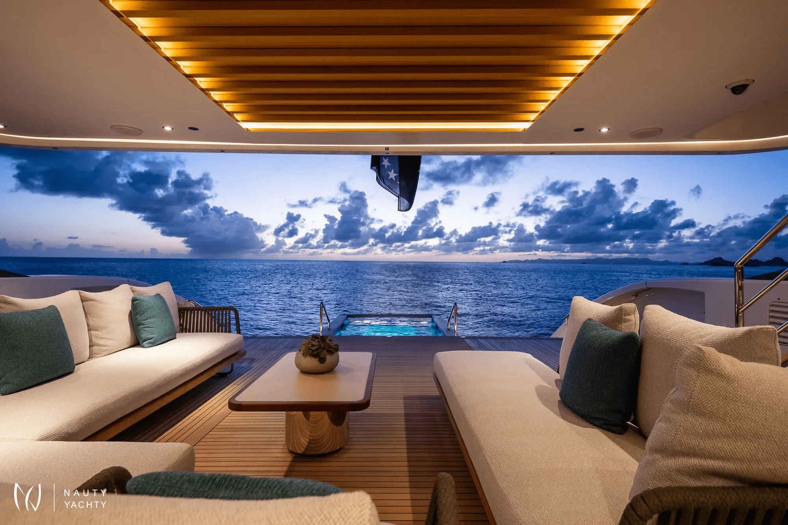 Launched in 2023, the brand new Benetti B.Now 50 MINE GAMES sports a streamlined profile with large windows and continuous decks to offer unbroken visual contact with the water from bow to stern.Designed by RWD to maximise the outdoor spaces, she features a main deck panoramic pool lounge area and a 36 sq m aft beach club with large infinity pool, "sea saloon" and fully-fledged hammam.The primary alfresco dining space on board is on the upper deck aft, where lies a rectangular table along with more lounging space – perfect for enjoying late-night drinks in comfort.To sunbathe, exercise and relax, her spacious Sundeck offers in addition a fully equipped bar with lounge area and a jacuzzi with sunpads.Accommodating 10 guests across 5 bright cabins, including a full beam Owner’s suite with private balcony, MINE GAMES offers an additional single cabin with small double bed on the upper deck to starboard, suitable for one extra staff only.MINE GAMES will satisfy guests with the distinctive lines, noiseless performance and 10 professional crew to ensure the highest level of service.