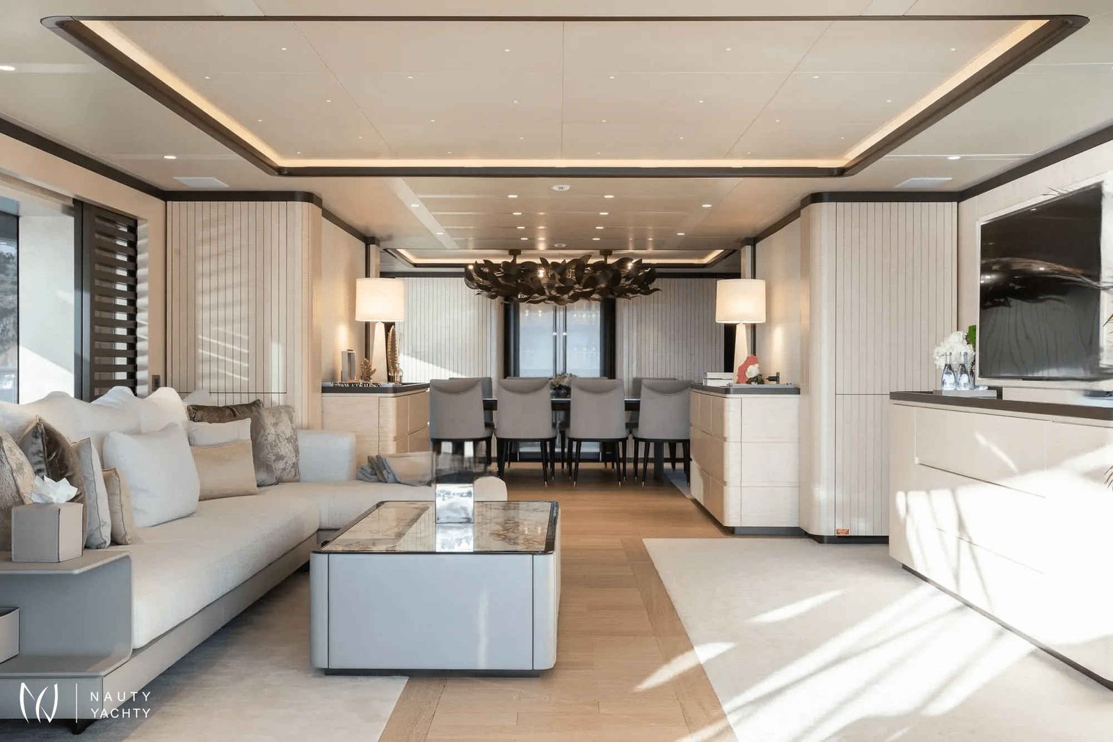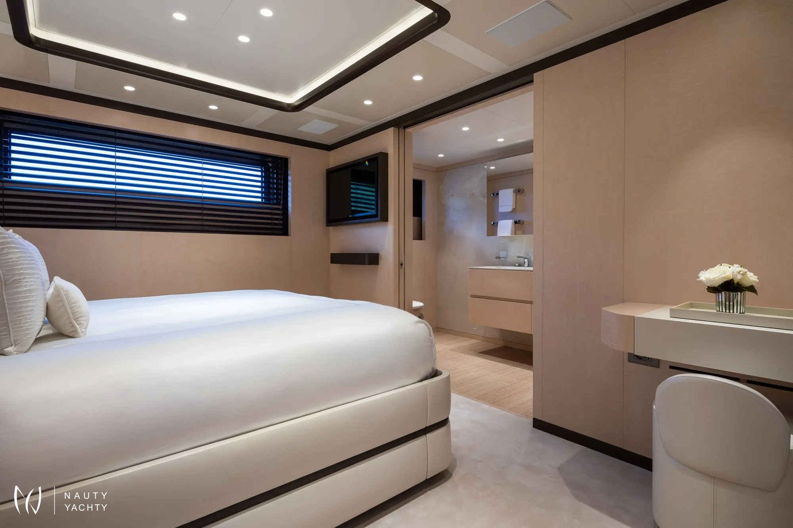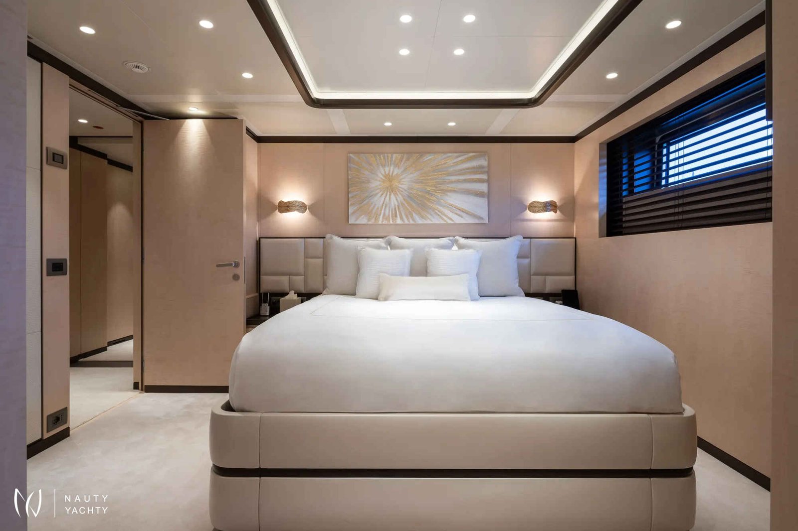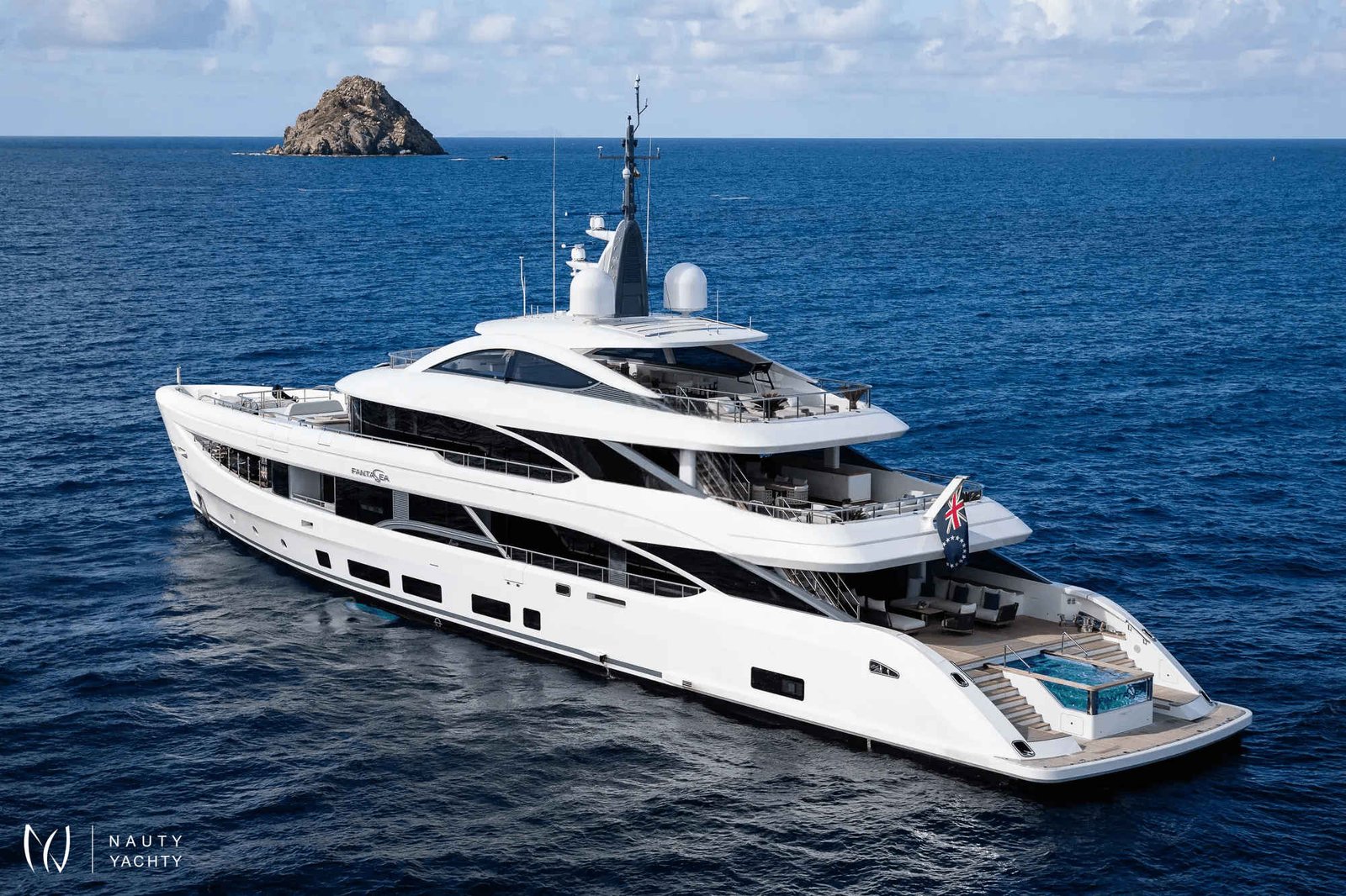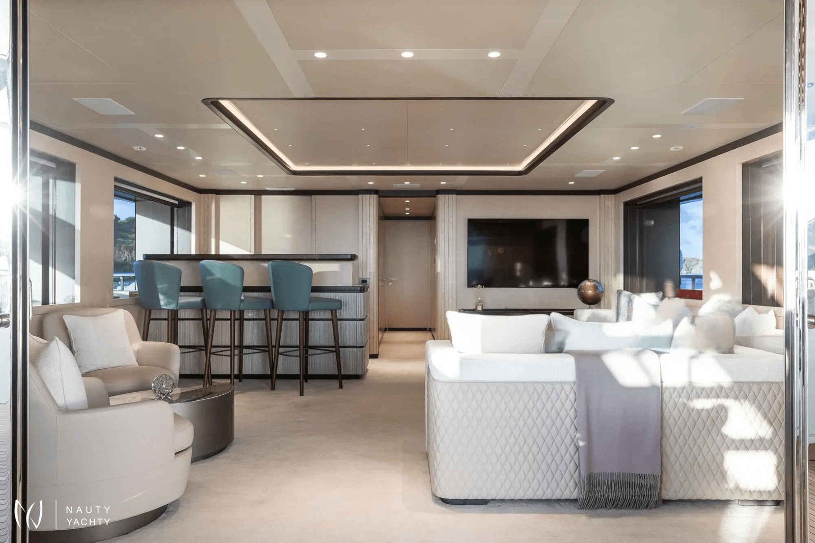 Launched in 2023, the brand new Benetti B.Now 50 MINE GAMES sports a streamlined profile with large windows and continuous decks to offer unbroken visual contact with the water from bow to stern.Designed by RWD to maximise the outdoor spaces, she features a main deck panoramic pool lounge area and a 36 sq m aft beach club with large infinity pool, "sea saloon" and fully-fledged hammam.The primary alfresco dining space on board is on the upper deck aft, where lies a rectangular table along with more lounging space – perfect for enjoying late-night drinks in comfort.To sunbathe, exercise and relax, her spacious Sundeck offers in addition a fully equipped bar with lounge area and a jacuzzi with sunpads.Accommodating 10 guests across 5 bright cabins, including a full beam Owner’s suite with private balcony, MINE GAMES offers an additional single cabin with small double bed on the upper deck to starboard, suitable for one extra staff only.MINE GAMES will satisfy guests with the distinctive lines, noiseless performance and 10 professional crew to ensure the highest level of service.