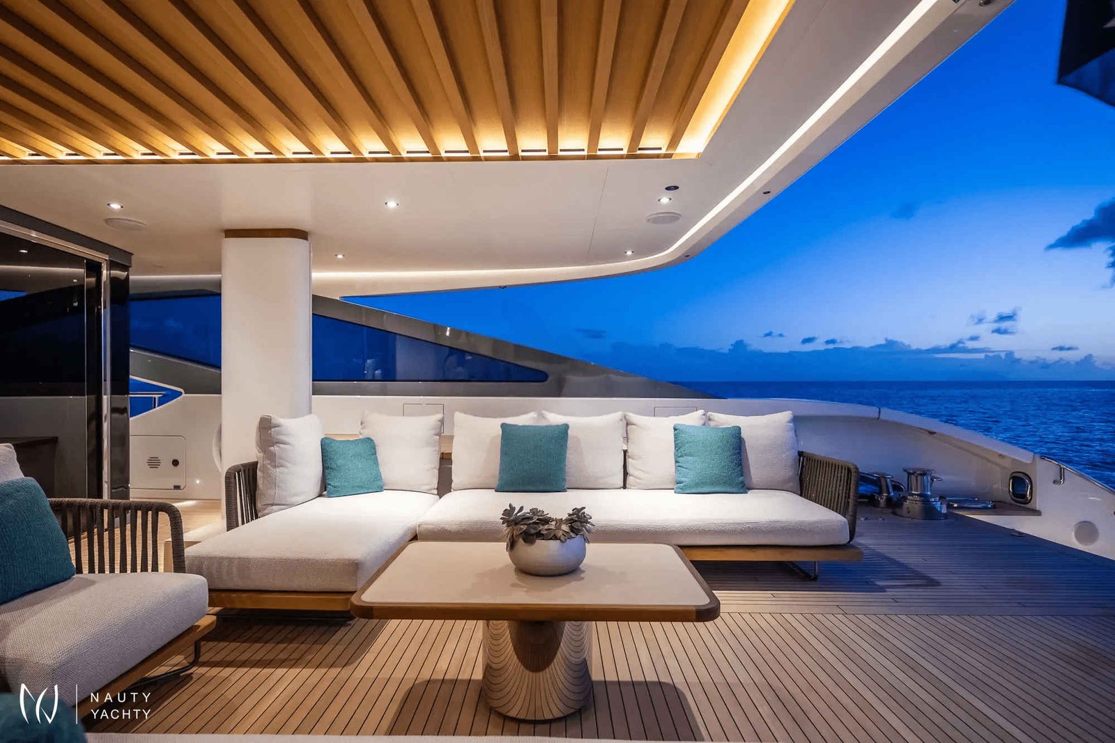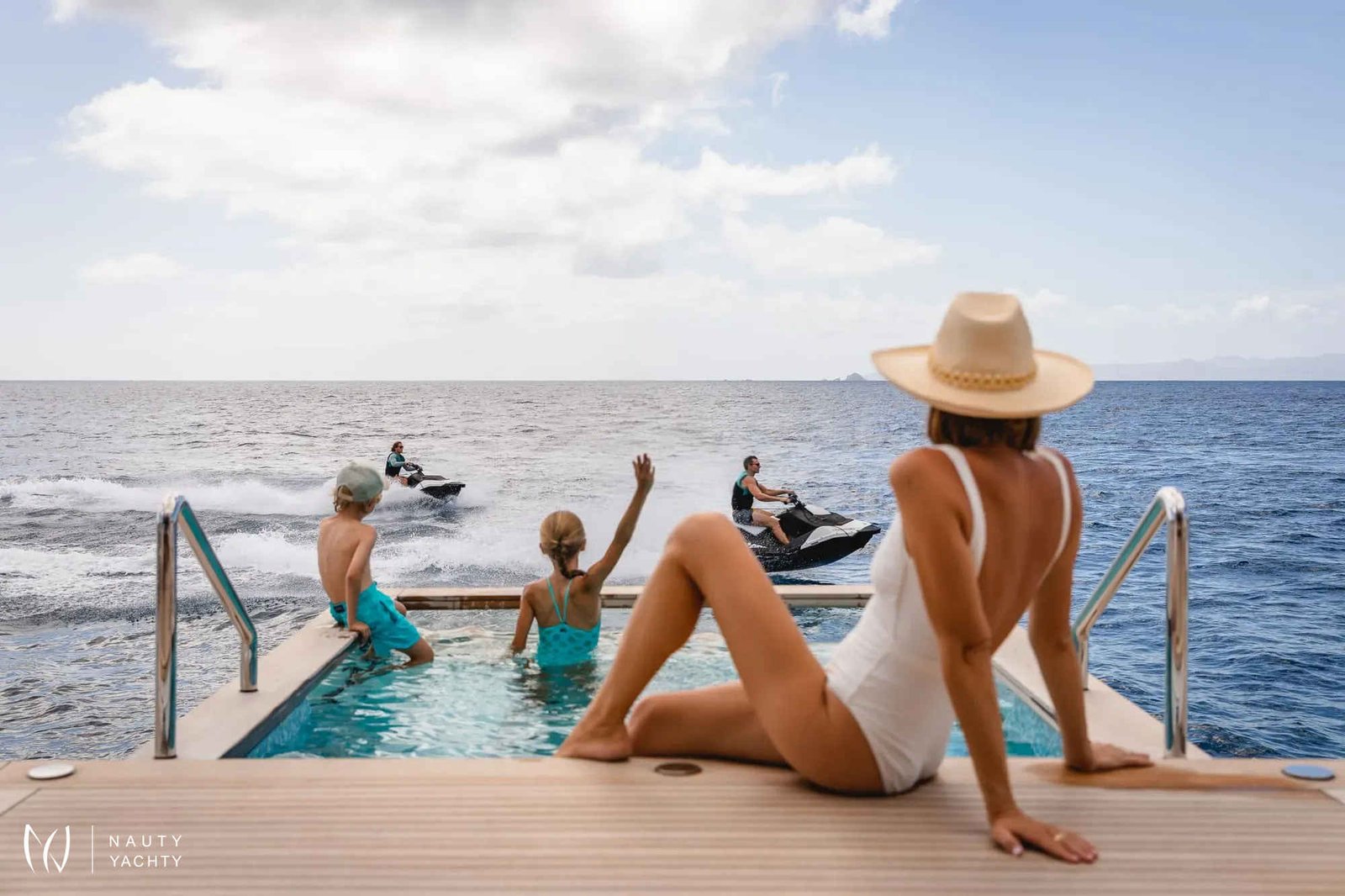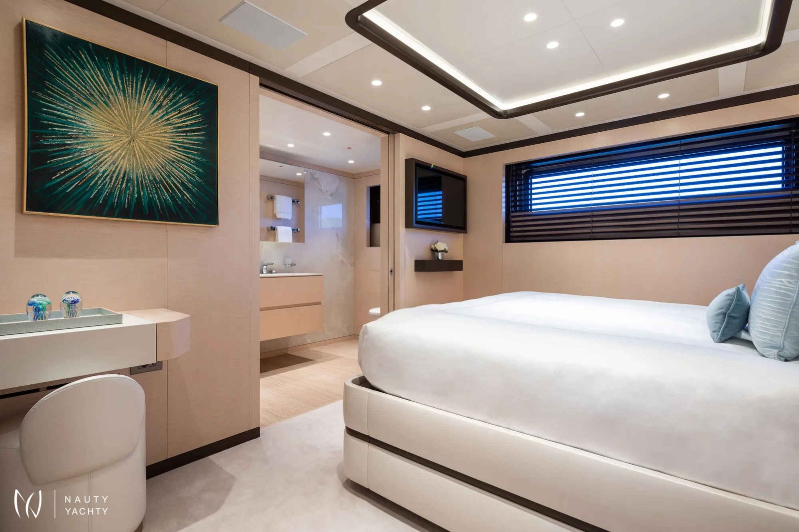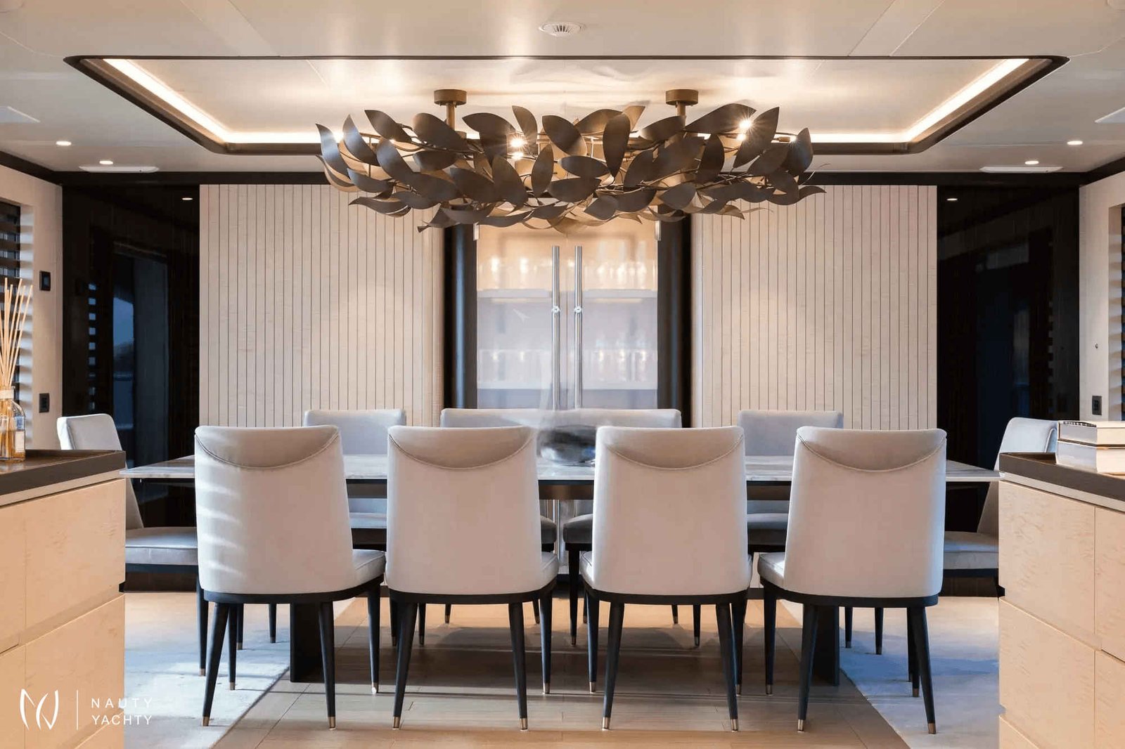 Launched in 2023, the brand new Benetti B.Now 50 MINE GAMES sports a streamlined profile with large windows and continuous decks to offer unbroken visual contact with the water from bow to stern.Designed by RWD to maximise the outdoor spaces, she features a main deck panoramic pool lounge area and a 36 sq m aft beach club with large infinity pool, "sea saloon" and fully-fledged hammam.The primary alfresco dining space on board is on the upper deck aft, where lies a rectangular table along with more lounging space – perfect for enjoying late-night drinks in comfort.To sunbathe, exercise and relax, her spacious Sundeck offers in addition a fully equipped bar with lounge area and a jacuzzi with sunpads.Accommodating 10 guests across 5 bright cabins, including a full beam Owner’s suite with private balcony, MINE GAMES offers an additional single cabin with small double bed on the upper deck to starboard, suitable for one extra staff only.MINE GAMES will satisfy guests with the distinctive lines, noiseless performance and 10 professional crew to ensure the highest level of service.