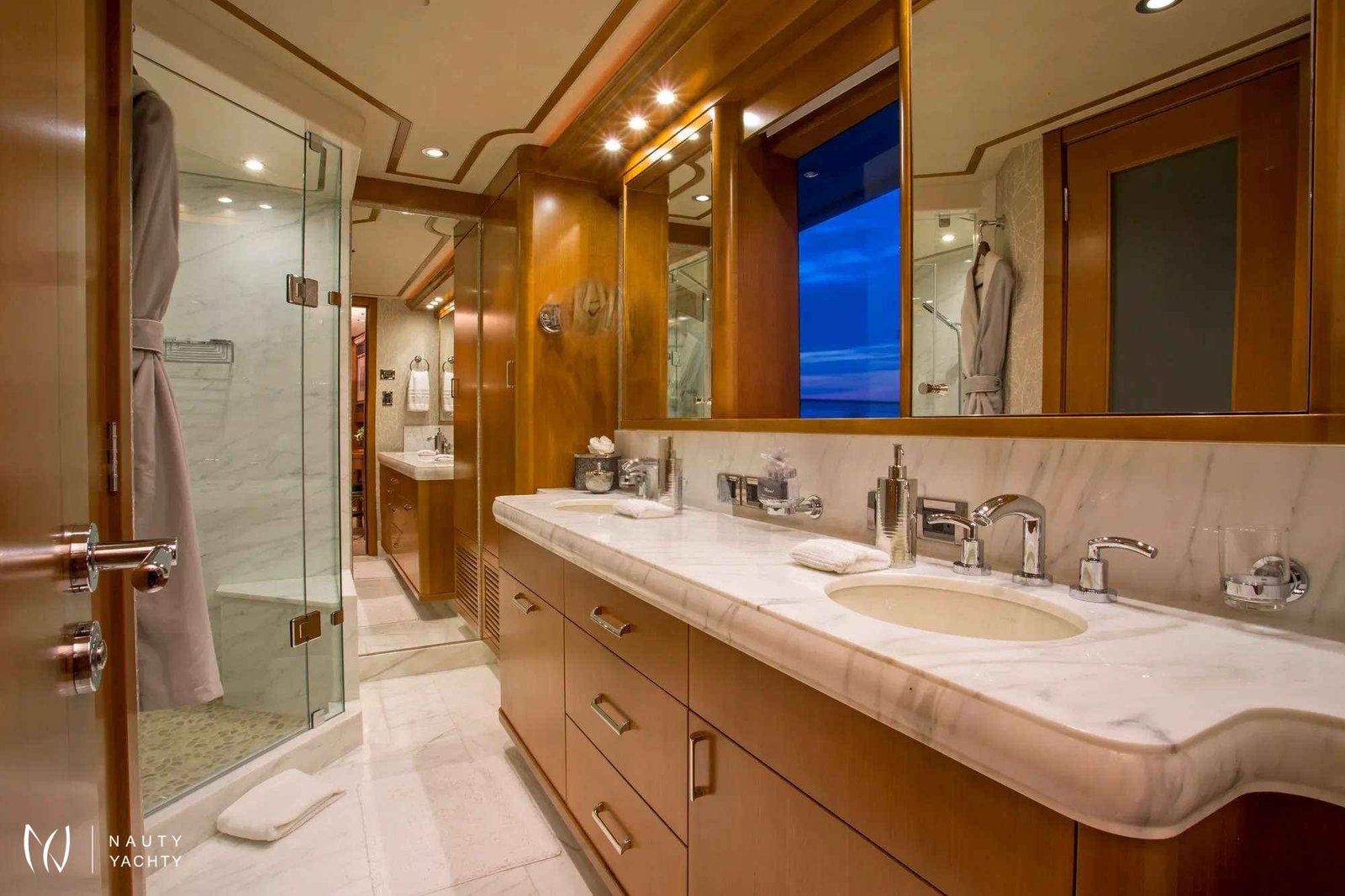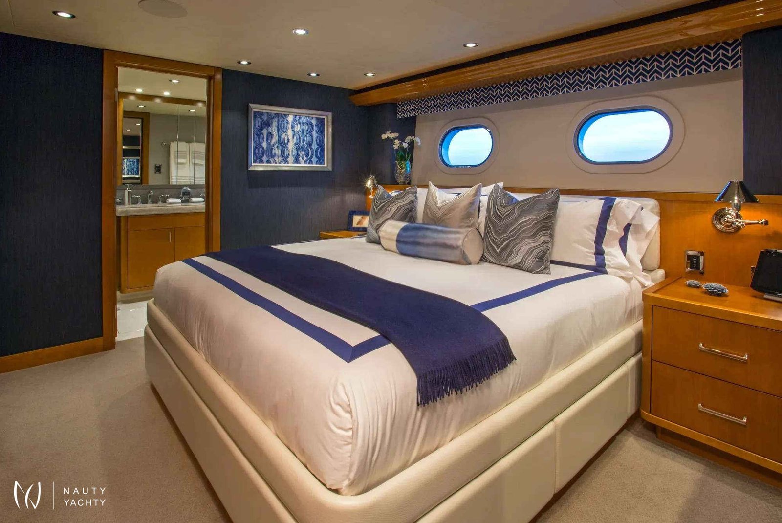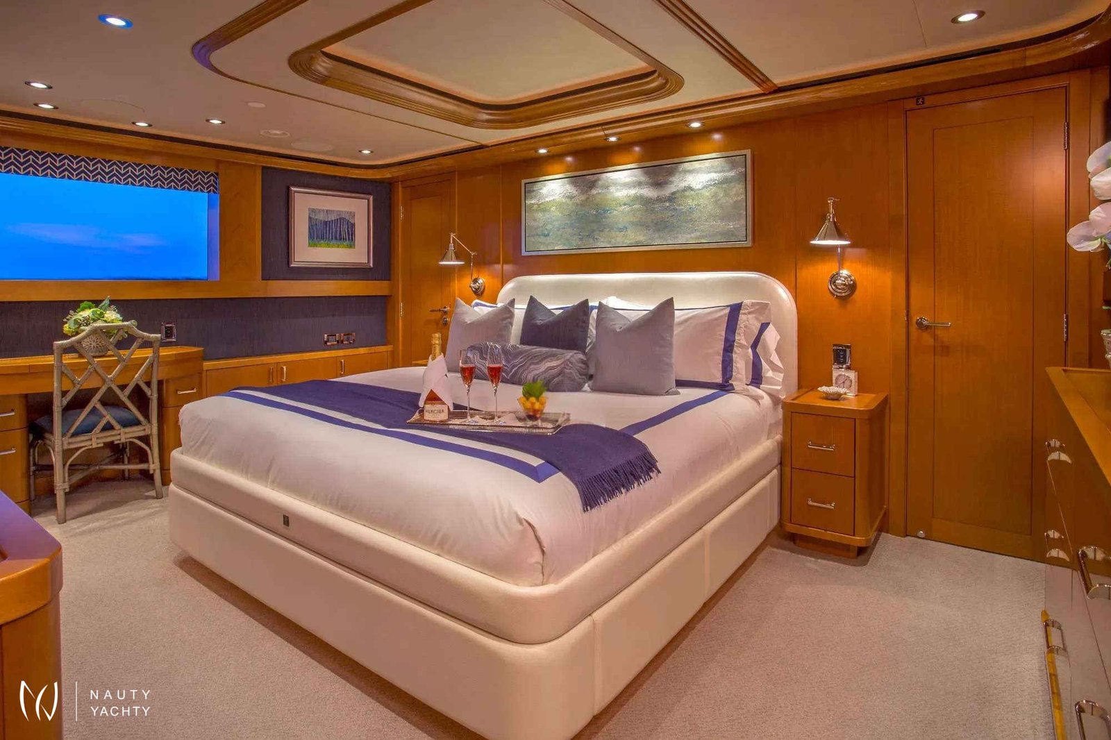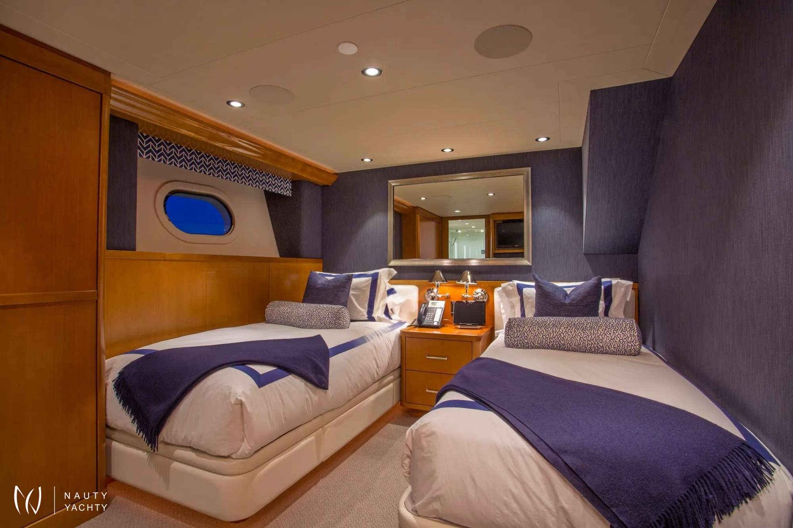 Master Stateroom: Main Deck, forward: Centerline king bed facing aft with two nightstands, dresser, vanity with mirror, safe, and his-and her-walk-in closets. The ensuite features a private head and bidet locker, a spacious shower, and twin sinks. Entertainment center with 42” Blu-ray TV, DVD/CD, iPod dock, and surround sound. There is a study adjacent to the Master Stateroom.VIP Stateroom (1): Midships, lower deck to port: Centerline king bed with two night stands, dresser, safe, and closet. The en-suite features a head and bidet, twin sinks and a shower. The entertainment center has a 32” Blu-ray TV, DVD/CD, iPod dock, and surround sound.VIP Stateroom (2): Midships, lower deck to starboard: Centerline king bed with two night stands, dresser, safe, and closet. The en-suite features a head and bidet, twin sinks and a shower. The entertainment center has a 32” Blu-ray TV, DVD/CD, iPod dock, and surround sound.Twin Guest Stateroom (1): Midships, lower deck to port: Two single beds with night stand, dresser, and closet. The ensuite features a head, sink and a shower. The entertainment center has a 26” Blu-ray TV, DVD/CD, iPod dock, and surround sound.Twin Guest Stateroom (2): Midships, lower deck to starboard: two single beds with night stand, dresser, and closet. The ensuite features a head, sink and a shower. The entertainment center has a 26” Blu-ray TV, DVD/CD, iPod dock, and surround sound.One of the twin guest staterooms has the option to covert to a 4th King Guest Stateroom.