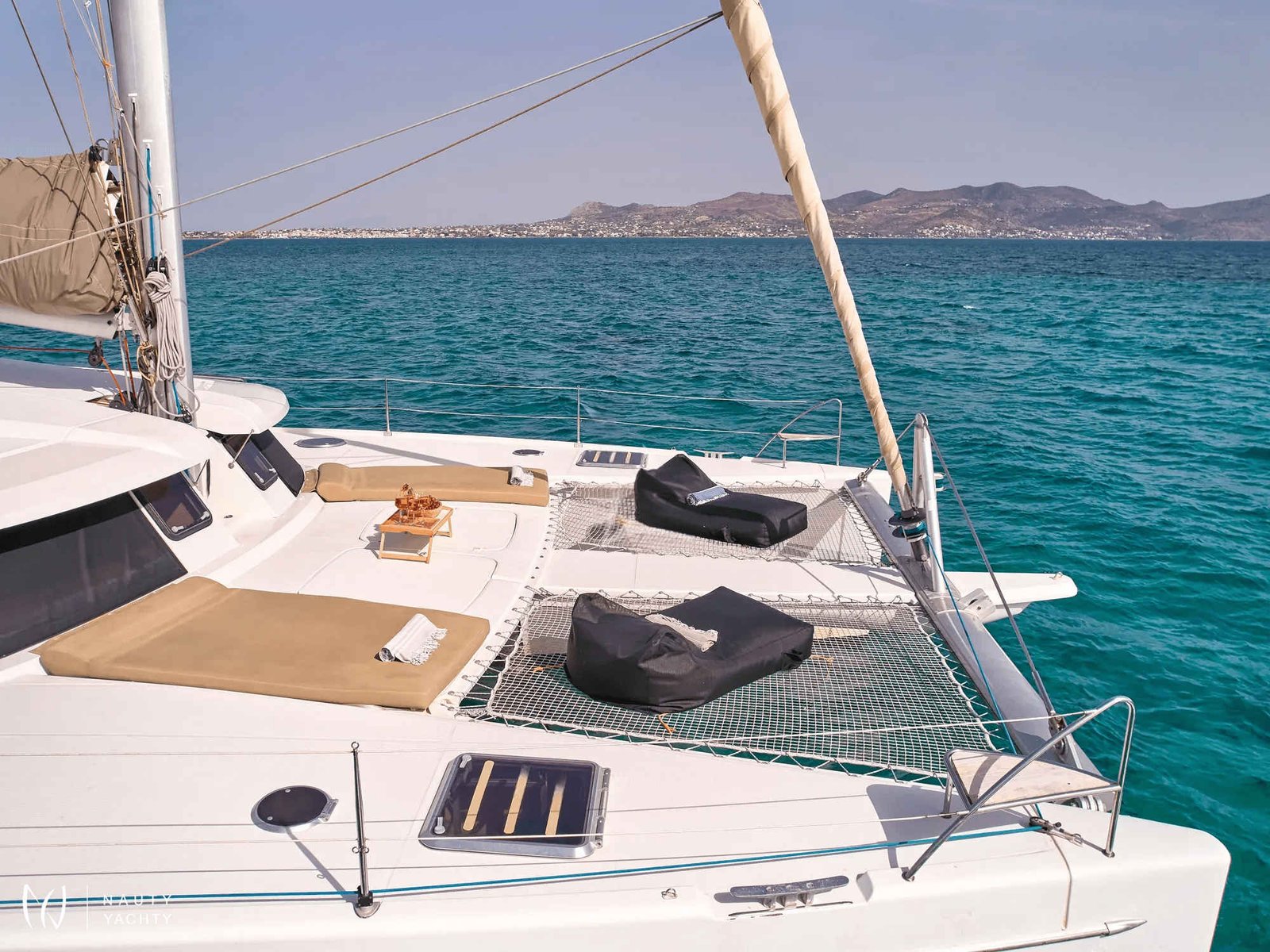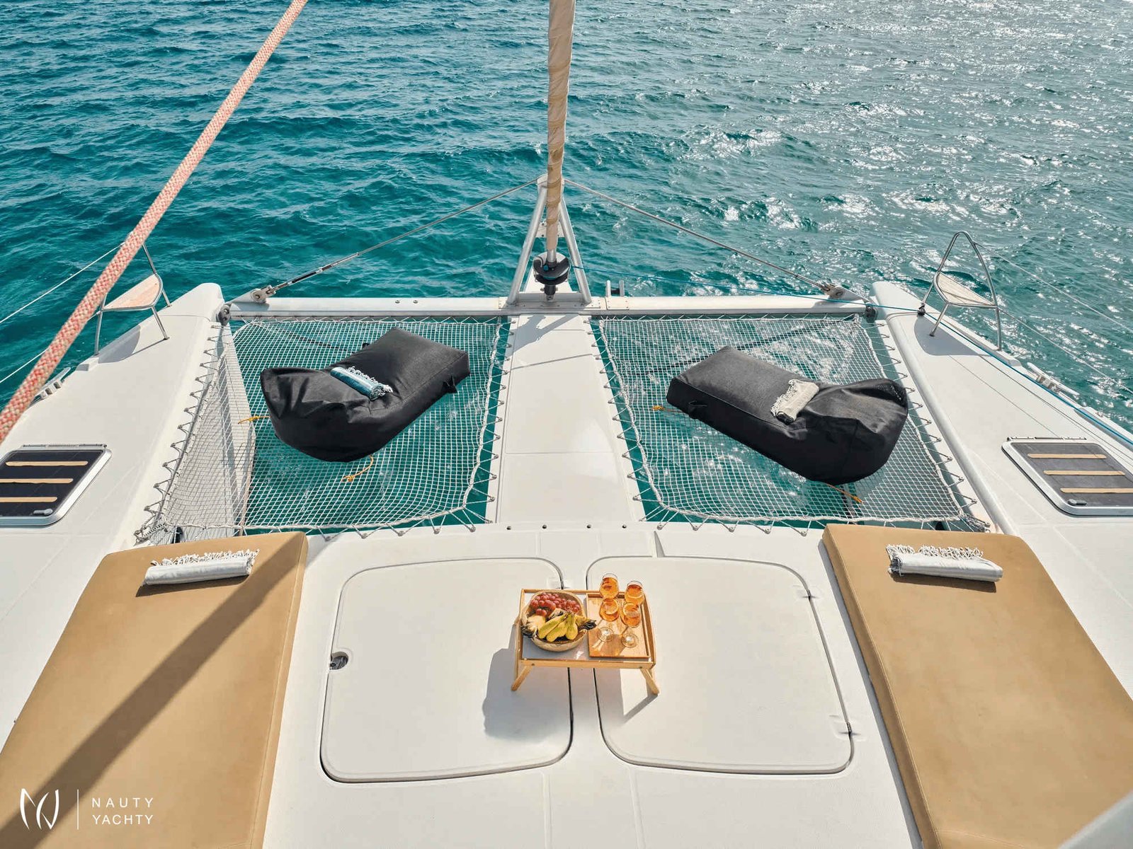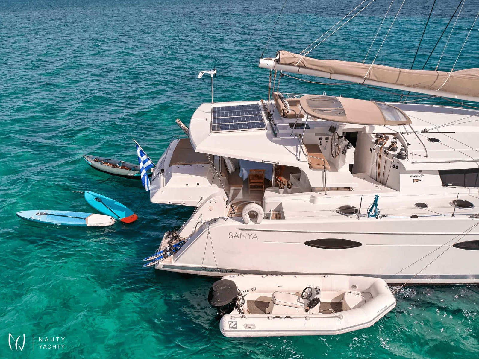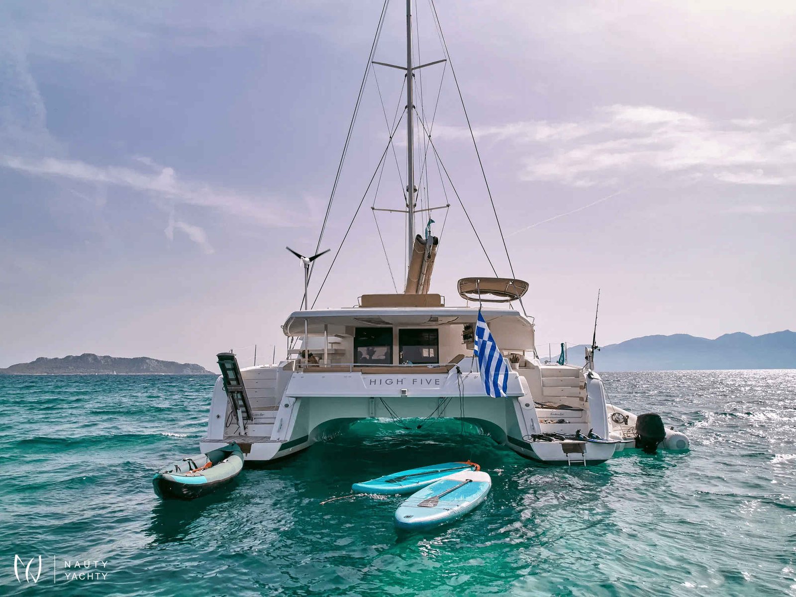 What are you looking for in your vacation? If you are aiming to take your family and friends on a memorable journey, living an adventurous, yet also relaxing and comfortable, a tour among the magnificent Greek islands, sailing through the crystal blue seas of the Aegean or the Ionian, then this impressive and luxurious boat, HIGH FIVE SANYA 57, a definitively elegant and innovative catamaran with a unique, contemporary design by FOUNTAINE PAJOT, is going to fulfill all your desires and expectations.With all the pleasures of the sea, with the distinctive comfort, fixtures, and services you’ve come to expect from our Flagship Class, HIGH FIVE will embrace you and will book a place in your heart. The memories you will create on this boat will be cherished forever.HIGH FIVE can accommodate up to 10 guests in 5 double cabins, all equipped with private bathroom facilities. All cabins have been specially designed for maximum comfort and space and have full air-conditioning, TV, DVD and stereo system integrated.HIGH FIVE SANYA 57 offers the luxury and comfort of a fine hotel. Wide staircases beckon to the tranquility and privacy of beautifully appointed cabins.The salon, with its soft colors and flexible seating areas is the perfect place, if you want to hide from the sun and yet not loose contact through the panoramic view with the outside world or if you just want to guess what kind of mouth-watering, delicious culinary delicacies your Chef is going to prepare for you.The aft deck, where you probably will spend most of your time at, is stylishly designed for your comfort, either when gathering around the table to enjoy a fabulous meal, filling the air with Mediterranean flavors, or simply relaxing, with an aperitif in your hand, after an exhausting day, playing with the numerous water toys, such as water skis, kayaks, paddle board, wake board, knee board, tubes, snorkeling gear, etc., you have on board. Then again if you like fishing and catching something, your Chef can prepare it for you the same day and serve it to you in the most delicious way, you can imagine.The fore deck is the absolute ideal area for sunbathing on comfortable sun mattresses, a trampoline, and the best location if you see any dolphins swimming alongside the boat. The Fly-bridge is the ultimate favorite place for enjoying a glass of champagne accompanied by a finger-licking hors d'oeuvre while gazing onto the horizon and harmoniously savoring the dreamlike scenery during sunset.The sailing catamaran HIGH FIVE SANYA 57 will bring you to the most beautiful places in the Mediterranean while traveling in all comfort and privacy. Guided by her crew you will discover the magnificent islands, nature, and culture, and most importantly the magnificent clarity of the Greek crystal blue waters.Modern and minimal in design with an excellent crew of three.