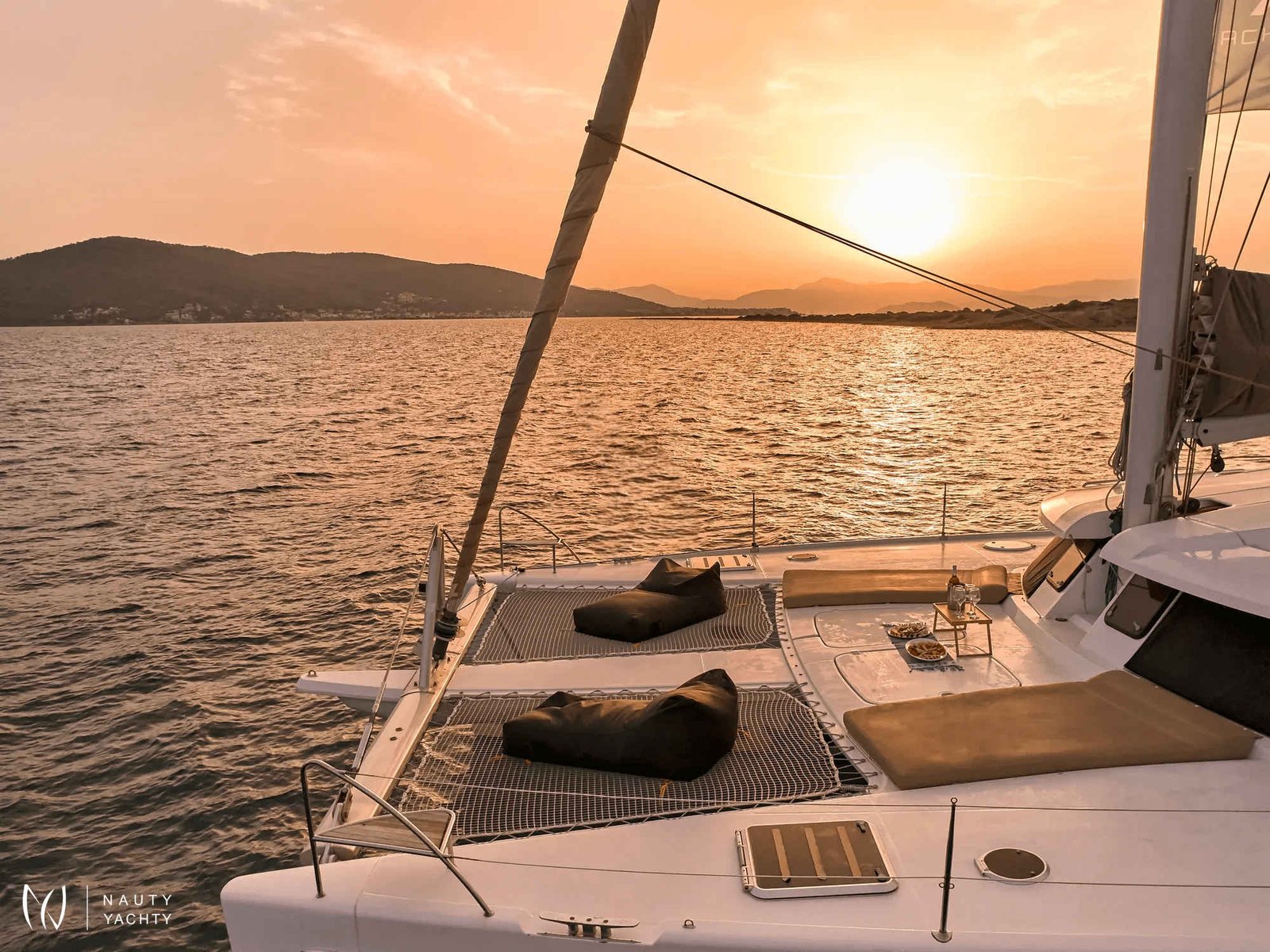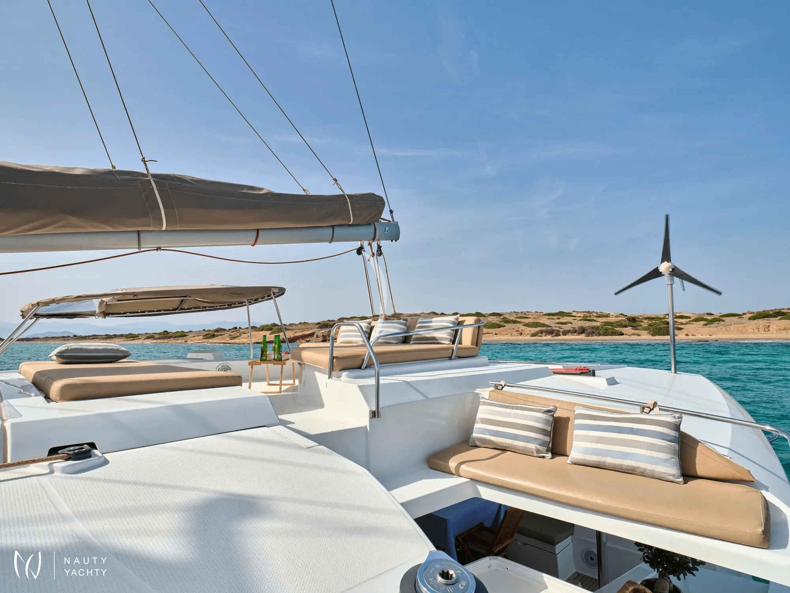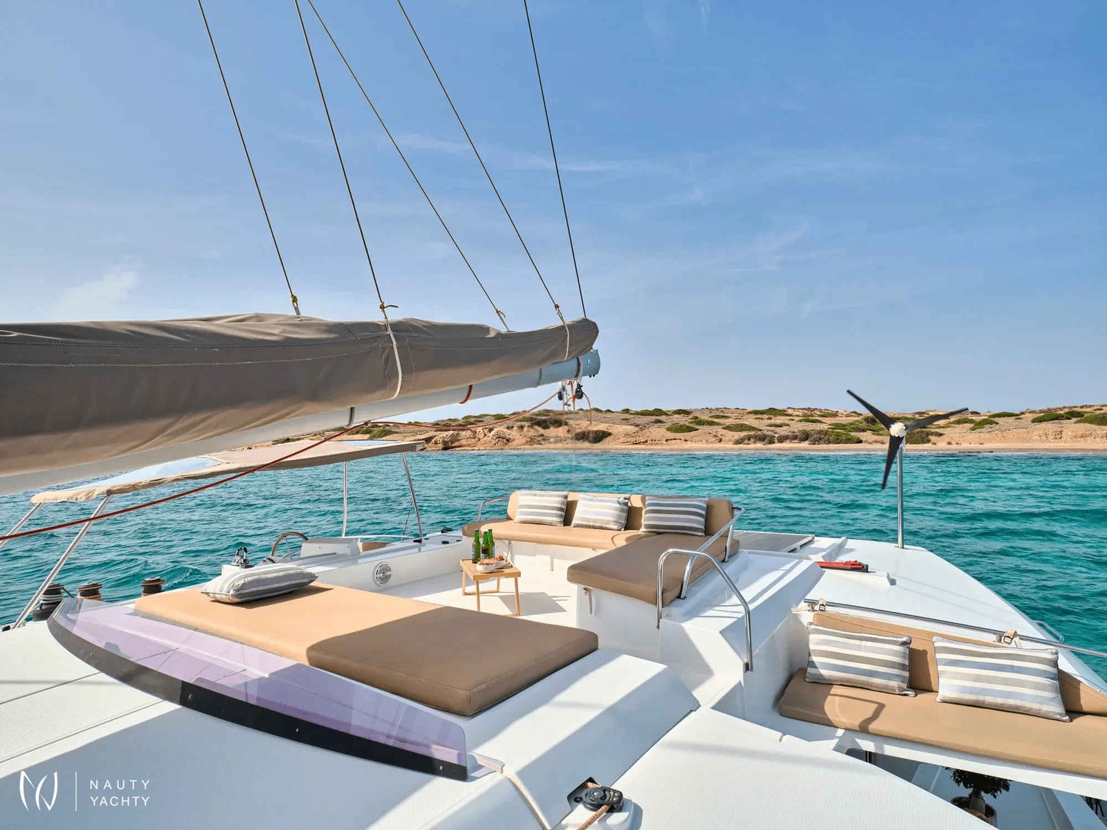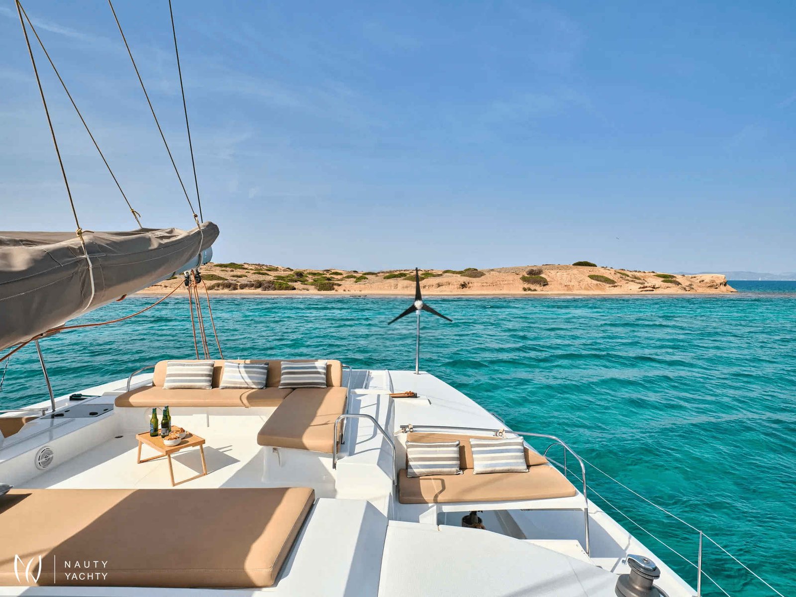 What are you looking for in your vacation? If you are aiming to take your family and friends on a memorable journey, living an adventurous, yet also relaxing and comfortable, a tour among the magnificent Greek islands, sailing through the crystal blue seas of the Aegean or the Ionian, then this impressive and luxurious boat, HIGH FIVE SANYA 57, a definitively elegant and innovative catamaran with a unique, contemporary design by FOUNTAINE PAJOT, is going to fulfill all your desires and expectations.With all the pleasures of the sea, with the distinctive comfort, fixtures, and services you’ve come to expect from our Flagship Class, HIGH FIVE will embrace you and will book a place in your heart. The memories you will create on this boat will be cherished forever.HIGH FIVE can accommodate up to 10 guests in 5 double cabins, all equipped with private bathroom facilities. All cabins have been specially designed for maximum comfort and space and have full air-conditioning, TV, DVD and stereo system integrated.HIGH FIVE SANYA 57 offers the luxury and comfort of a fine hotel. Wide staircases beckon to the tranquility and privacy of beautifully appointed cabins.The salon, with its soft colors and flexible seating areas is the perfect place, if you want to hide from the sun and yet not loose contact through the panoramic view with the outside world or if you just want to guess what kind of mouth-watering, delicious culinary delicacies your Chef is going to prepare for you.The aft deck, where you probably will spend most of your time at, is stylishly designed for your comfort, either when gathering around the table to enjoy a fabulous meal, filling the air with Mediterranean flavors, or simply relaxing, with an aperitif in your hand, after an exhausting day, playing with the numerous water toys, such as water skis, kayaks, paddle board, wake board, knee board, tubes, snorkeling gear, etc., you have on board. Then again if you like fishing and catching something, your Chef can prepare it for you the same day and serve it to you in the most delicious way, you can imagine.The fore deck is the absolute ideal area for sunbathing on comfortable sun mattresses, a trampoline, and the best location if you see any dolphins swimming alongside the boat. The Fly-bridge is the ultimate favorite place for enjoying a glass of champagne accompanied by a finger-licking hors d'oeuvre while gazing onto the horizon and harmoniously savoring the dreamlike scenery during sunset.The sailing catamaran HIGH FIVE SANYA 57 will bring you to the most beautiful places in the Mediterranean while traveling in all comfort and privacy. Guided by her crew you will discover the magnificent islands, nature, and culture, and most importantly the magnificent clarity of the Greek crystal blue waters.Modern and minimal in design with an excellent crew of three.