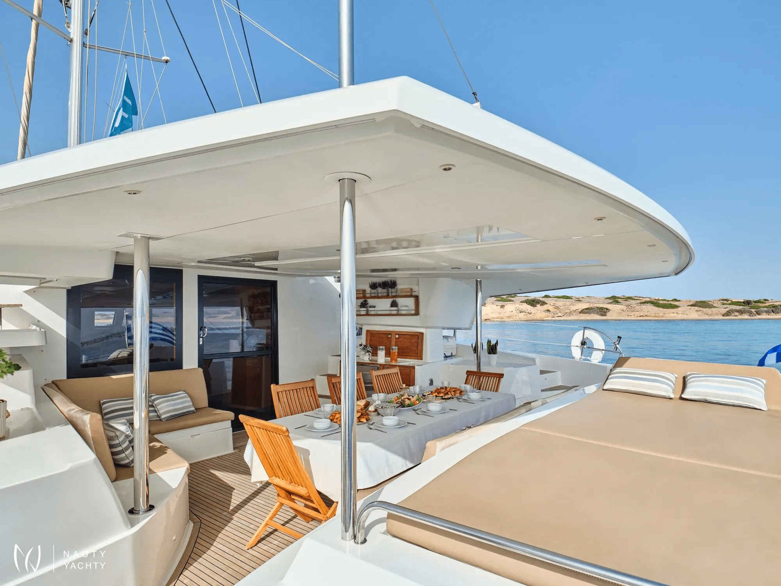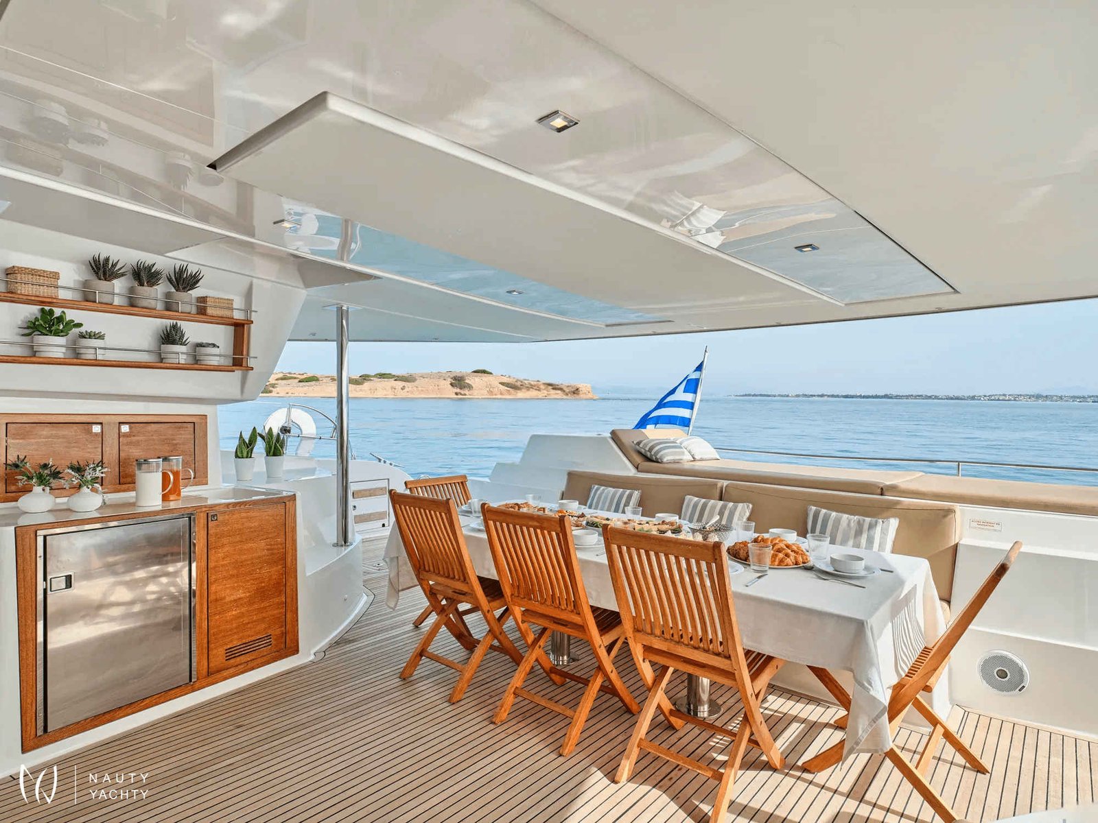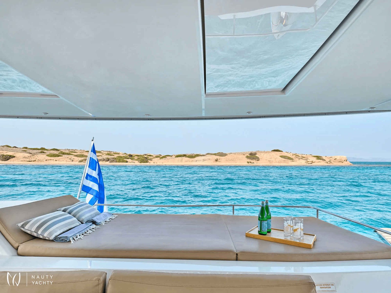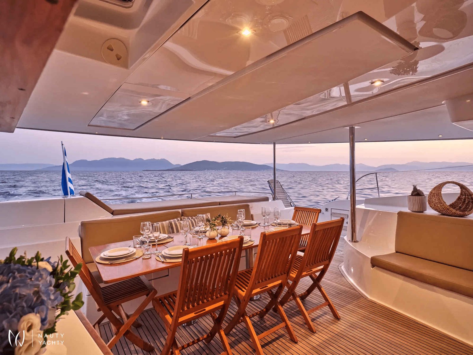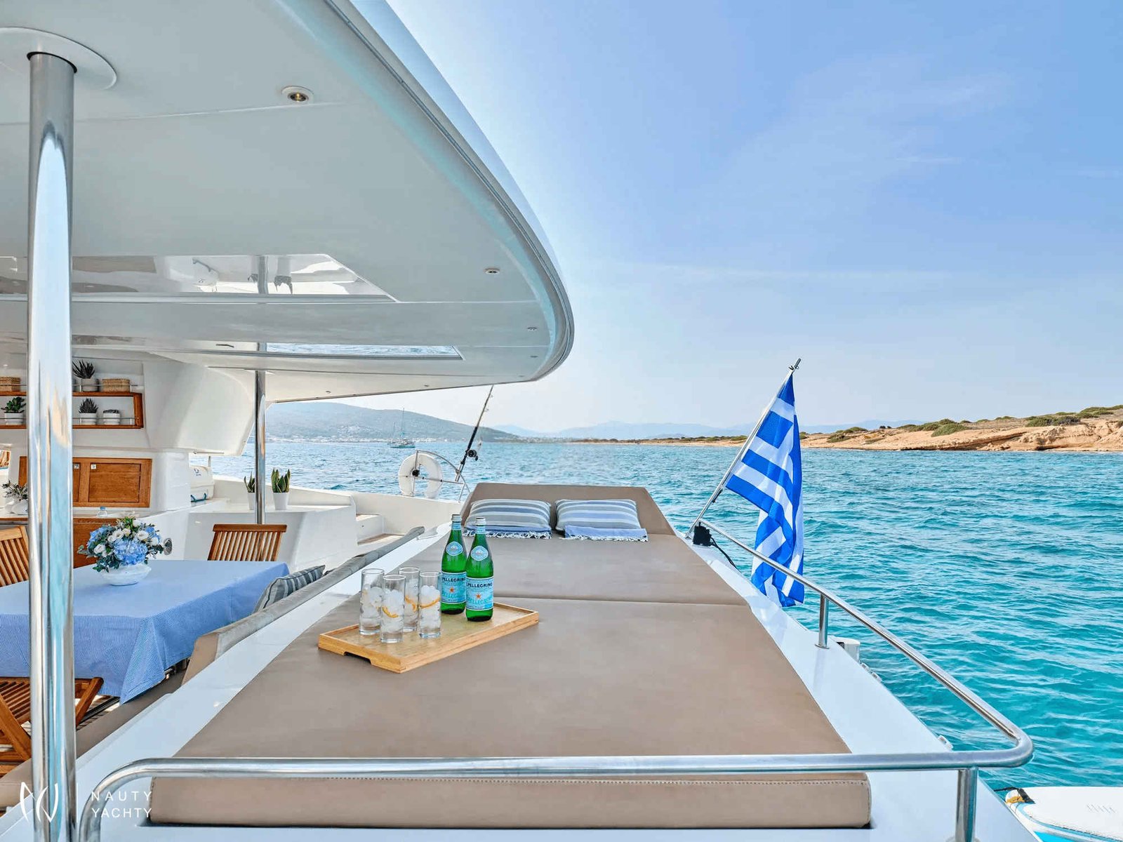 What are you looking for in your vacation? If you are aiming to take your family and friends on a memorable journey, living an adventurous, yet also relaxing and comfortable, a tour among the magnificent Greek islands, sailing through the crystal blue seas of the Aegean or the Ionian, then this impressive and luxurious boat, HIGH FIVE SANYA 57, a definitively elegant and innovative catamaran with a unique, contemporary design by FOUNTAINE PAJOT, is going to fulfill all your desires and expectations.With all the pleasures of the sea, with the distinctive comfort, fixtures, and services you’ve come to expect from our Flagship Class, HIGH FIVE will embrace you and will book a place in your heart. The memories you will create on this boat will be cherished forever.HIGH FIVE can accommodate up to 10 guests in 5 double cabins, all equipped with private bathroom facilities. All cabins have been specially designed for maximum comfort and space and have full air-conditioning, TV, DVD and stereo system integrated.HIGH FIVE SANYA 57 offers the luxury and comfort of a fine hotel. Wide staircases beckon to the tranquility and privacy of beautifully appointed cabins.The salon, with its soft colors and flexible seating areas is the perfect place, if you want to hide from the sun and yet not loose contact through the panoramic view with the outside world or if you just want to guess what kind of mouth-watering, delicious culinary delicacies your Chef is going to prepare for you.The aft deck, where you probably will spend most of your time at, is stylishly designed for your comfort, either when gathering around the table to enjoy a fabulous meal, filling the air with Mediterranean flavors, or simply relaxing, with an aperitif in your hand, after an exhausting day, playing with the numerous water toys, such as water skis, kayaks, paddle board, wake board, knee board, tubes, snorkeling gear, etc., you have on board. Then again if you like fishing and catching something, your Chef can prepare it for you the same day and serve it to you in the most delicious way, you can imagine.The fore deck is the absolute ideal area for sunbathing on comfortable sun mattresses, a trampoline, and the best location if you see any dolphins swimming alongside the boat. The Fly-bridge is the ultimate favorite place for enjoying a glass of champagne accompanied by a finger-licking hors d'oeuvre while gazing onto the horizon and harmoniously savoring the dreamlike scenery during sunset.The sailing catamaran HIGH FIVE SANYA 57 will bring you to the most beautiful places in the Mediterranean while traveling in all comfort and privacy. Guided by her crew you will discover the magnificent islands, nature, and culture, and most importantly the magnificent clarity of the Greek crystal blue waters.Modern and minimal in design with an excellent crew of three.