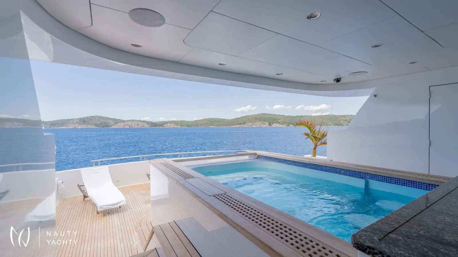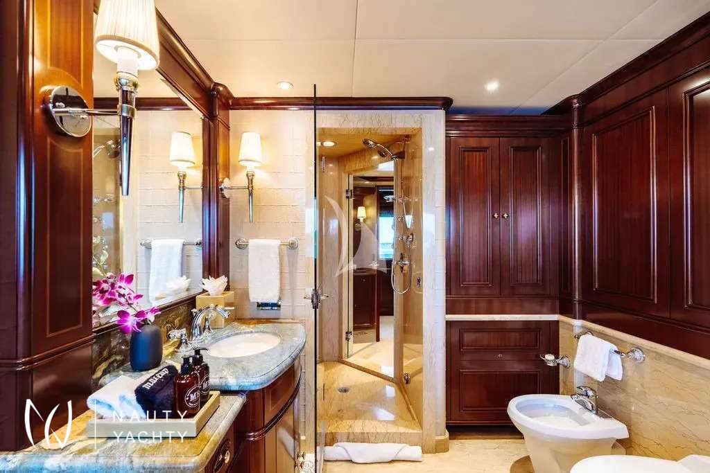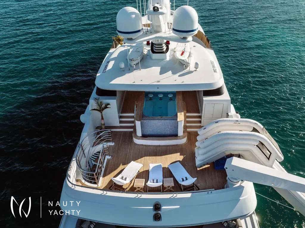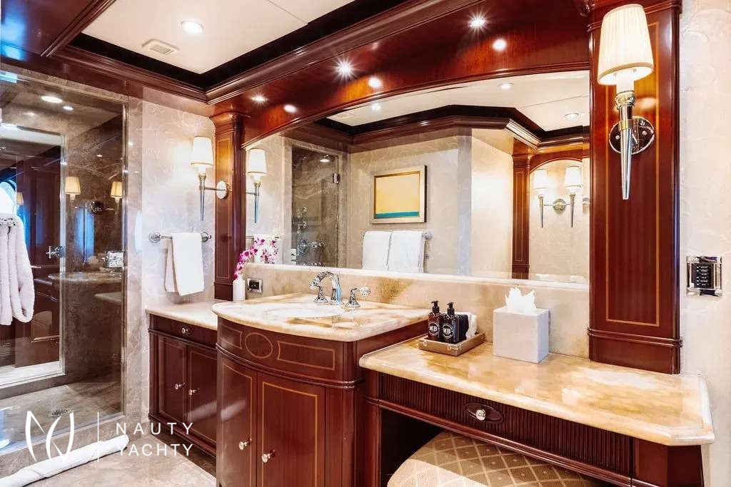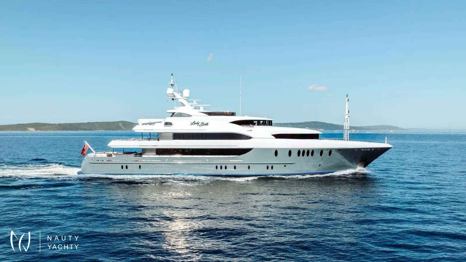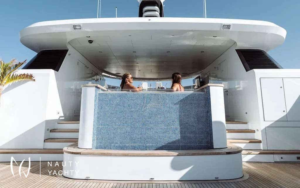 Walkthrough video: https://youtu.be/KlXz8Wsp6n0Charter video: https://youtu.be/Q4lENBJM9EYWelcoming up to 12 guests across six cabins, LADY BETH is the pinnacle of comfort and luxury at sea. Designed to cater to families and groups seeking the ultimate charter experience, she boasts not one but two master suites; one on the bridge deck that offers sweeping views to wake up to, and the other full-beam on the main deck adorned with striking oval windows.For water enthusiasts, LADY BETH is an aquatic paradise. Equipped with an impressive array of water toys, including waverunners, lift foils, SeaBobs, kitesurfing gear, and a thrilling 27’ inflatable slide, the yacht ensures an exhilarating experience for guests of all ages. Exploration is made effortless with a towed tender, while zero-speed stabilizers guarantee a smooth and comfortable journey, day or night.After a day packed with water activities, the expansive infinity-edge swimming pool/Jacuzzi aft provides the perfect setting for both relaxation and fitness. Plus, an elevator connecting all cabins to the bridge deck ensures accessibility to every amenity on board.Immaculately maintained, LADY BETH offers lavish facilities for endless fun under the sun. The stunning beach club grants easy access to the water and a serene space for lounging. With her generous interior volumes, the yacht accommodates all 12 guests, offering versatile, well-appointed areas for private moments, complemented by extensive exterior deck space for unparalleled al fresco dining. Whether seeking thrilling adventures or tranquil escapes, LADY BETH is the perfect yacht for both, allowing family and friends to create lasting memories together.MAIN DECKMASTER STATEROOMA full beam stateroom with luxurious wool silk carpeting on the main deck offers guests incredible views through eight large oval windows. Walk around king bed (faces aft) with his and hers desks located port and starboard. Large closets offer ample storage space and feature a mini bar fridge. Forward access to his and hers en-suite bath, wo sinks, large soaking jacuzzi tub, separate shared shower, private head for his and hers with bidet.UPPER DECK2ND MASTER STATEROOMLocated forward, LADY BETH's second master stateroom offers her guests spectacular 270 degree views. His and hers closets. Walk around bed (faces forward) with a desk to the left and sofa to the right. En-suite his and hers bath features a Jacuzzi tub, two vanities, a separate shower and bidet. Access to a private sitting outdoor sitting area on the Portuguese deck is located on the starboard.LOWER DECKPORT AFT VIP SUITEA spacious stateroom with walk around king bed, desk and 40" flat panel TV. En-suite bath with double access shower in this his and hers bath.STARBOARD GUEST STATEROOMA spacious stateroom with walk around King bed, and 40" flat panel TV. En-suite bath with shower.STARBOARD TWIN STATEROOMGuest stateroom offering flexibility of a full bed, twin bed, and Pullman. En-suite bath with tub.PORT TWIN STATEROOMGuest cabin offering flexibility of a full bed, twin bed, and Pullman. En-suite bath with tub.MAIN DECKMAIN SALONThrough the main aft doors and past the marbled foyer is the main salon featuring a seating area with multiple tables and settees comfortably hosting any sized group. The collection of settees and tables allows you to enjoy the view from any direction.DINING AREAPerfect for intimate dinners located forward of the main salon is a separate formal dining area for 12 guests which conveniently resides next to the main deck pantry and ship’s galley.MARBLE FOYERLocated mid deck featuring a large open stairwell next to the elevator which gives guests two ways to access all other interior decks.DAY HEADMain deck day head boasts Mother of Pearl wall coverings and a luxurious crystal sink.MAIN DECK AFTGreat for entertaining the main aft deck features cocktail style lounge seating. Generous in size, it can comfortably accommodate all guests on board.BEACH CLUB/GYM/TENDER GARAGEUPPER DECK - 2nd Master Stateroom located on this deckSKYLOUNGEPanoramic sky lounge area featuring nearly 10 feet of headroom at the center. This skylounge serves as the primary social area of the yacht with incredible views, a large full-service bar, a nearby service pantry, and quick access to the upper aft deck. This expansive room has plush carpeting throughout, reclining theater-style seating, and features both a 90' projector screen and 80' flat panel TV.DAY HEADA second day head is located near the skylounge entry.SKYLOUNGE DECKThe upper aft deck has a large, circular alfresco dining table for elegant outdoor dining. It can comfortably accommodate 12 guests and features a lazy susan. Aft of the table are several large sun pads, comfortable seating areas and tables to relax outside in privacy, out of view from the dock.SUN DECKThe sun deck has even more inviting social areas, including bar chairs, massive elevated forward observation/sun deck, day head, outdoor shower, full service wet bar and a beautifully tiled, oversized infinity edge pool/Jacuzzi. The Jacuzzi and bar area are protected from the sun by a hard top.