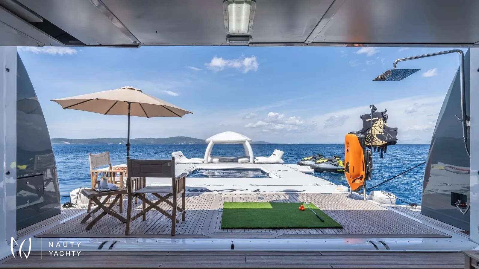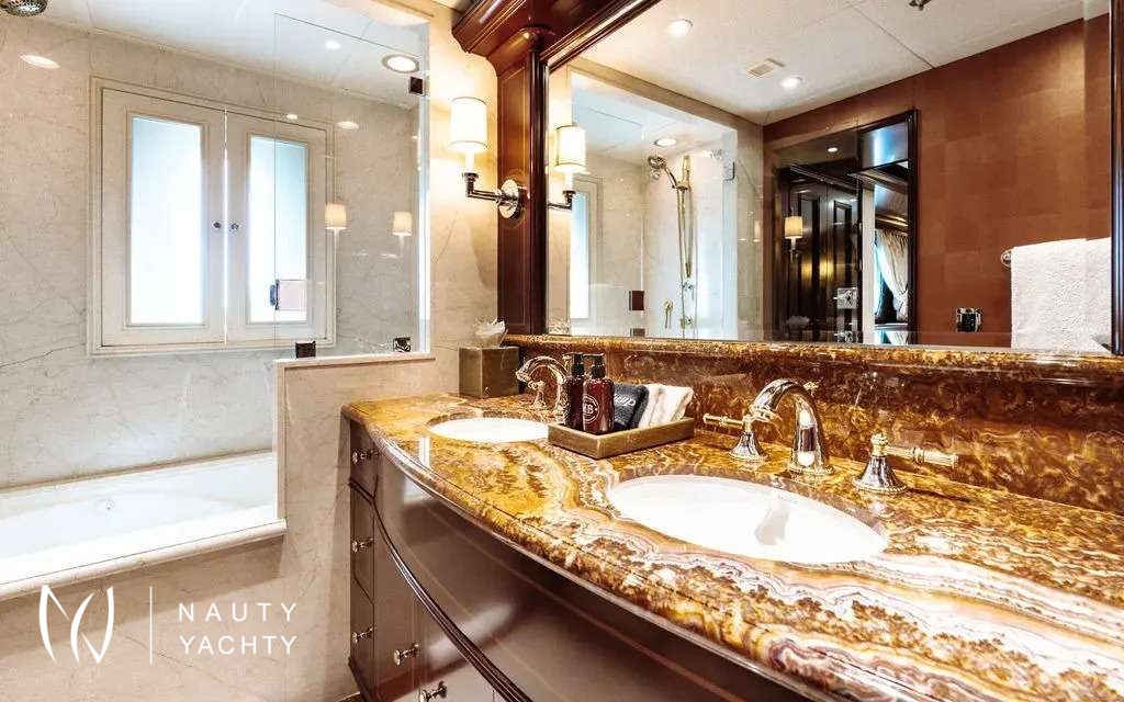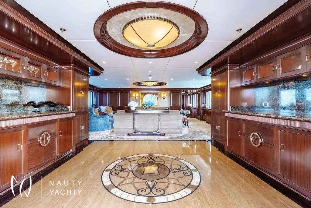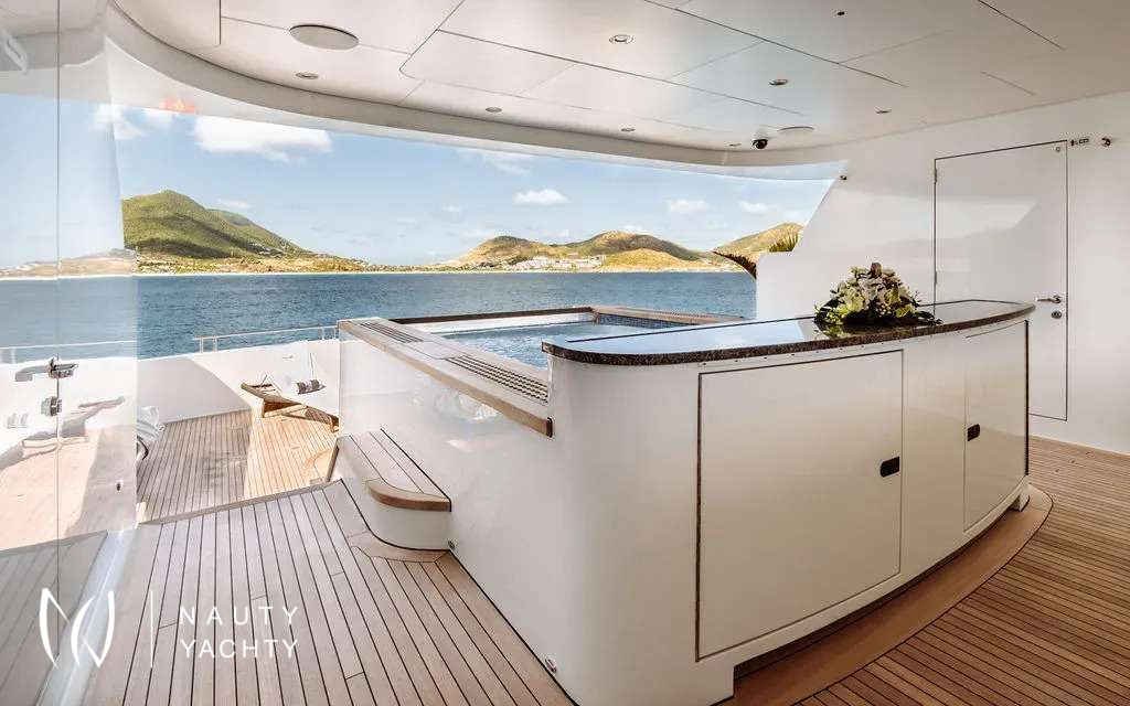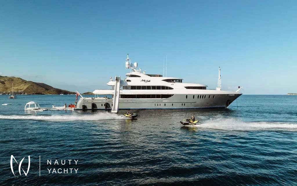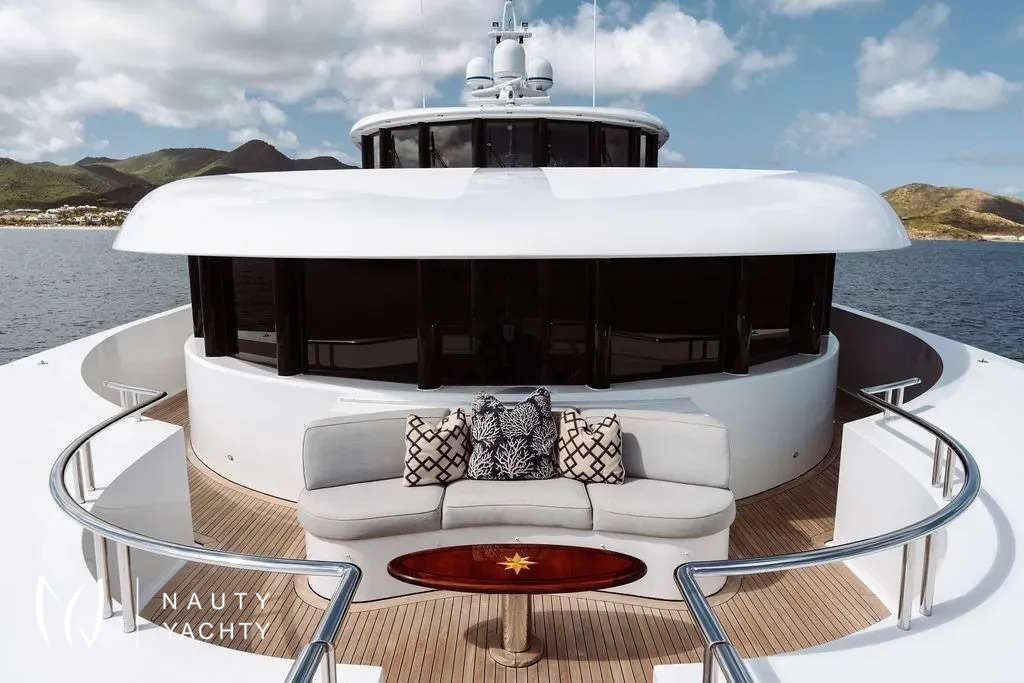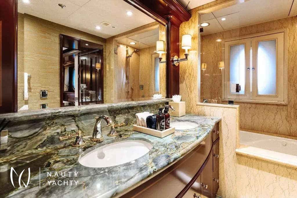 Walkthrough video: https://youtu.be/KlXz8Wsp6n0Charter video: https://youtu.be/Q4lENBJM9EYWelcoming up to 12 guests across six cabins, LADY BETH is the pinnacle of comfort and luxury at sea. Designed to cater to families and groups seeking the ultimate charter experience, she boasts not one but two master suites; one on the bridge deck that offers sweeping views to wake up to, and the other full-beam on the main deck adorned with striking oval windows.For water enthusiasts, LADY BETH is an aquatic paradise. Equipped with an impressive array of water toys, including waverunners, lift foils, SeaBobs, kitesurfing gear, and a thrilling 27’ inflatable slide, the yacht ensures an exhilarating experience for guests of all ages. Exploration is made effortless with a towed tender, while zero-speed stabilizers guarantee a smooth and comfortable journey, day or night.After a day packed with water activities, the expansive infinity-edge swimming pool/Jacuzzi aft provides the perfect setting for both relaxation and fitness. Plus, an elevator connecting all cabins to the bridge deck ensures accessibility to every amenity on board.Immaculately maintained, LADY BETH offers lavish facilities for endless fun under the sun. The stunning beach club grants easy access to the water and a serene space for lounging. With her generous interior volumes, the yacht accommodates all 12 guests, offering versatile, well-appointed areas for private moments, complemented by extensive exterior deck space for unparalleled al fresco dining. Whether seeking thrilling adventures or tranquil escapes, LADY BETH is the perfect yacht for both, allowing family and friends to create lasting memories together.MAIN DECKMASTER STATEROOMA full beam stateroom with luxurious wool silk carpeting on the main deck offers guests incredible views through eight large oval windows. Walk around king bed (faces aft) with his and hers desks located port and starboard. Large closets offer ample storage space and feature a mini bar fridge. Forward access to his and hers en-suite bath, wo sinks, large soaking jacuzzi tub, separate shared shower, private head for his and hers with bidet.UPPER DECK2ND MASTER STATEROOMLocated forward, LADY BETH's second master stateroom offers her guests spectacular 270 degree views. His and hers closets. Walk around bed (faces forward) with a desk to the left and sofa to the right. En-suite his and hers bath features a Jacuzzi tub, two vanities, a separate shower and bidet. Access to a private sitting outdoor sitting area on the Portuguese deck is located on the starboard.LOWER DECKPORT AFT VIP SUITEA spacious stateroom with walk around king bed, desk and 40" flat panel TV. En-suite bath with double access shower in this his and hers bath.STARBOARD GUEST STATEROOMA spacious stateroom with walk around King bed, and 40" flat panel TV. En-suite bath with shower.STARBOARD TWIN STATEROOMGuest stateroom offering flexibility of a full bed, twin bed, and Pullman. En-suite bath with tub.PORT TWIN STATEROOMGuest cabin offering flexibility of a full bed, twin bed, and Pullman. En-suite bath with tub.MAIN DECKMAIN SALONThrough the main aft doors and past the marbled foyer is the main salon featuring a seating area with multiple tables and settees comfortably hosting any sized group. The collection of settees and tables allows you to enjoy the view from any direction.DINING AREAPerfect for intimate dinners located forward of the main salon is a separate formal dining area for 12 guests which conveniently resides next to the main deck pantry and ship’s galley.MARBLE FOYERLocated mid deck featuring a large open stairwell next to the elevator which gives guests two ways to access all other interior decks.DAY HEADMain deck day head boasts Mother of Pearl wall coverings and a luxurious crystal sink.MAIN DECK AFTGreat for entertaining the main aft deck features cocktail style lounge seating. Generous in size, it can comfortably accommodate all guests on board.BEACH CLUB/GYM/TENDER GARAGEUPPER DECK - 2nd Master Stateroom located on this deckSKYLOUNGEPanoramic sky lounge area featuring nearly 10 feet of headroom at the center. This skylounge serves as the primary social area of the yacht with incredible views, a large full-service bar, a nearby service pantry, and quick access to the upper aft deck. This expansive room has plush carpeting throughout, reclining theater-style seating, and features both a 90' projector screen and 80' flat panel TV.DAY HEADA second day head is located near the skylounge entry.SKYLOUNGE DECKThe upper aft deck has a large, circular alfresco dining table for elegant outdoor dining. It can comfortably accommodate 12 guests and features a lazy susan. Aft of the table are several large sun pads, comfortable seating areas and tables to relax outside in privacy, out of view from the dock.SUN DECKThe sun deck has even more inviting social areas, including bar chairs, massive elevated forward observation/sun deck, day head, outdoor shower, full service wet bar and a beautifully tiled, oversized infinity edge pool/Jacuzzi. The Jacuzzi and bar area are protected from the sun by a hard top.