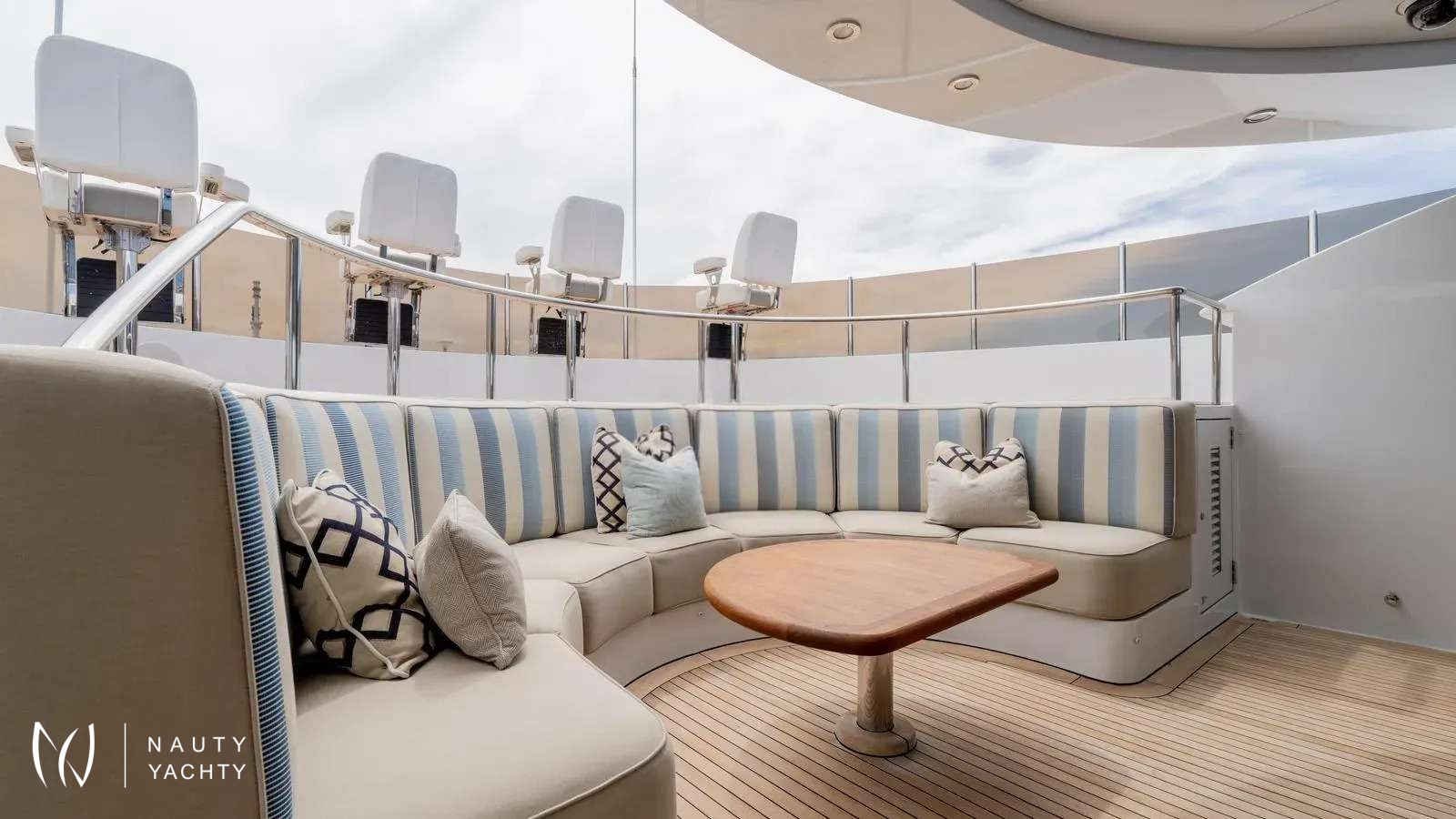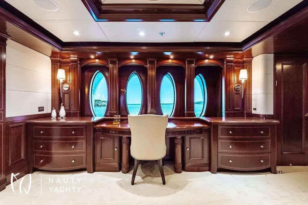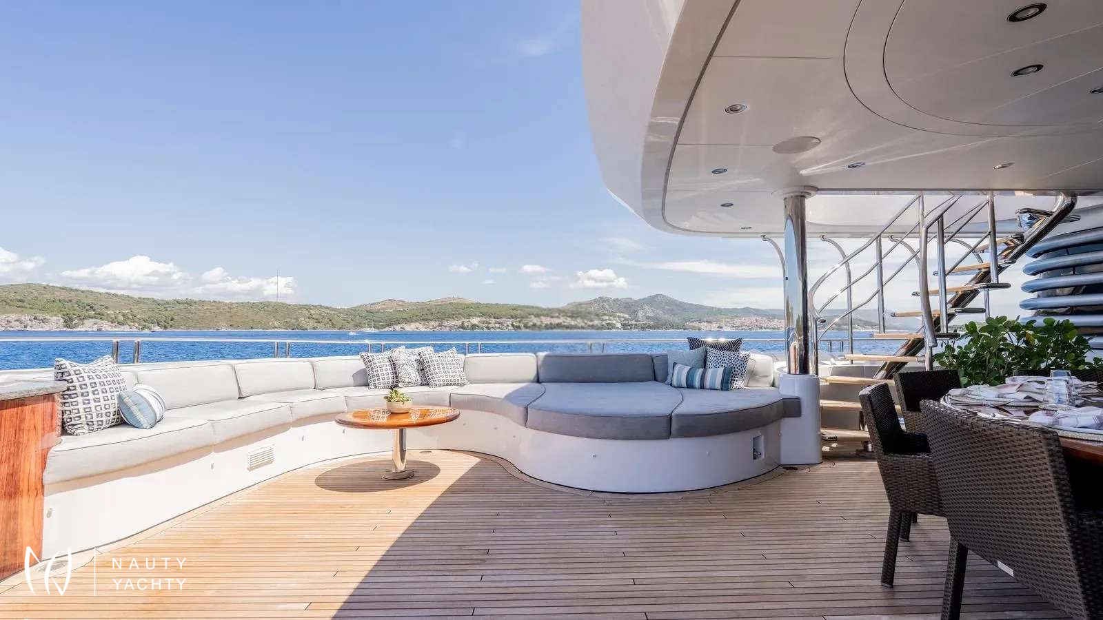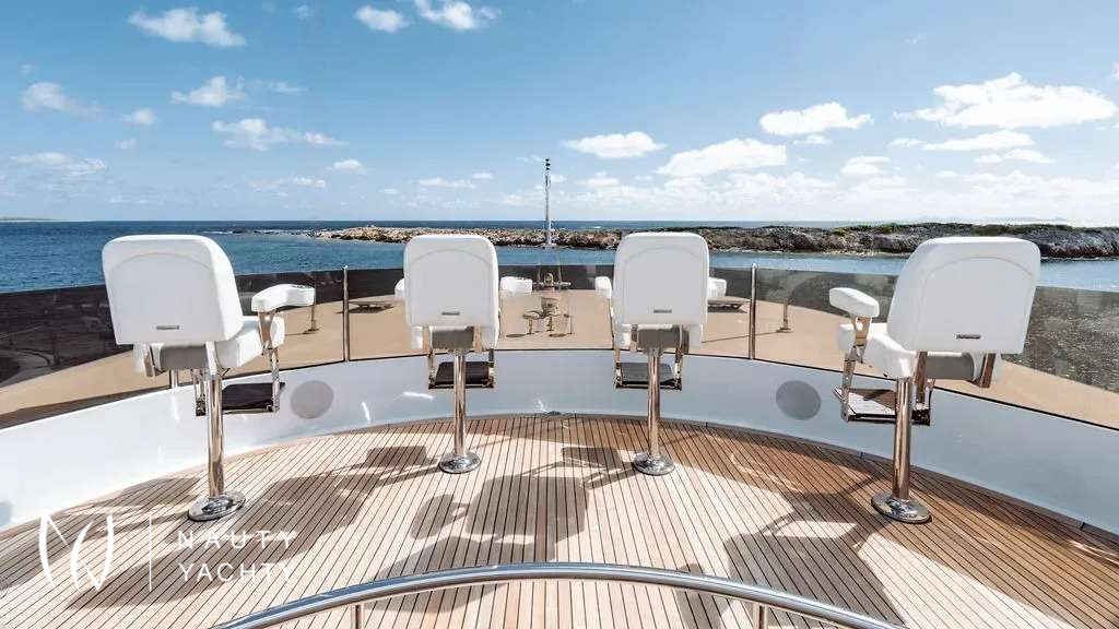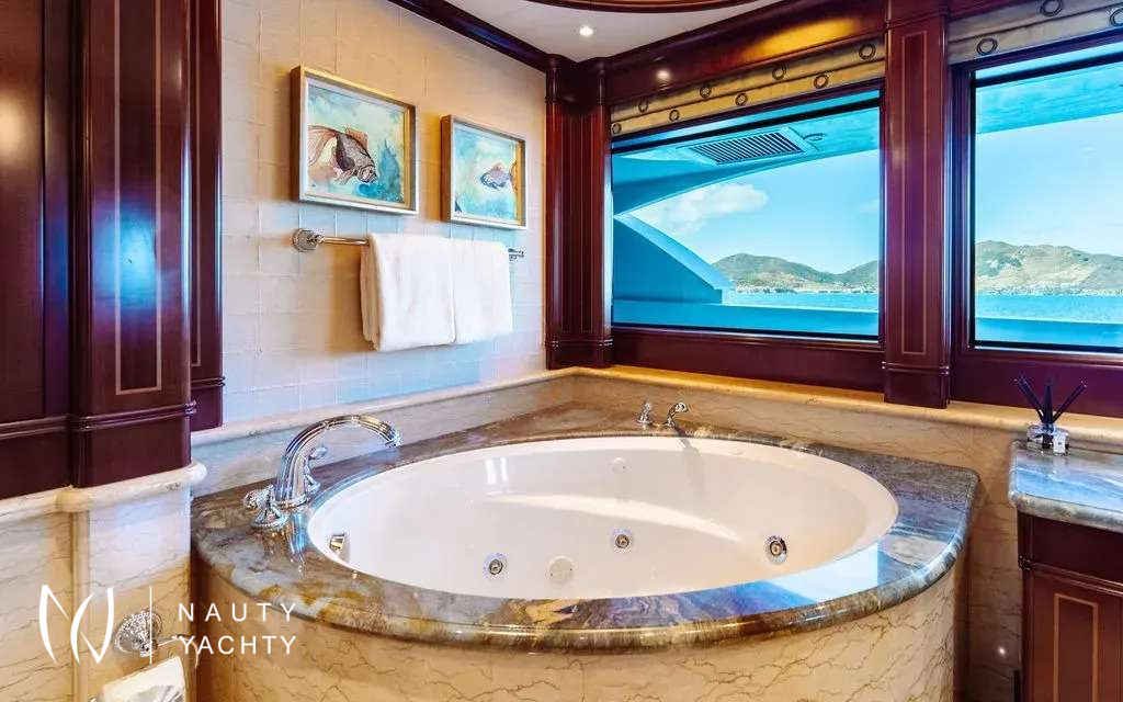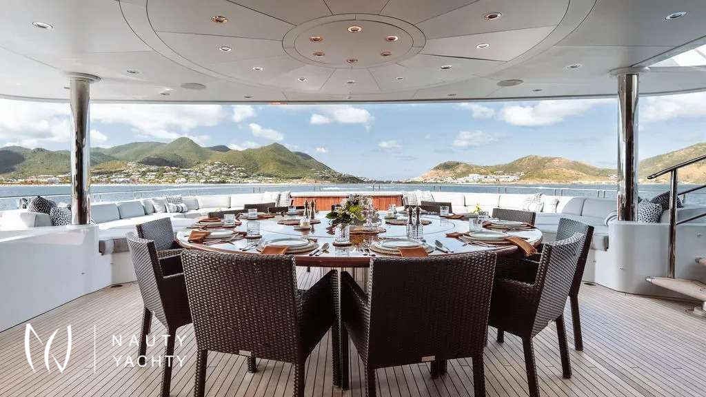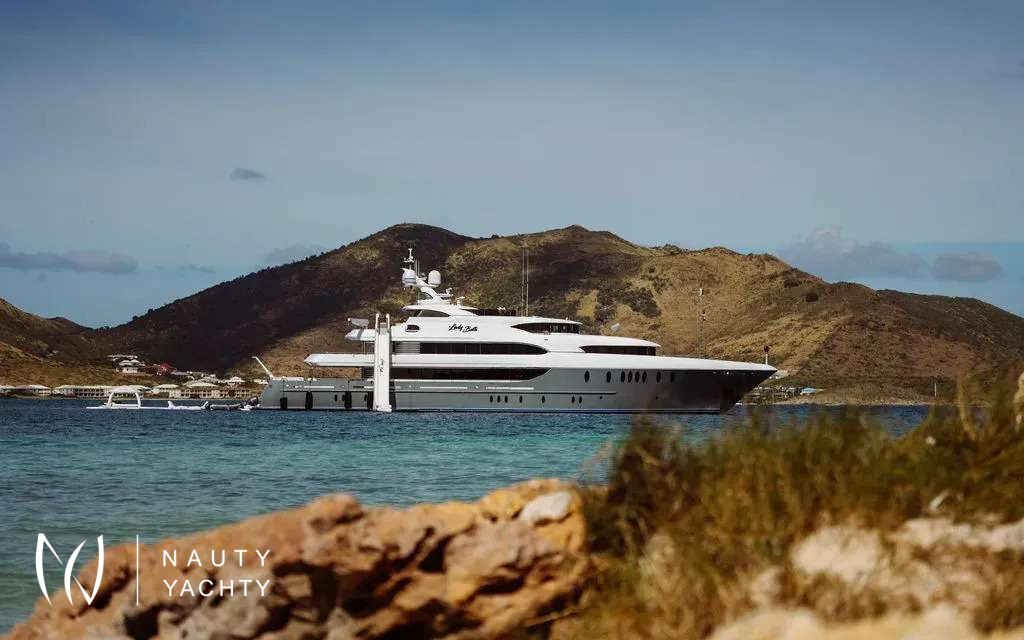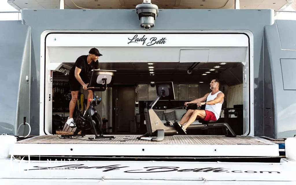 Walkthrough video: https://youtu.be/KlXz8Wsp6n0Charter video: https://youtu.be/Q4lENBJM9EYWelcoming up to 12 guests across six cabins, LADY BETH is the pinnacle of comfort and luxury at sea. Designed to cater to families and groups seeking the ultimate charter experience, she boasts not one but two master suites; one on the bridge deck that offers sweeping views to wake up to, and the other full-beam on the main deck adorned with striking oval windows.For water enthusiasts, LADY BETH is an aquatic paradise. Equipped with an impressive array of water toys, including waverunners, lift foils, SeaBobs, kitesurfing gear, and a thrilling 27’ inflatable slide, the yacht ensures an exhilarating experience for guests of all ages. Exploration is made effortless with a towed tender, while zero-speed stabilizers guarantee a smooth and comfortable journey, day or night.After a day packed with water activities, the expansive infinity-edge swimming pool/Jacuzzi aft provides the perfect setting for both relaxation and fitness. Plus, an elevator connecting all cabins to the bridge deck ensures accessibility to every amenity on board.Immaculately maintained, LADY BETH offers lavish facilities for endless fun under the sun. The stunning beach club grants easy access to the water and a serene space for lounging. With her generous interior volumes, the yacht accommodates all 12 guests, offering versatile, well-appointed areas for private moments, complemented by extensive exterior deck space for unparalleled al fresco dining. Whether seeking thrilling adventures or tranquil escapes, LADY BETH is the perfect yacht for both, allowing family and friends to create lasting memories together.MAIN DECKMASTER STATEROOMA full beam stateroom with luxurious wool silk carpeting on the main deck offers guests incredible views through eight large oval windows. Walk around king bed (faces aft) with his and hers desks located port and starboard. Large closets offer ample storage space and feature a mini bar fridge. Forward access to his and hers en-suite bath, wo sinks, large soaking jacuzzi tub, separate shared shower, private head for his and hers with bidet.UPPER DECK2ND MASTER STATEROOMLocated forward, LADY BETH's second master stateroom offers her guests spectacular 270 degree views. His and hers closets. Walk around bed (faces forward) with a desk to the left and sofa to the right. En-suite his and hers bath features a Jacuzzi tub, two vanities, a separate shower and bidet. Access to a private sitting outdoor sitting area on the Portuguese deck is located on the starboard.LOWER DECKPORT AFT VIP SUITEA spacious stateroom with walk around king bed, desk and 40" flat panel TV. En-suite bath with double access shower in this his and hers bath.STARBOARD GUEST STATEROOMA spacious stateroom with walk around King bed, and 40" flat panel TV. En-suite bath with shower.STARBOARD TWIN STATEROOMGuest stateroom offering flexibility of a full bed, twin bed, and Pullman. En-suite bath with tub.PORT TWIN STATEROOMGuest cabin offering flexibility of a full bed, twin bed, and Pullman. En-suite bath with tub.MAIN DECKMAIN SALONThrough the main aft doors and past the marbled foyer is the main salon featuring a seating area with multiple tables and settees comfortably hosting any sized group. The collection of settees and tables allows you to enjoy the view from any direction.DINING AREAPerfect for intimate dinners located forward of the main salon is a separate formal dining area for 12 guests which conveniently resides next to the main deck pantry and ship’s galley.MARBLE FOYERLocated mid deck featuring a large open stairwell next to the elevator which gives guests two ways to access all other interior decks.DAY HEADMain deck day head boasts Mother of Pearl wall coverings and a luxurious crystal sink.MAIN DECK AFTGreat for entertaining the main aft deck features cocktail style lounge seating. Generous in size, it can comfortably accommodate all guests on board.BEACH CLUB/GYM/TENDER GARAGEUPPER DECK - 2nd Master Stateroom located on this deckSKYLOUNGEPanoramic sky lounge area featuring nearly 10 feet of headroom at the center. This skylounge serves as the primary social area of the yacht with incredible views, a large full-service bar, a nearby service pantry, and quick access to the upper aft deck. This expansive room has plush carpeting throughout, reclining theater-style seating, and features both a 90' projector screen and 80' flat panel TV.DAY HEADA second day head is located near the skylounge entry.SKYLOUNGE DECKThe upper aft deck has a large, circular alfresco dining table for elegant outdoor dining. It can comfortably accommodate 12 guests and features a lazy susan. Aft of the table are several large sun pads, comfortable seating areas and tables to relax outside in privacy, out of view from the dock.SUN DECKThe sun deck has even more inviting social areas, including bar chairs, massive elevated forward observation/sun deck, day head, outdoor shower, full service wet bar and a beautifully tiled, oversized infinity edge pool/Jacuzzi. The Jacuzzi and bar area are protected from the sun by a hard top.