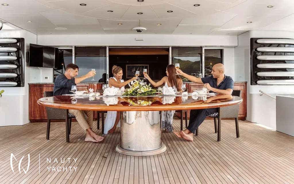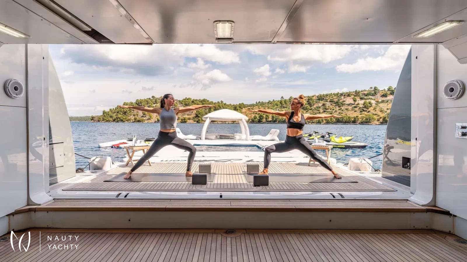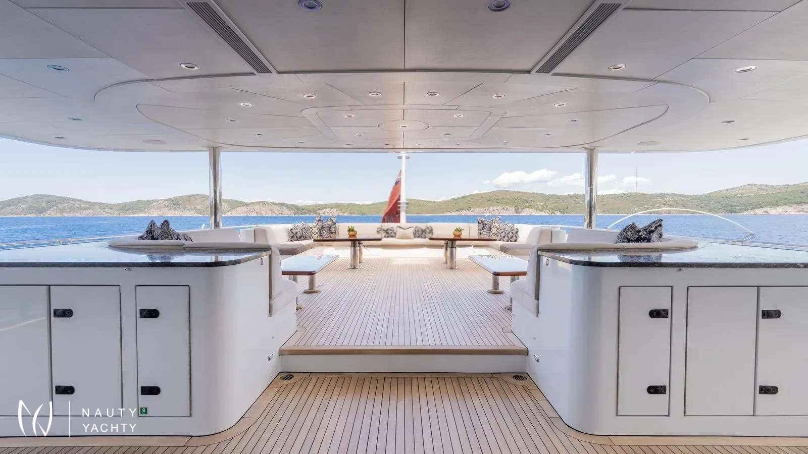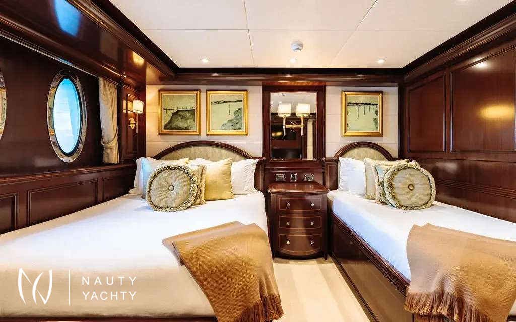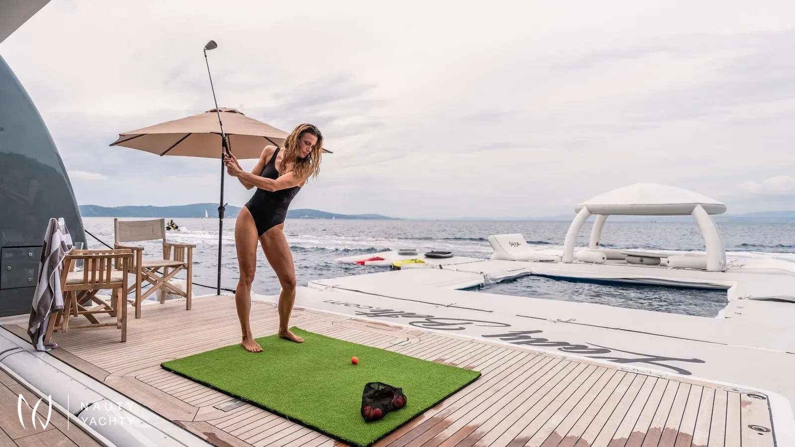 Walkthrough video: https://youtu.be/KlXz8Wsp6n0Charter video: https://youtu.be/Q4lENBJM9EYWelcoming up to 12 guests across six cabins, LADY BETH is the pinnacle of comfort and luxury at sea. Designed to cater to families and groups seeking the ultimate charter experience, she boasts not one but two master suites; one on the bridge deck that offers sweeping views to wake up to, and the other full-beam on the main deck adorned with striking oval windows.For water enthusiasts, LADY BETH is an aquatic paradise. Equipped with an impressive array of water toys, including waverunners, lift foils, SeaBobs, kitesurfing gear, and a thrilling 27’ inflatable slide, the yacht ensures an exhilarating experience for guests of all ages. Exploration is made effortless with a towed tender, while zero-speed stabilizers guarantee a smooth and comfortable journey, day or night.After a day packed with water activities, the expansive infinity-edge swimming pool/Jacuzzi aft provides the perfect setting for both relaxation and fitness. Plus, an elevator connecting all cabins to the bridge deck ensures accessibility to every amenity on board.Immaculately maintained, LADY BETH offers lavish facilities for endless fun under the sun. The stunning beach club grants easy access to the water and a serene space for lounging. With her generous interior volumes, the yacht accommodates all 12 guests, offering versatile, well-appointed areas for private moments, complemented by extensive exterior deck space for unparalleled al fresco dining. Whether seeking thrilling adventures or tranquil escapes, LADY BETH is the perfect yacht for both, allowing family and friends to create lasting memories together.MAIN DECKMASTER STATEROOMA full beam stateroom with luxurious wool silk carpeting on the main deck offers guests incredible views through eight large oval windows. Walk around king bed (faces aft) with his and hers desks located port and starboard. Large closets offer ample storage space and feature a mini bar fridge. Forward access to his and hers en-suite bath, wo sinks, large soaking jacuzzi tub, separate shared shower, private head for his and hers with bidet.UPPER DECK2ND MASTER STATEROOMLocated forward, LADY BETH's second master stateroom offers her guests spectacular 270 degree views. His and hers closets. Walk around bed (faces forward) with a desk to the left and sofa to the right. En-suite his and hers bath features a Jacuzzi tub, two vanities, a separate shower and bidet. Access to a private sitting outdoor sitting area on the Portuguese deck is located on the starboard.LOWER DECKPORT AFT VIP SUITEA spacious stateroom with walk around king bed, desk and 40" flat panel TV. En-suite bath with double access shower in this his and hers bath.STARBOARD GUEST STATEROOMA spacious stateroom with walk around King bed, and 40" flat panel TV. En-suite bath with shower.STARBOARD TWIN STATEROOMGuest stateroom offering flexibility of a full bed, twin bed, and Pullman. En-suite bath with tub.PORT TWIN STATEROOMGuest cabin offering flexibility of a full bed, twin bed, and Pullman. En-suite bath with tub.MAIN DECKMAIN SALONThrough the main aft doors and past the marbled foyer is the main salon featuring a seating area with multiple tables and settees comfortably hosting any sized group. The collection of settees and tables allows you to enjoy the view from any direction.DINING AREAPerfect for intimate dinners located forward of the main salon is a separate formal dining area for 12 guests which conveniently resides next to the main deck pantry and ship’s galley.MARBLE FOYERLocated mid deck featuring a large open stairwell next to the elevator which gives guests two ways to access all other interior decks.DAY HEADMain deck day head boasts Mother of Pearl wall coverings and a luxurious crystal sink.MAIN DECK AFTGreat for entertaining the main aft deck features cocktail style lounge seating. Generous in size, it can comfortably accommodate all guests on board.BEACH CLUB/GYM/TENDER GARAGEUPPER DECK - 2nd Master Stateroom located on this deckSKYLOUNGEPanoramic sky lounge area featuring nearly 10 feet of headroom at the center. This skylounge serves as the primary social area of the yacht with incredible views, a large full-service bar, a nearby service pantry, and quick access to the upper aft deck. This expansive room has plush carpeting throughout, reclining theater-style seating, and features both a 90' projector screen and 80' flat panel TV.DAY HEADA second day head is located near the skylounge entry.SKYLOUNGE DECKThe upper aft deck has a large, circular alfresco dining table for elegant outdoor dining. It can comfortably accommodate 12 guests and features a lazy susan. Aft of the table are several large sun pads, comfortable seating areas and tables to relax outside in privacy, out of view from the dock.SUN DECKThe sun deck has even more inviting social areas, including bar chairs, massive elevated forward observation/sun deck, day head, outdoor shower, full service wet bar and a beautifully tiled, oversized infinity edge pool/Jacuzzi. The Jacuzzi and bar area are protected from the sun by a hard top.
