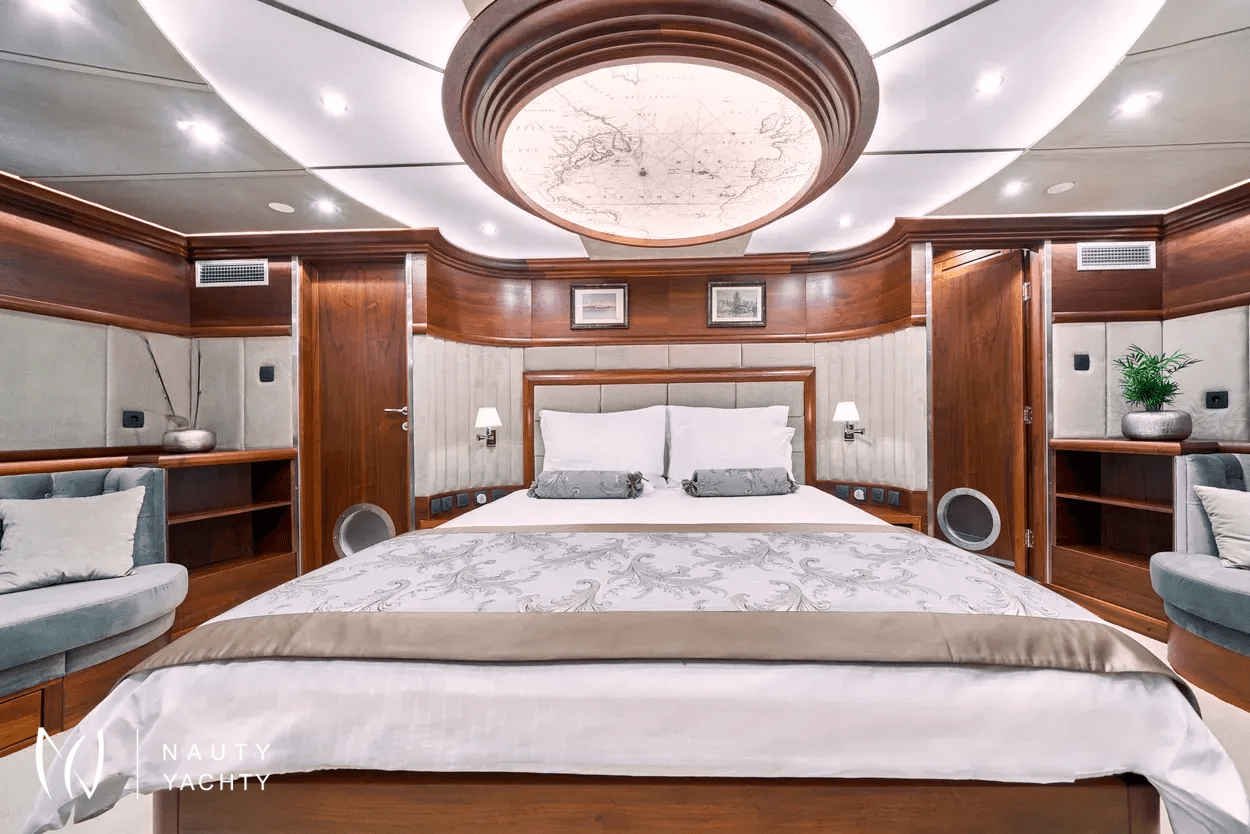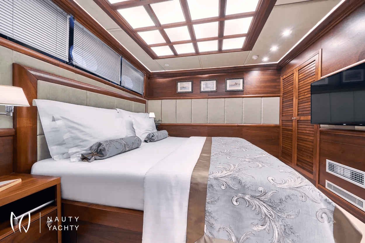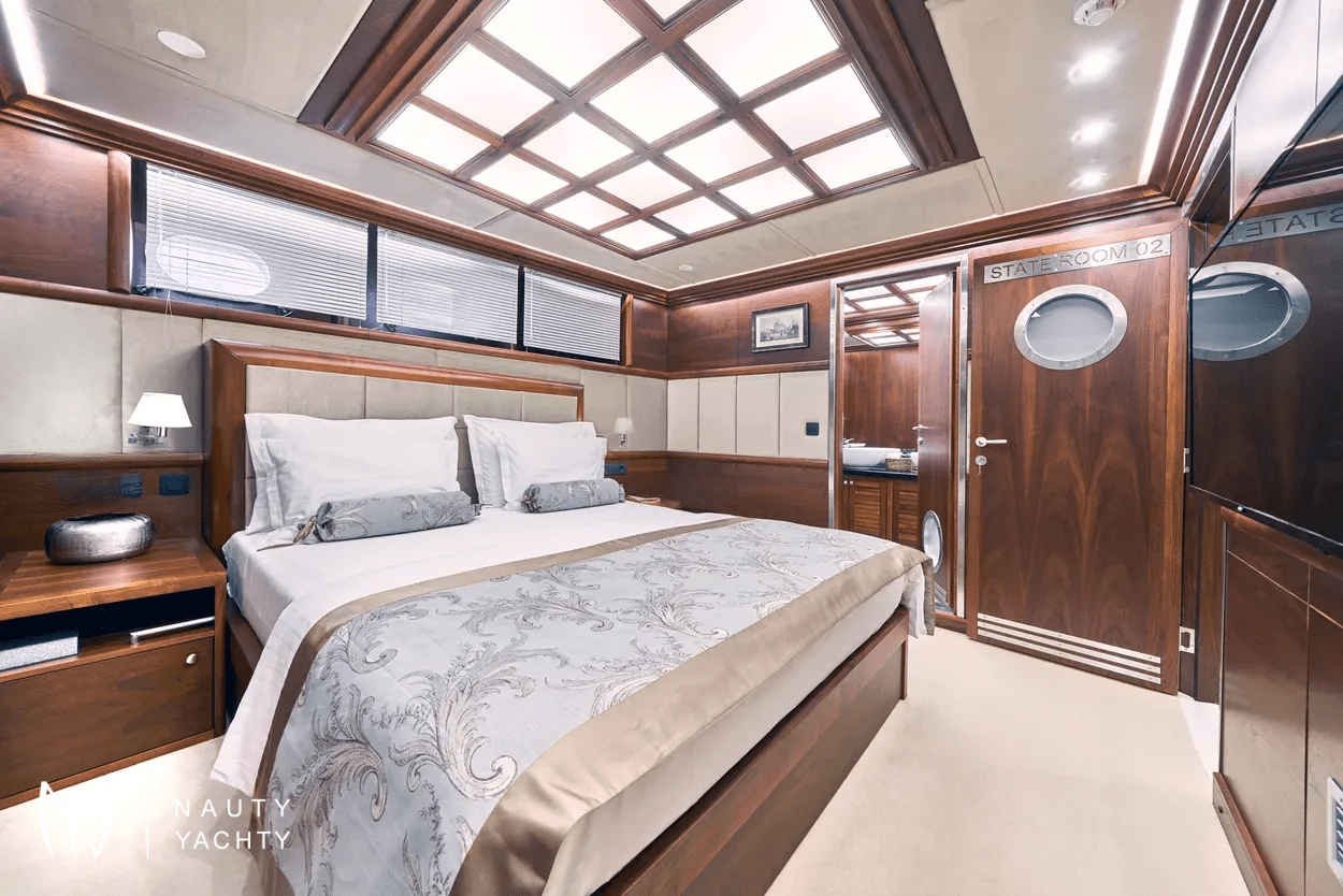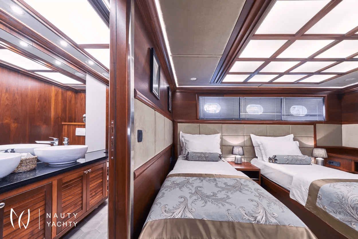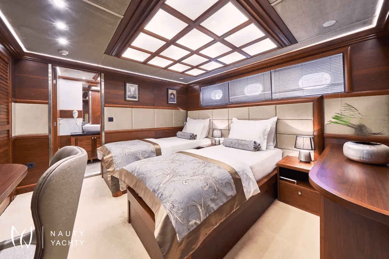 The yacht accommodates up to 12 guests in 6 en-suite cabins, providing a customized and comfortable experience.