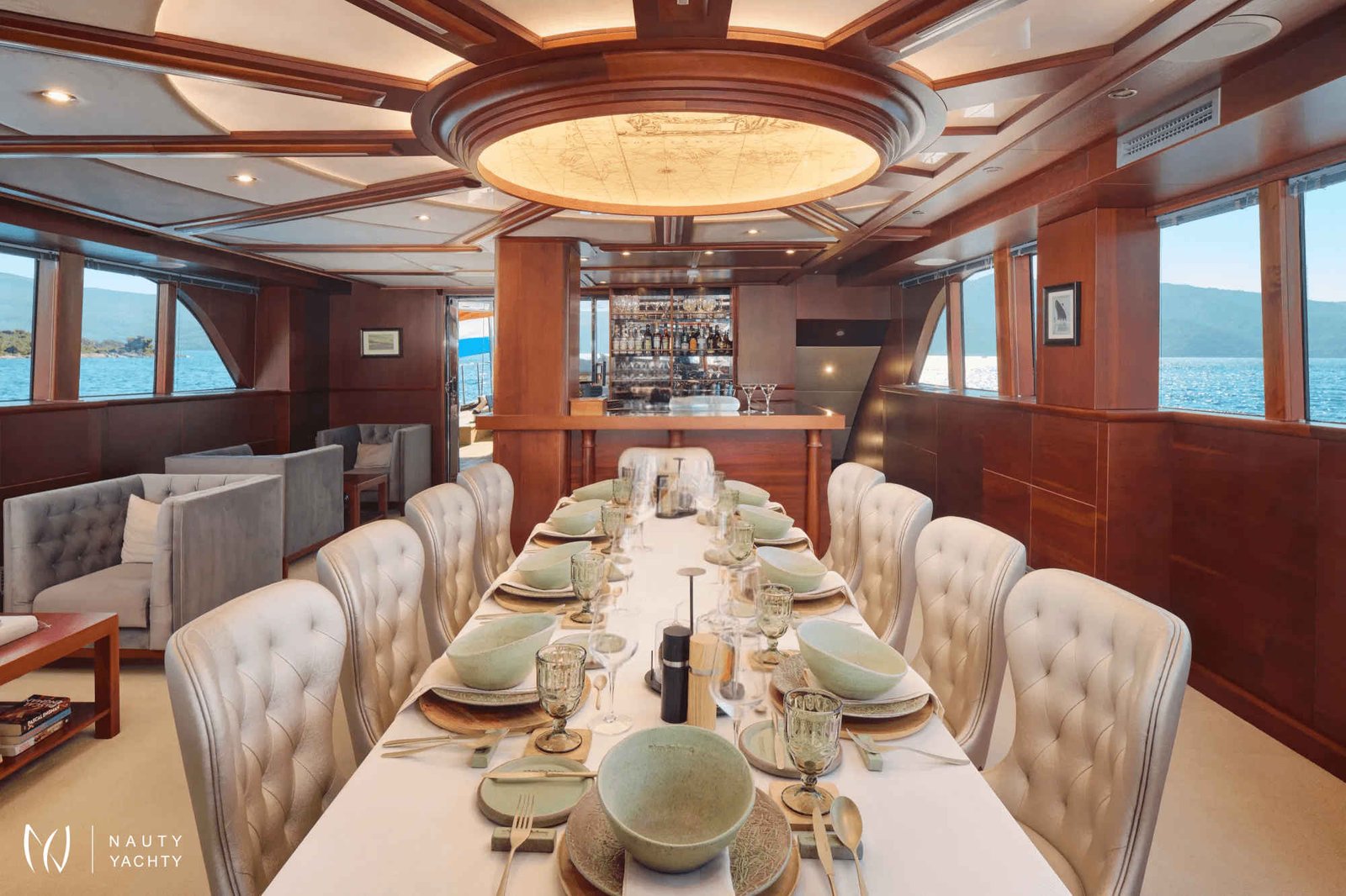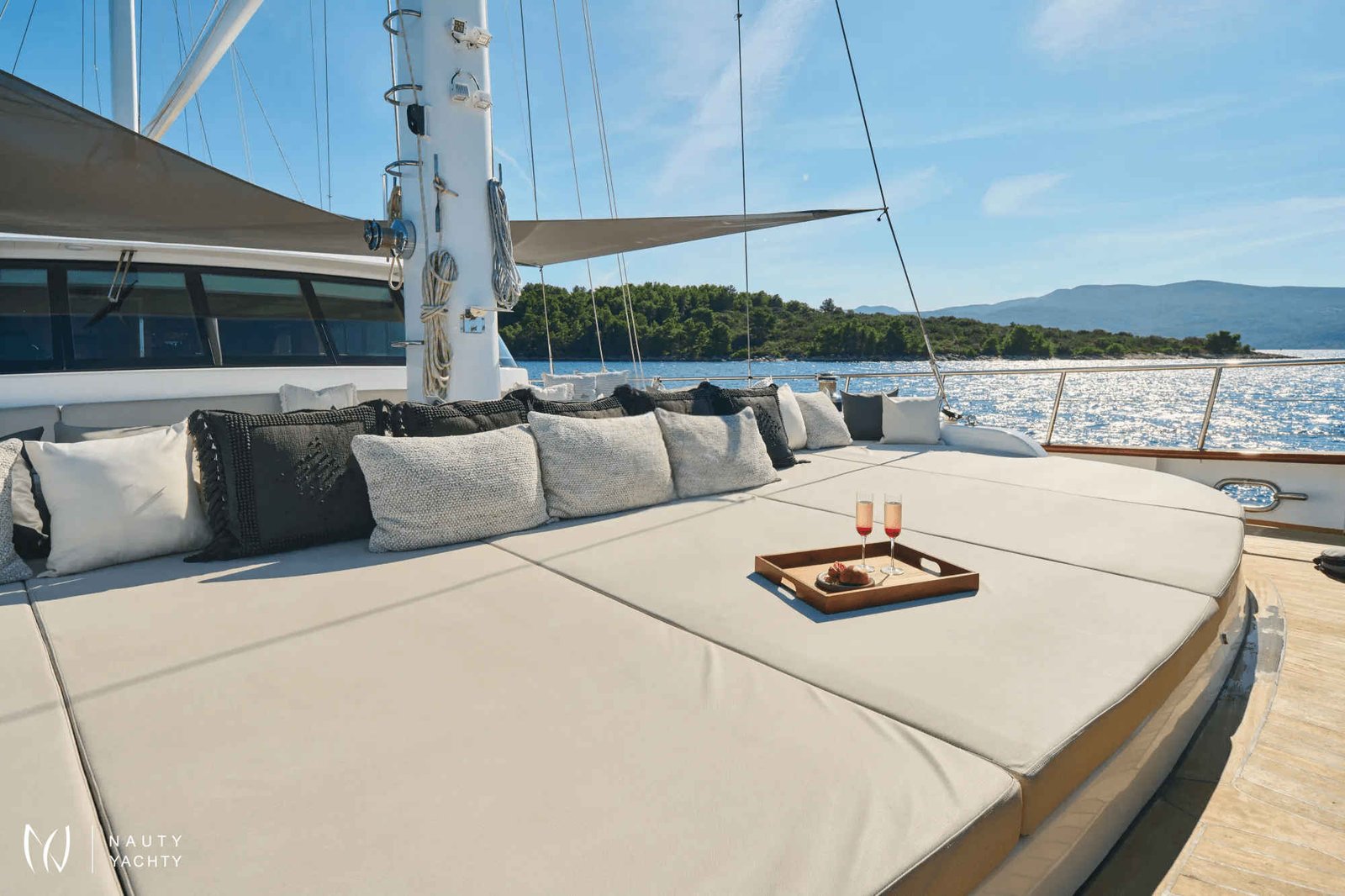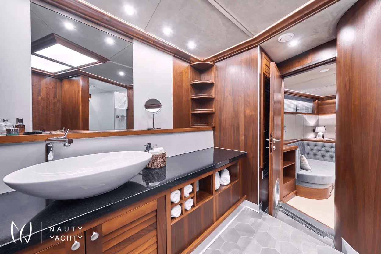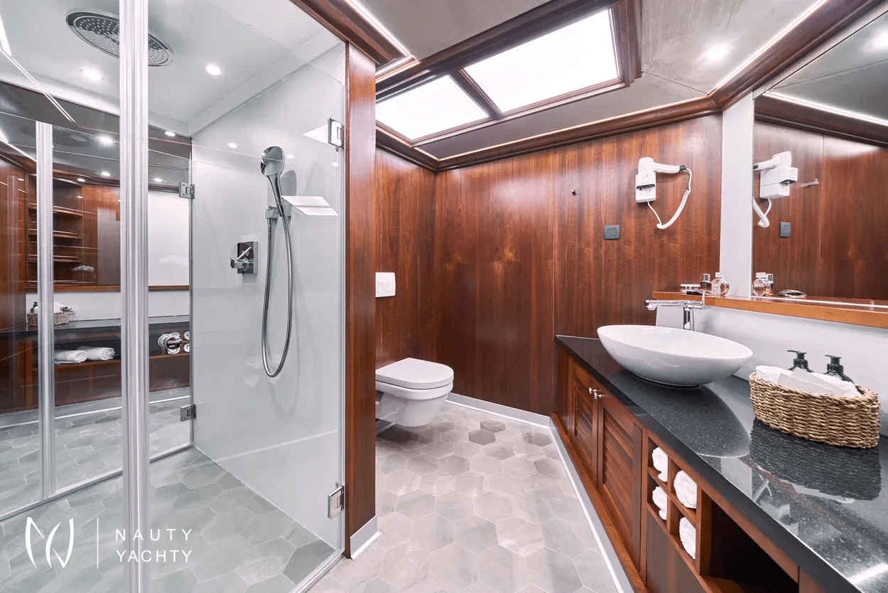 The yacht accommodates up to 12 guests in 6 en-suite cabins, providing a customized and comfortable experience.