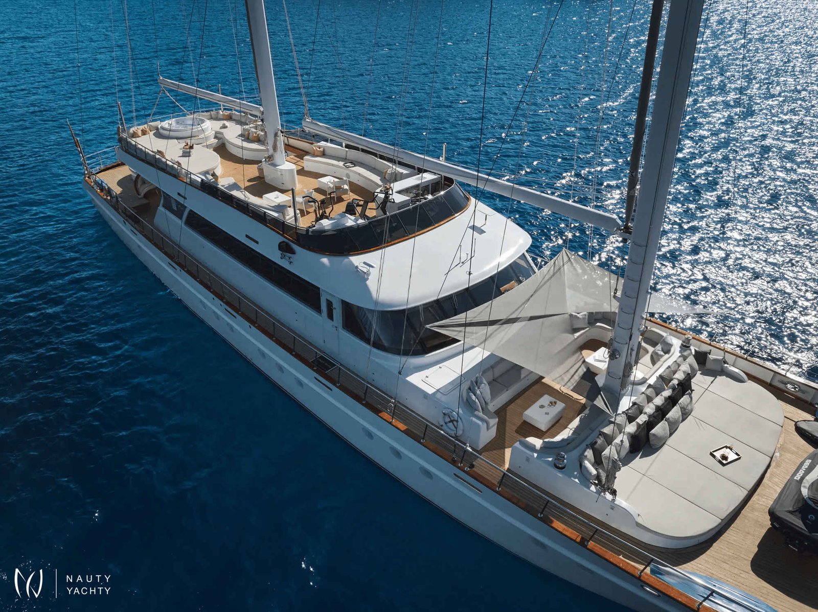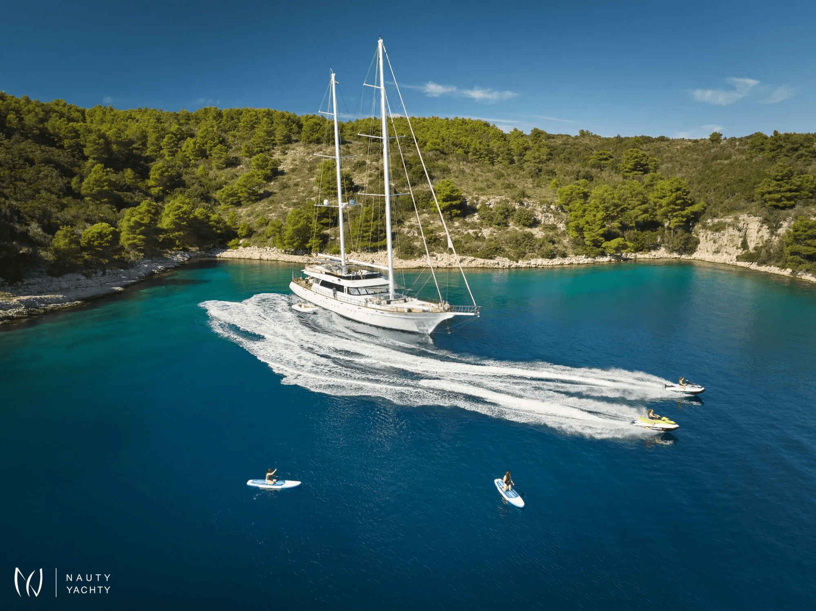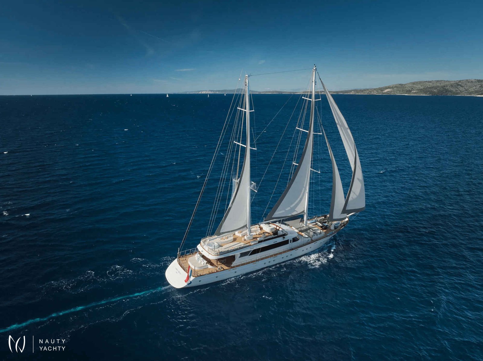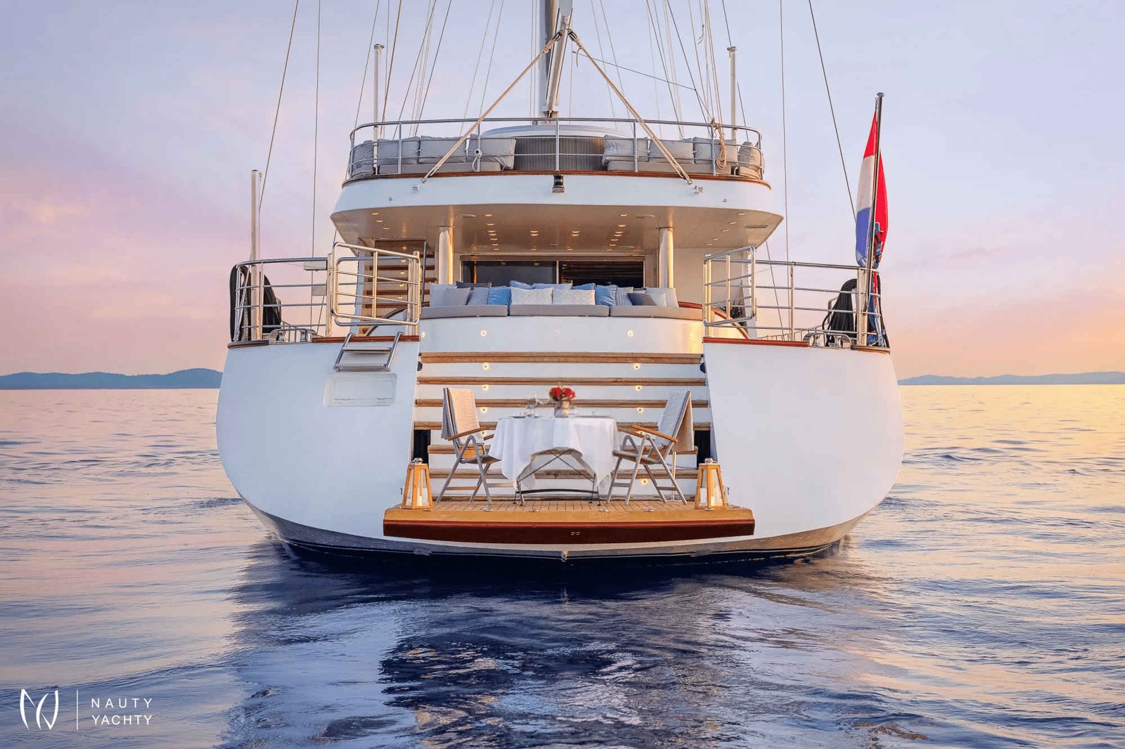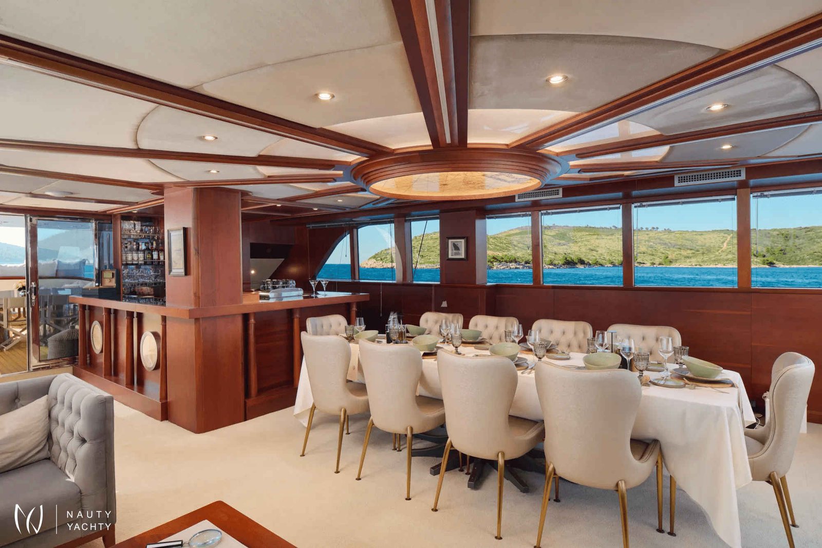 The yacht accommodates up to 12 guests in 6 en-suite cabins, providing a customized and comfortable experience.