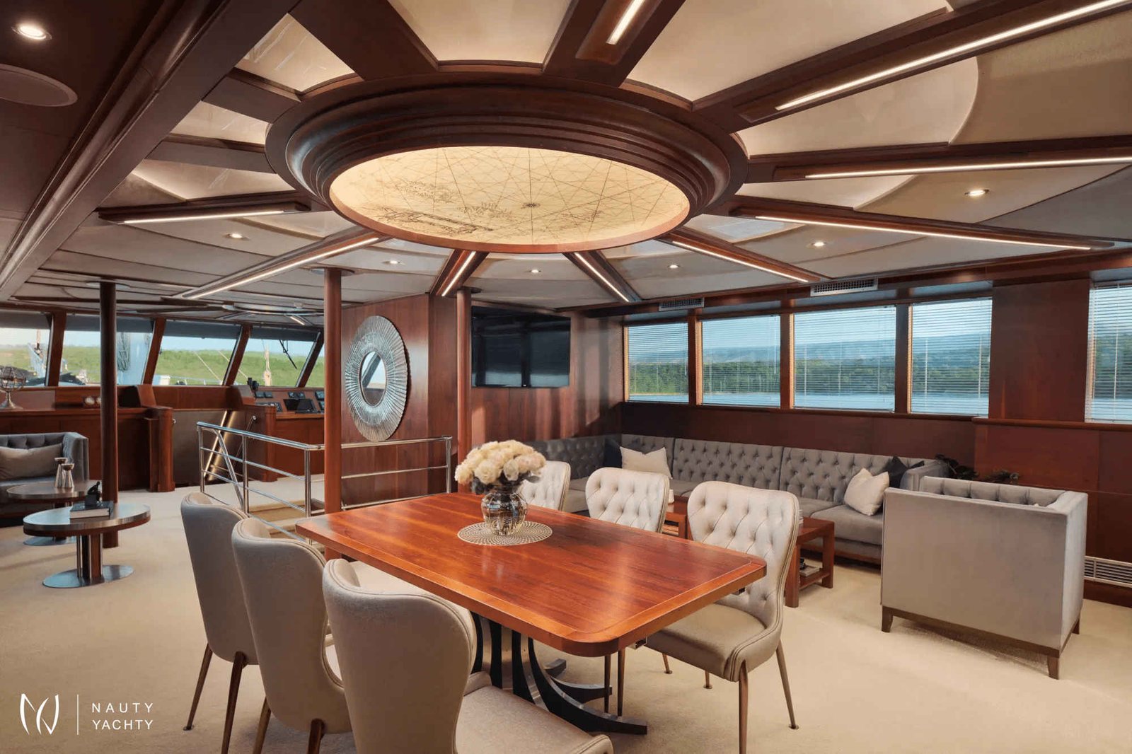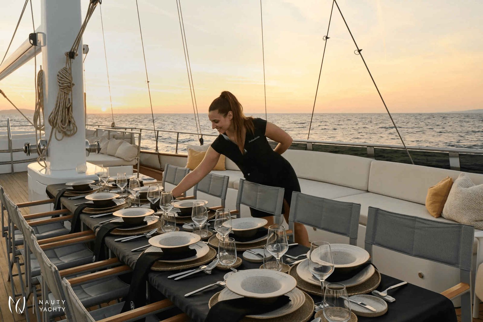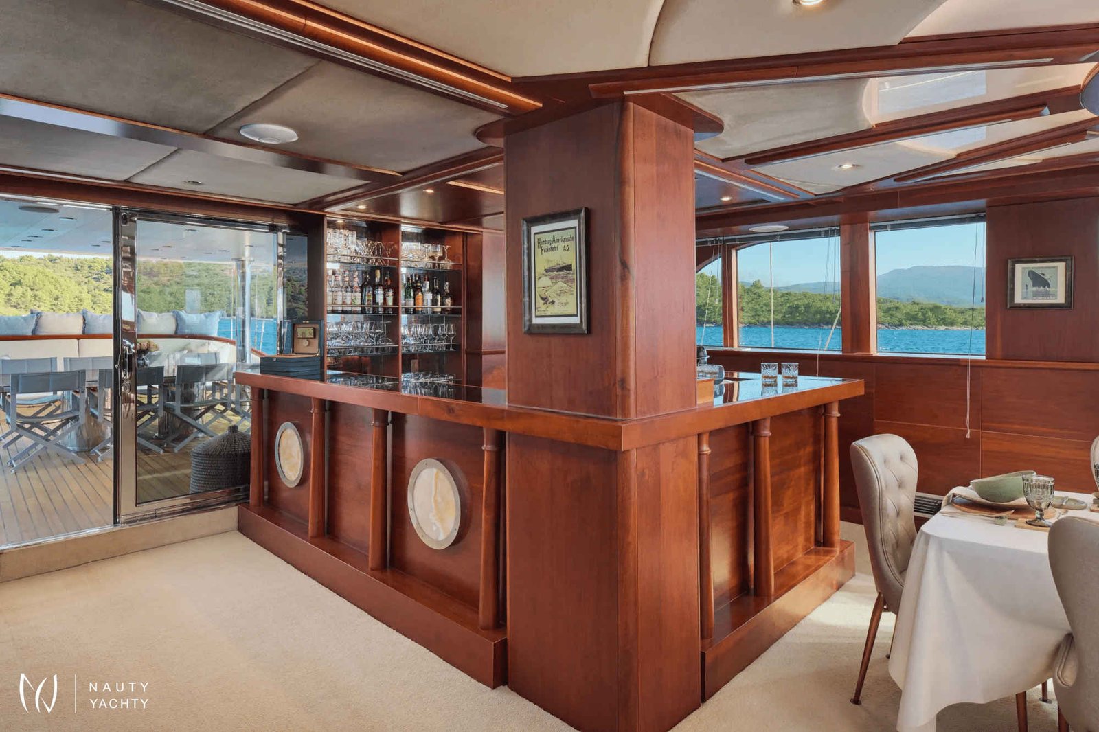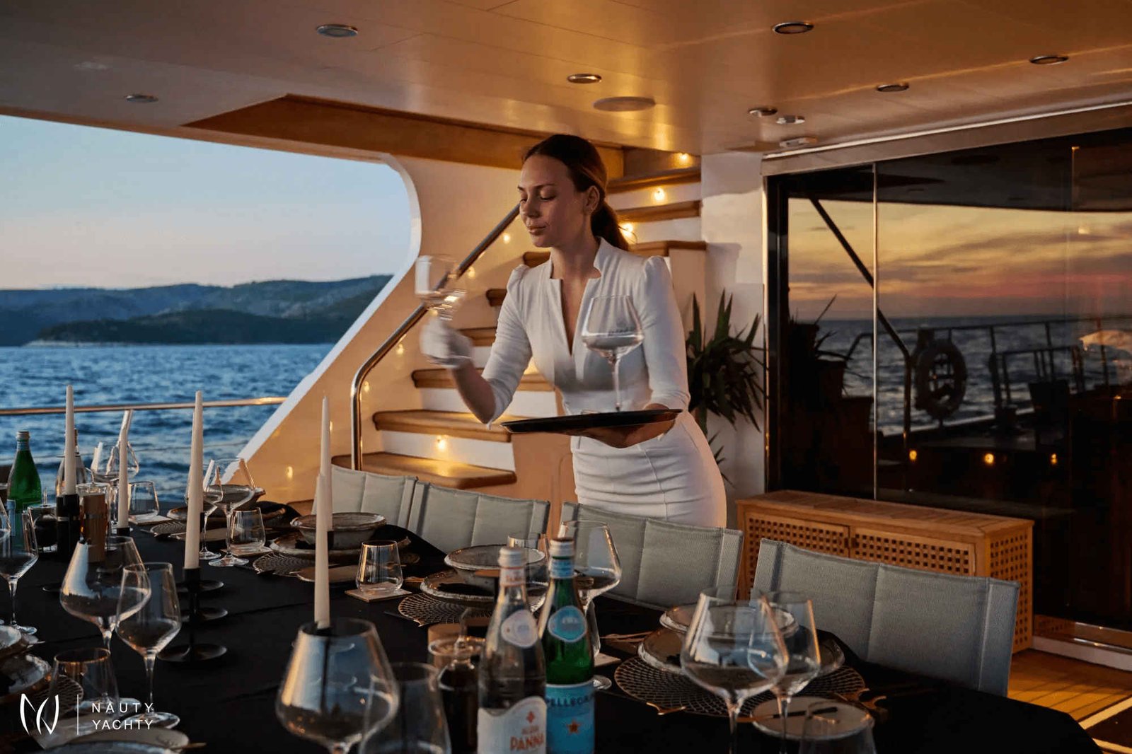 The yacht accommodates up to 12 guests in 6 en-suite cabins, providing a customized and comfortable experience.