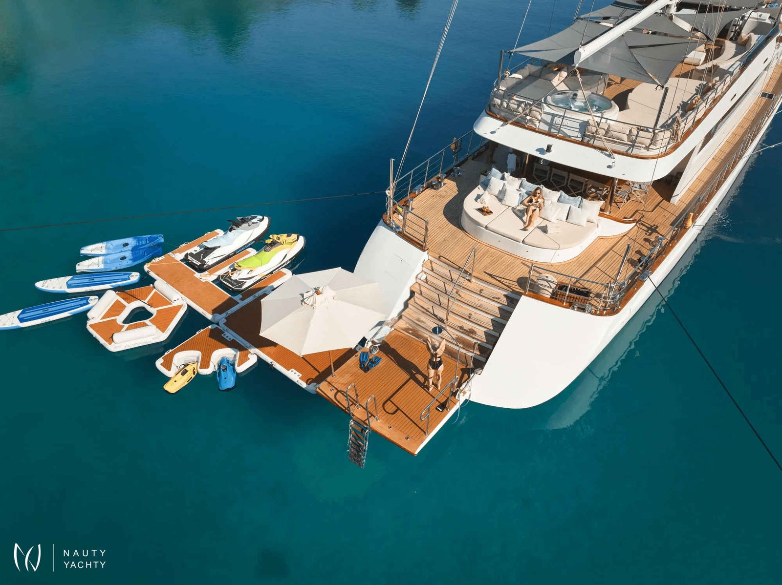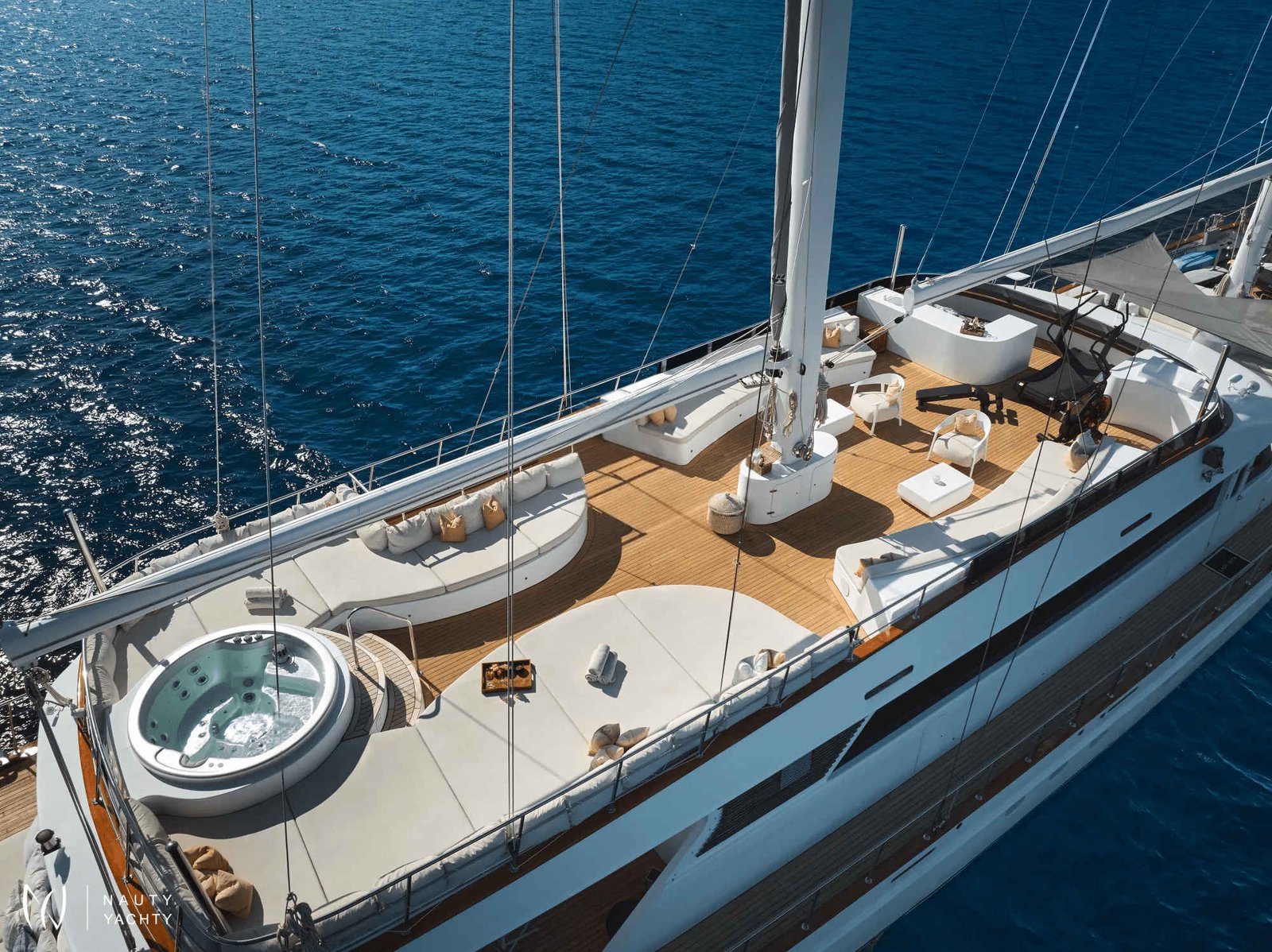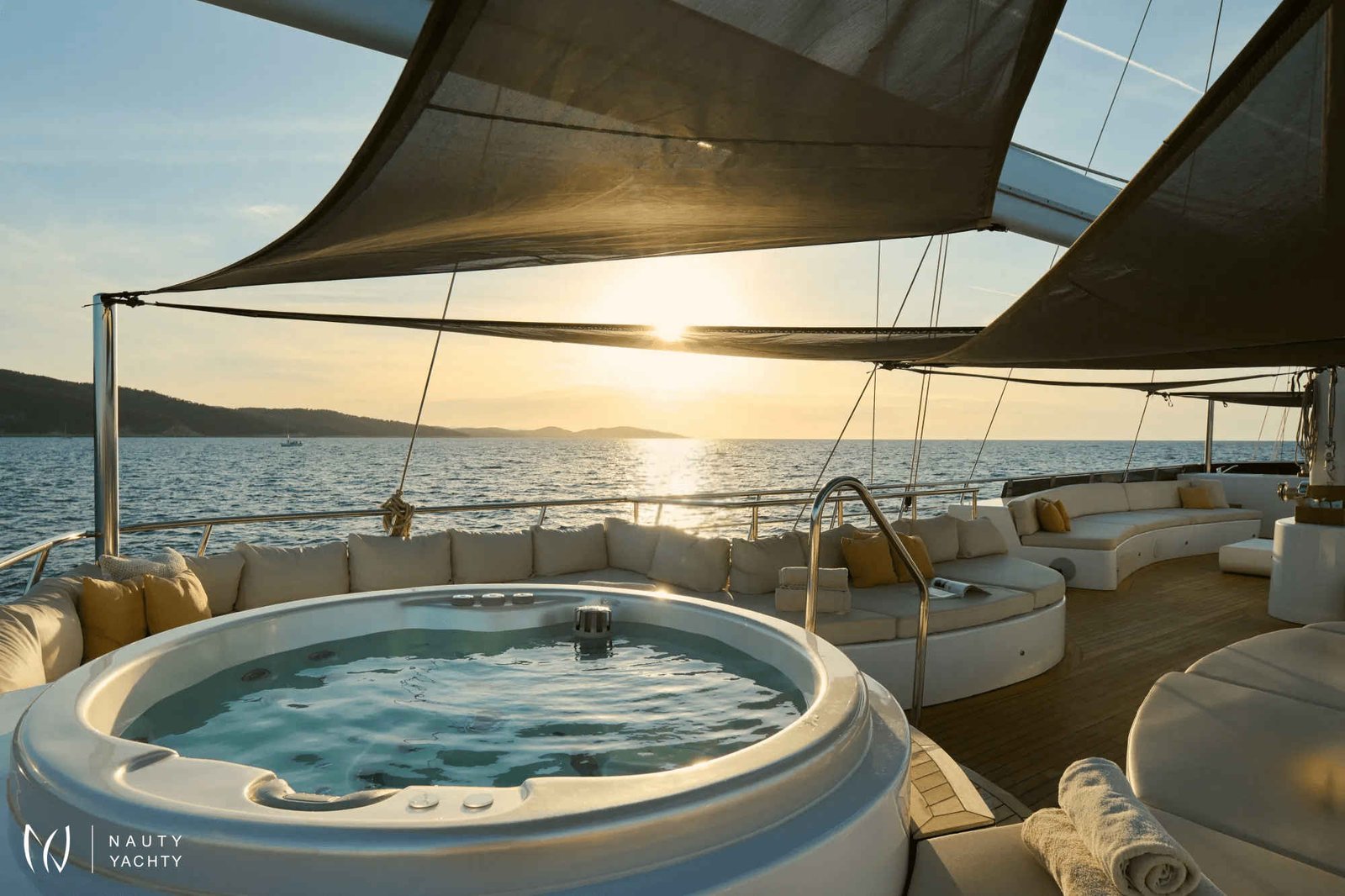 The expansive sundeck features ample lounging areas, a Jacuzzi, and spacious sun pads