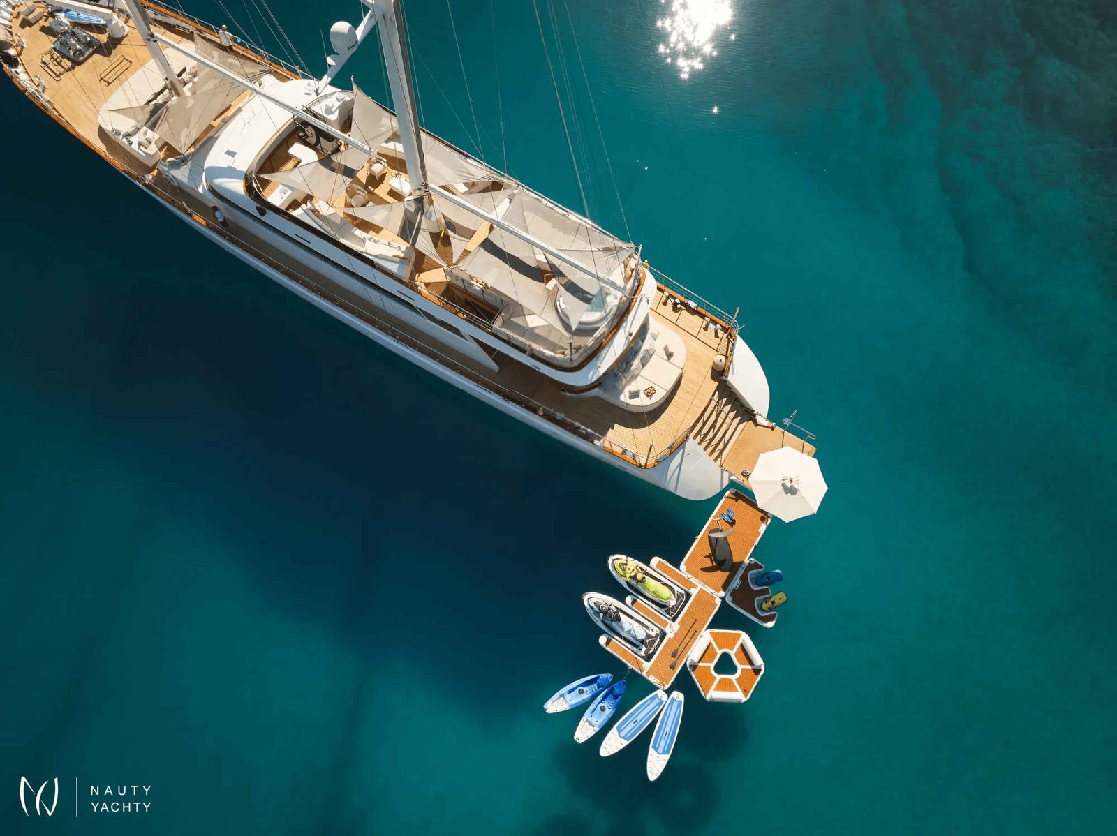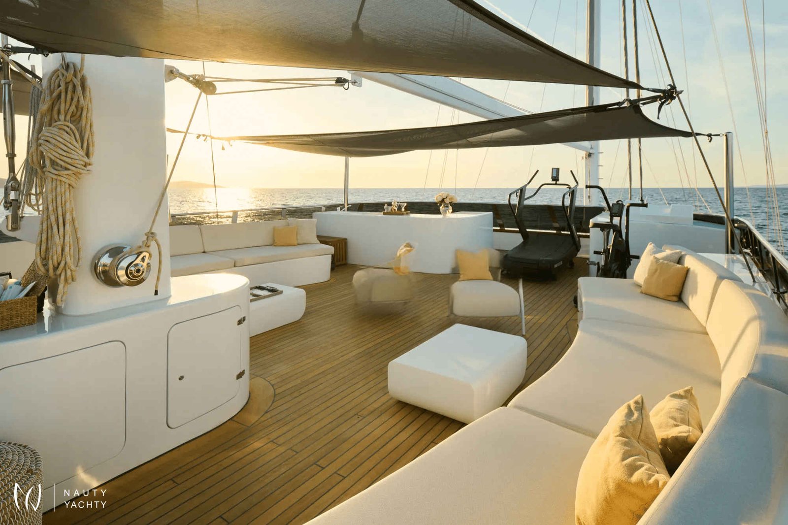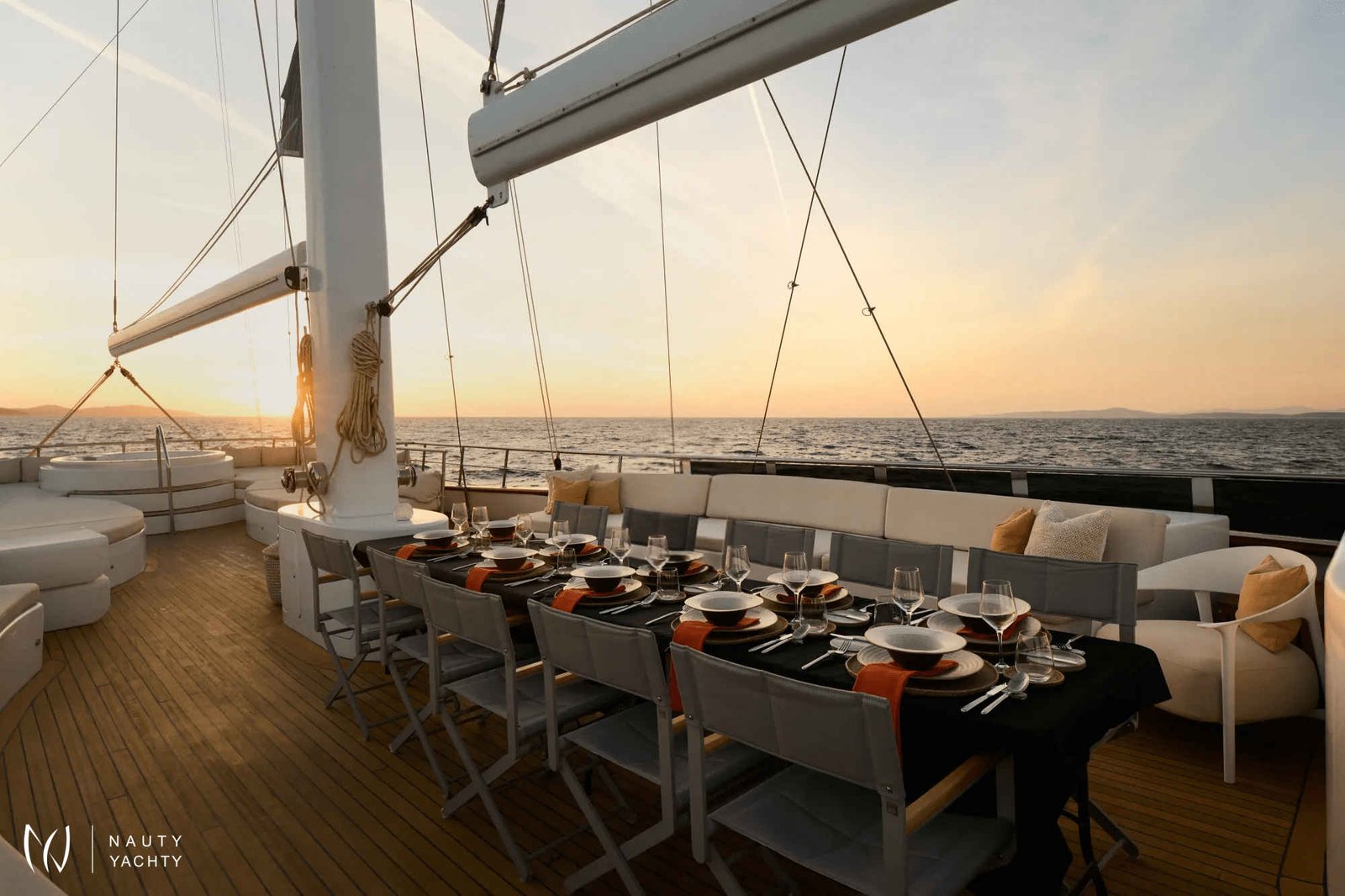 The expansive sundeck features ample lounging areas, a Jacuzzi, and spacious sun pads