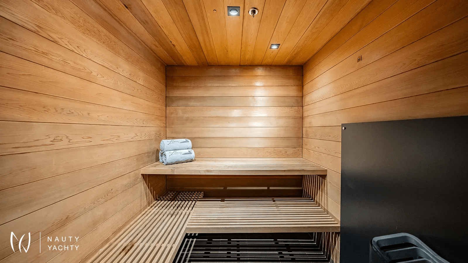 Expansive beach club with sauna, gym, and direct guest cabin acceSS