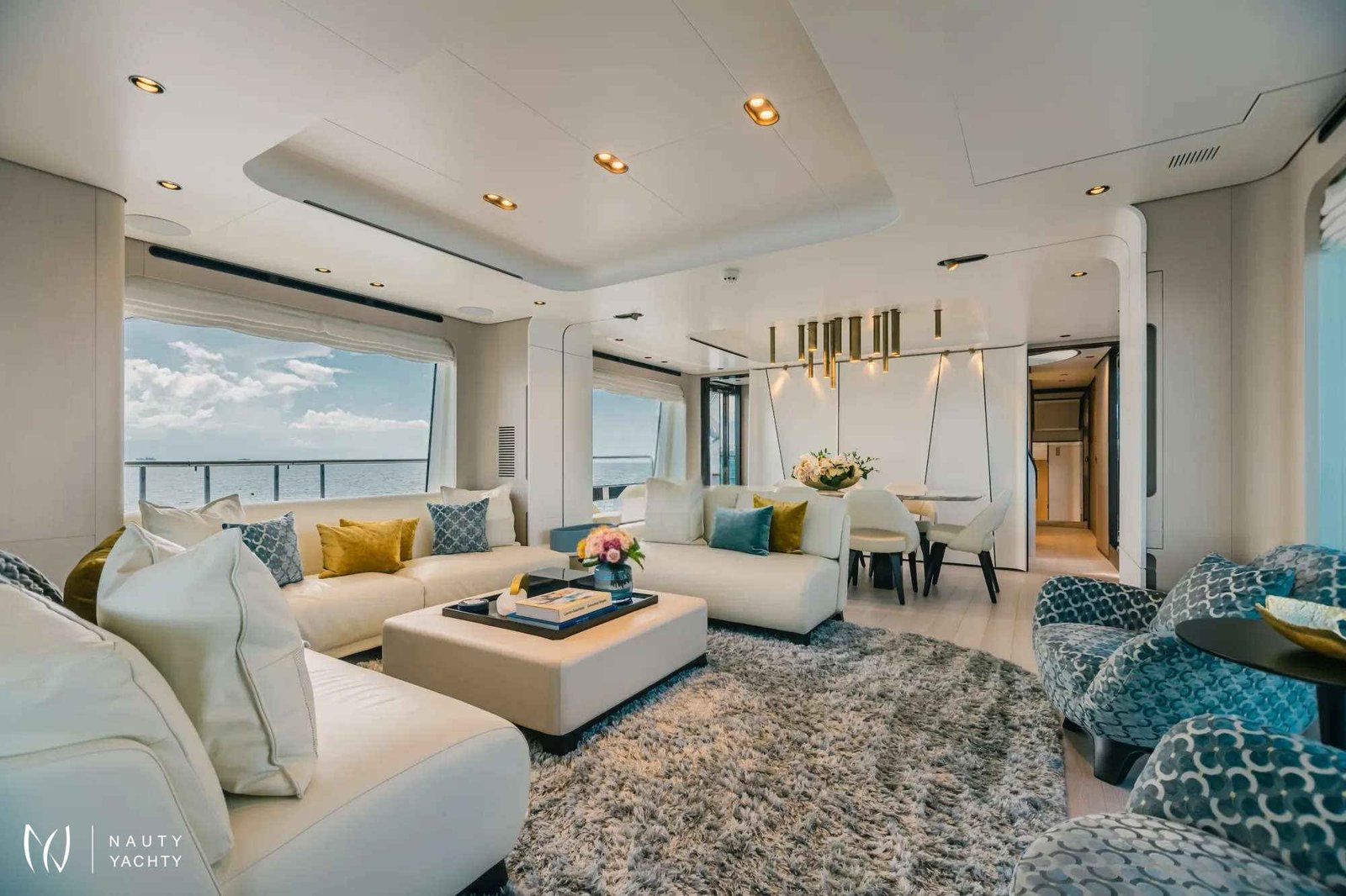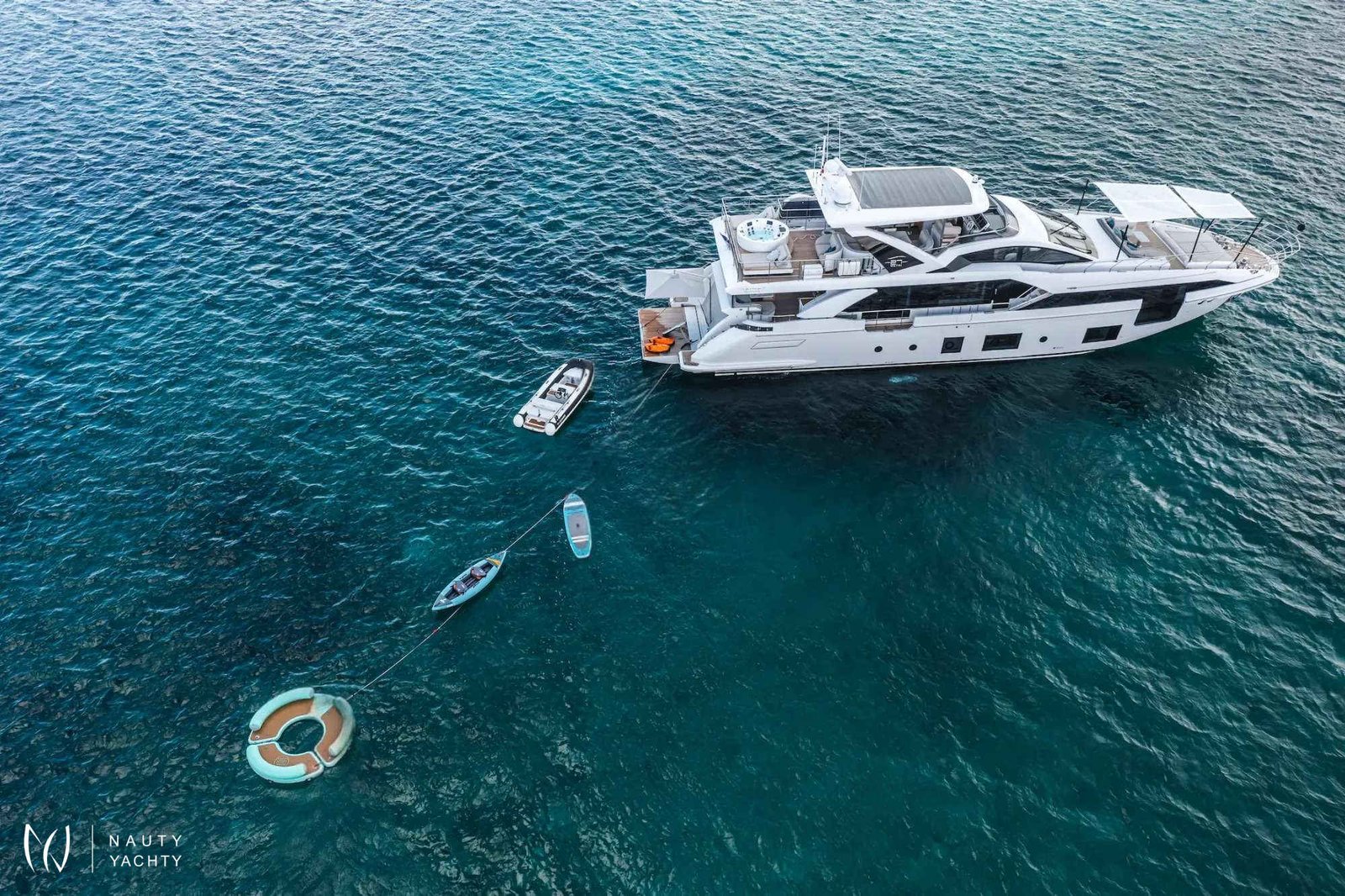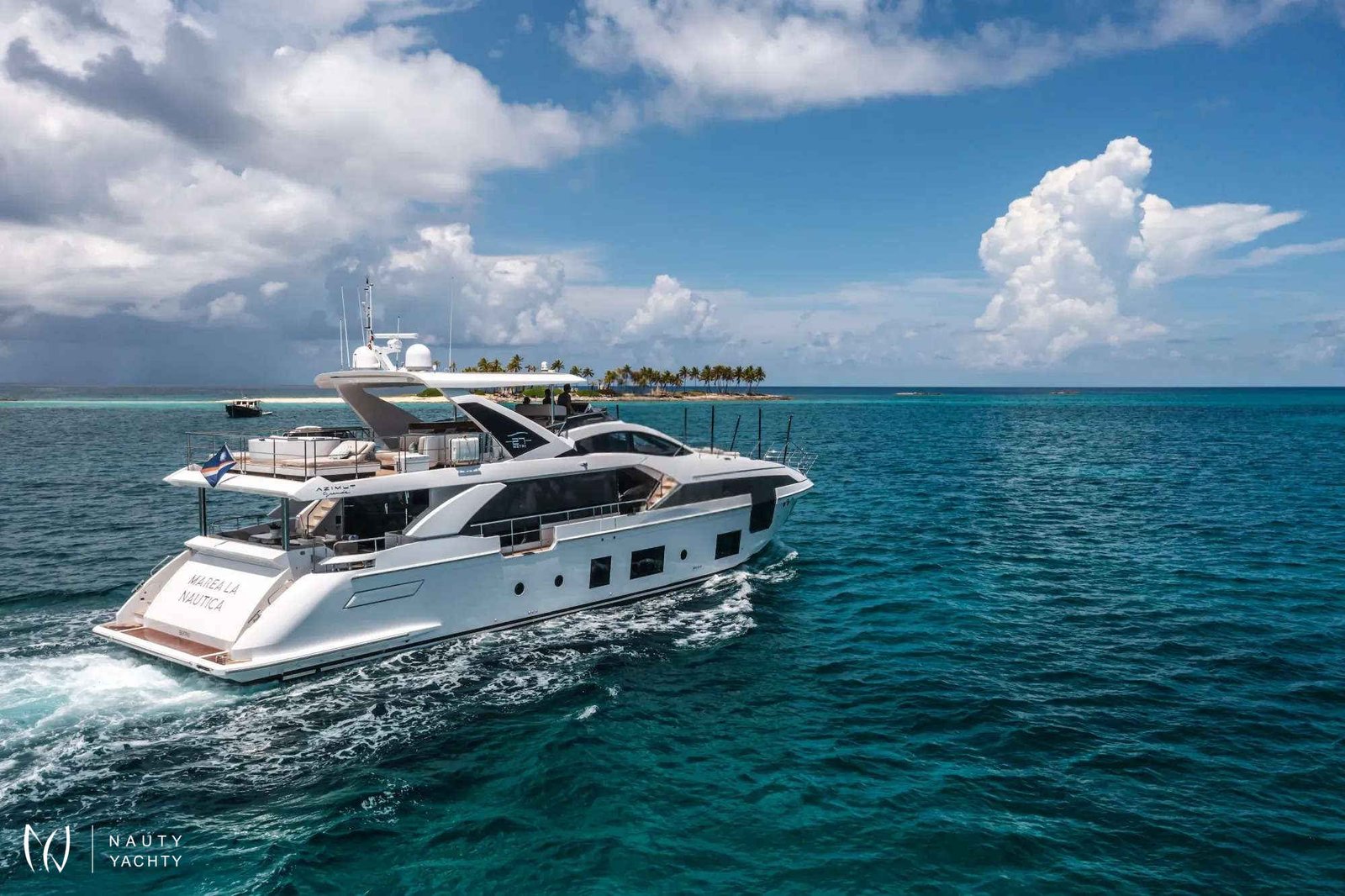 The 88’ (27m) Azimut MAREA LA NAUTICA combines impressive interior volume and stunning exterior deck spaces to create a charter yacht that exceeds the expectations of every guest onboard. The Azimut Grande 27 Metri has been designed and built to the highest standards in yachting, utilizing carbon fiber construction to allow volume and surfaces to be increased in size while maintaining the same weight and stability.The light and airy design of the charter yacht flows seamlessly between the main salon and the dining area, making the space a welcoming locale for friends and family. The floor-to-ceiling windows on both sides welcome an influx of natural light and front-row views of the passing landscapes. Her generous main salon has direct access to the aft deck, offering the ultimate indoor/outdoor flexibility. Guests will enjoy spending their nights on the sofas after long days of fun in the sun. Achille Salvagni penned MAREA LA NAUTICA’s sleek, distinctive interior with custom-made furniture and décor.MAREA LA NAUTICA welcomes up to 10 guests in five beautifully-appointed staterooms. The split-level main-deck master suite is full beam with a king-size bed, generous closet space and floor-to-ceiling windows to allow guests to feel one with the sea. The charter yacht’s versatile layout comprises two VIP cabins with queen-size beds, a twin cabin and a custom cabin with two twin beds that can be converted to an oversized king, perfect for children or couples. MAREA LA NAUTICA’s professional and experienced crew of four ensures each guest’s every need is taken care of during their charter.Her impressive main deck aft can be considered a large terrace, welcoming guests to dine alfresco at the ten-person dining table and hang out together. The curated pastel color palette used throughout the exterior evokes a sense of calmness. MAREA LA NAUTICA’s flybridge showcases a huge dining table and a beautiful bar area. Guests will enjoy sipping on their favorite craft cocktail under the retractable shade. The aft area can be arranged as an outdoor living area or used as a sunbathing space. Guests can unwind in the Jacuzzi surrounded by beautiful ocean views. The charter yacht’s foredeck lounge is another space dedicated to relaxation and is the best seat in the house for appreciating the breathtaking sunsets.