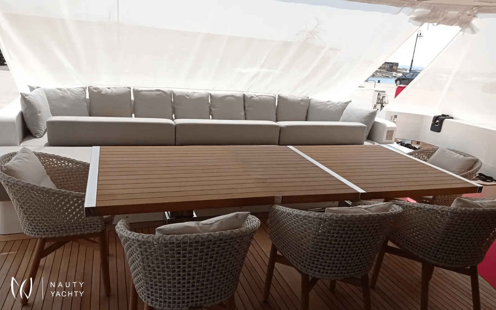 Extensive exterior deck space with three separate sun-lounging areas, and well-protected bar and dining facilities