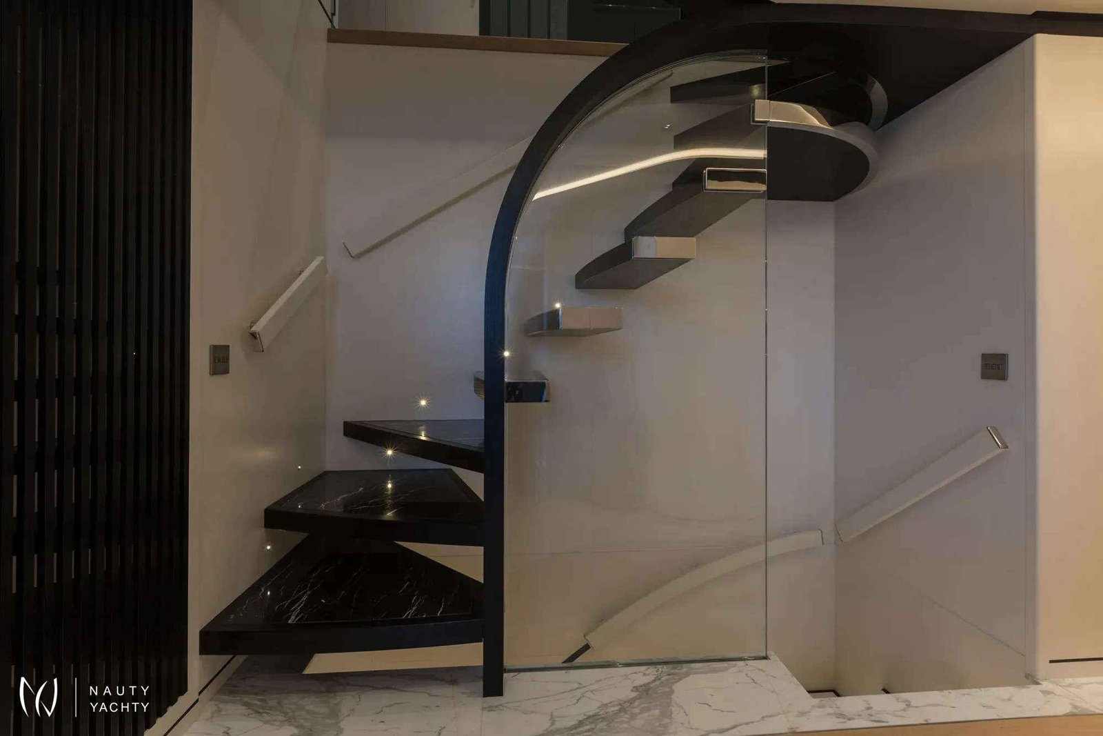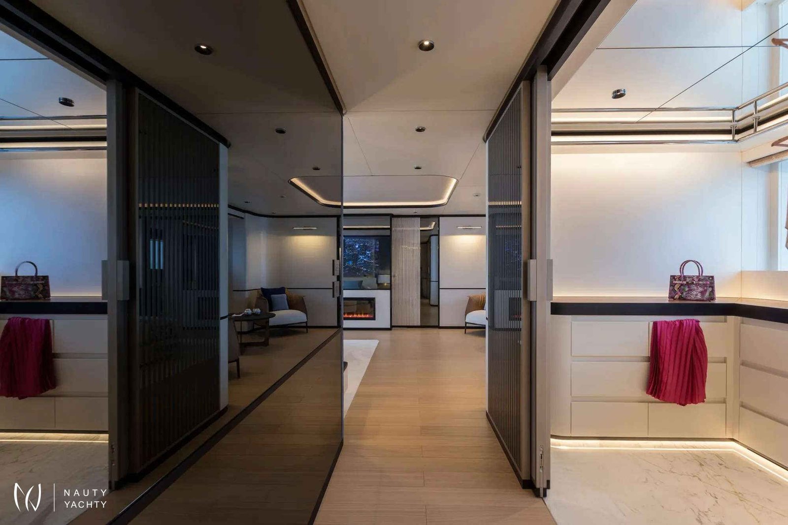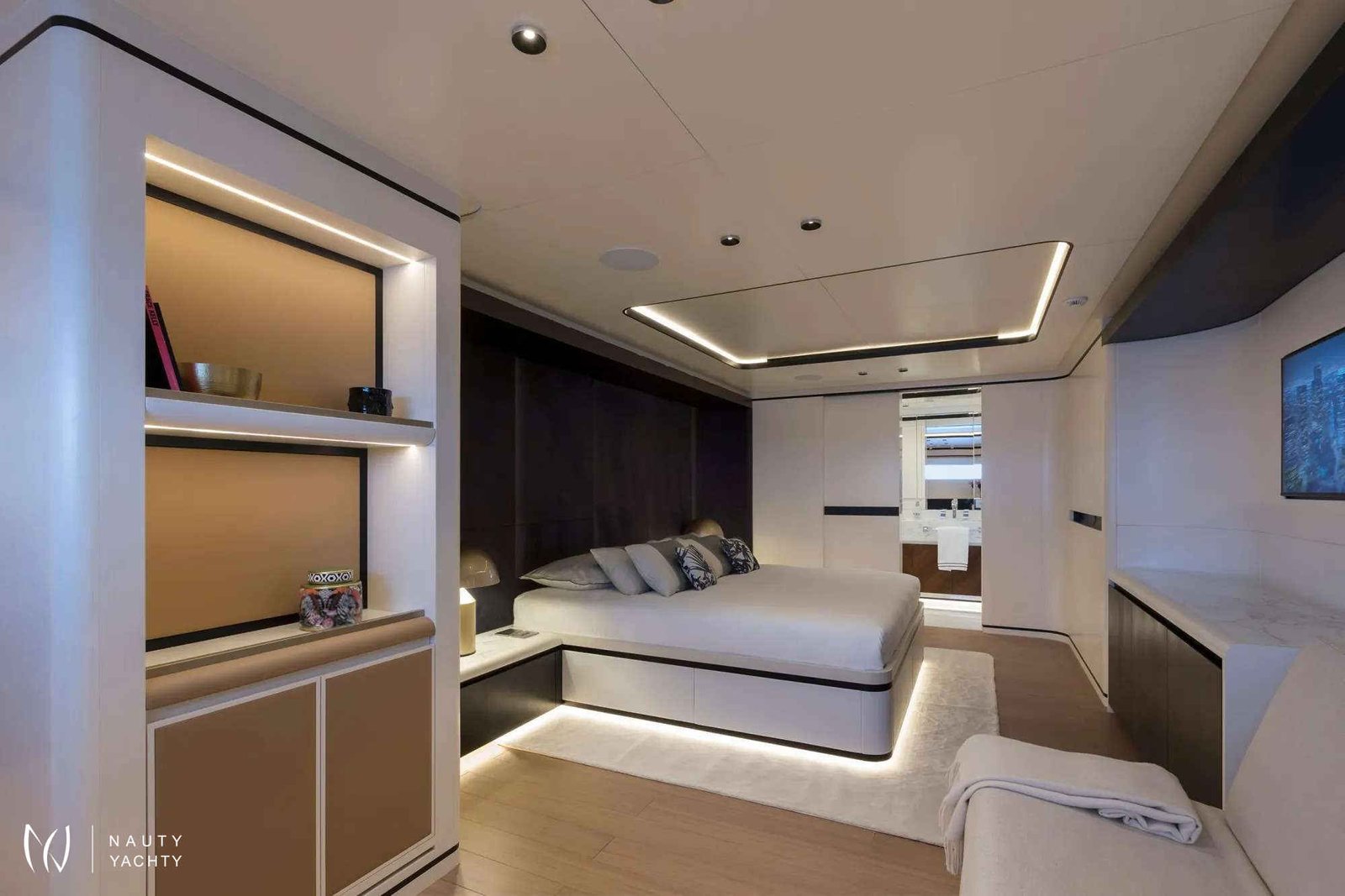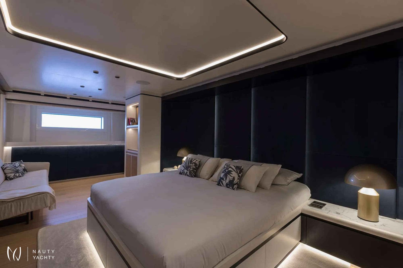 Primary stateroom with private, automated balcony located on the main deck