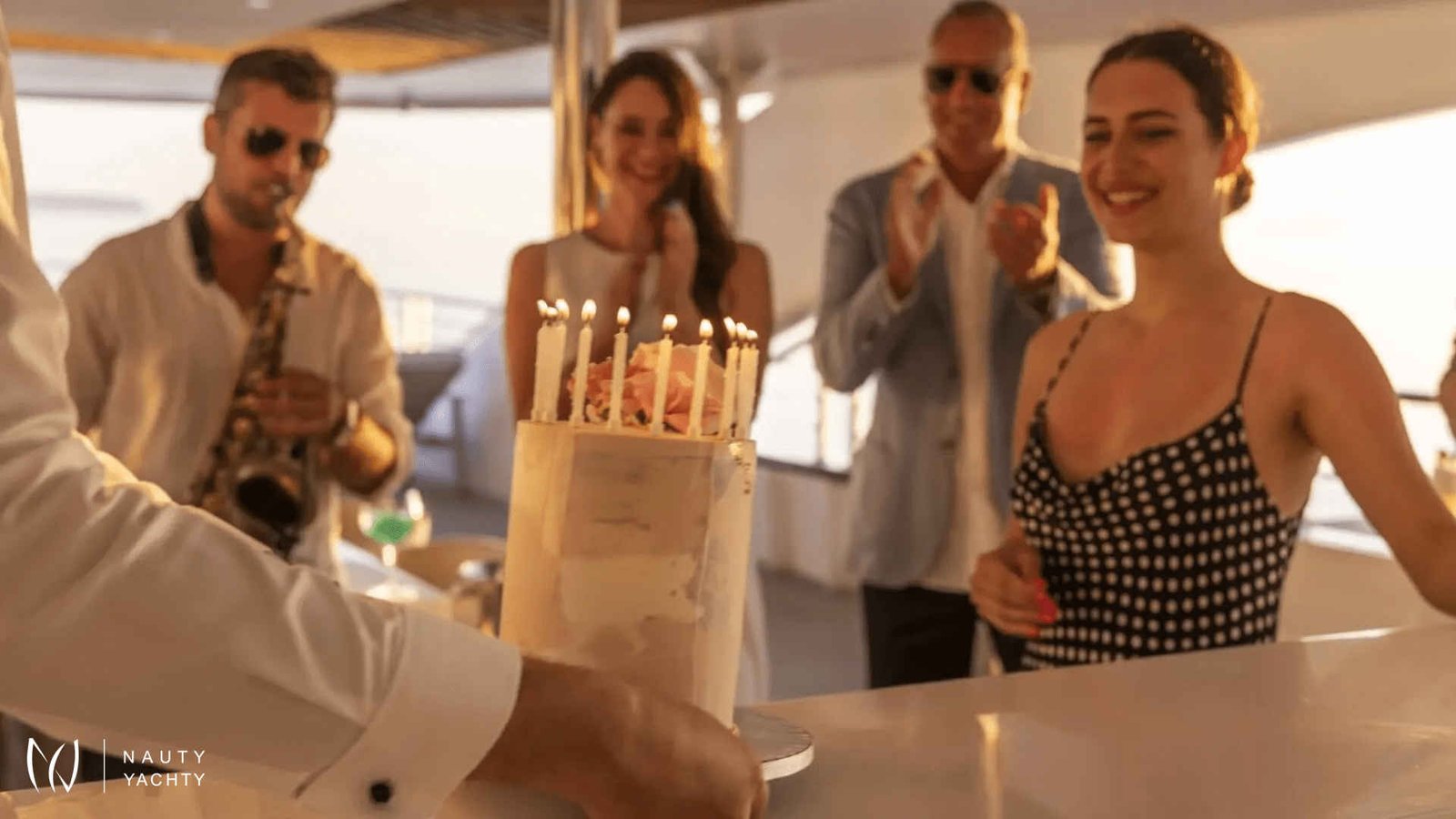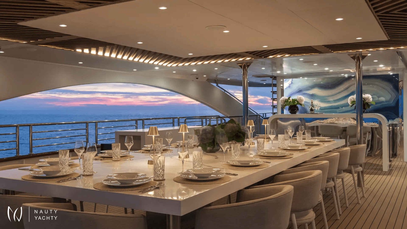 There is a big dining table on the sun deck for 20 guests.