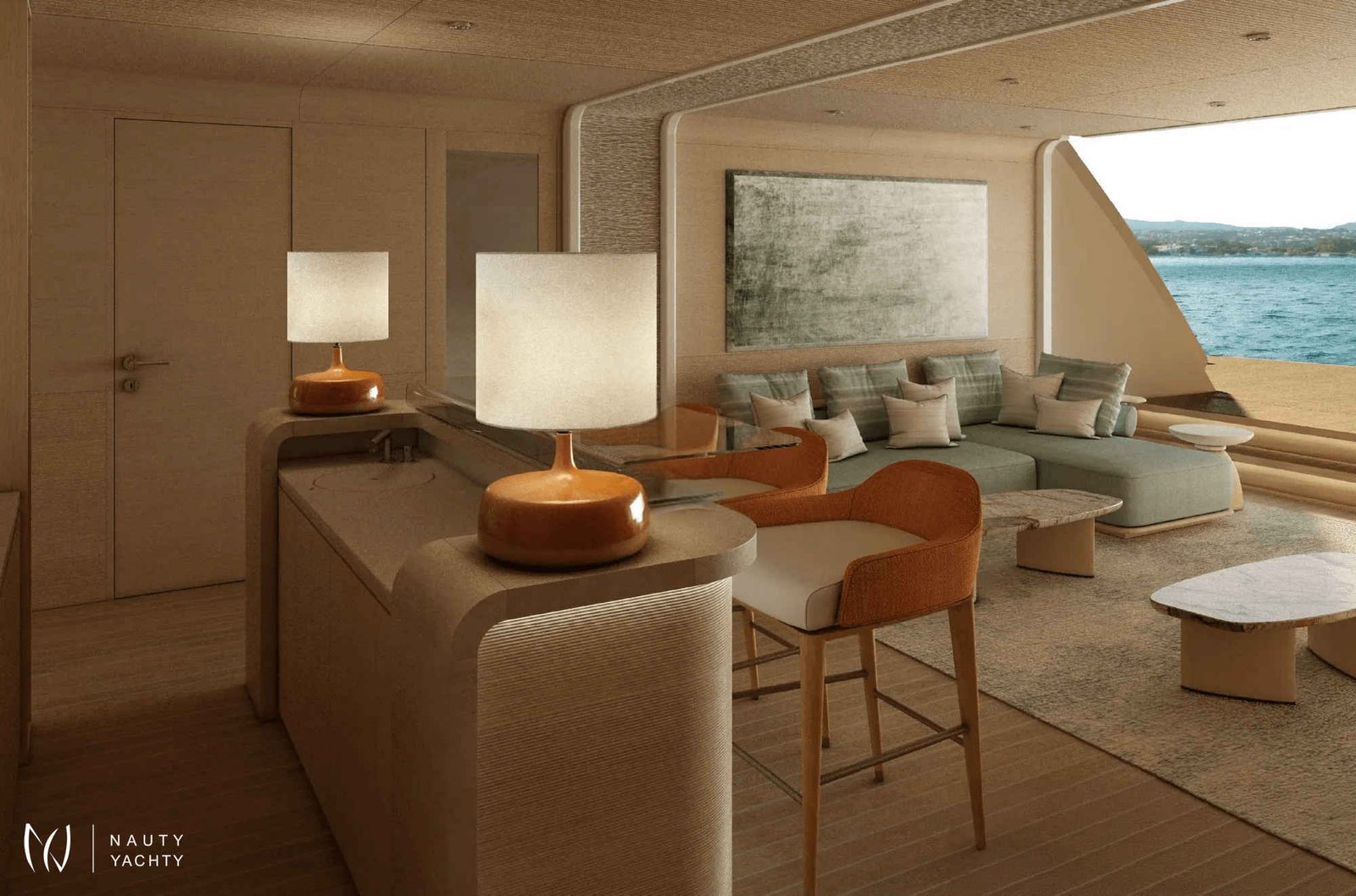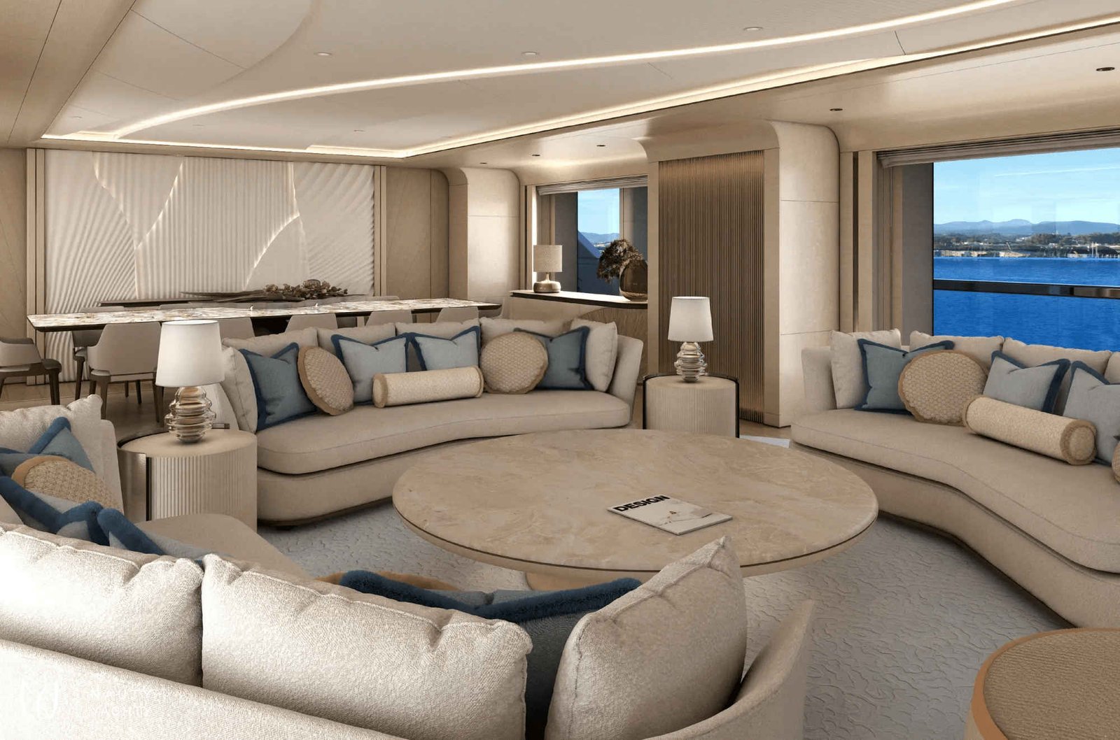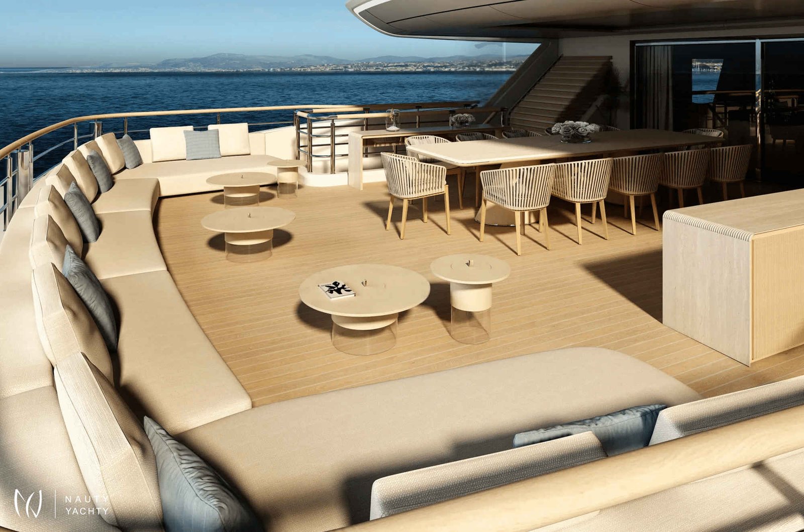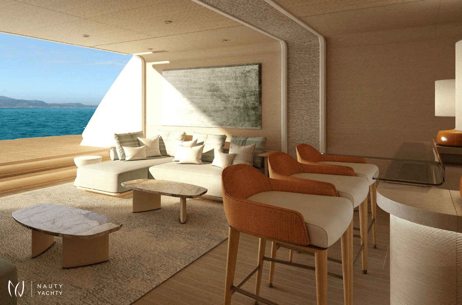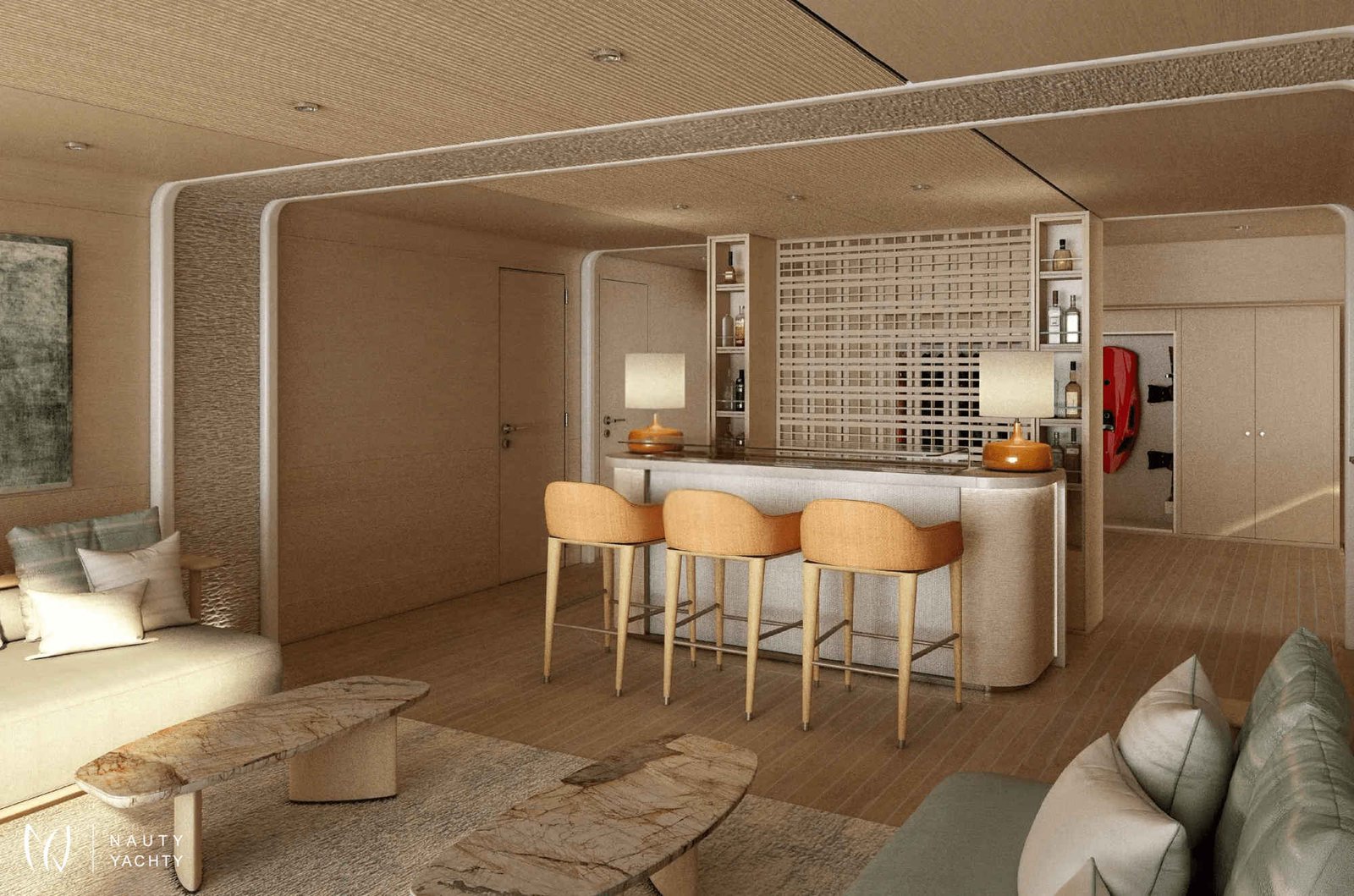 With 7 opulent staterooms, the interiors blend Nordic and Mediterranean influences, incorporating light oak, bright tones, and soft, sculptural custom furniture that maintain a relaxing, domestic feel