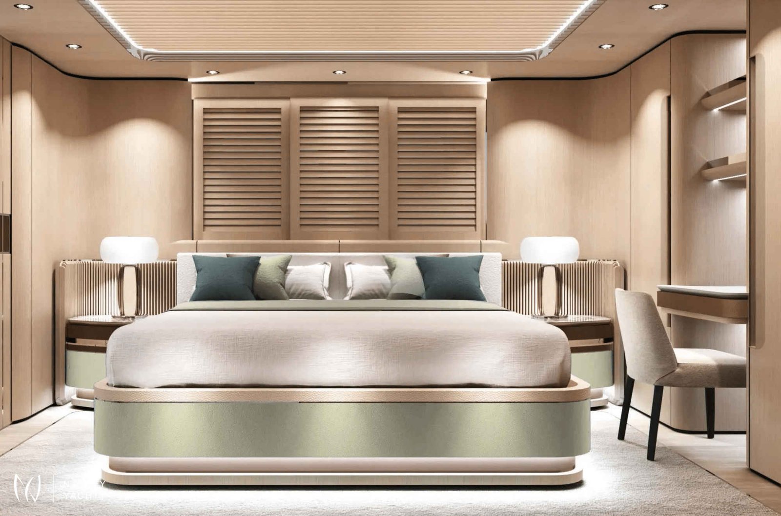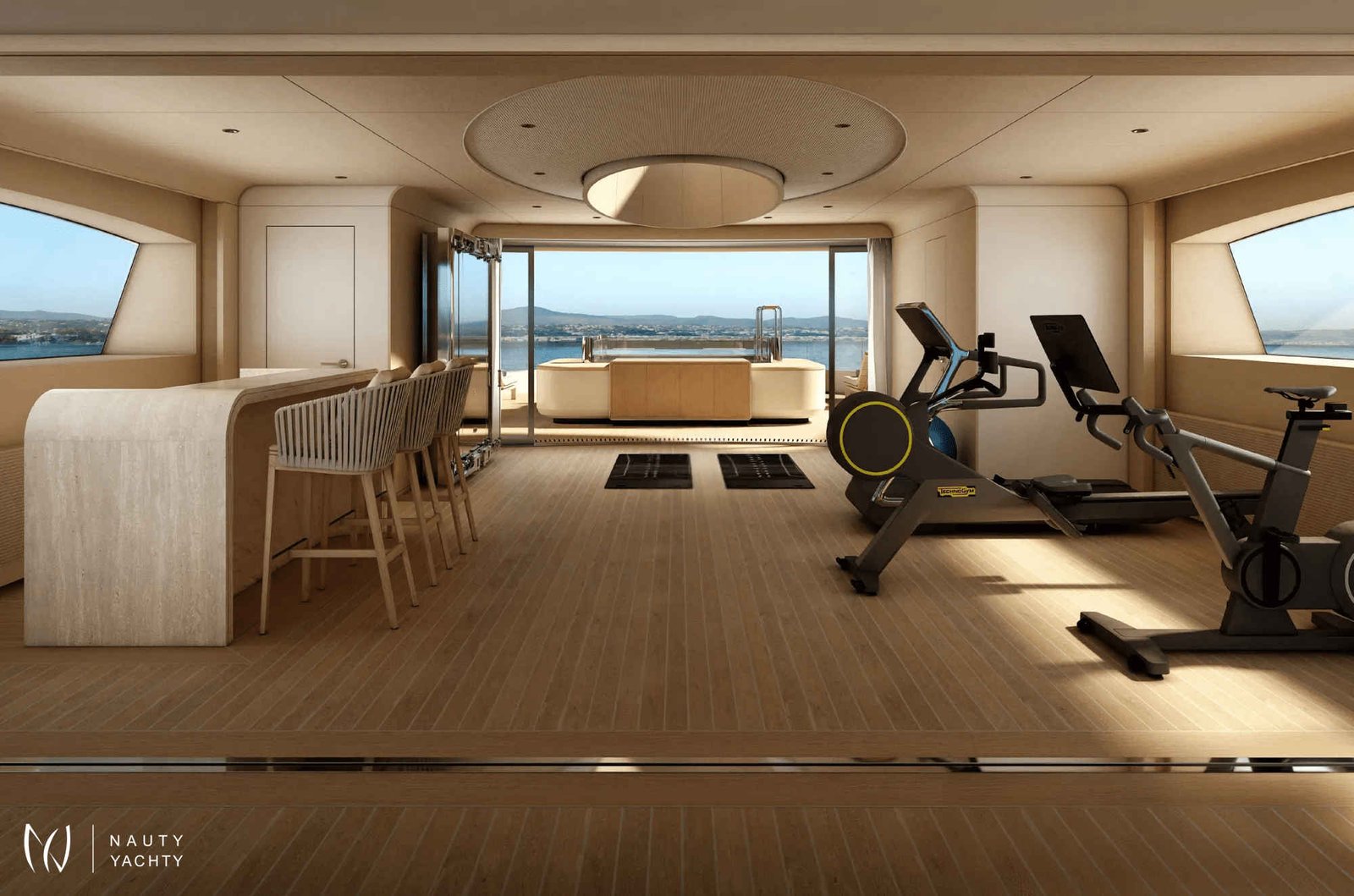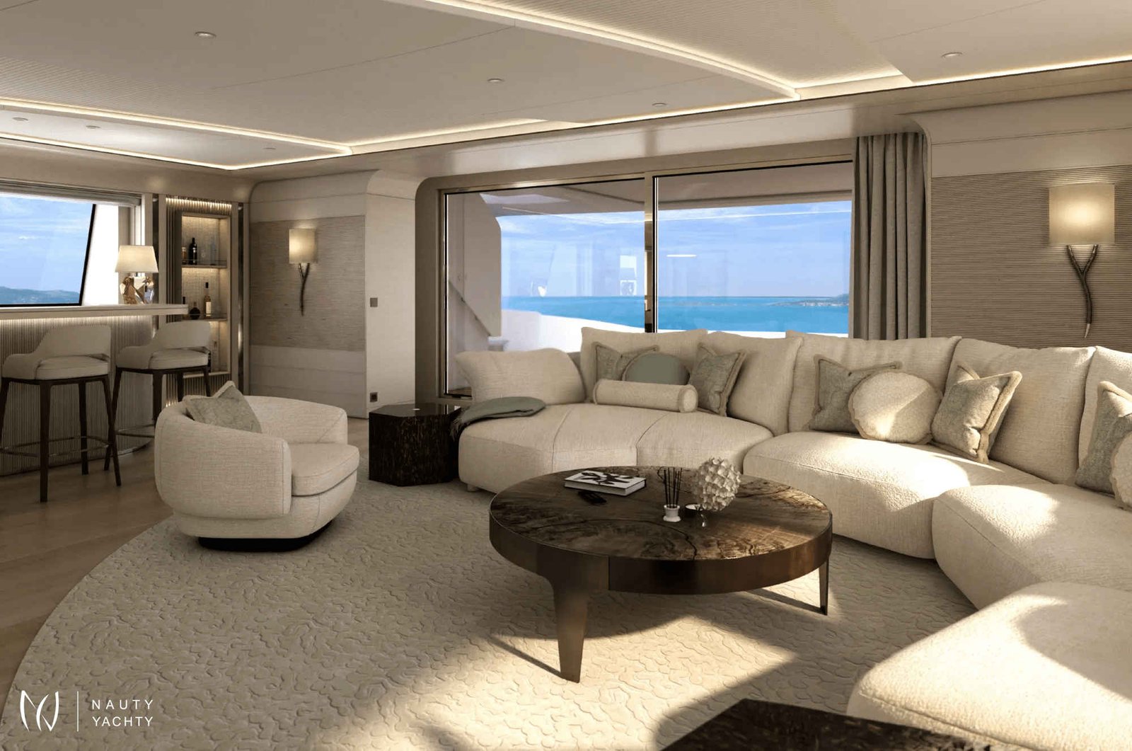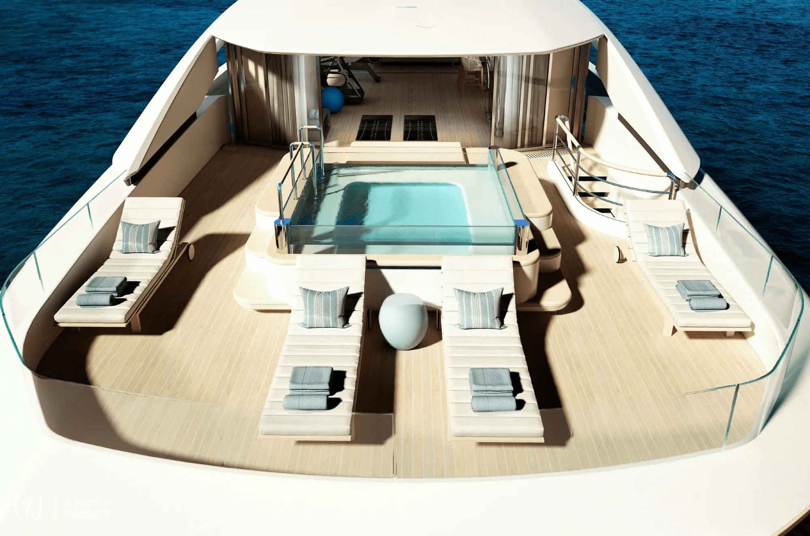 With 7 opulent staterooms, the interiors blend Nordic and Mediterranean influences, incorporating light oak, bright tones, and soft, sculptural custom furniture that maintain a relaxing, domestic feel