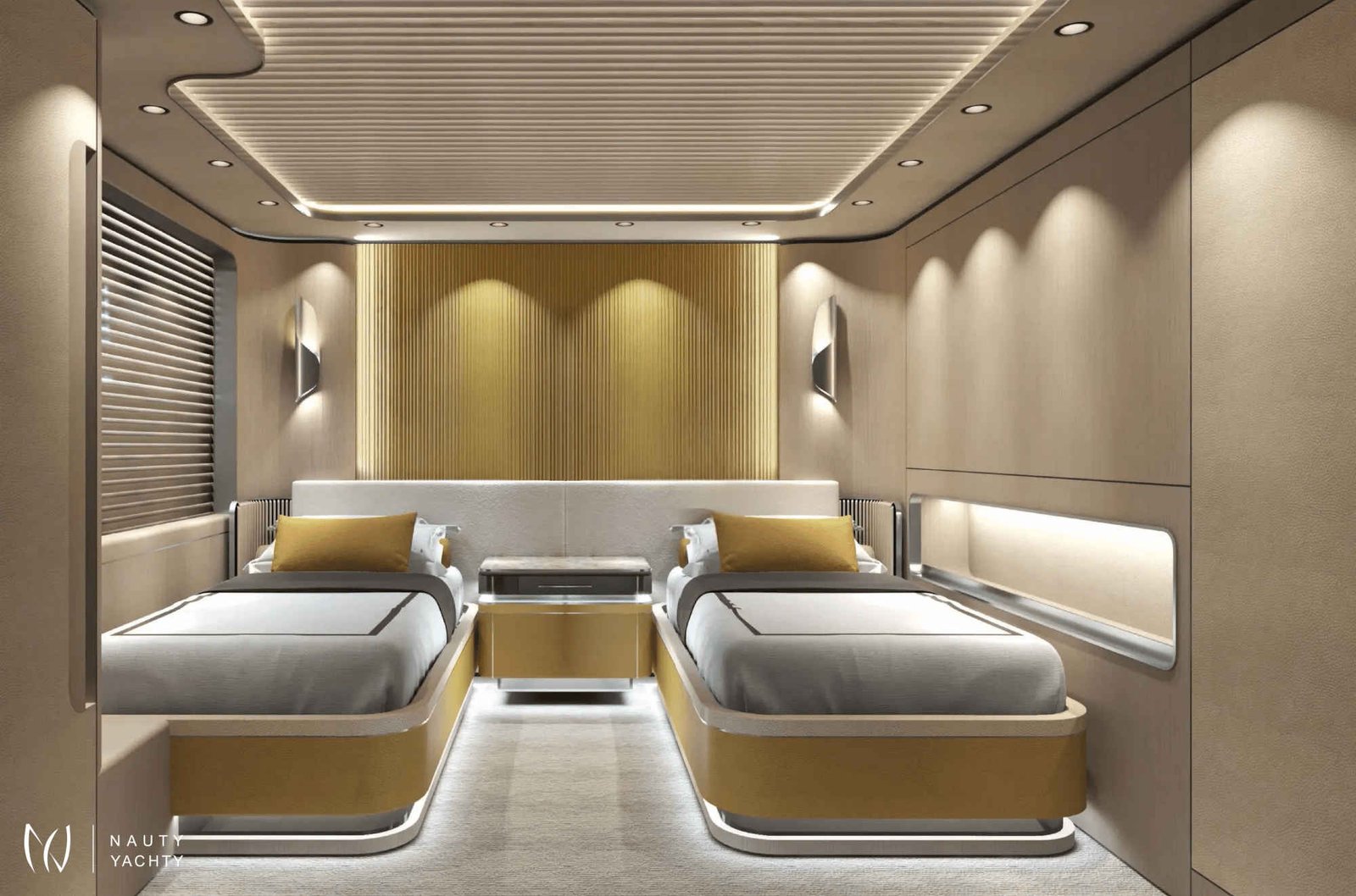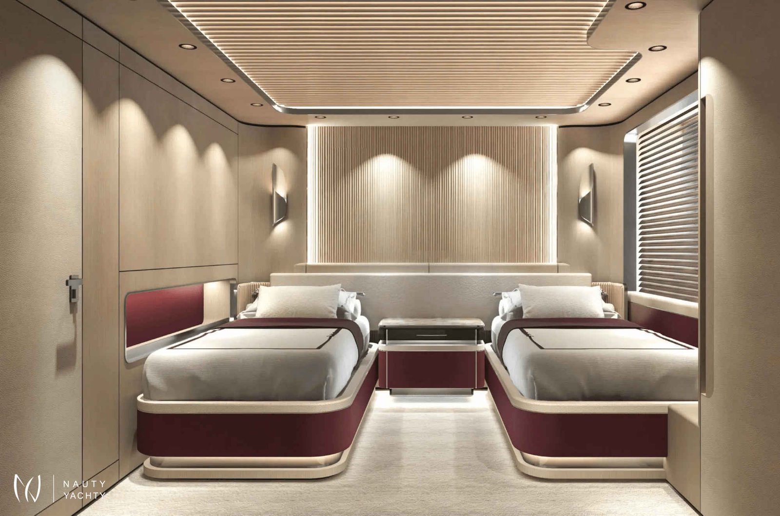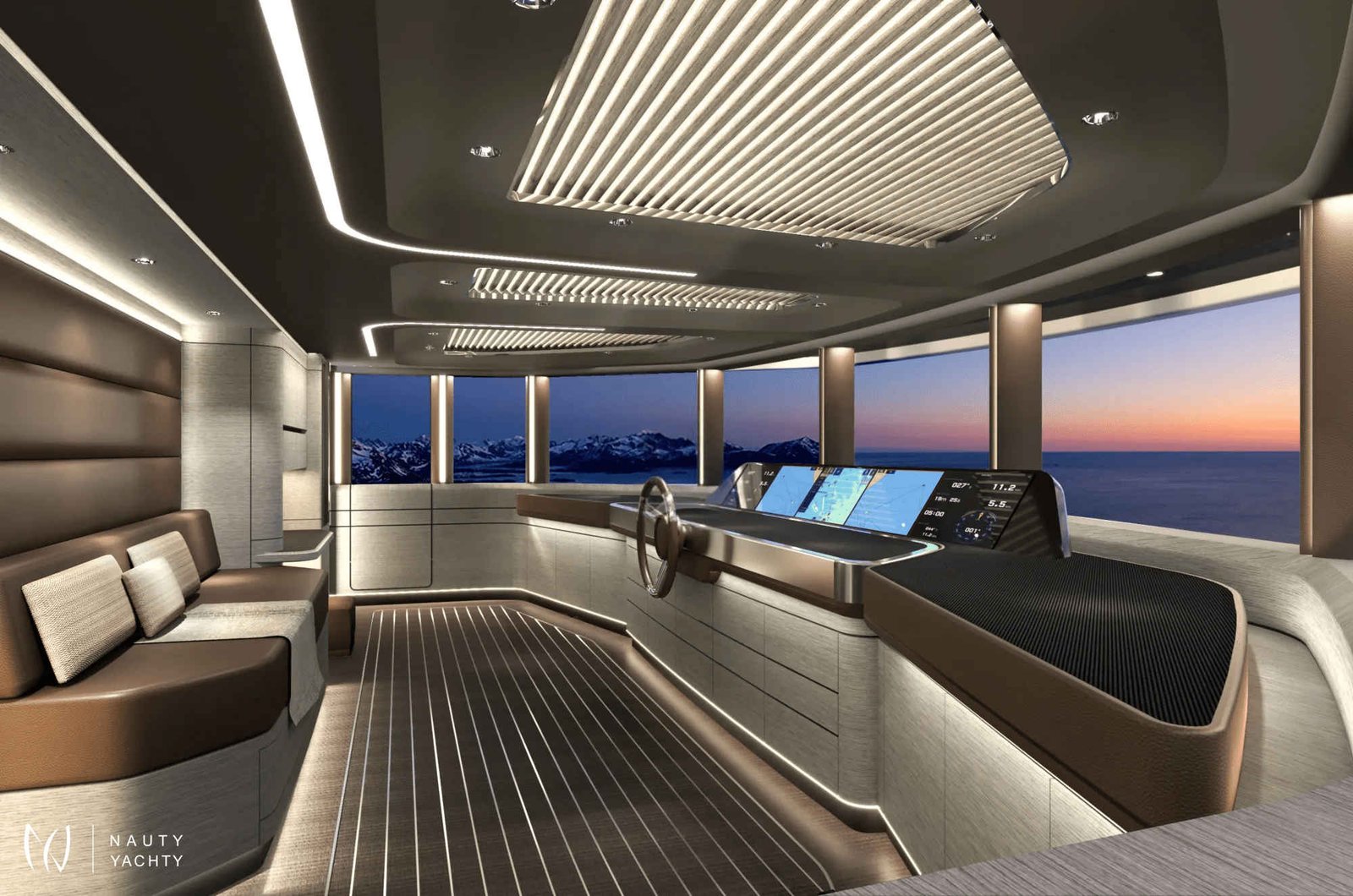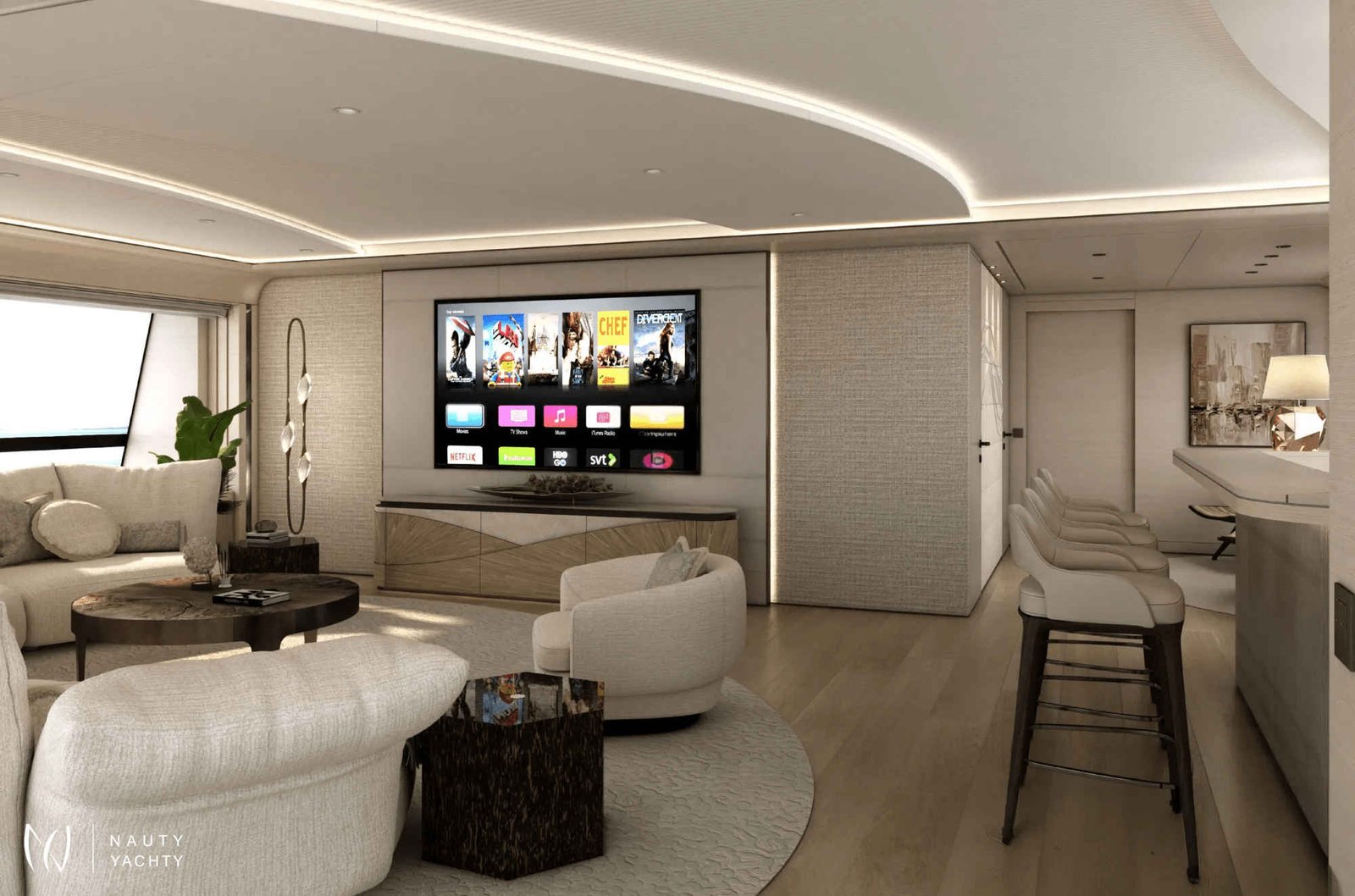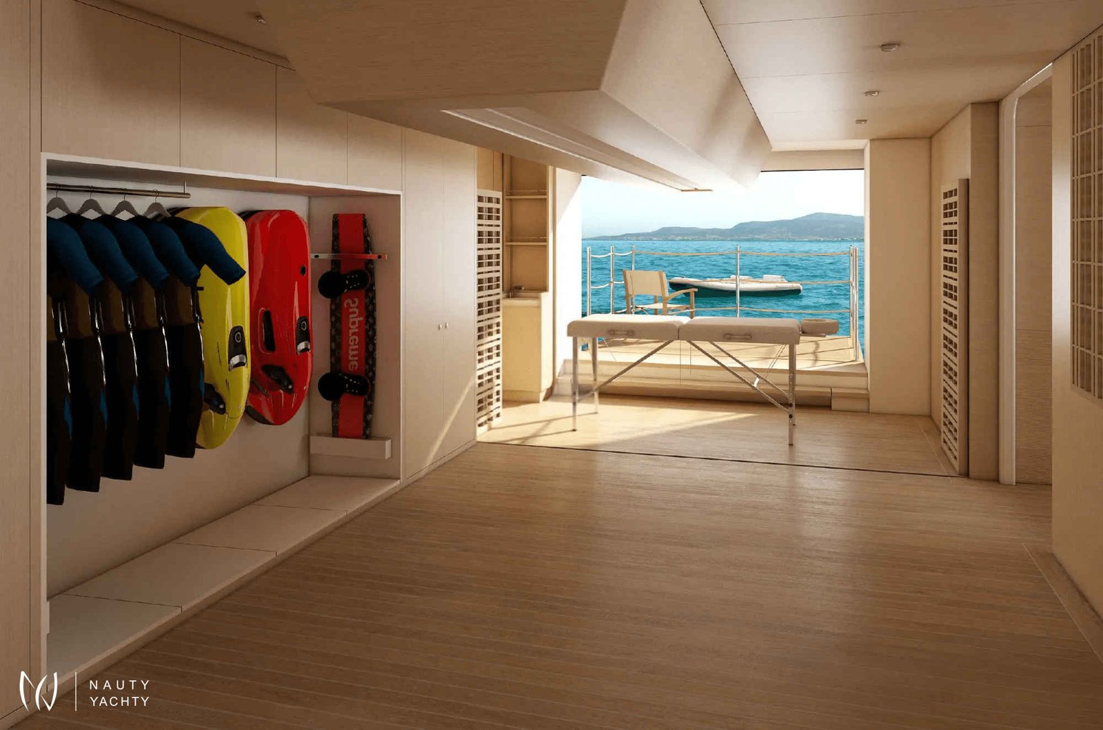 With 7 opulent staterooms, the interiors blend Nordic and Mediterranean influences, incorporating light oak, bright tones, and soft, sculptural custom furniture that maintain a relaxing, domestic feel