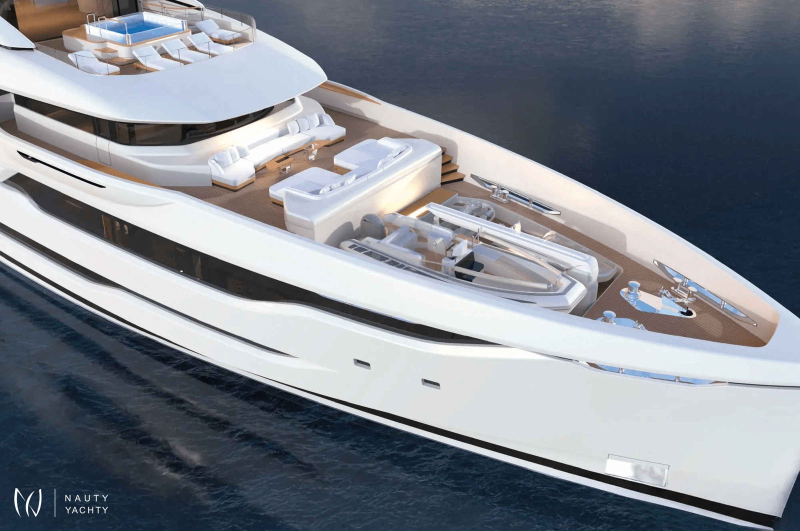 The foredeck accommodates two tenders (7m and 5.6m) and incorporates a telescopic mast for added functionality