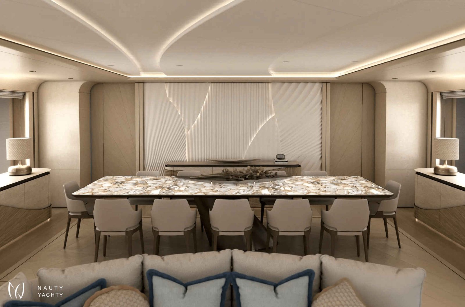 The saloon and dining area are elegantly designed, highlighted by a striking backlit agate dining table. High-end materials such as wood paneling, stingray leather, handwoven rugs, straw panels, and carved marble evoke a strong sense of authenticity and craftsmanship