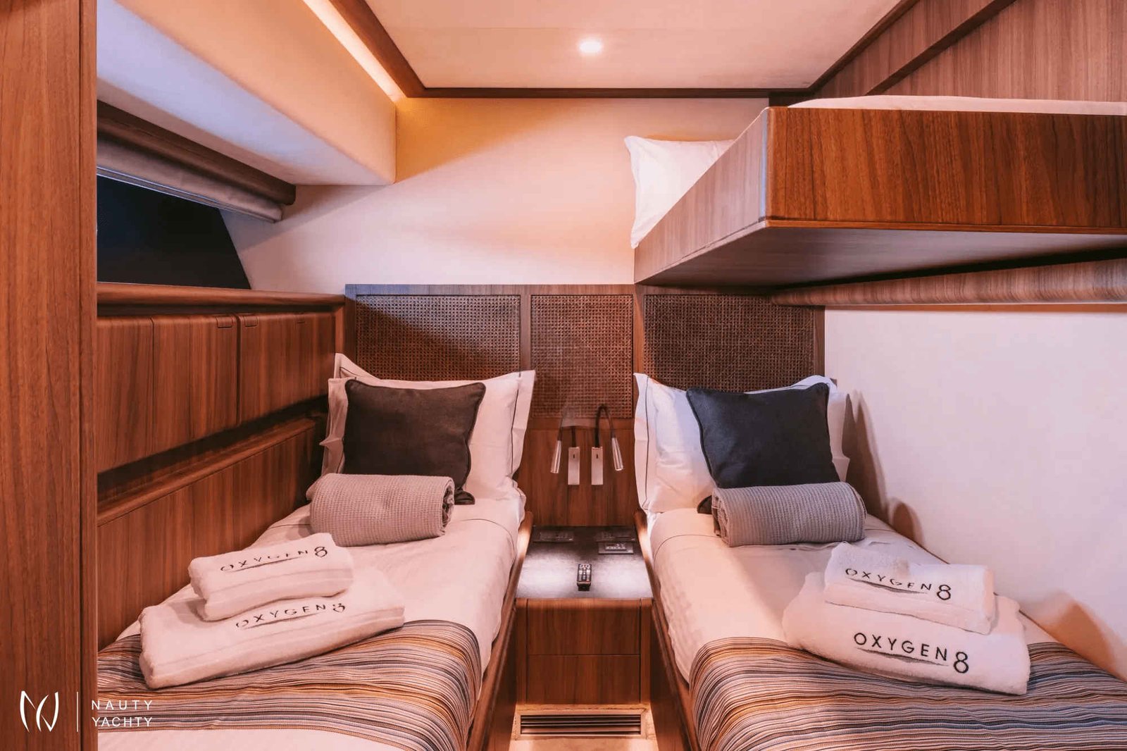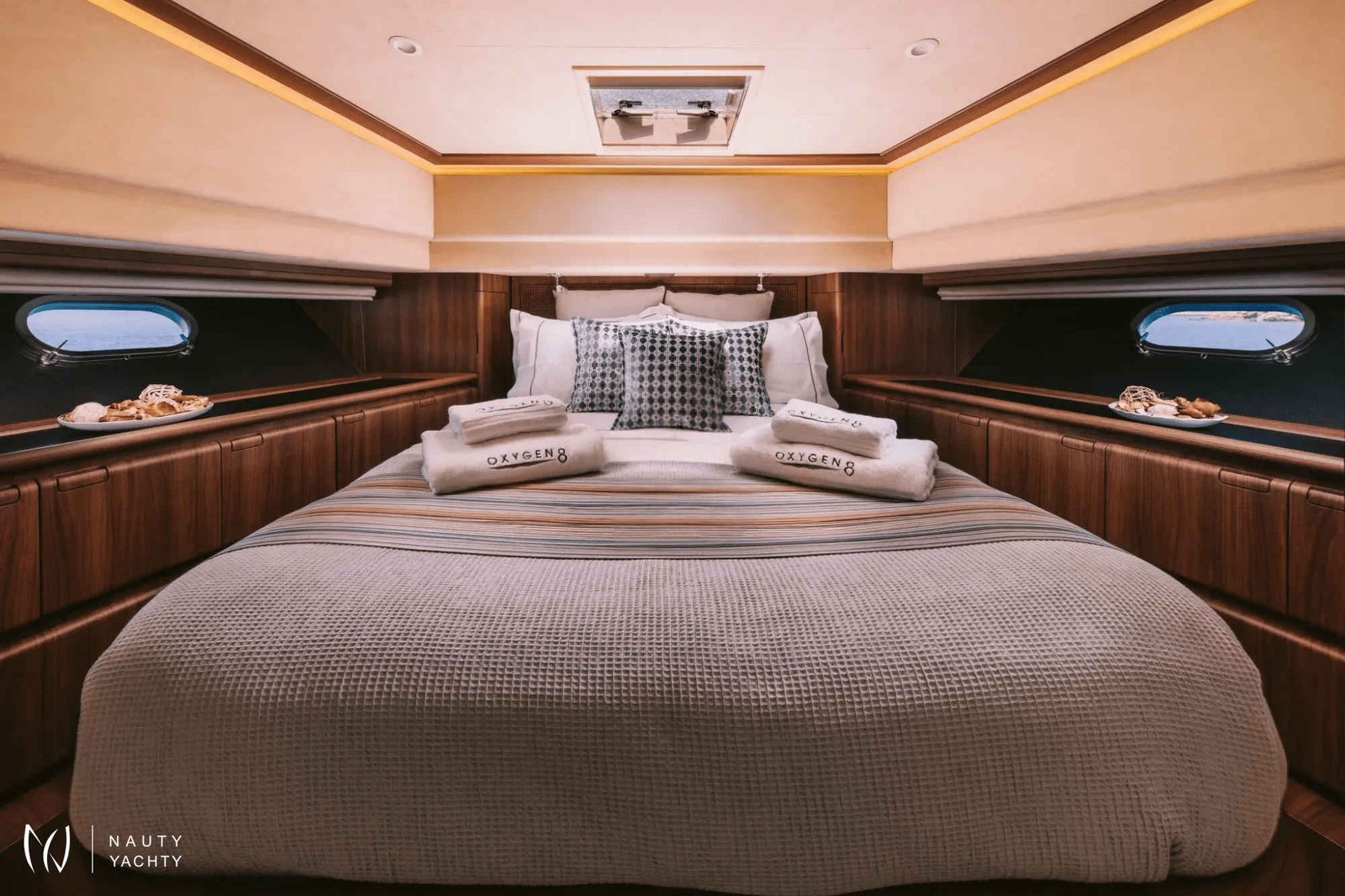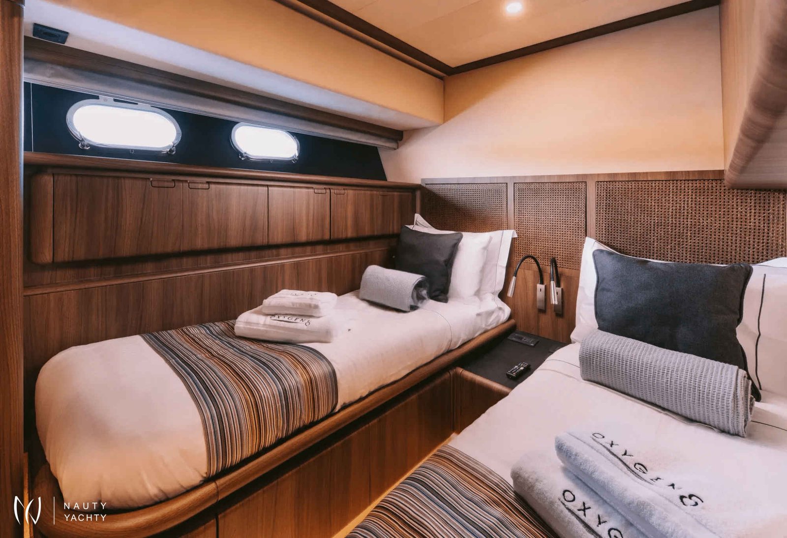 m/y OXYGEN is appointed with all the fine touches and elements to make for a Zen atmosphere, a fabulous crew to run her smoothly and exciting sea toys for the adventurous. She completed a total refit in 2022, making her appear like new! Always maintained in excellent condition with minimal-modern decor and the best in technology, she makes for perfect holidays at sea amongst the beautiful islands. She features 4 cabins: Two Twin cabins, one VIP cabin with double bed in the fore and one large Master cabin complete with large closets, a safe, vanity, couch and a bathroom.A Bar with BBQ on the sun deck, a rich expanse of luxurious sun beds on the sun deck and cushioning at the fore create exterior areas for maximum comfort. The unique lighting around the yacht and inside at the dining table create an atmosphere of extraordinary luxury and a playful mood.New speakers placed throughout the yacht, in and out, and a plethora of sea toys onboard for children and adults further enhance the experience onboard m/y OXYGEN.