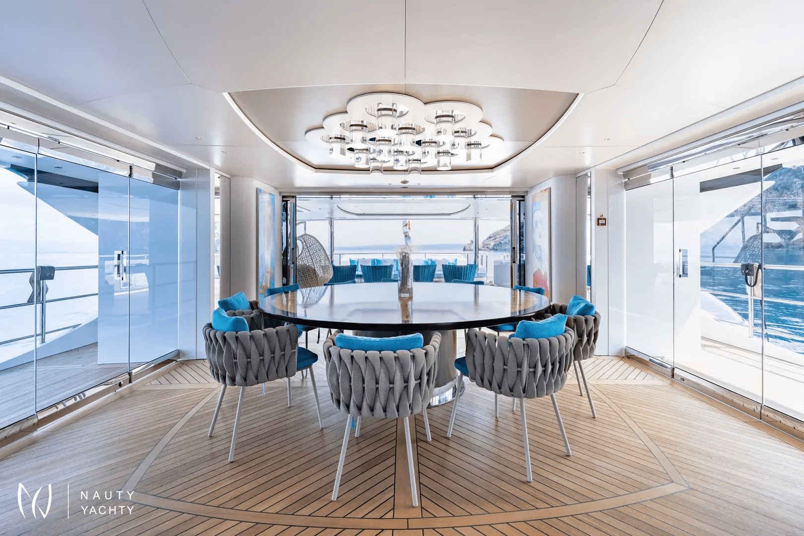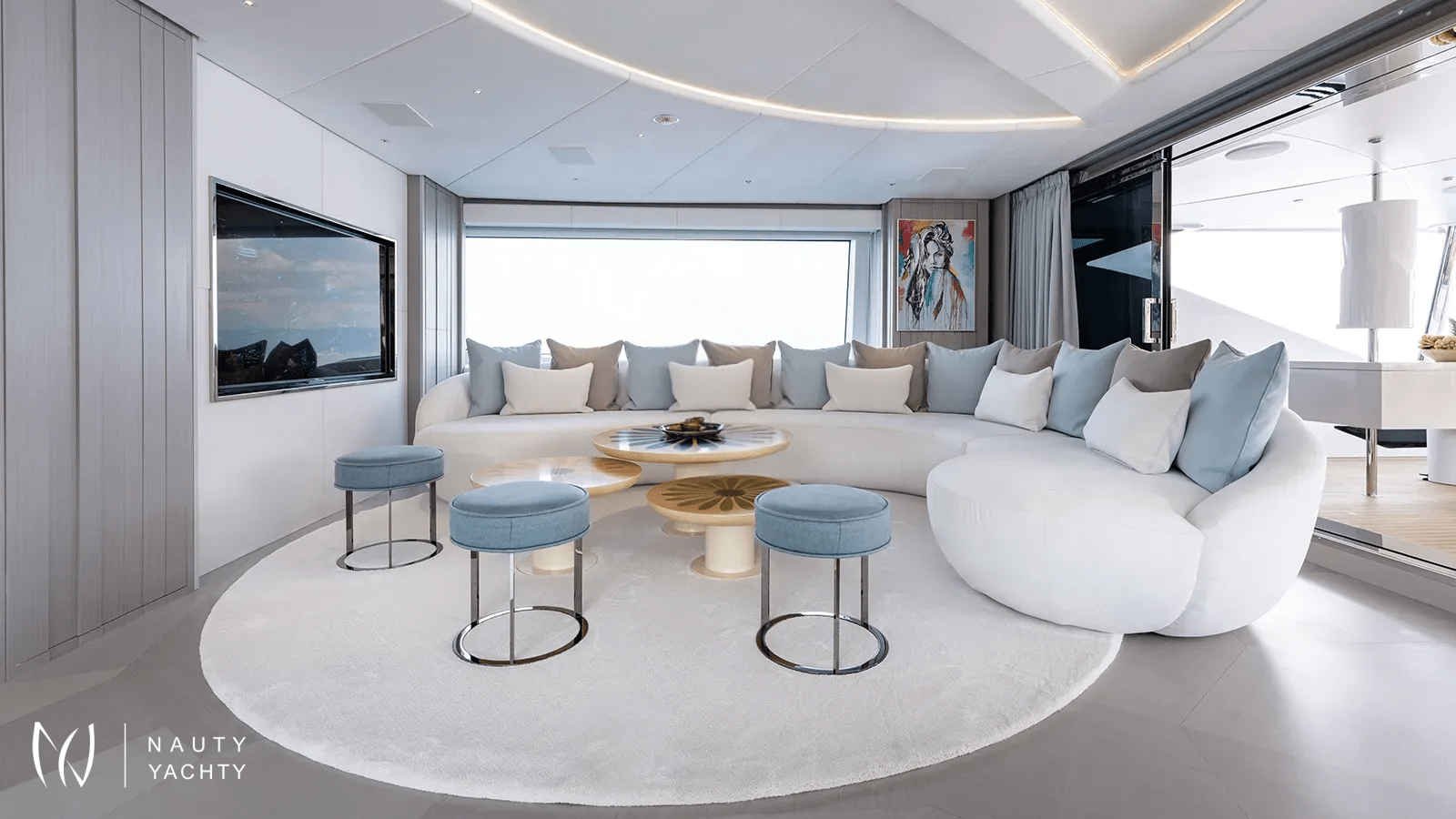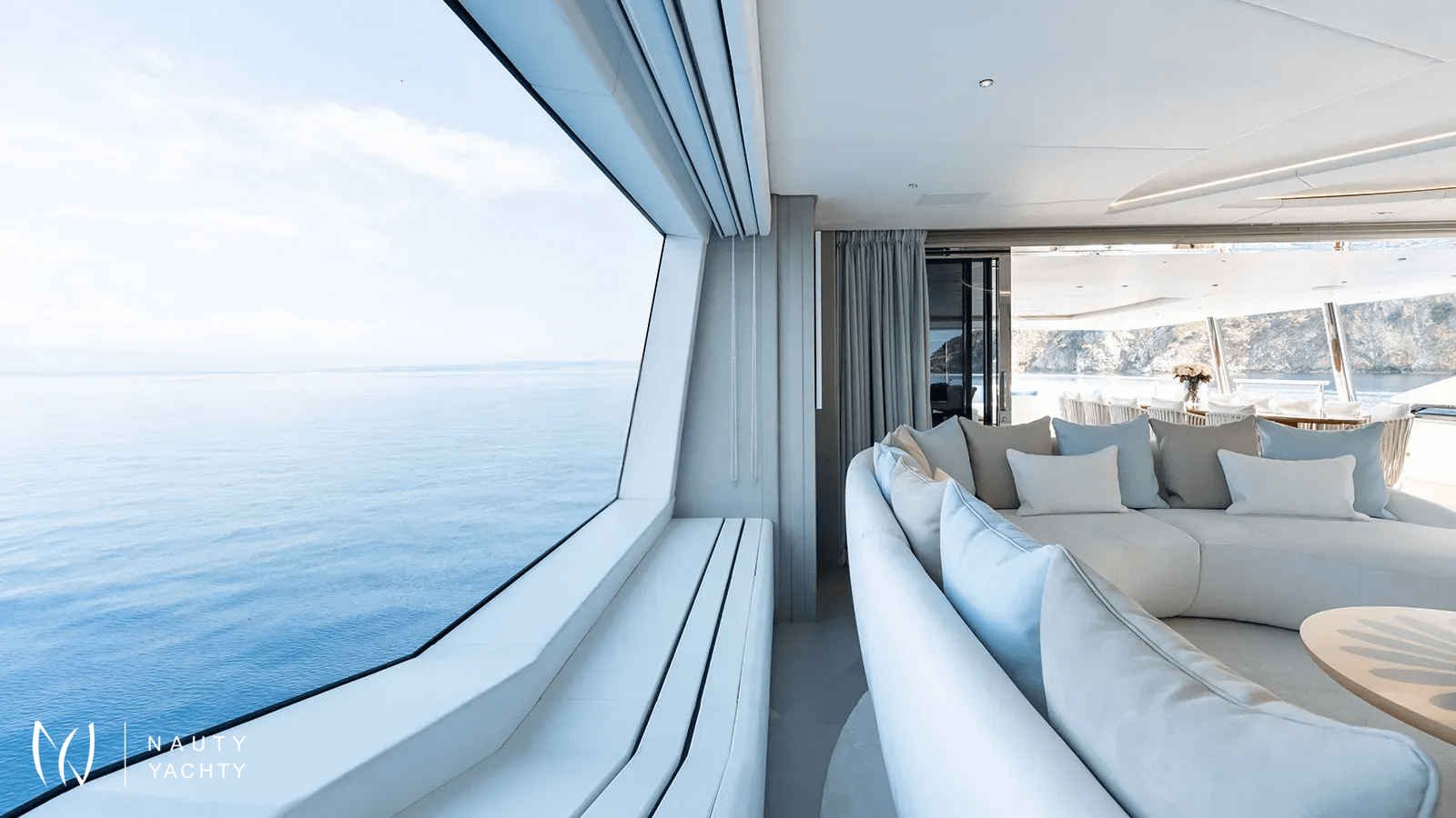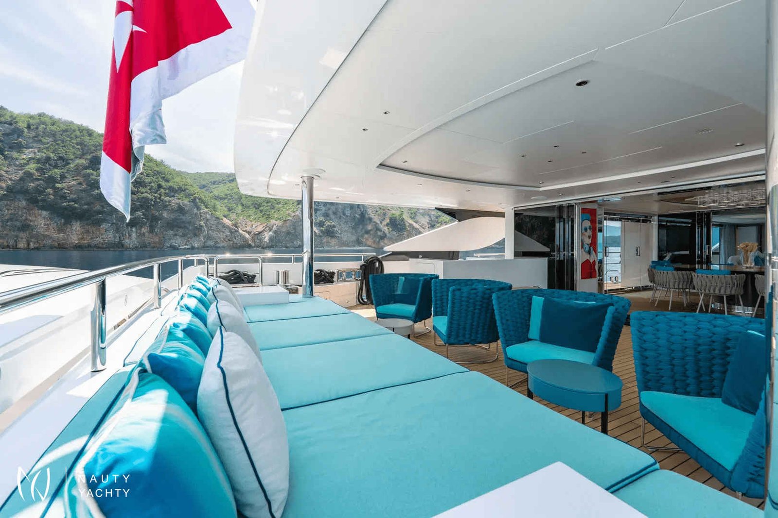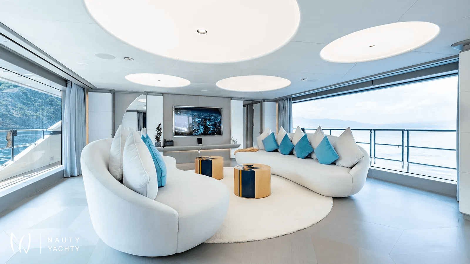 SEAGULL MRD features a sleek interior with minimalist design and contemporary sophistication. Bathed in natural light streaming through expansive windows, the spacious living areas offer a seamless connection to the surrounding ocean views. With her large volumes, guests can relish in the comfort of ample space for relaxation and entertainment indoors. Setting the onboard experience apart is not just elegance, but the silent experience she provides and a smooth and serene journey thanks to zero-speed stabilizers.Vast outdoor deck spaces make SEAGULL MRD an ideal platform for both relaxing and entertaining. She features expansive lounging areas forward and aft on the sun deck, adorned with plush sun pads, inviting sofas, and not one but two pools, including a Jacuzzi. Additional seating is found on the main deck forward, shaded for total comfort. Outdoor dining is a delight on the main deck aft, accompanied by a chic cocktail bar and vibrant turquoise-colored furnishings. With easy access to the water from the stern, guests are invited to explore the boundless beauty of the ocean.