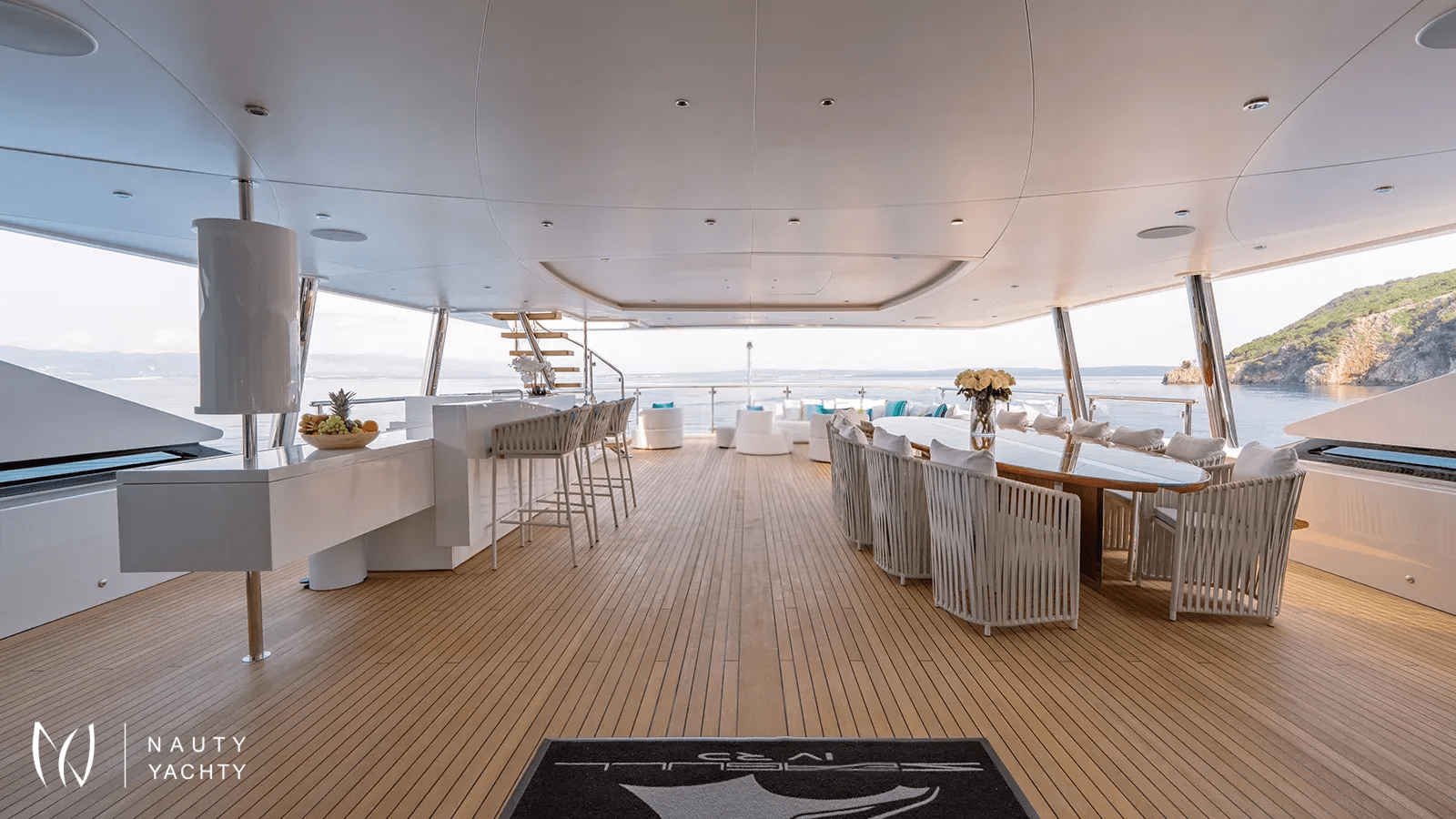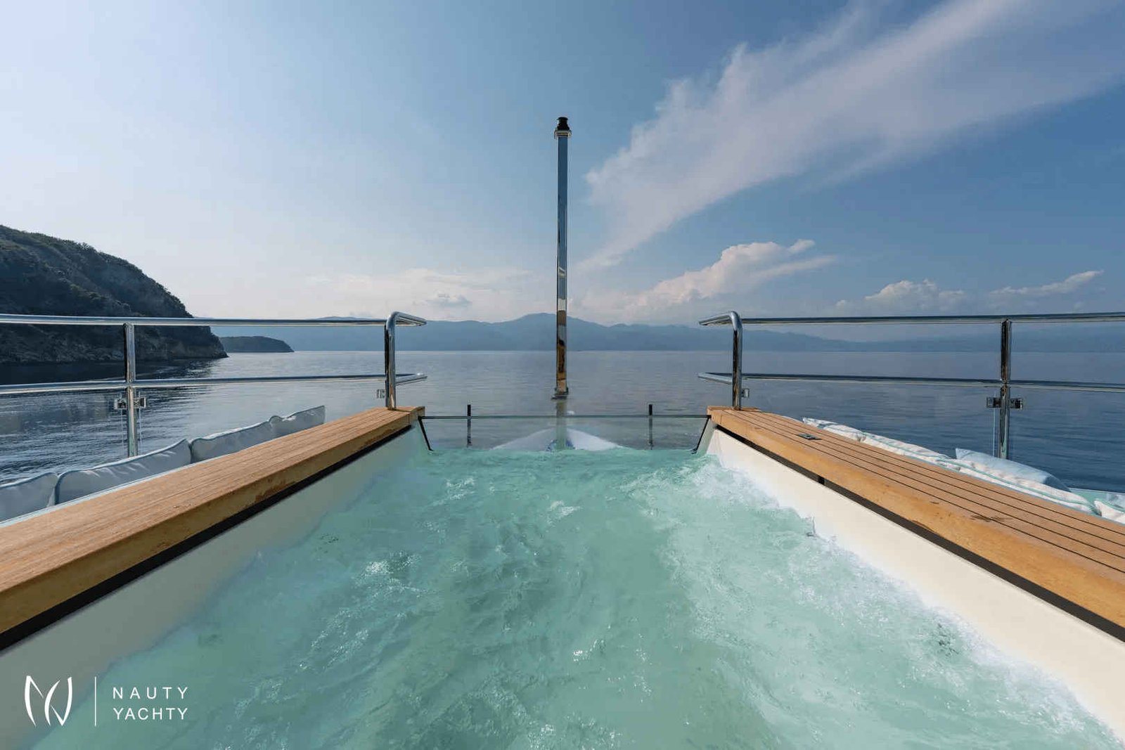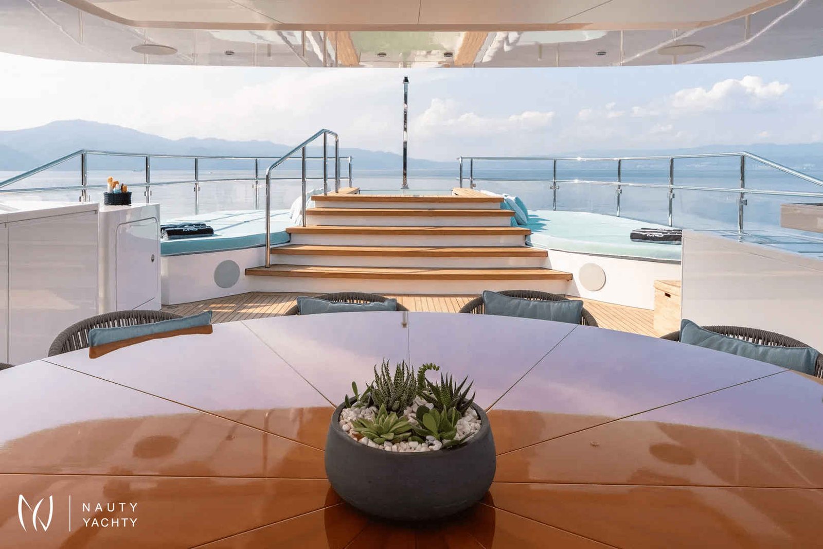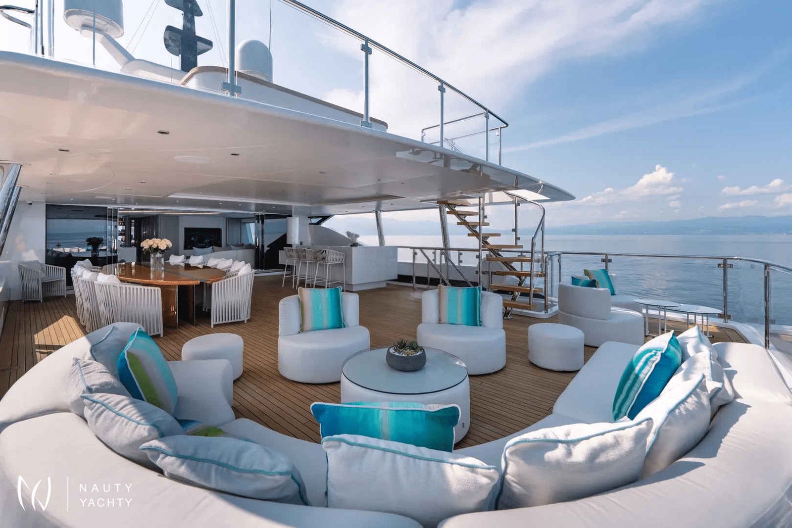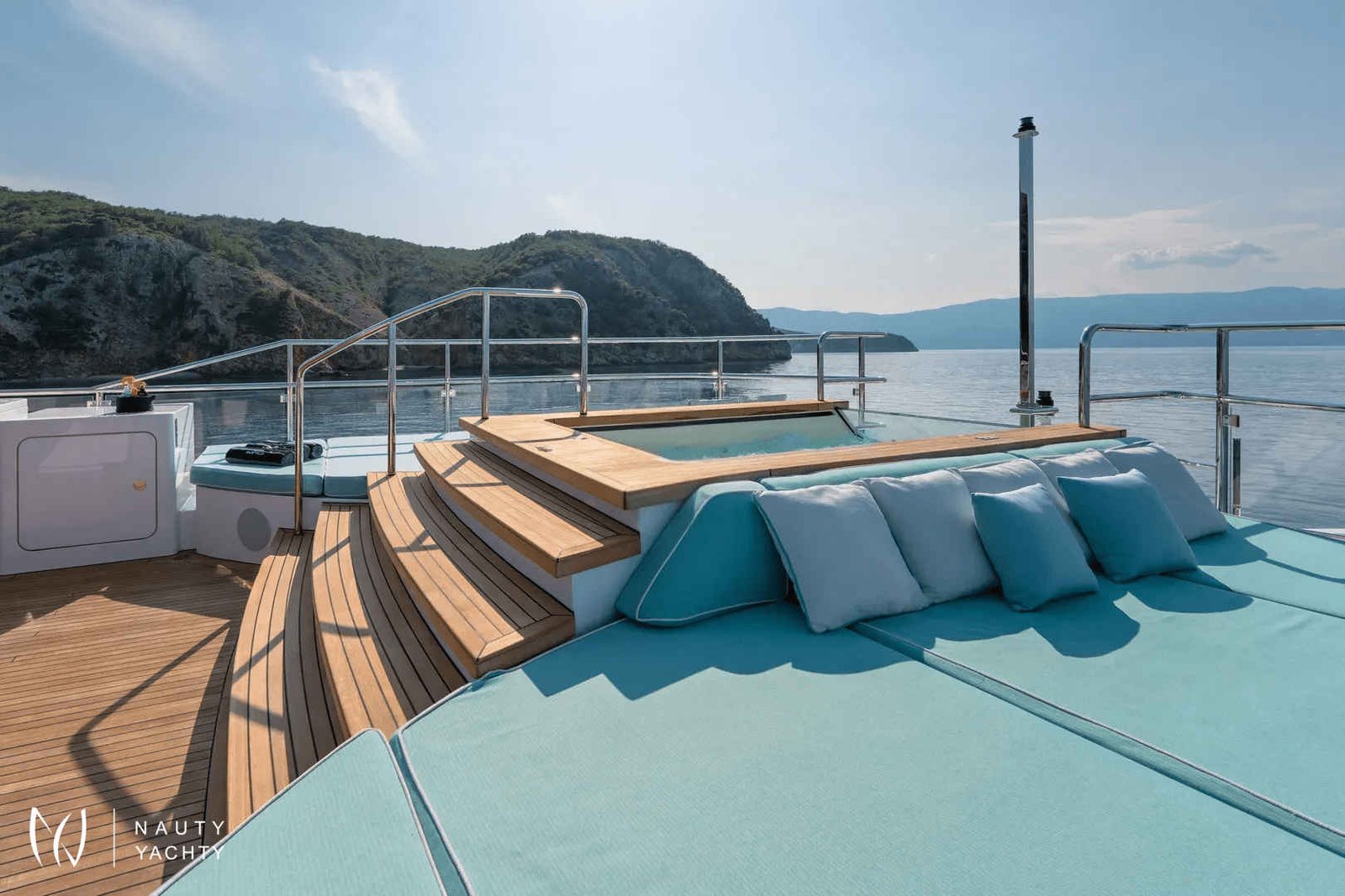 SEAGULL MRD features a sleek interior with minimalist design and contemporary sophistication. Bathed in natural light streaming through expansive windows, the spacious living areas offer a seamless connection to the surrounding ocean views. With her large volumes, guests can relish in the comfort of ample space for relaxation and entertainment indoors. Setting the onboard experience apart is not just elegance, but the silent experience she provides and a smooth and serene journey thanks to zero-speed stabilizers.Vast outdoor deck spaces make SEAGULL MRD an ideal platform for both relaxing and entertaining. She features expansive lounging areas forward and aft on the sun deck, adorned with plush sun pads, inviting sofas, and not one but two pools, including a Jacuzzi. Additional seating is found on the main deck forward, shaded for total comfort. Outdoor dining is a delight on the main deck aft, accompanied by a chic cocktail bar and vibrant turquoise-colored furnishings. With easy access to the water from the stern, guests are invited to explore the boundless beauty of the ocean.