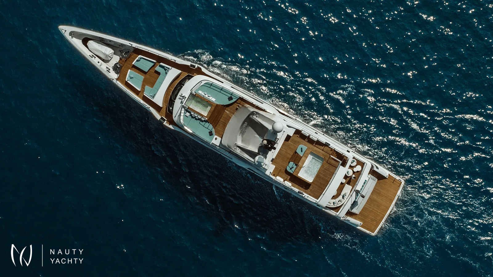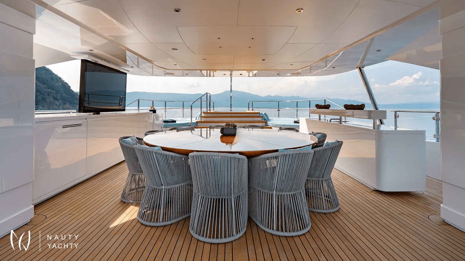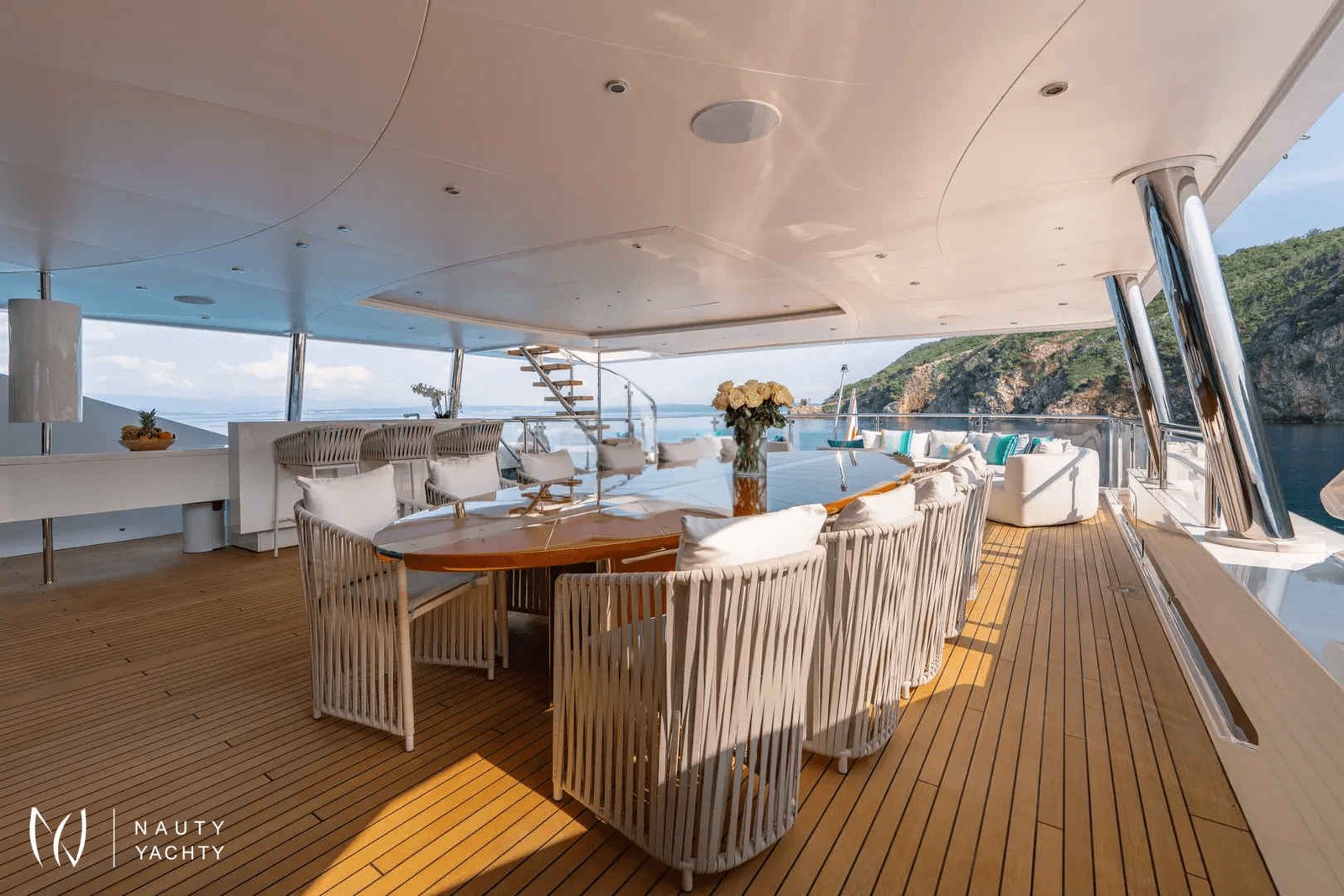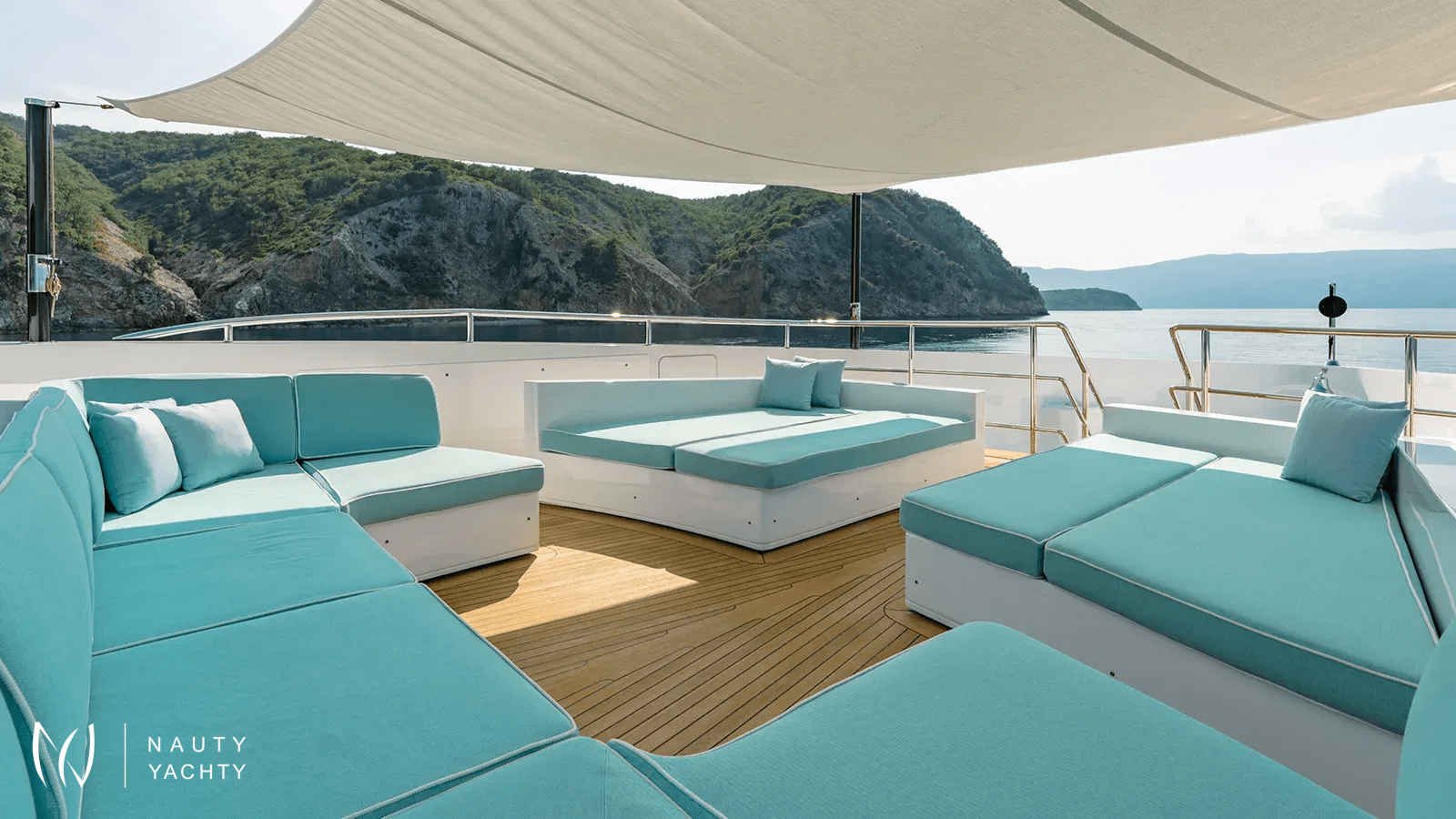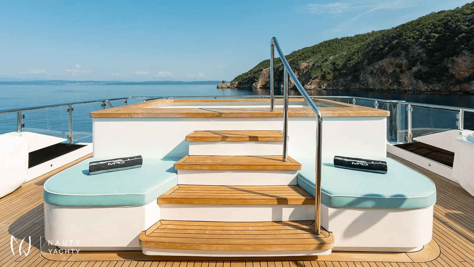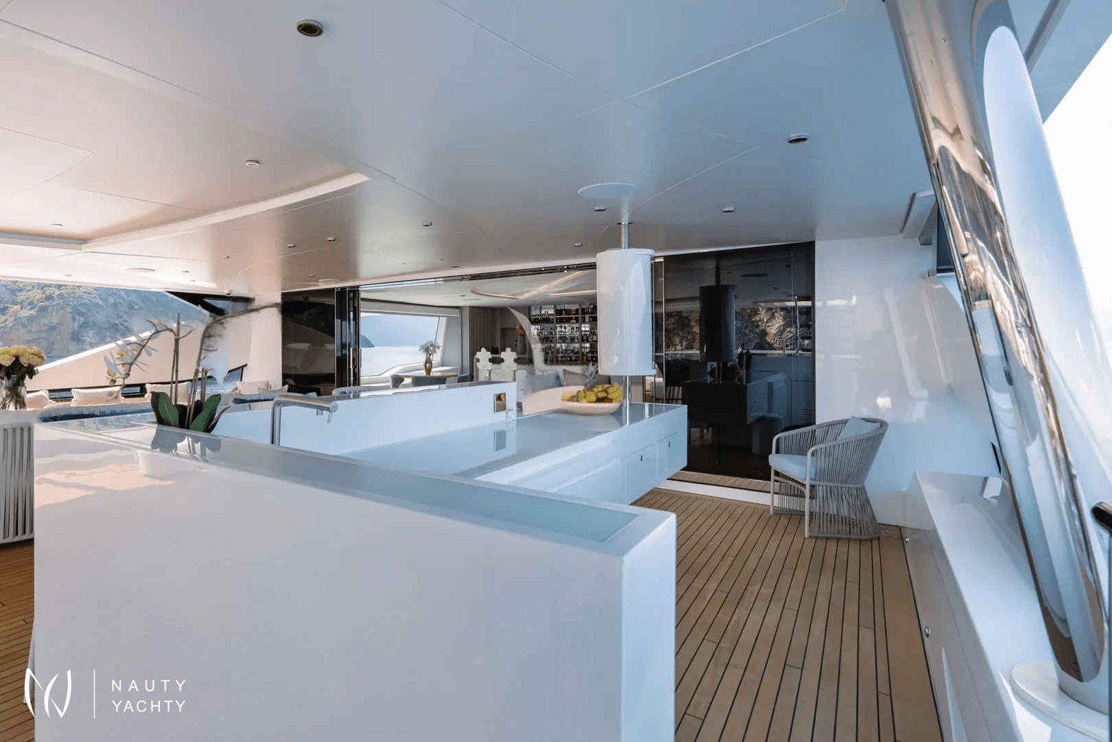 SEAGULL MRD features a sleek interior with minimalist design and contemporary sophistication. Bathed in natural light streaming through expansive windows, the spacious living areas offer a seamless connection to the surrounding ocean views. With her large volumes, guests can relish in the comfort of ample space for relaxation and entertainment indoors. Setting the onboard experience apart is not just elegance, but the silent experience she provides and a smooth and serene journey thanks to zero-speed stabilizers.Vast outdoor deck spaces make SEAGULL MRD an ideal platform for both relaxing and entertaining. She features expansive lounging areas forward and aft on the sun deck, adorned with plush sun pads, inviting sofas, and not one but two pools, including a Jacuzzi. Additional seating is found on the main deck forward, shaded for total comfort. Outdoor dining is a delight on the main deck aft, accompanied by a chic cocktail bar and vibrant turquoise-colored furnishings. With easy access to the water from the stern, guests are invited to explore the boundless beauty of the ocean.